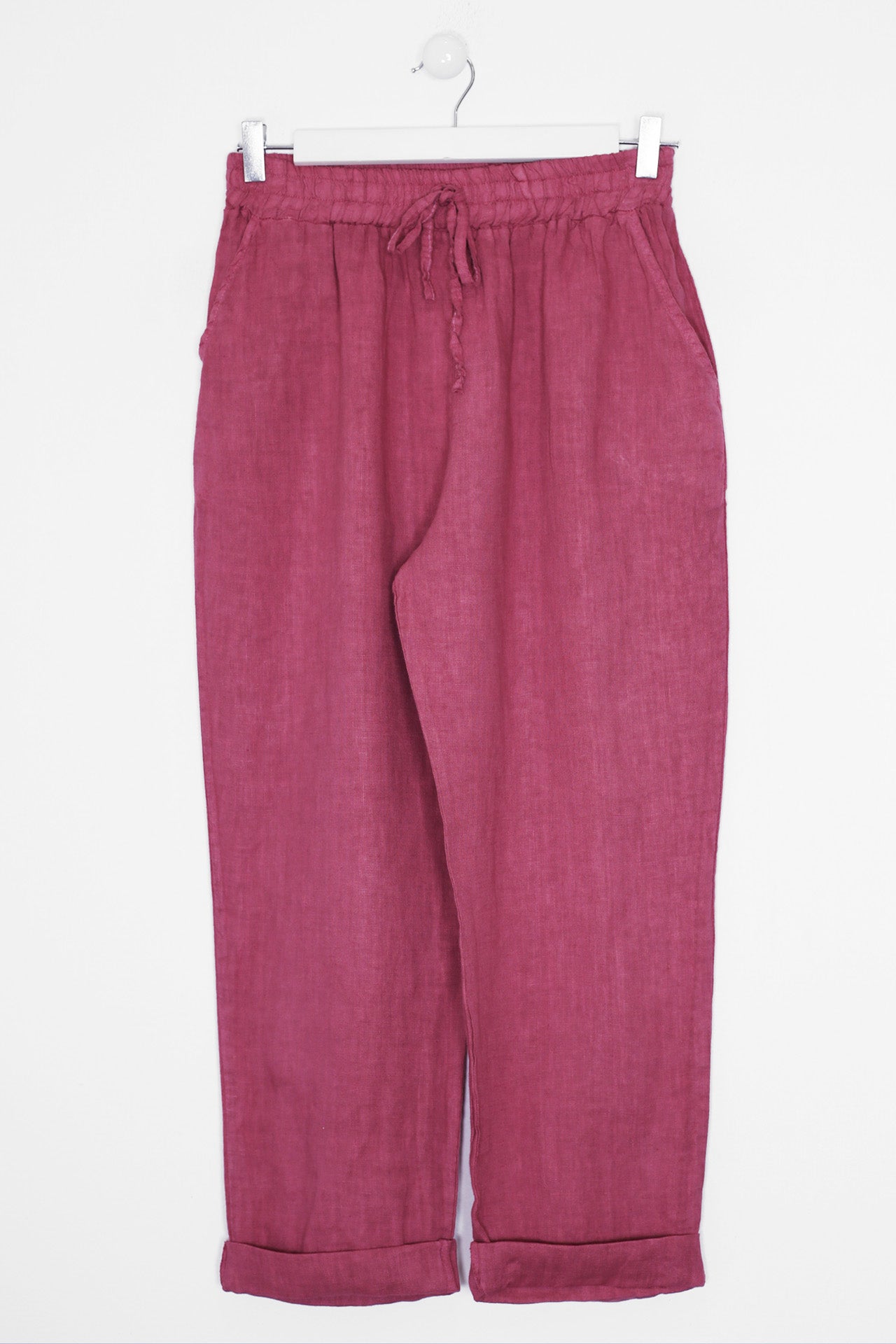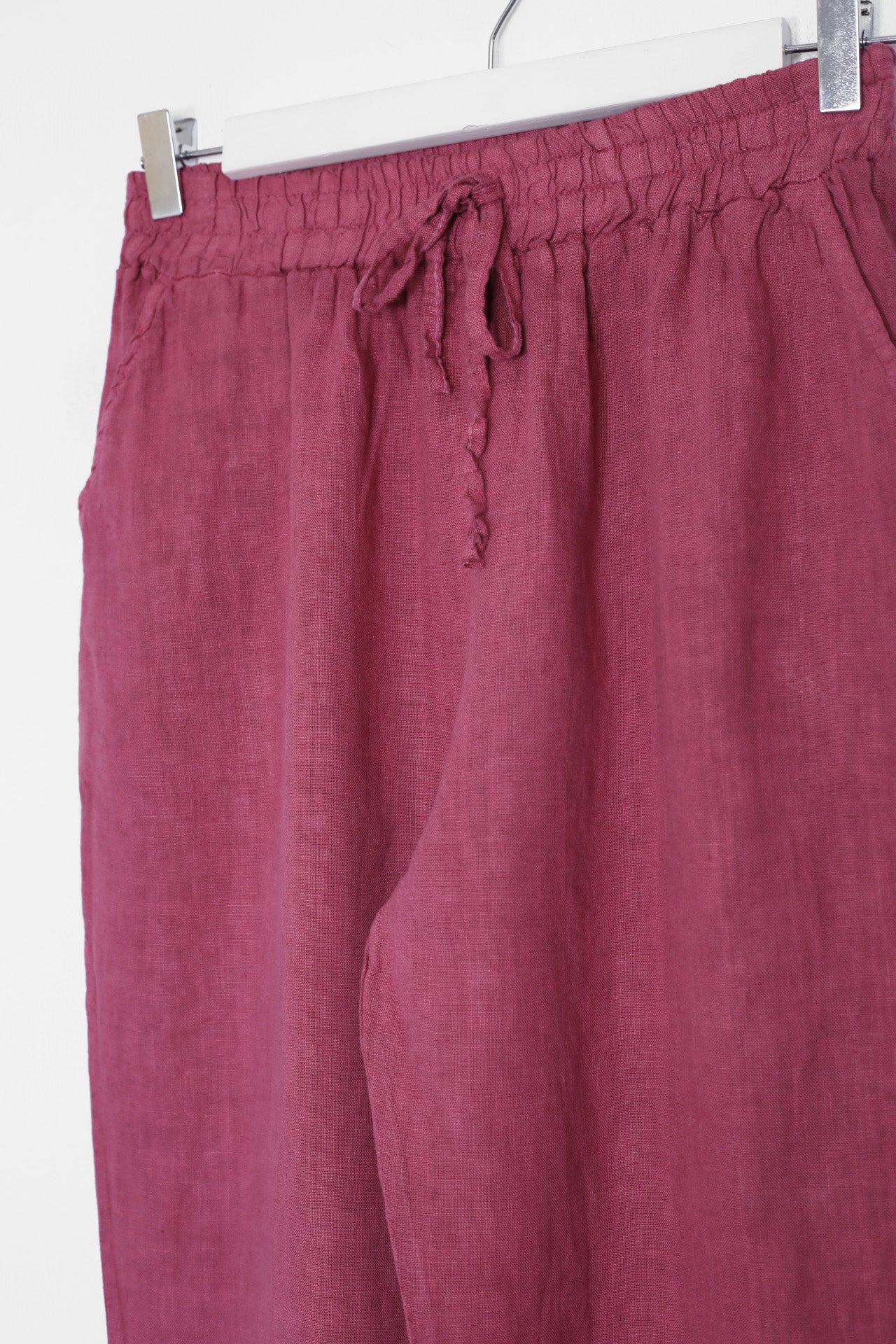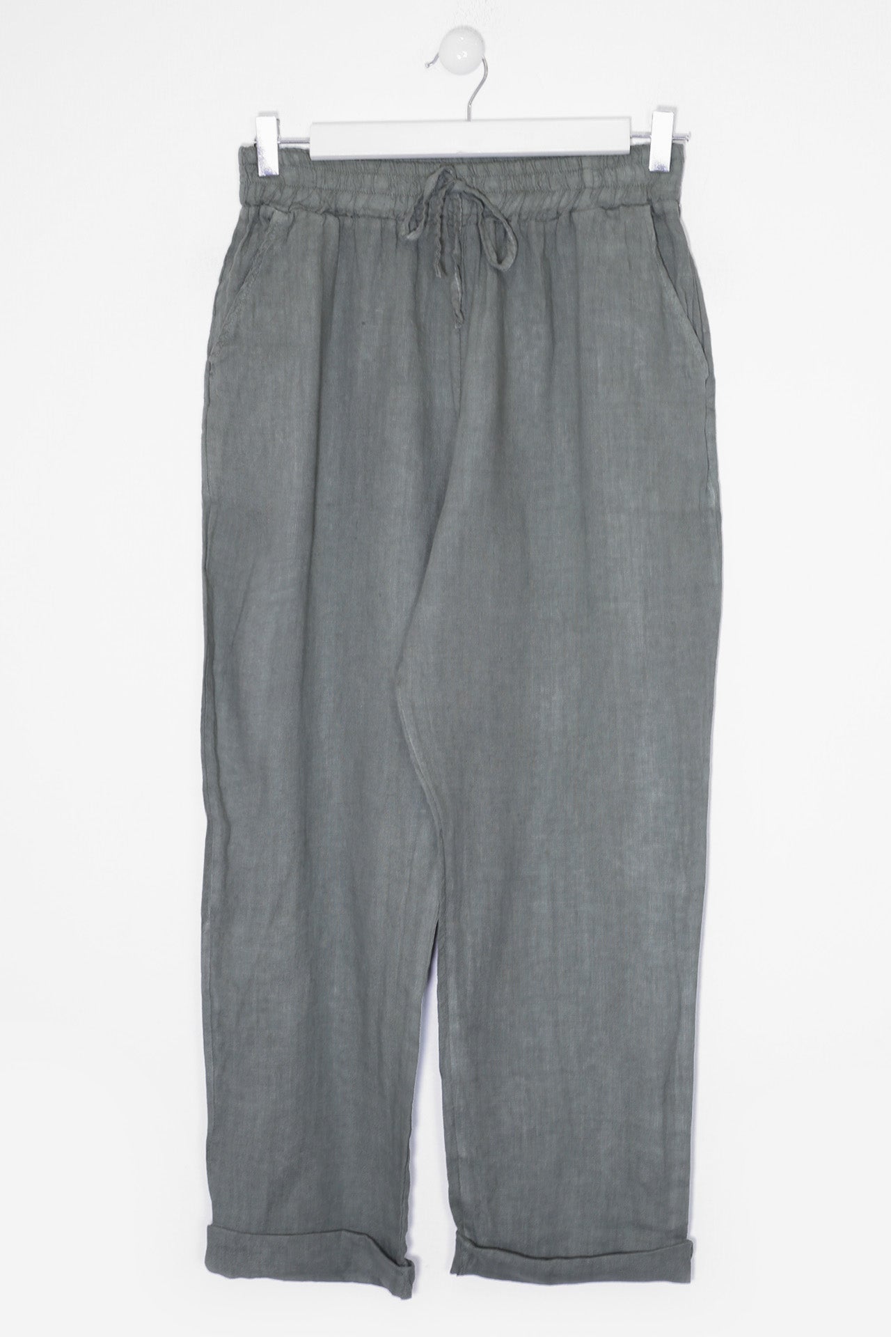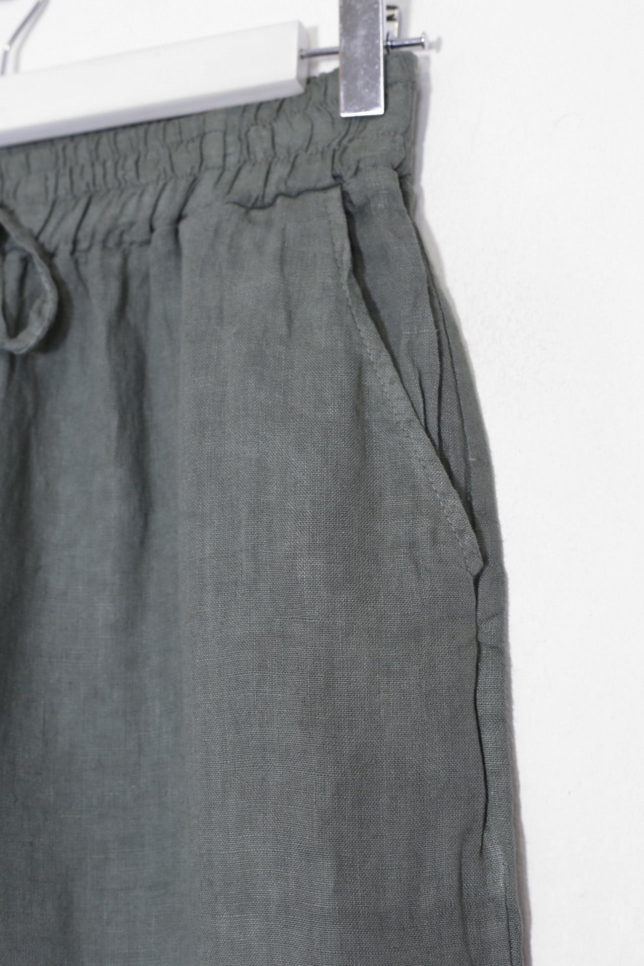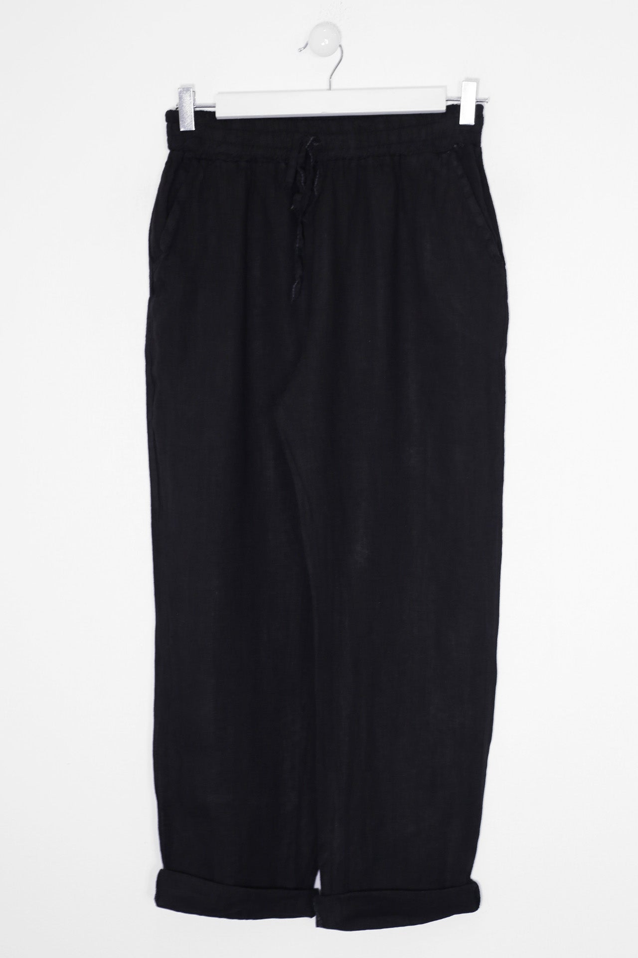 Pantalones de tiro alto estrechos 100% lino. Cintura elástica con detalle de cordón decorativo. Bolsillos laterales.