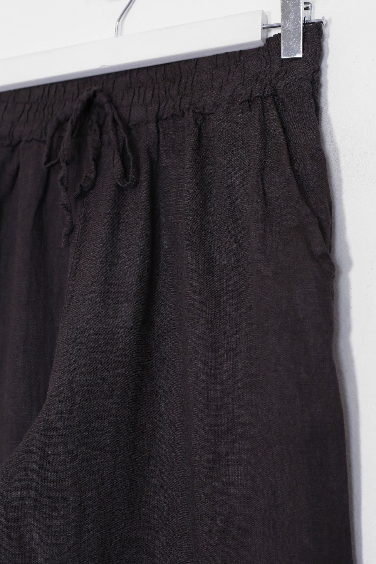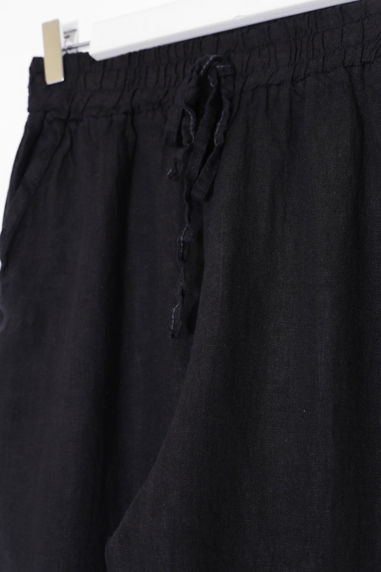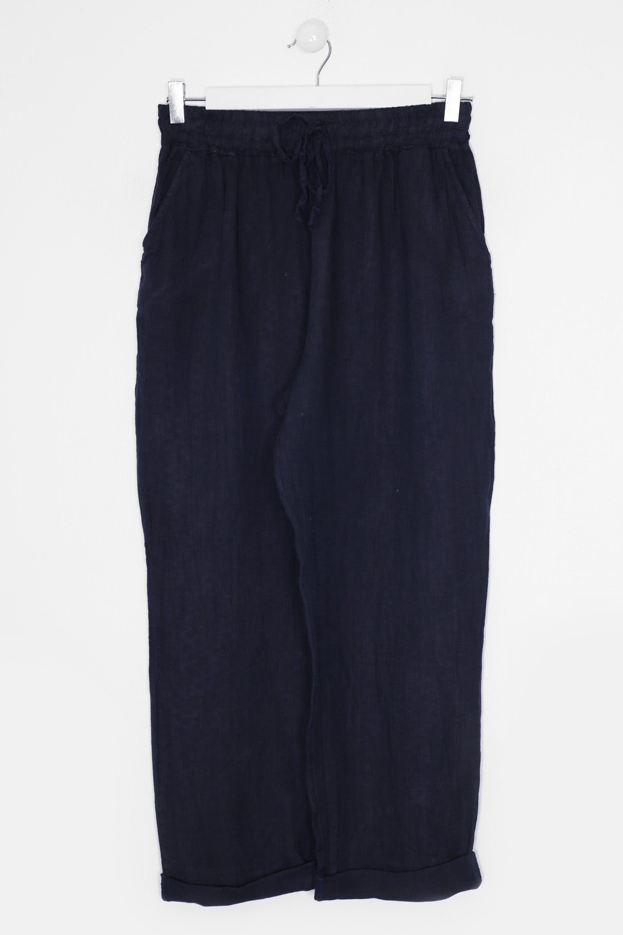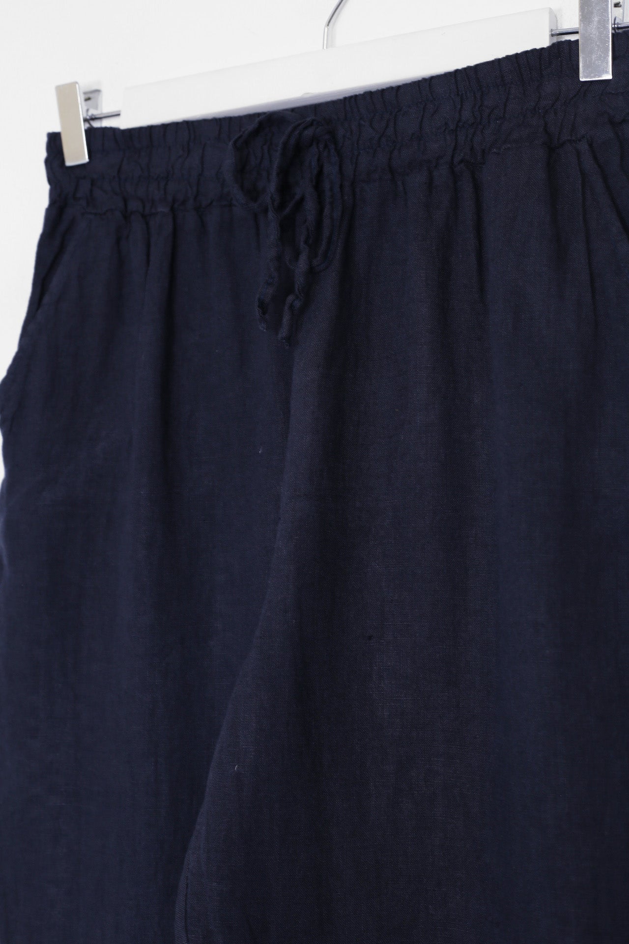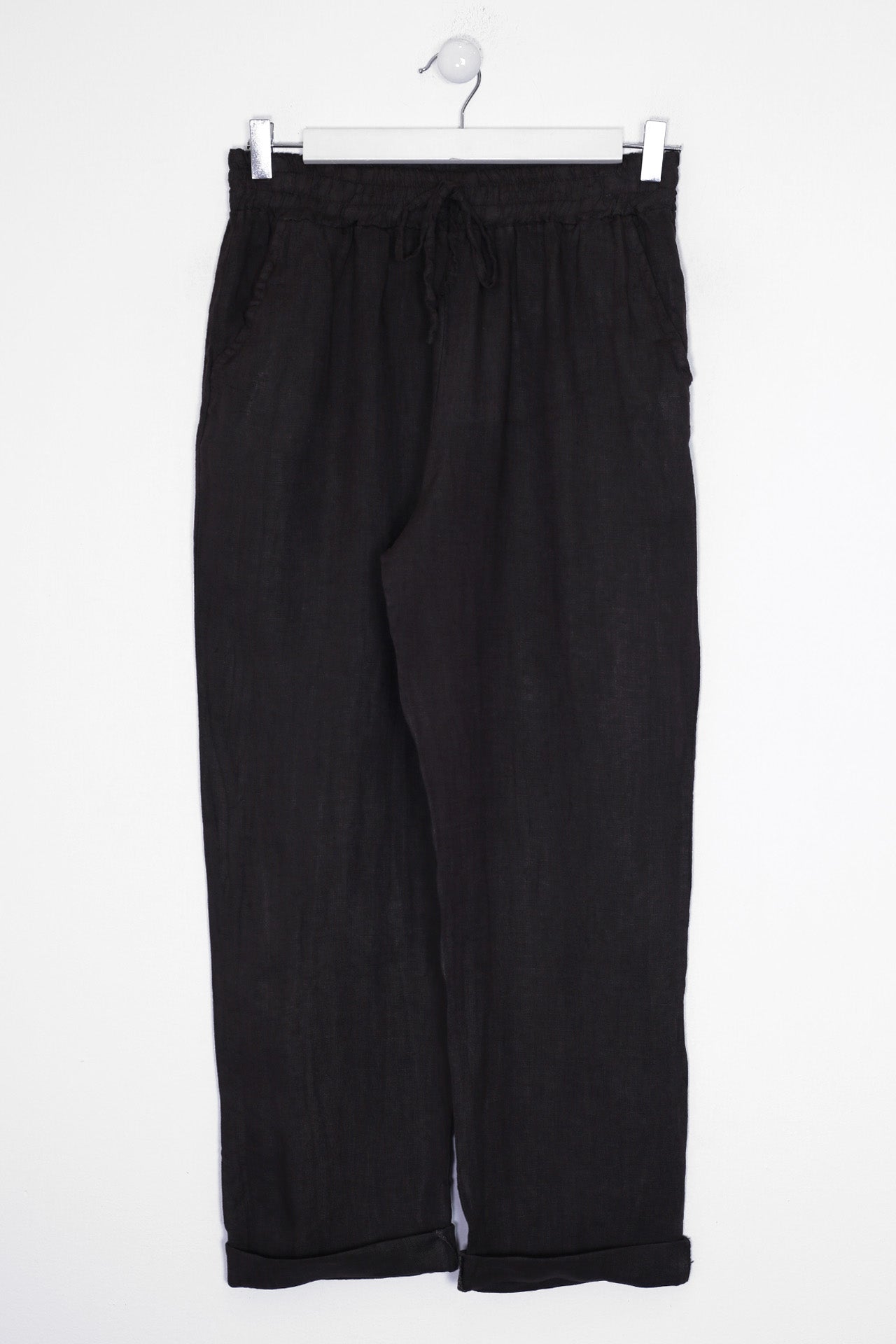 Pantalones de tiro alto estrechos 100% lino. Cintura elástica con detalle de cordón decorativo. Bolsillos laterales.
