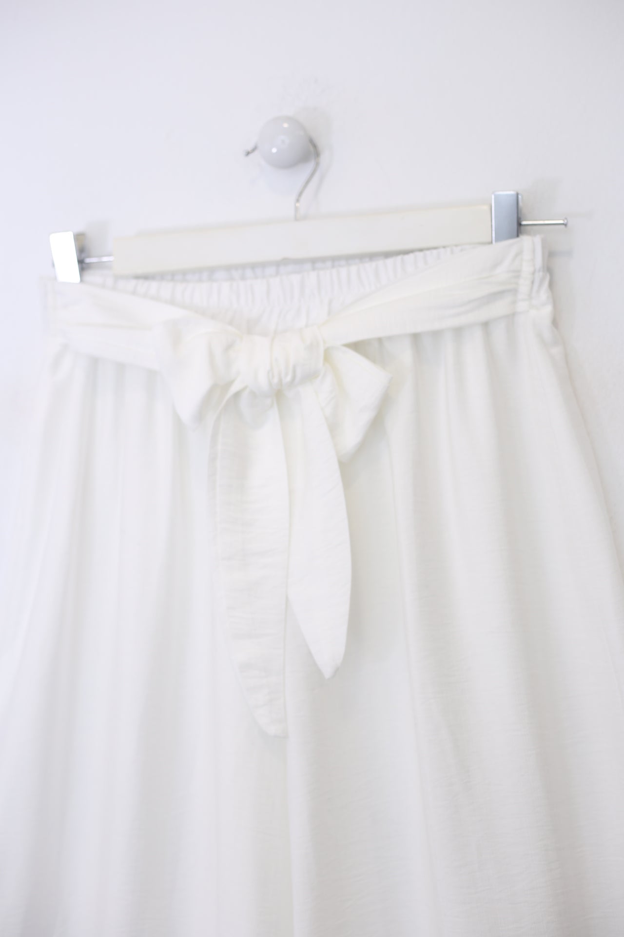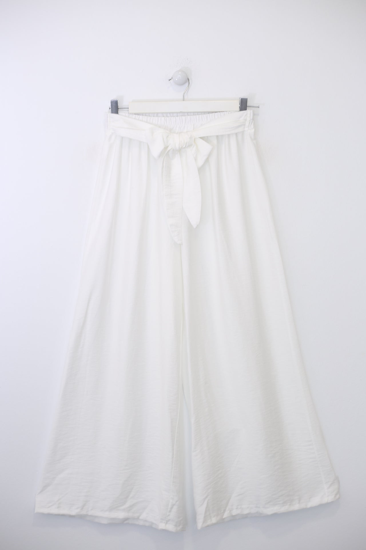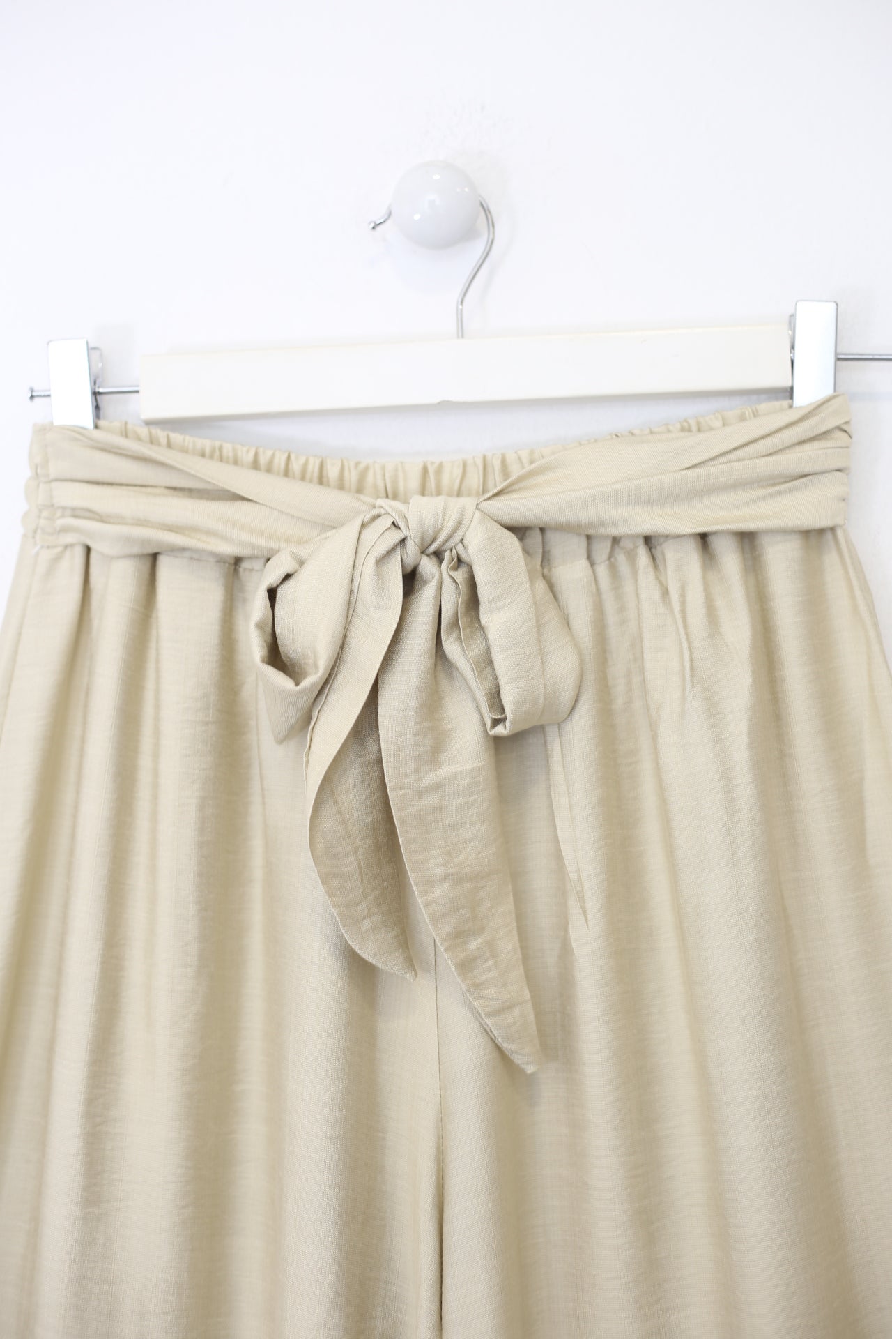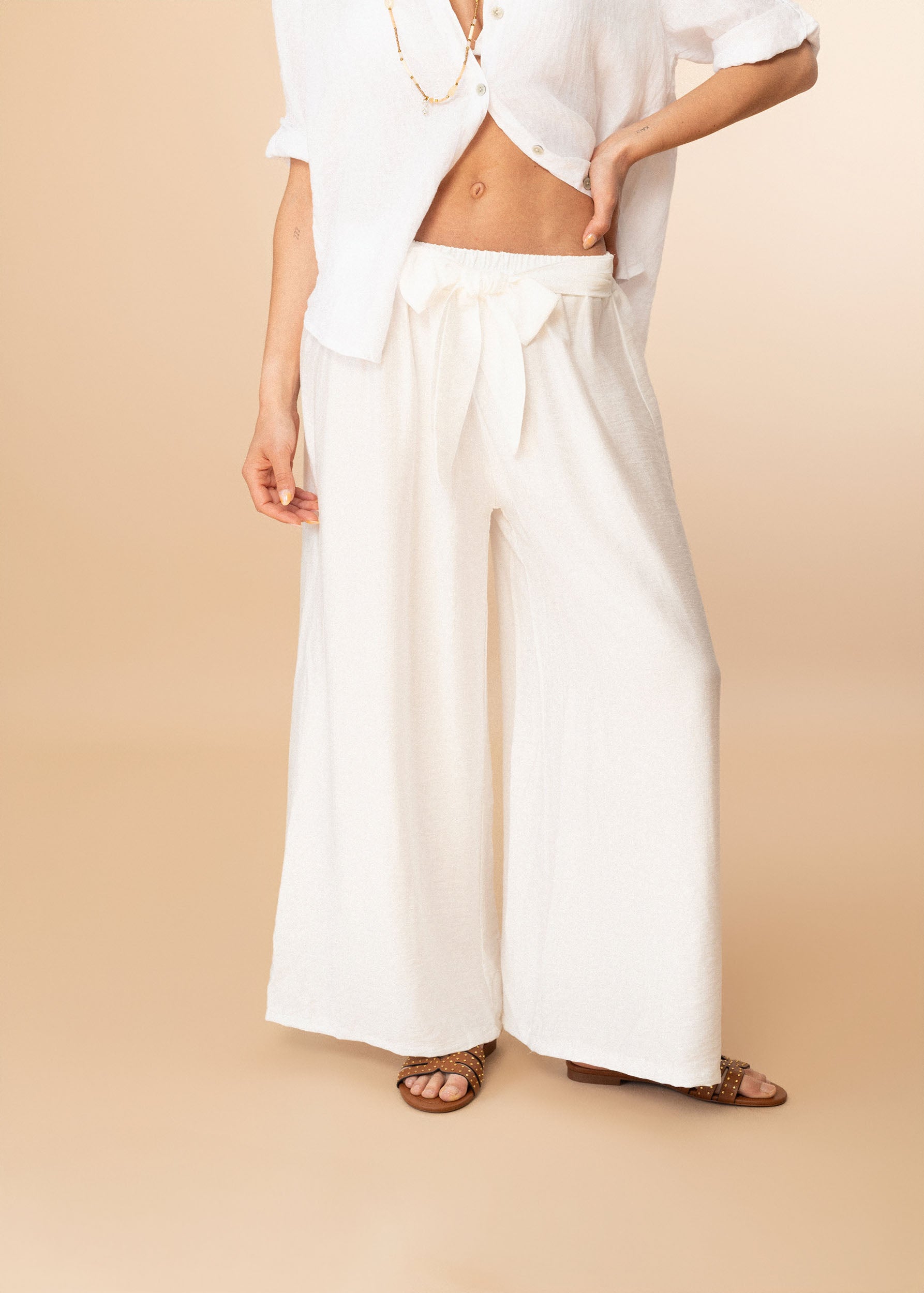 Pantalones anchos de tiro alto. Cintura elástica con detalle de cinturón anudado.
