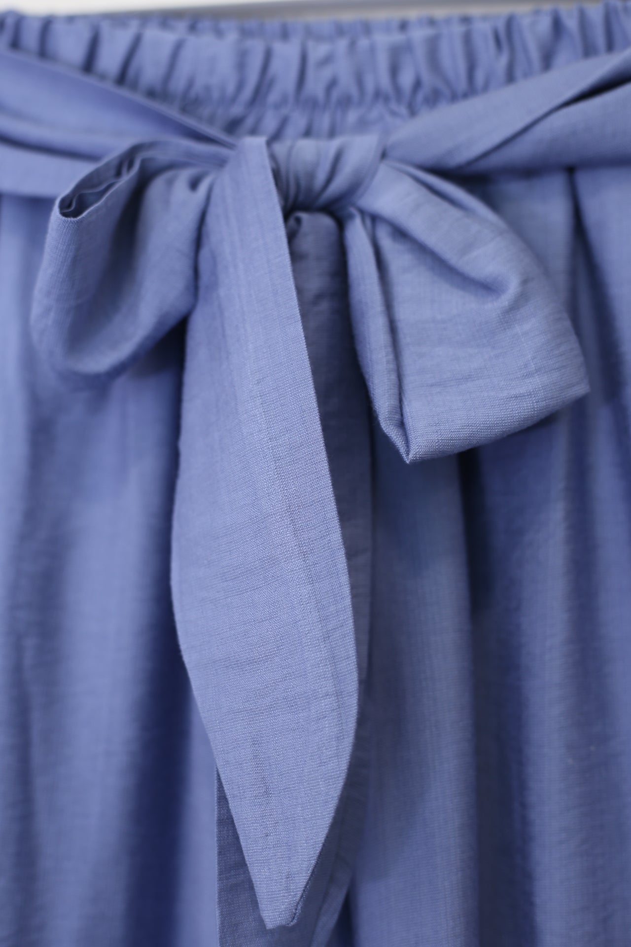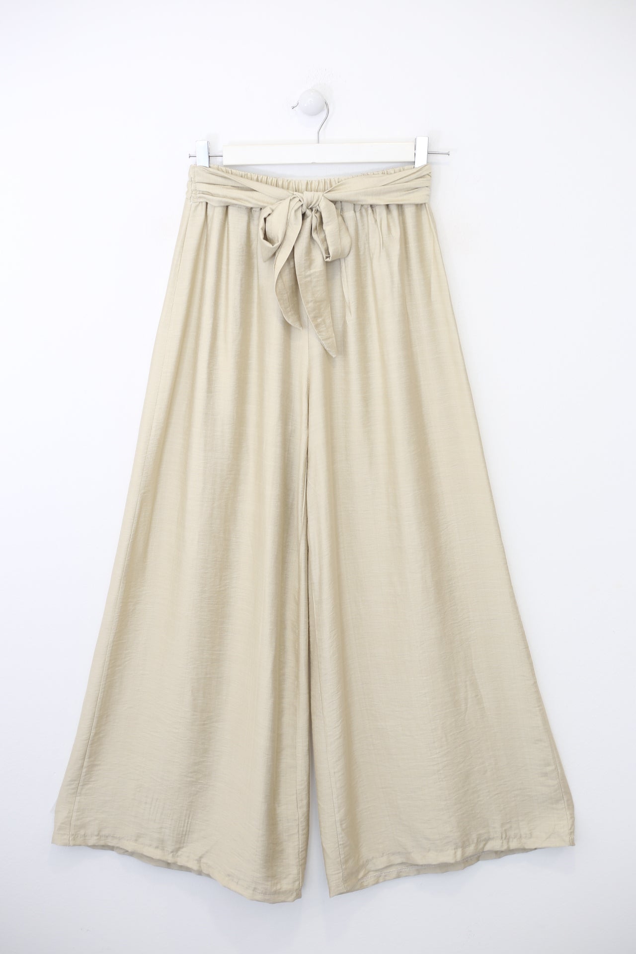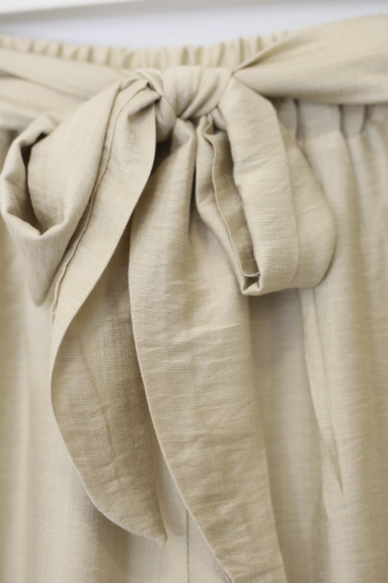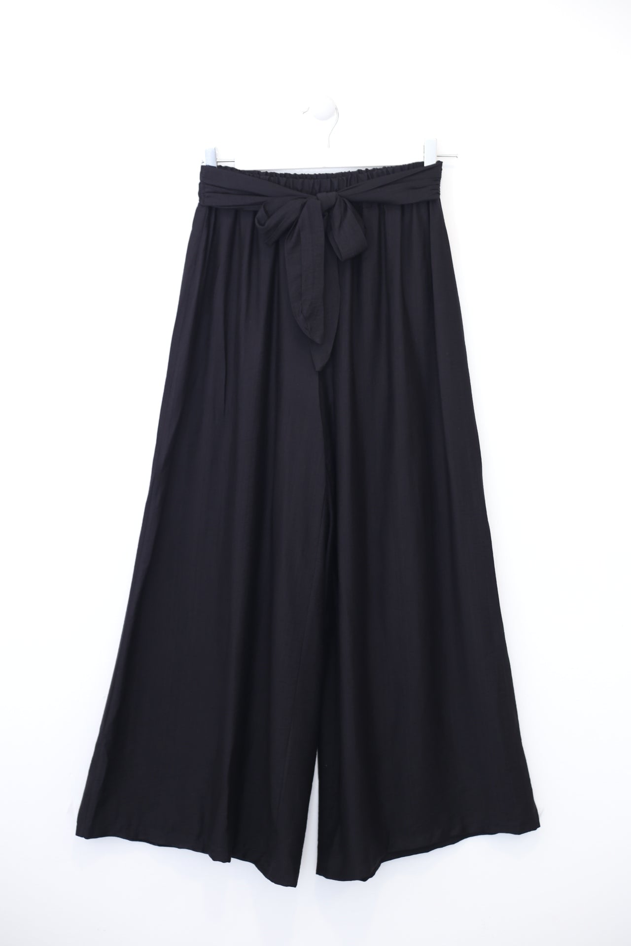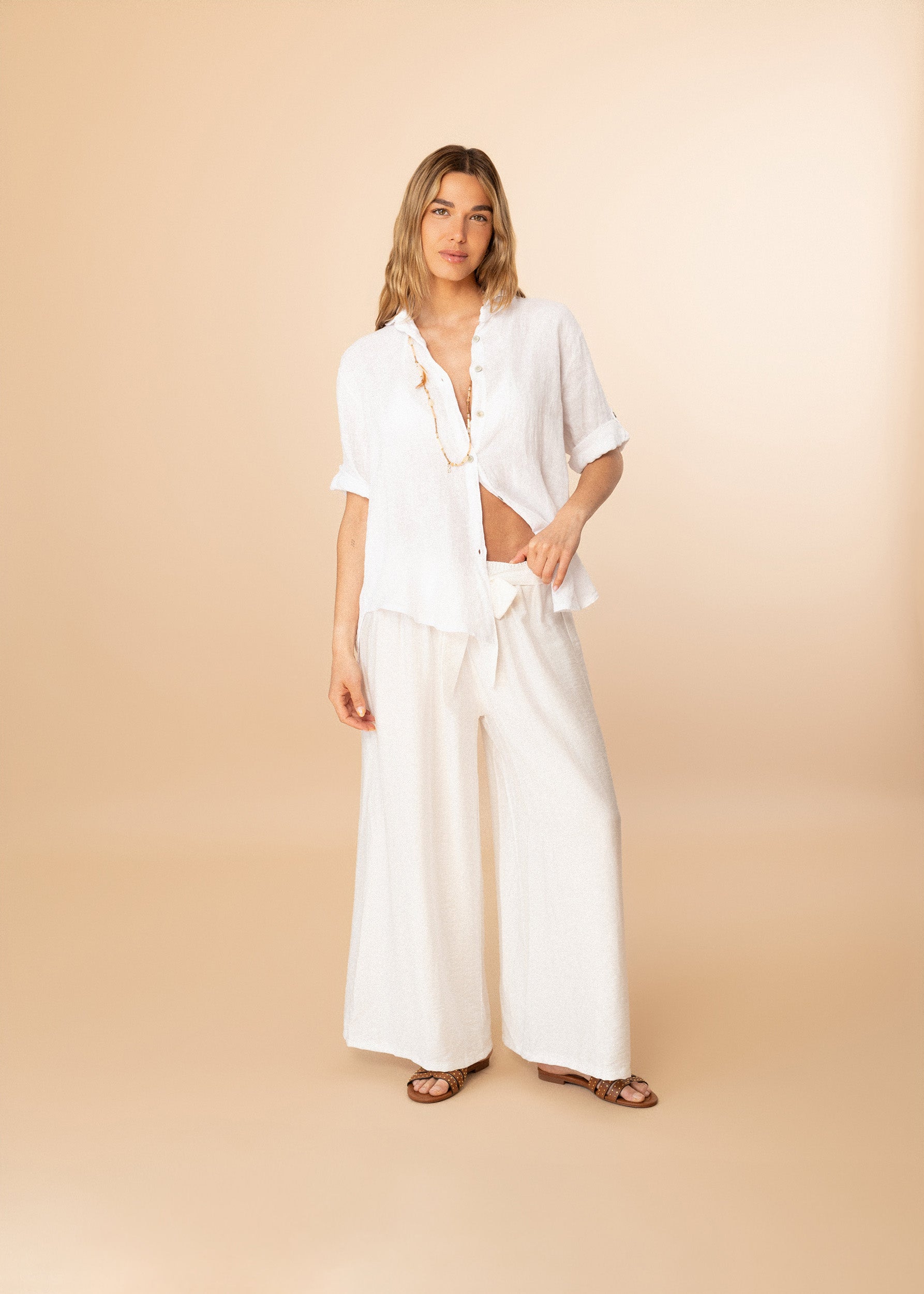Pantalones anchos de tiro alto. Cintura elástica con detalle de cinturón anudado.