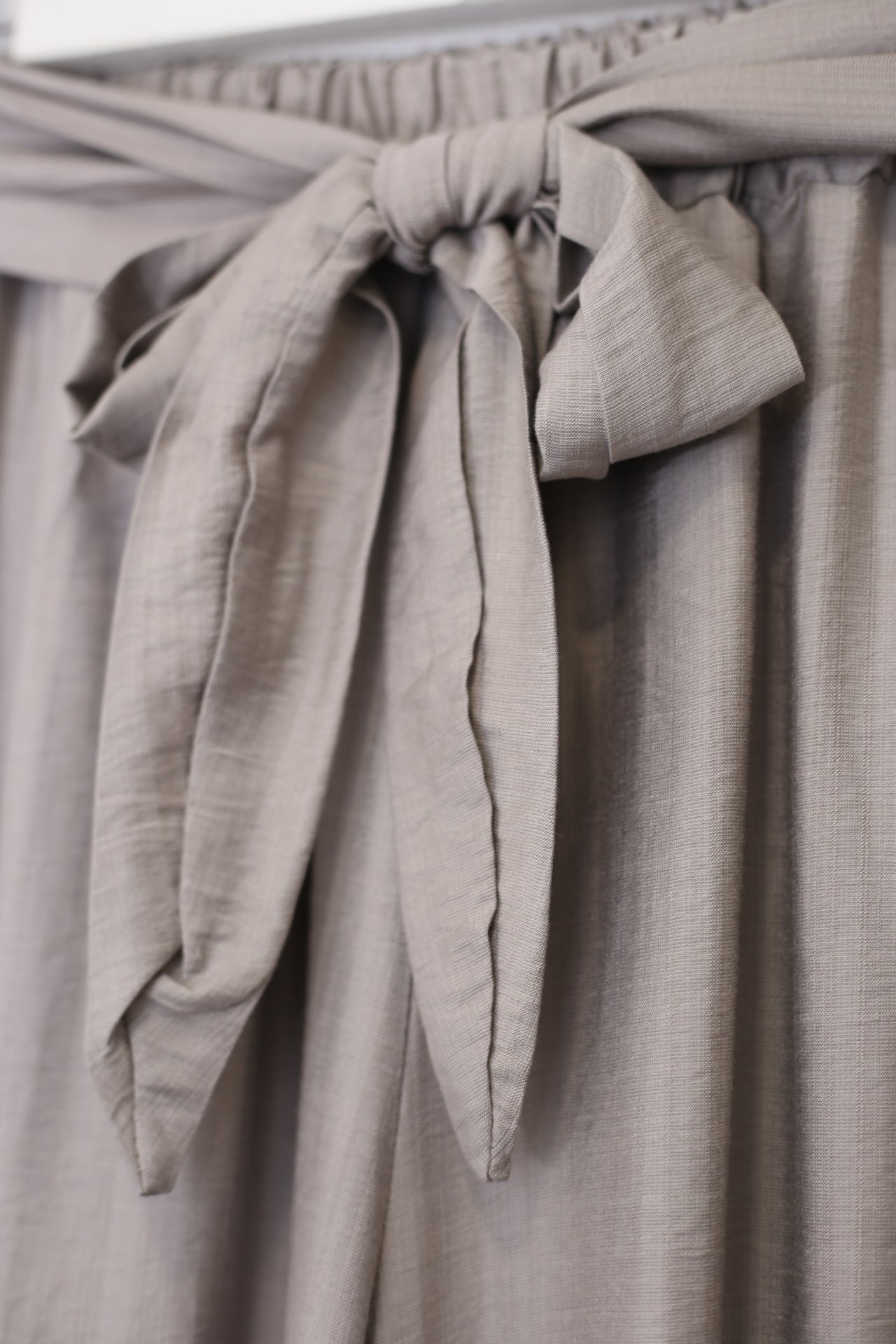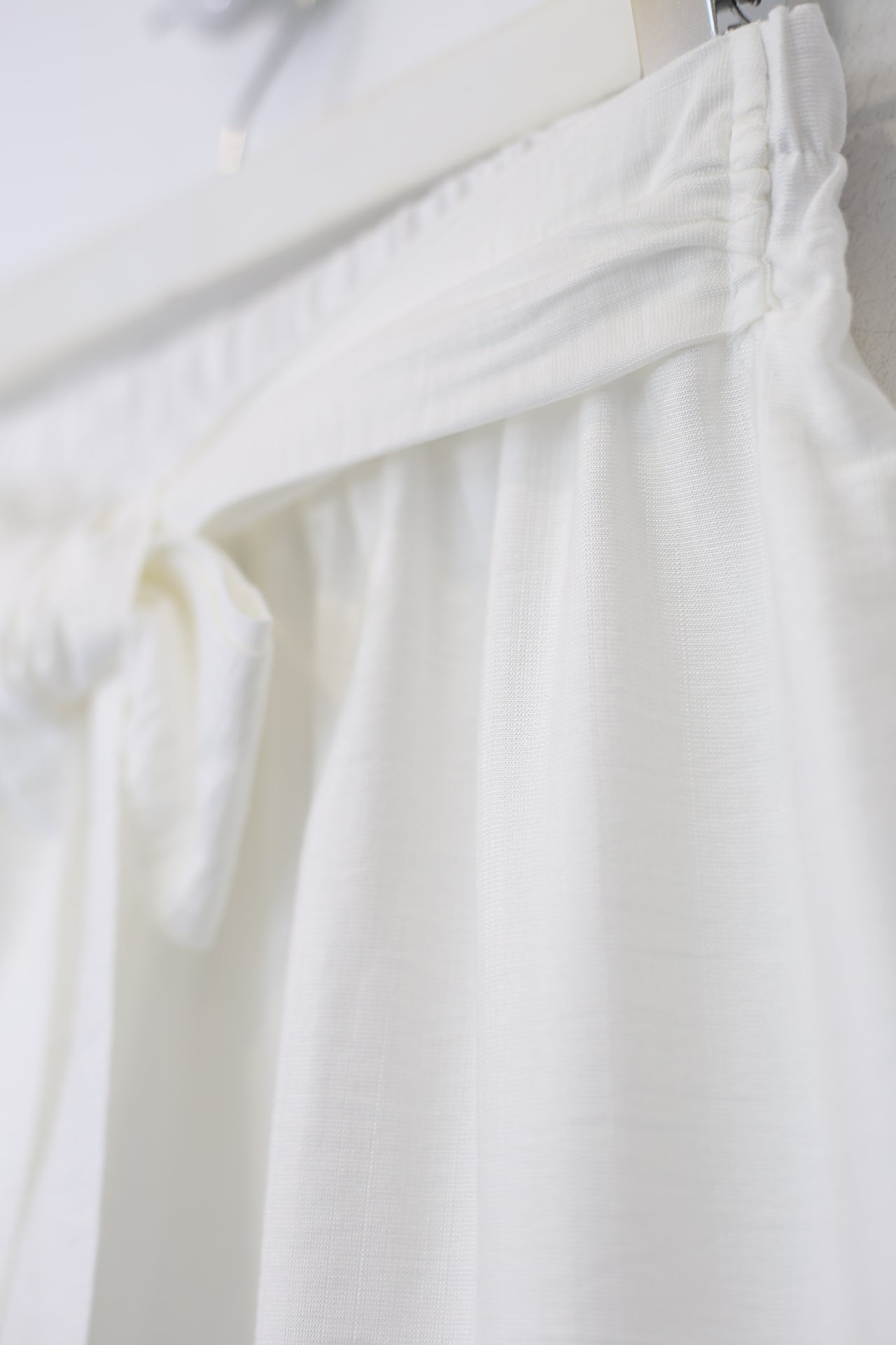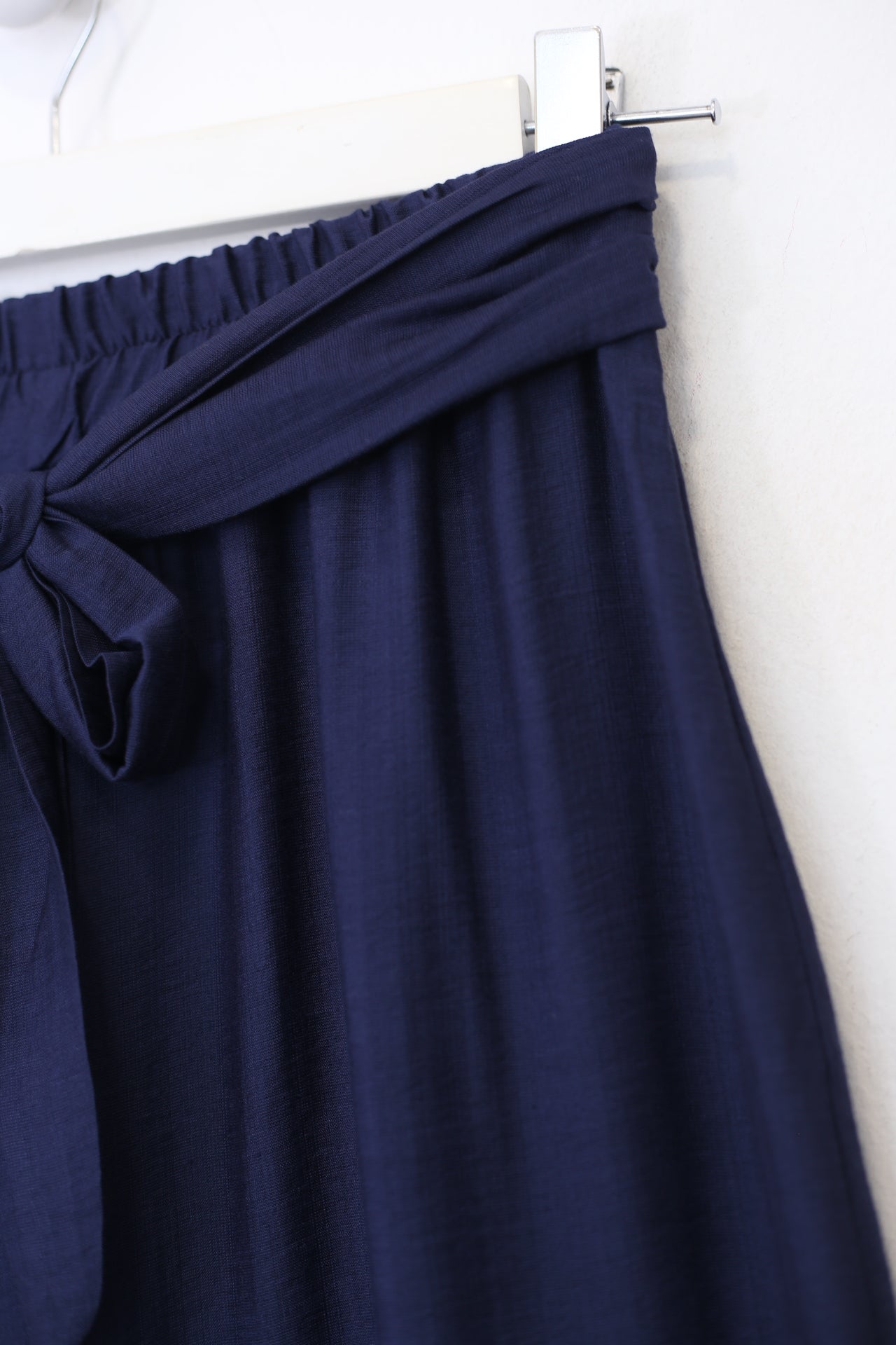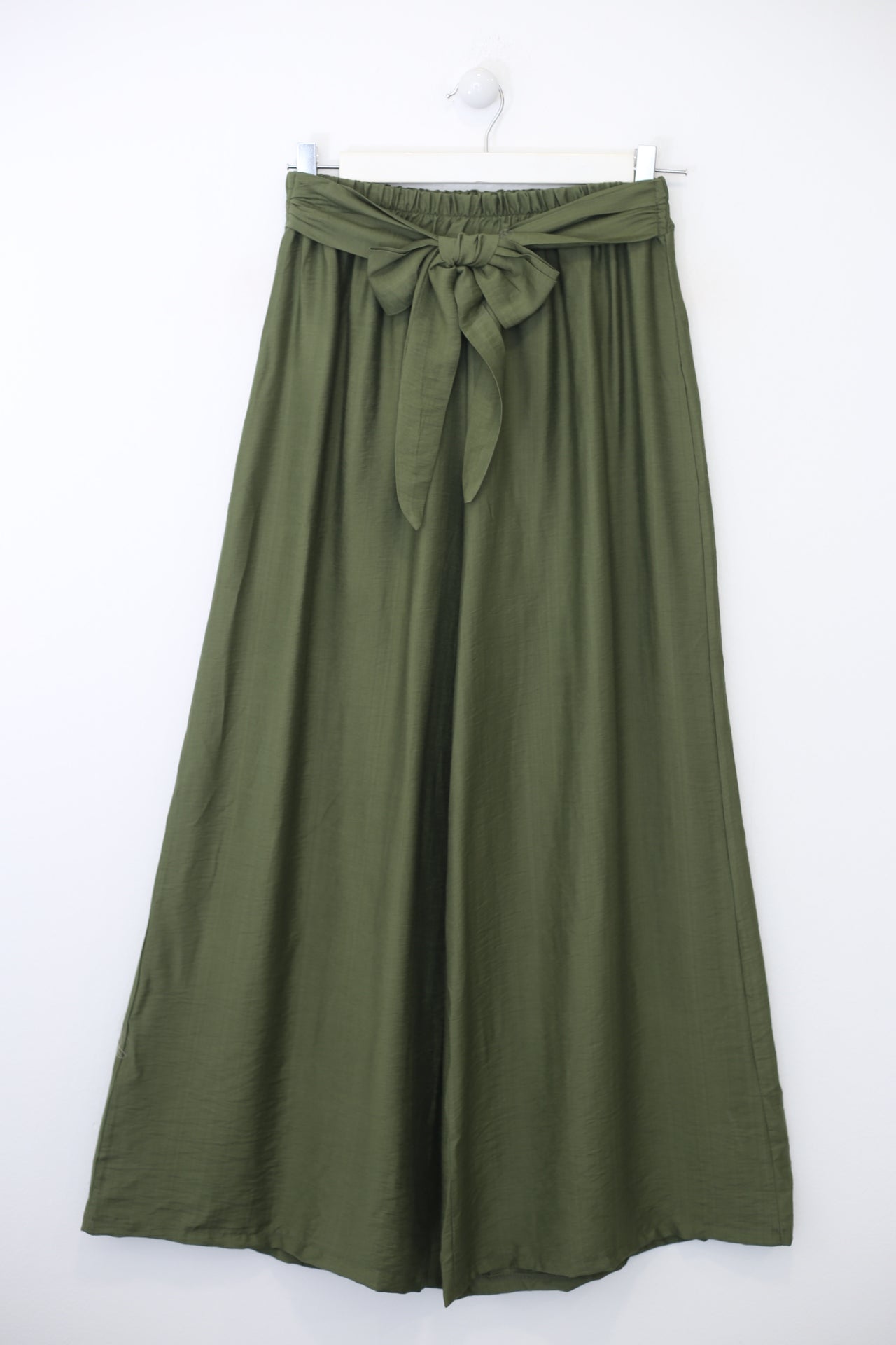Pantalones anchos de tiro alto. Cintura elástica con detalle de cinturón anudado.