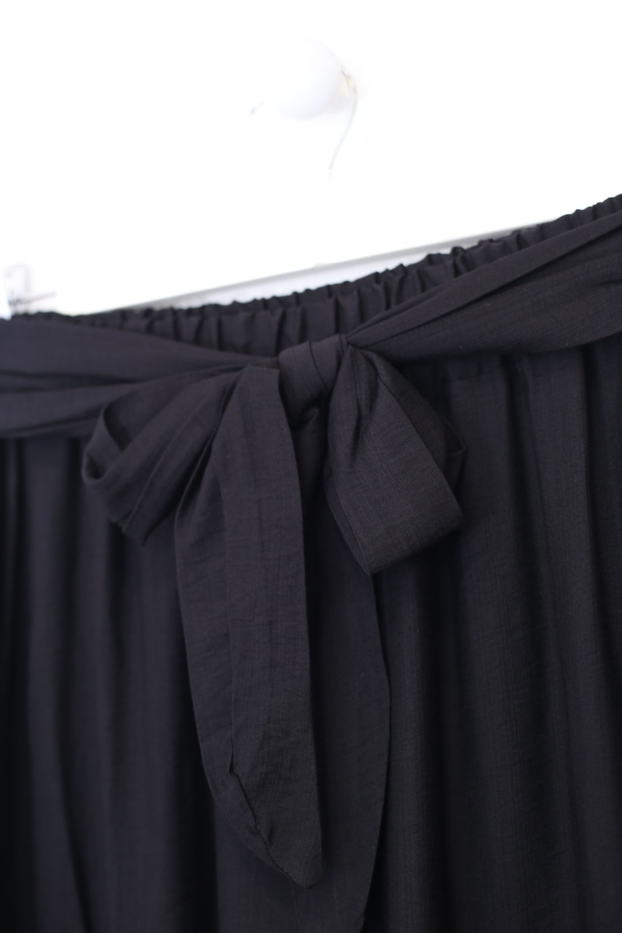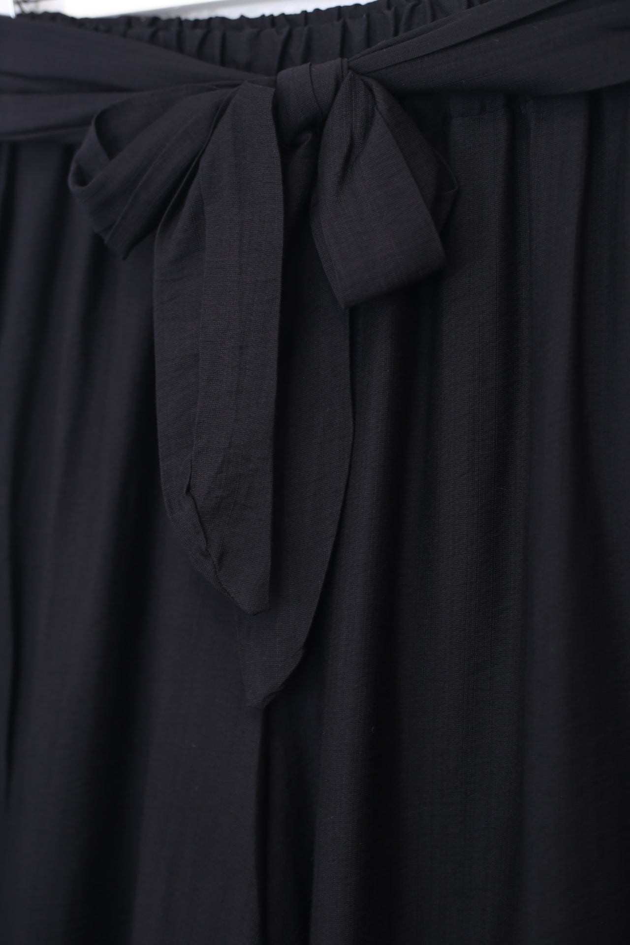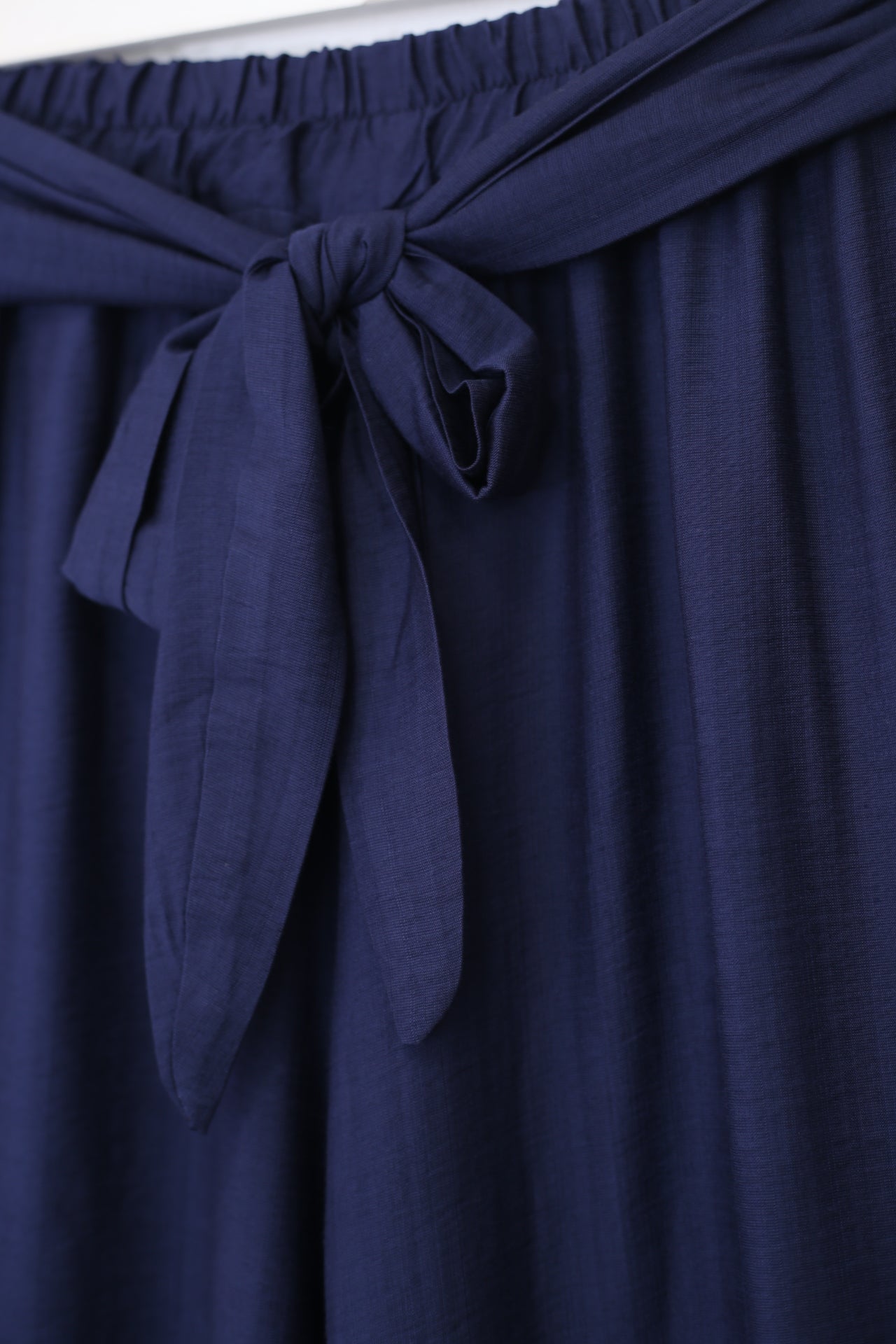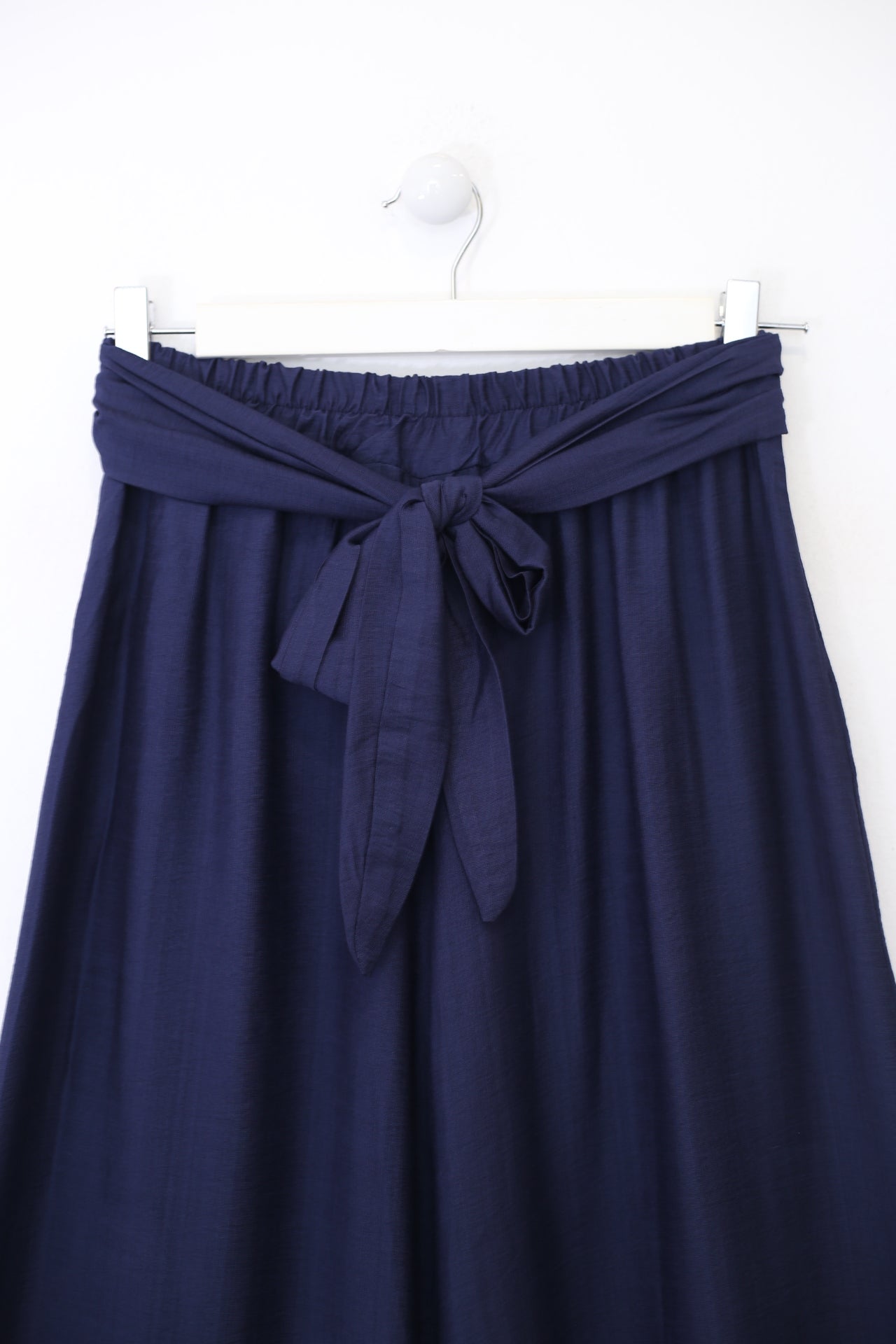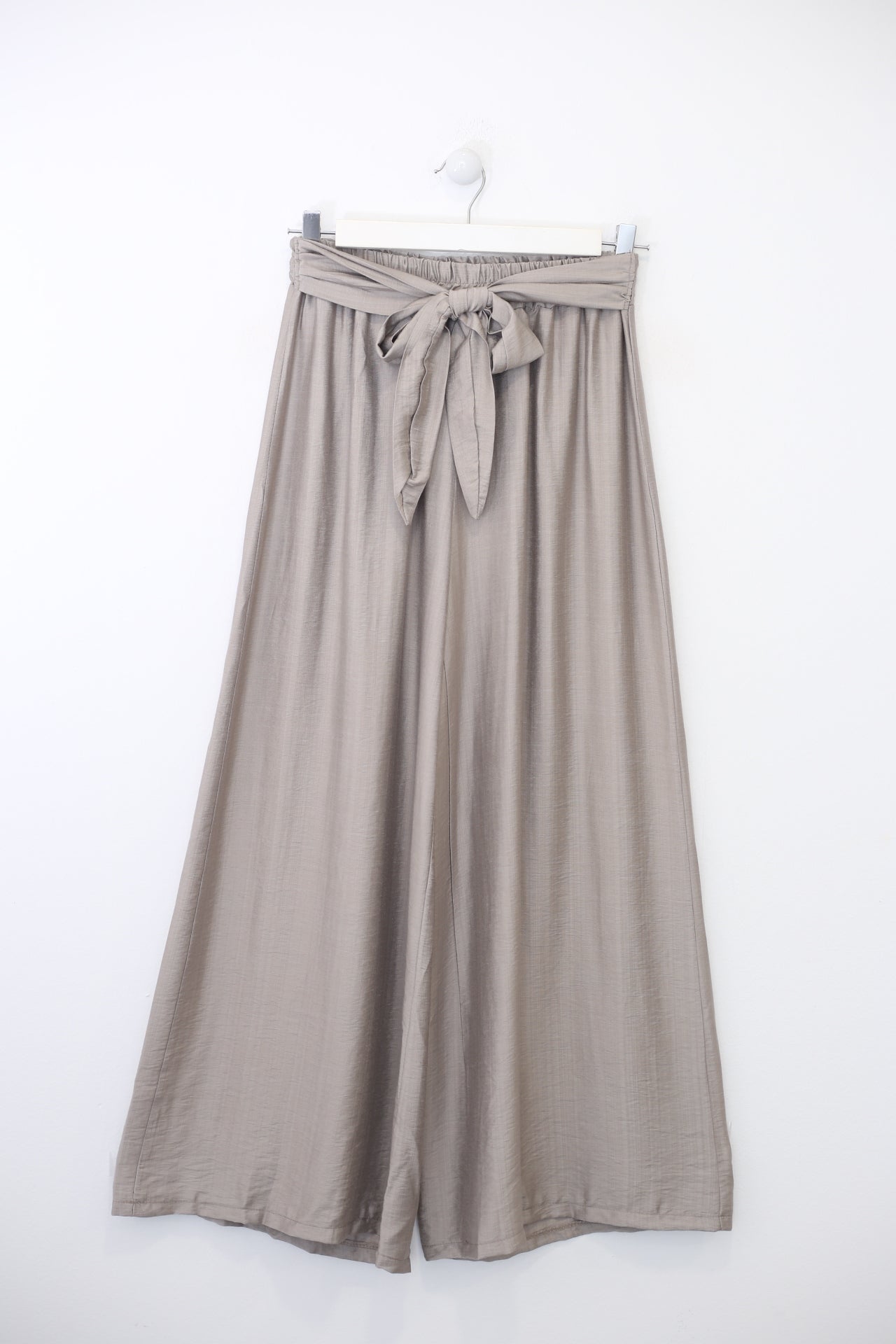 Pantalones anchos de tiro alto. Cintura elástica con detalle de cinturón anudado.
