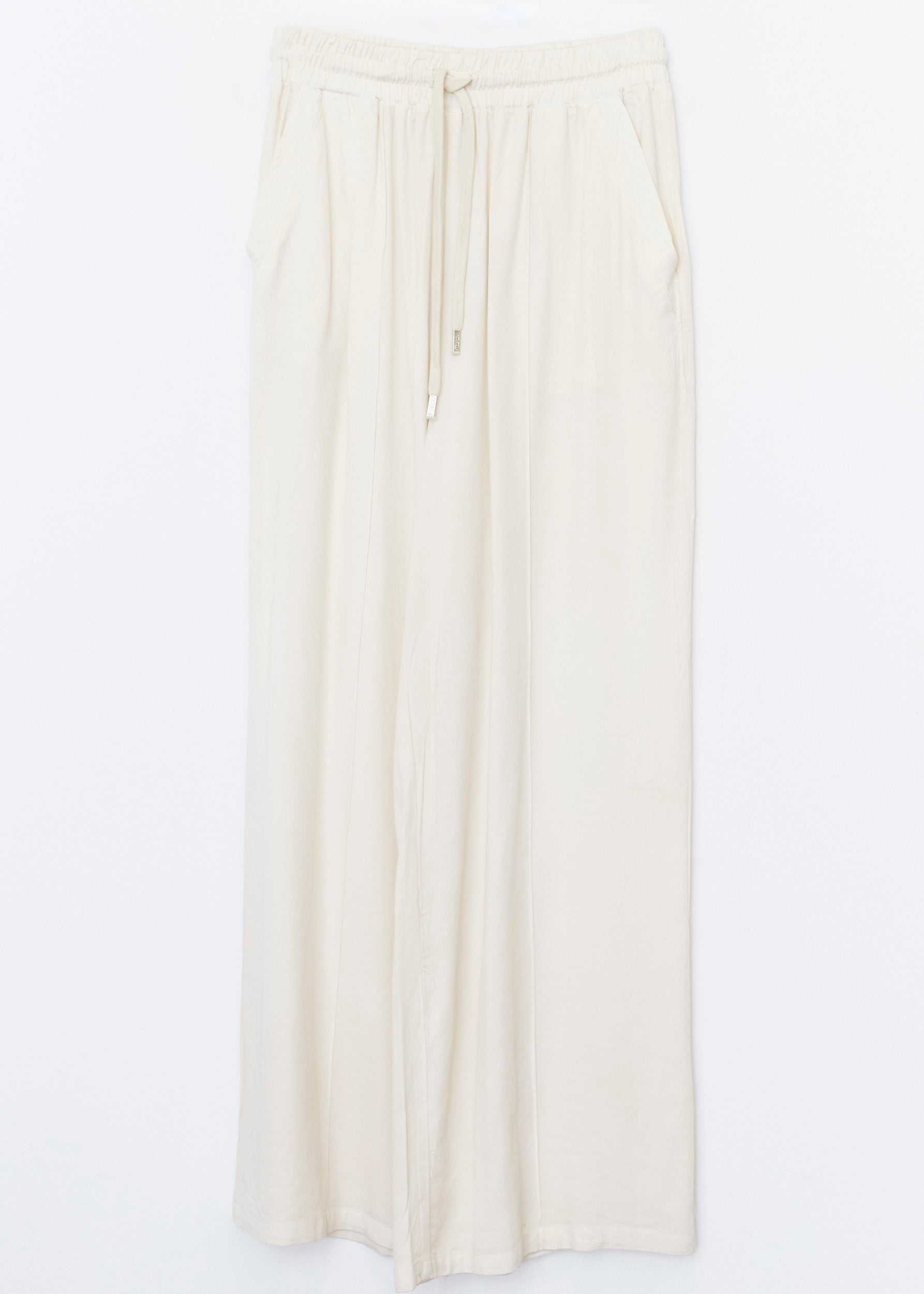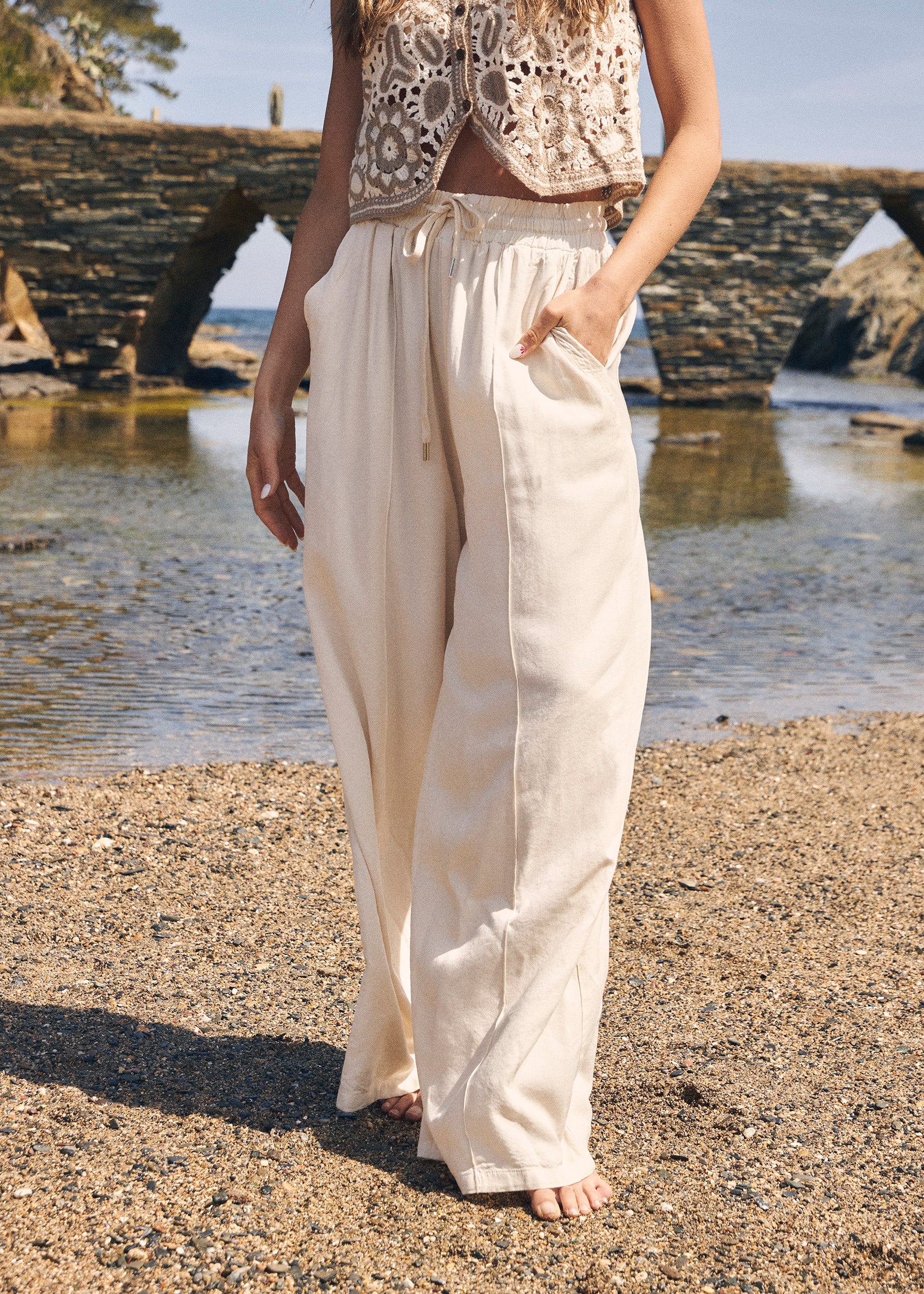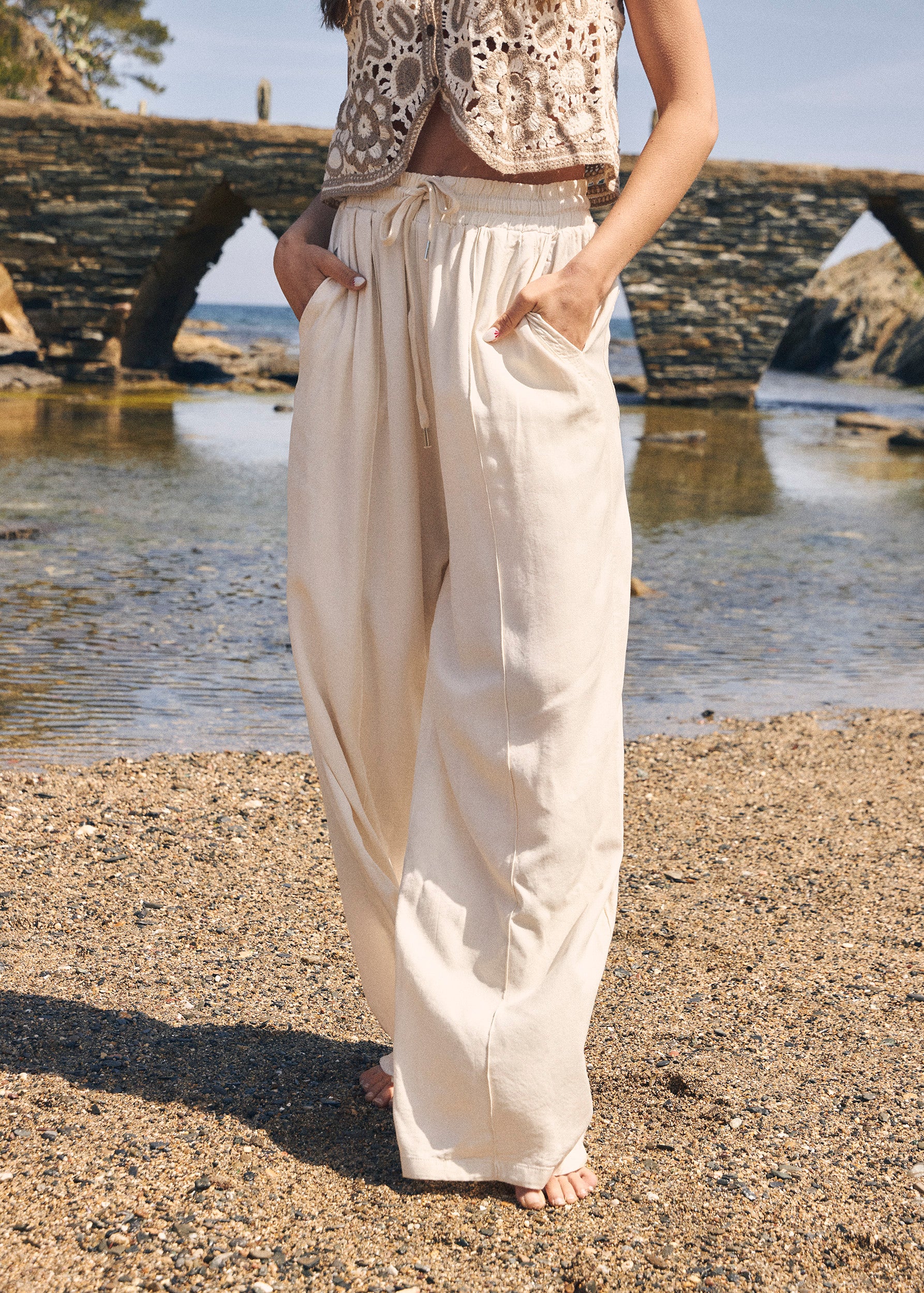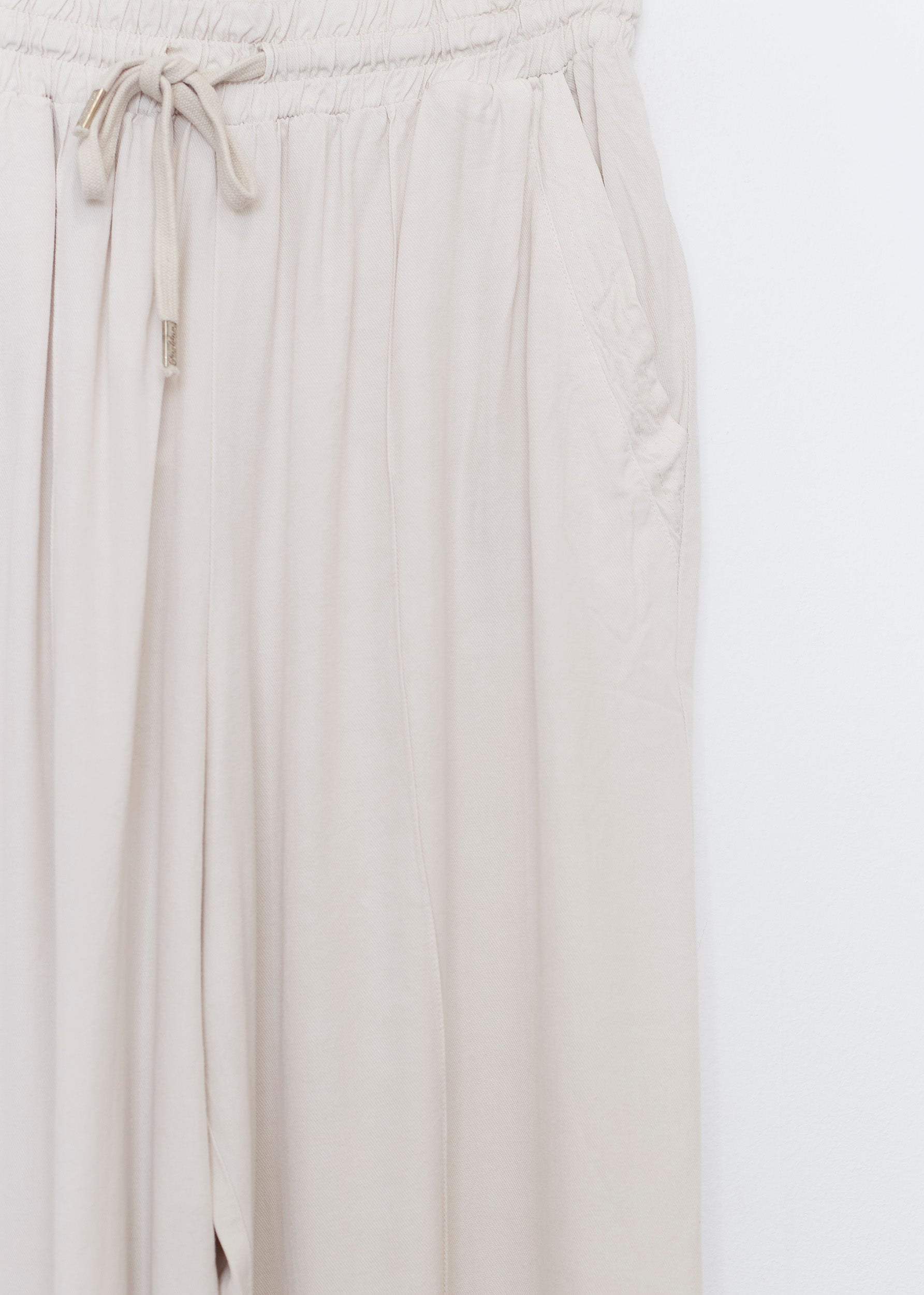 High-waisted wide-leg trousers. Elasticated waist with adjustable drawstring detail. Front pockets.