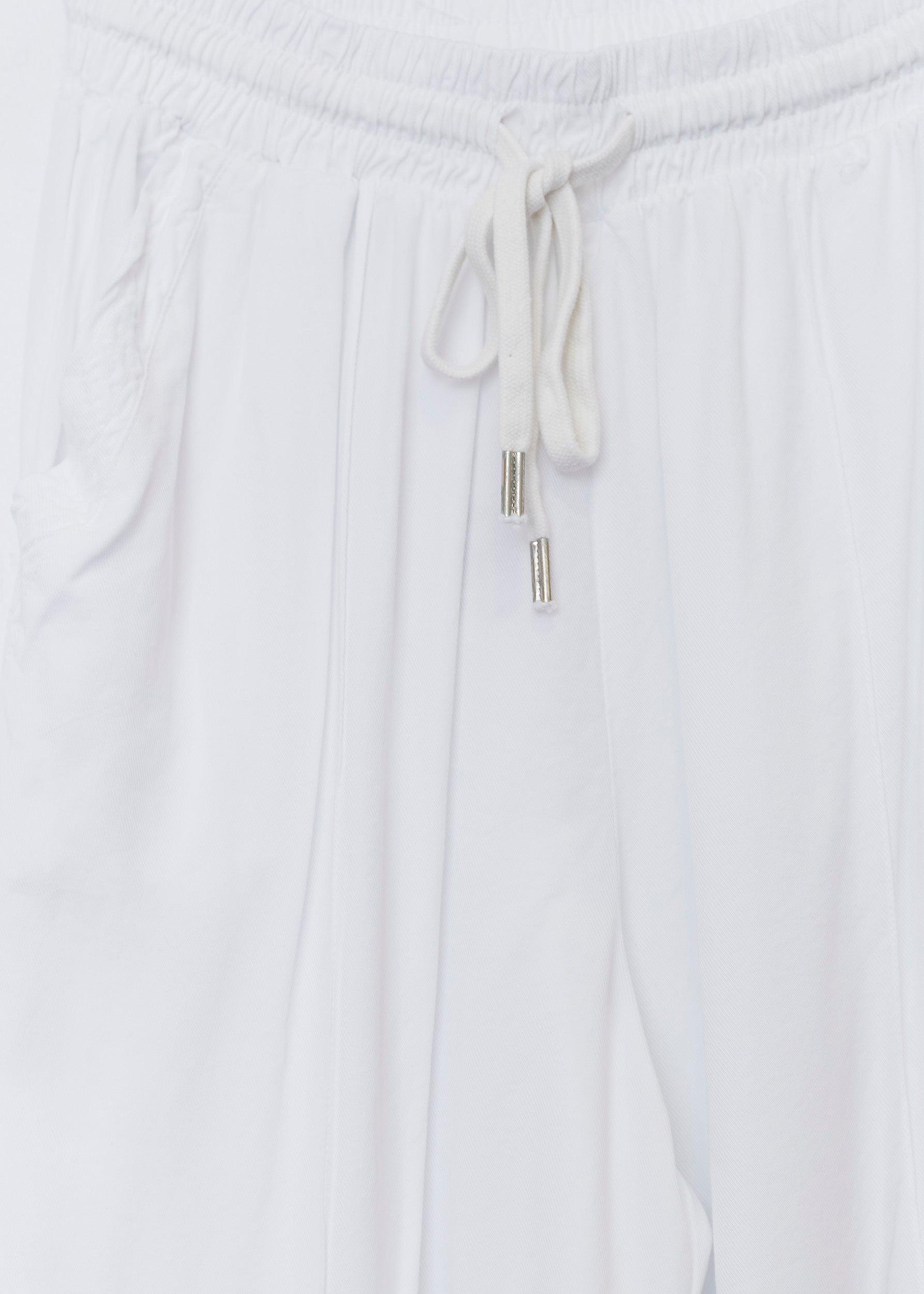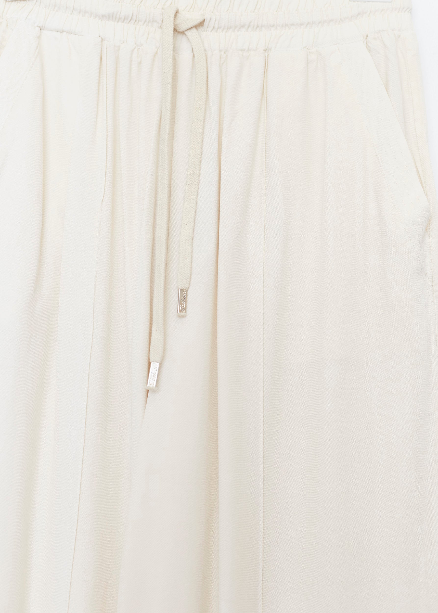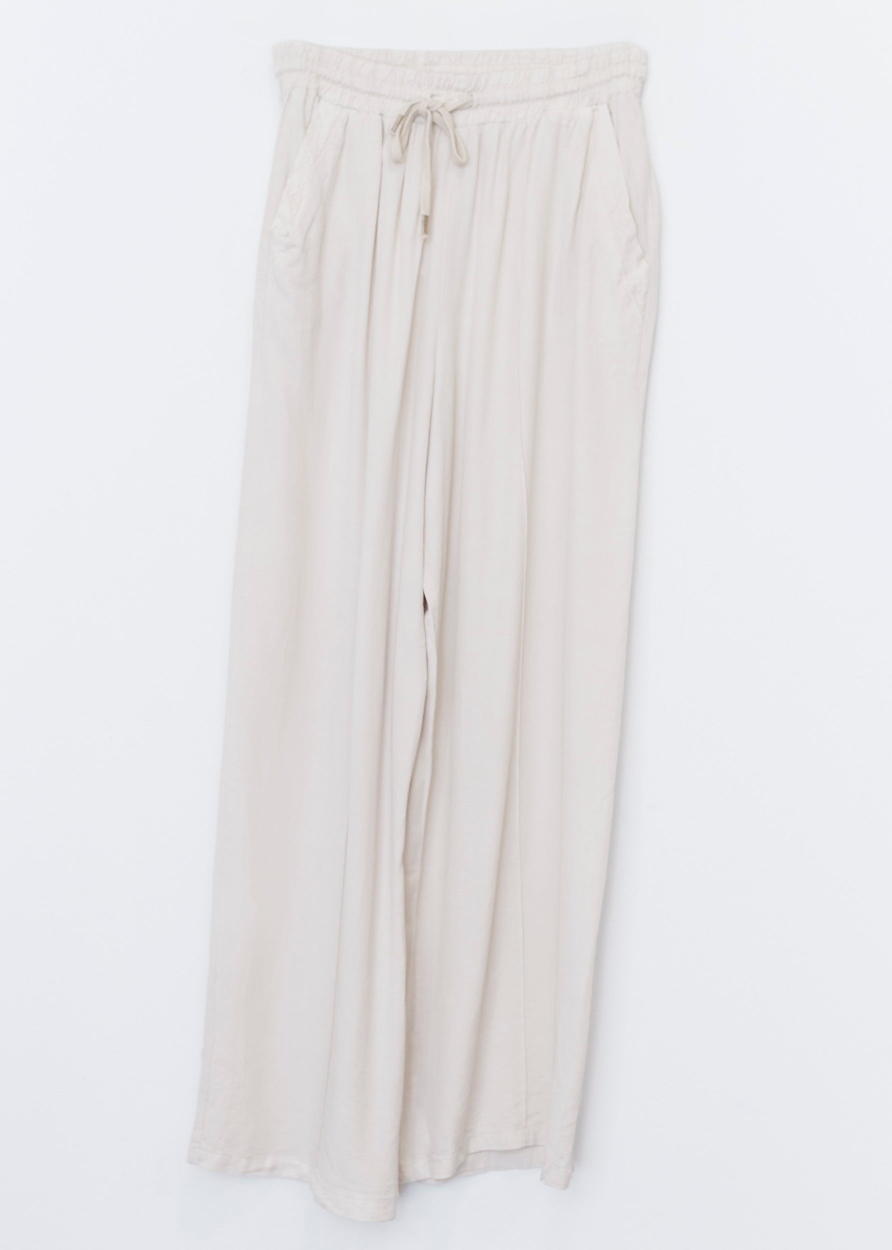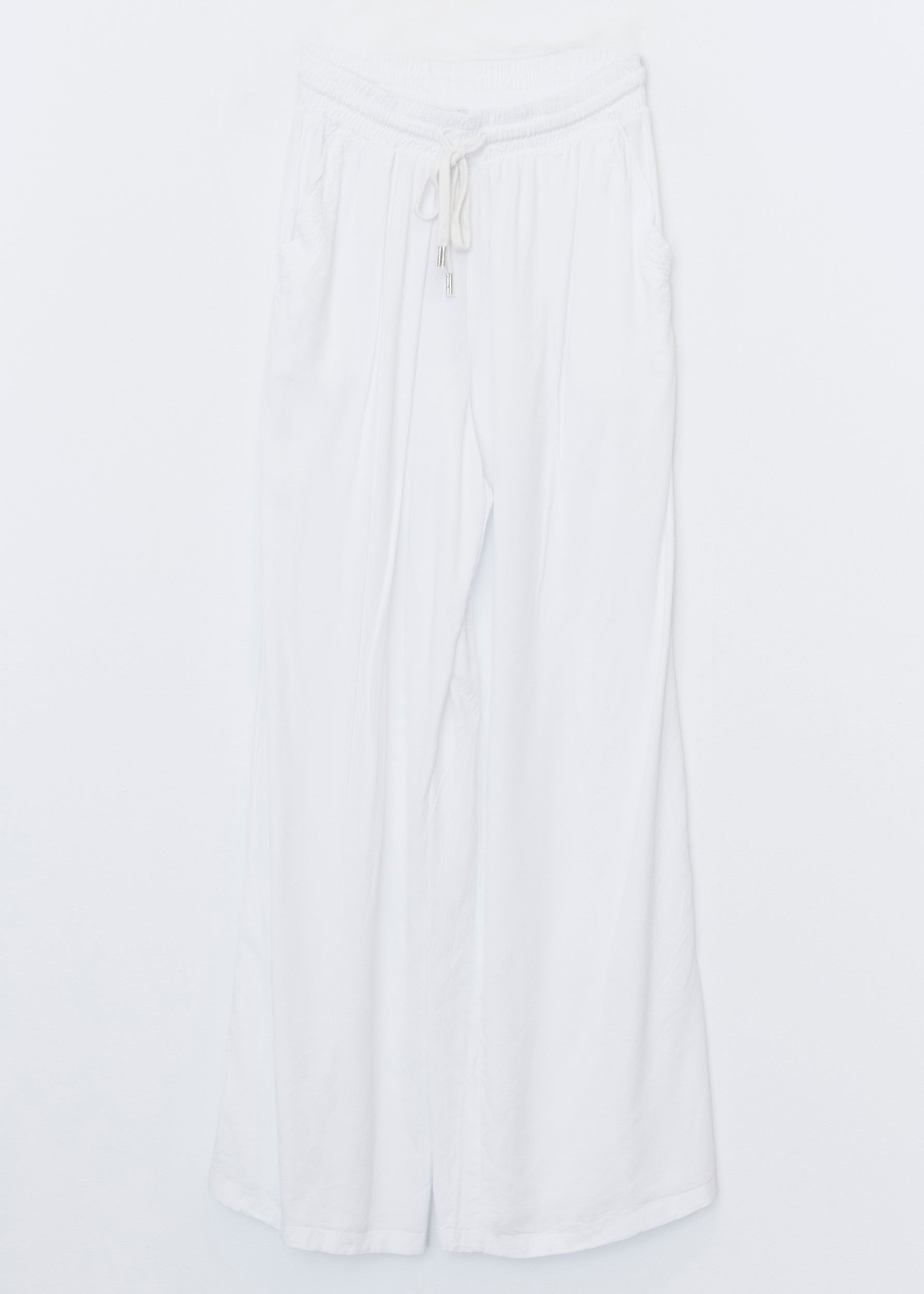 High-waisted wide-leg trousers. Elasticated waist with adjustable drawstring detail. Front pockets.