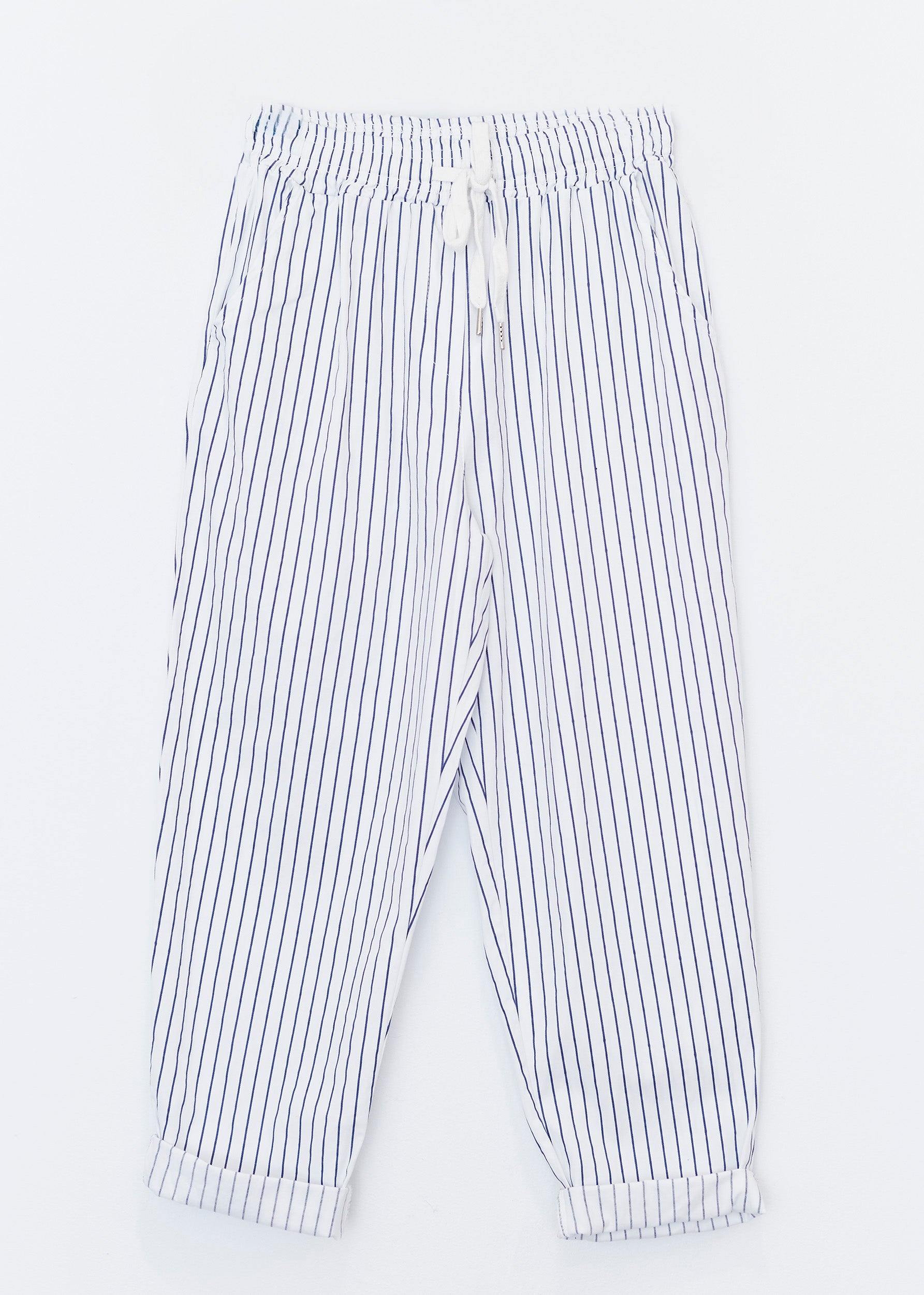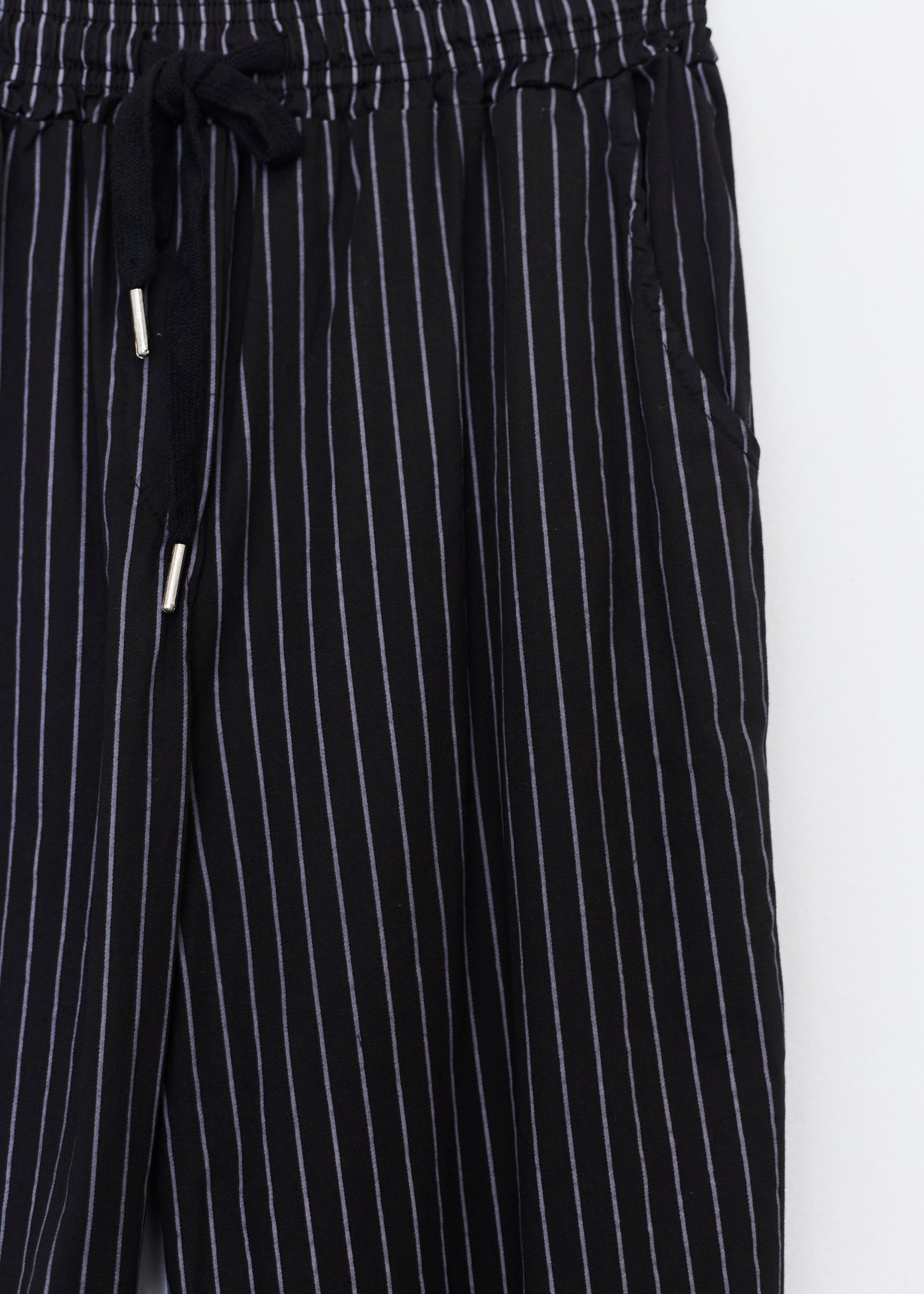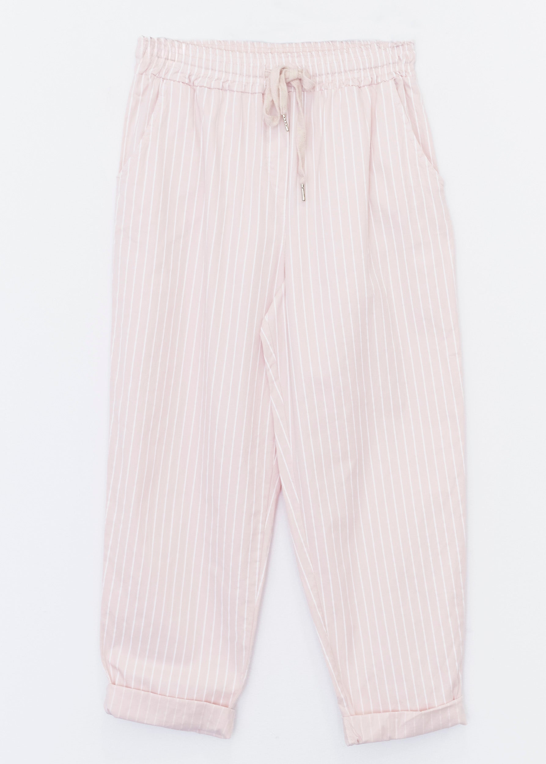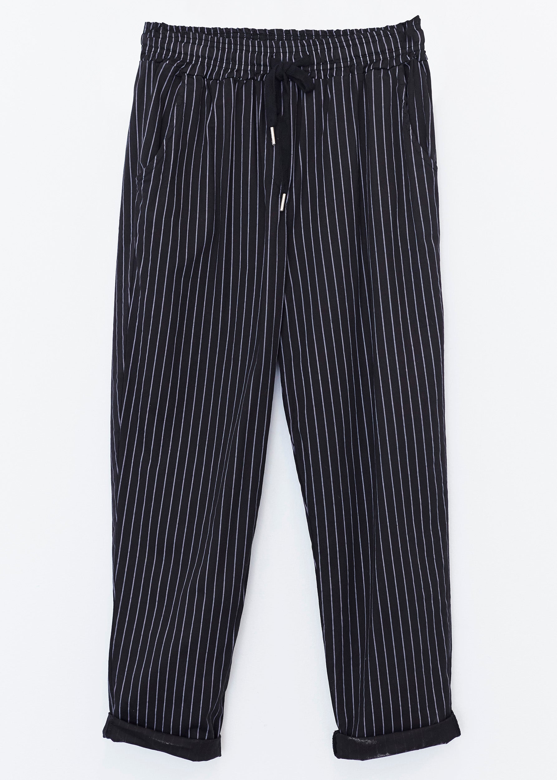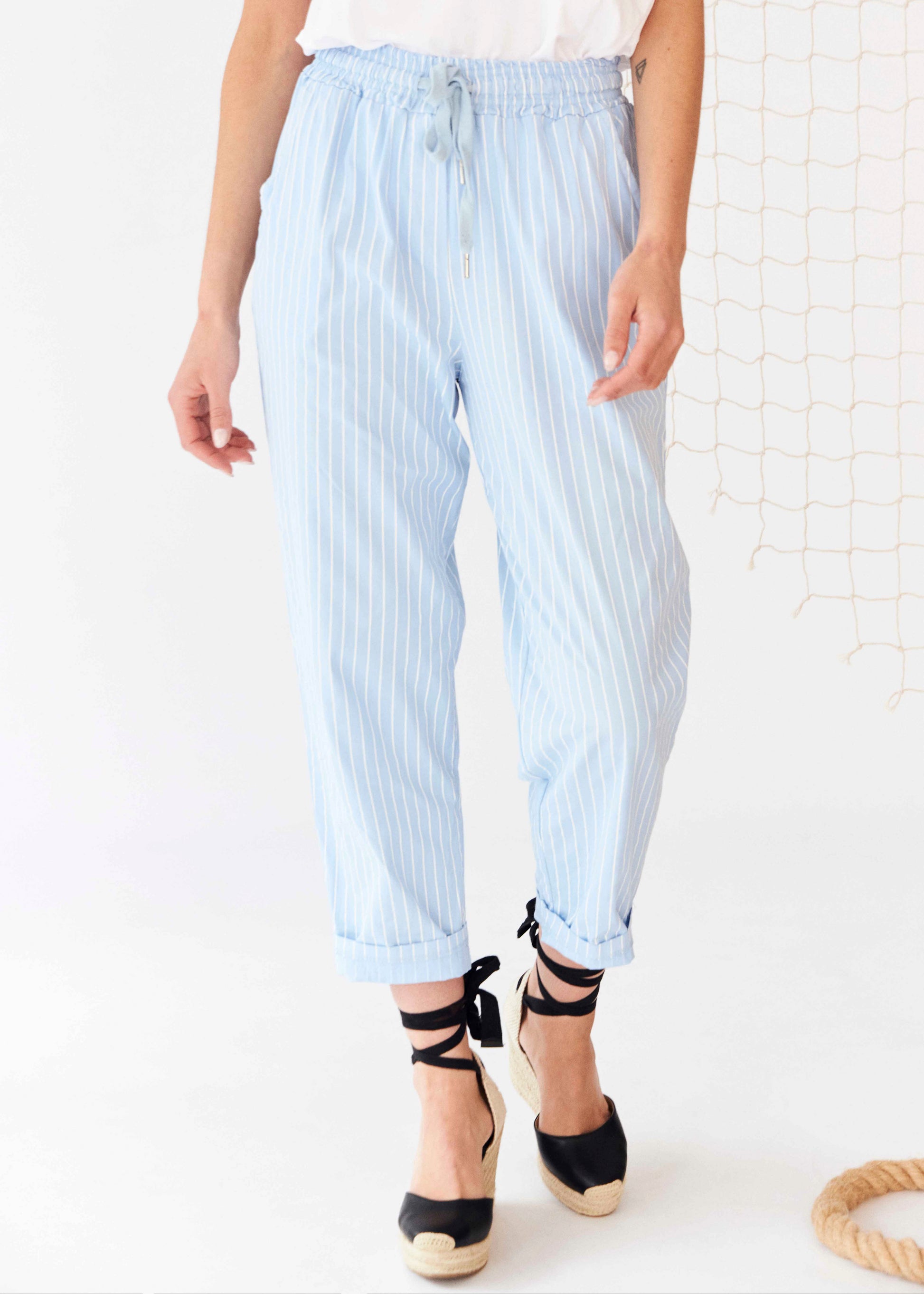 High-waisted pants with elastic waist with adjustable drawstring. Front and back pockets. Striped detail.