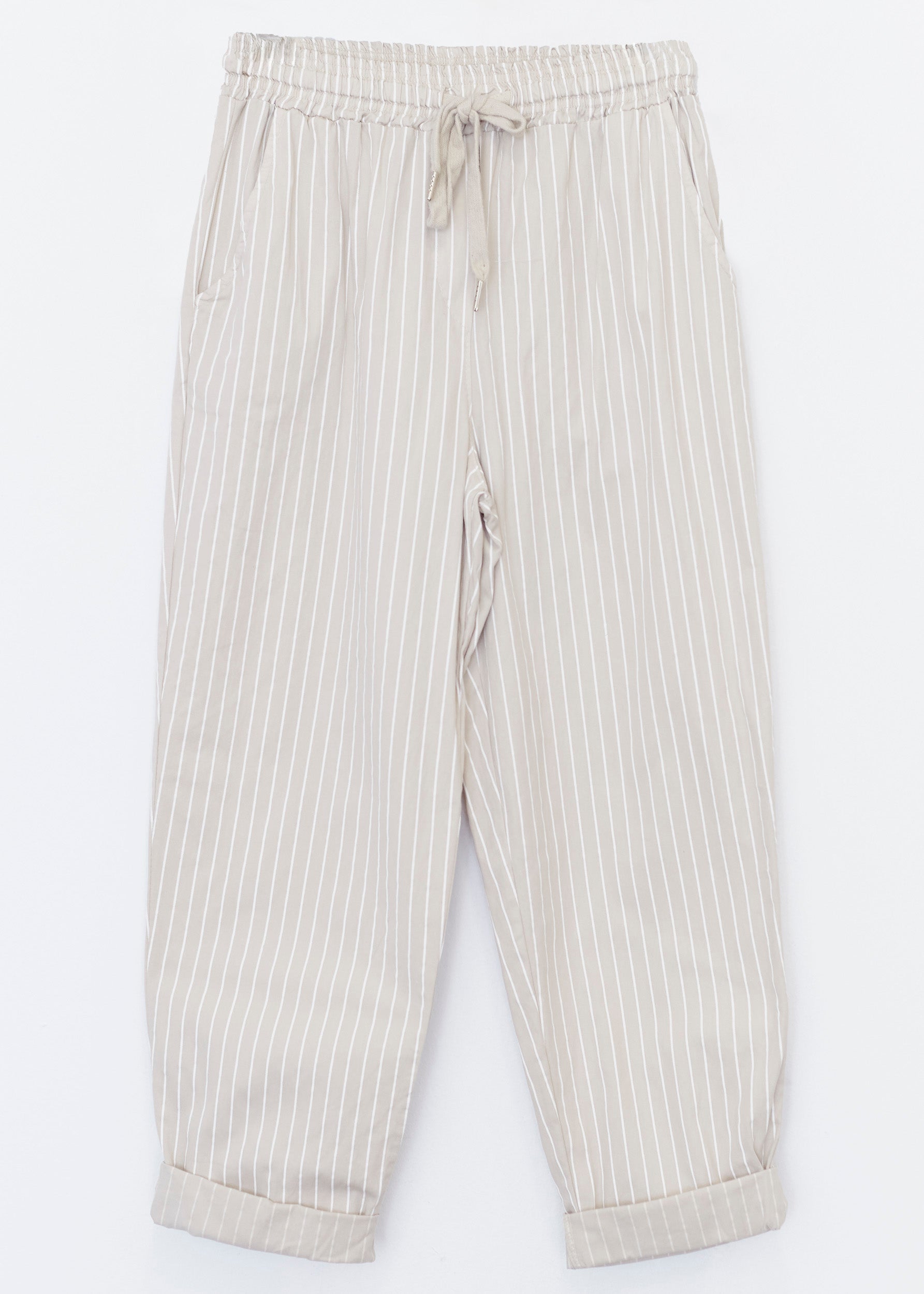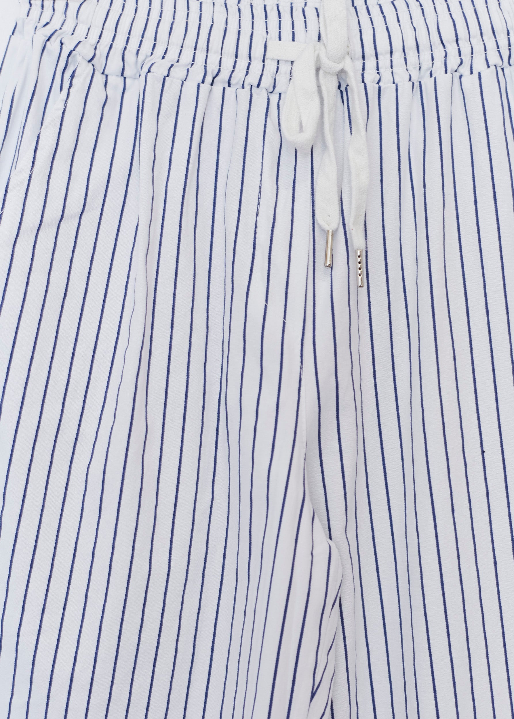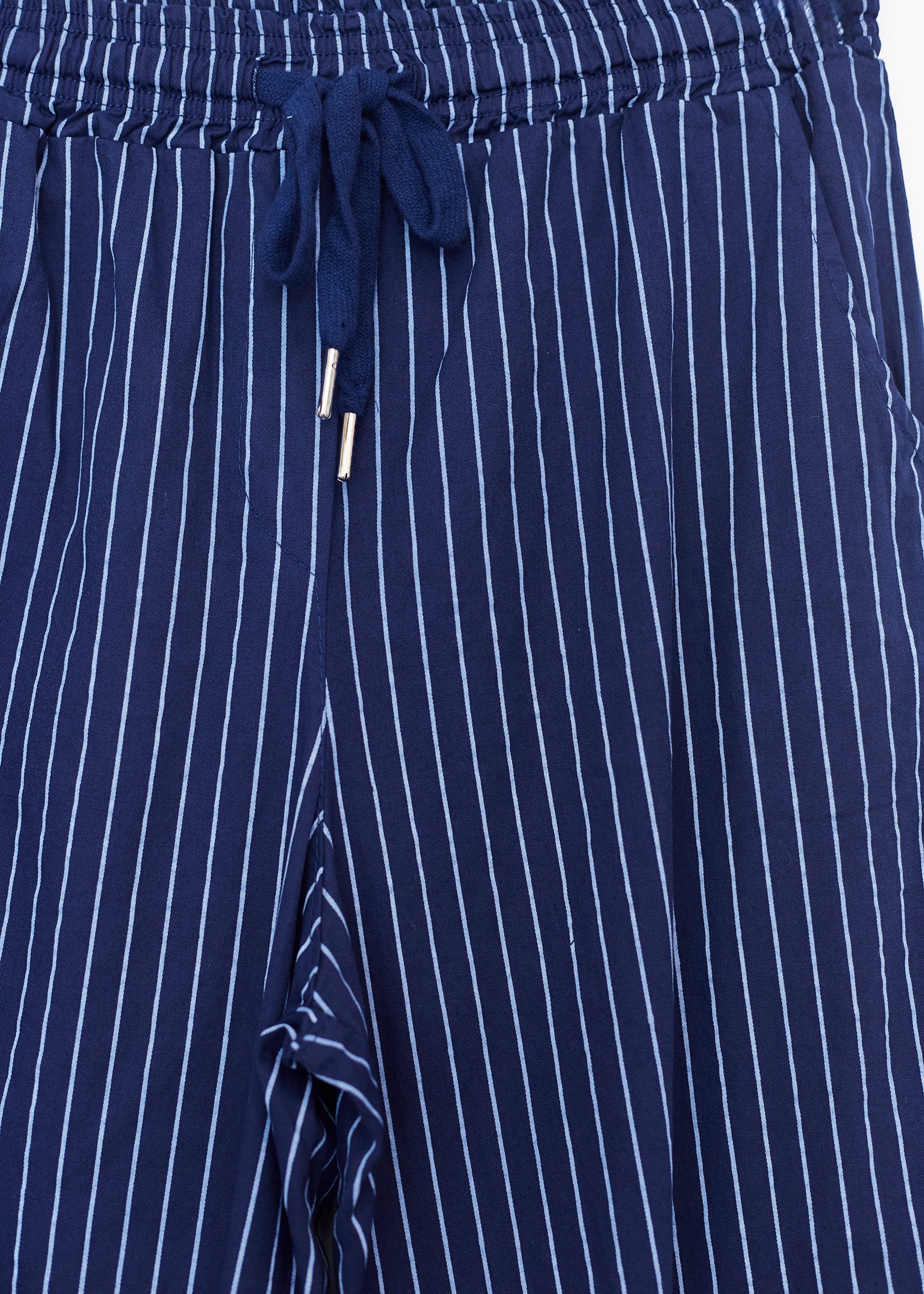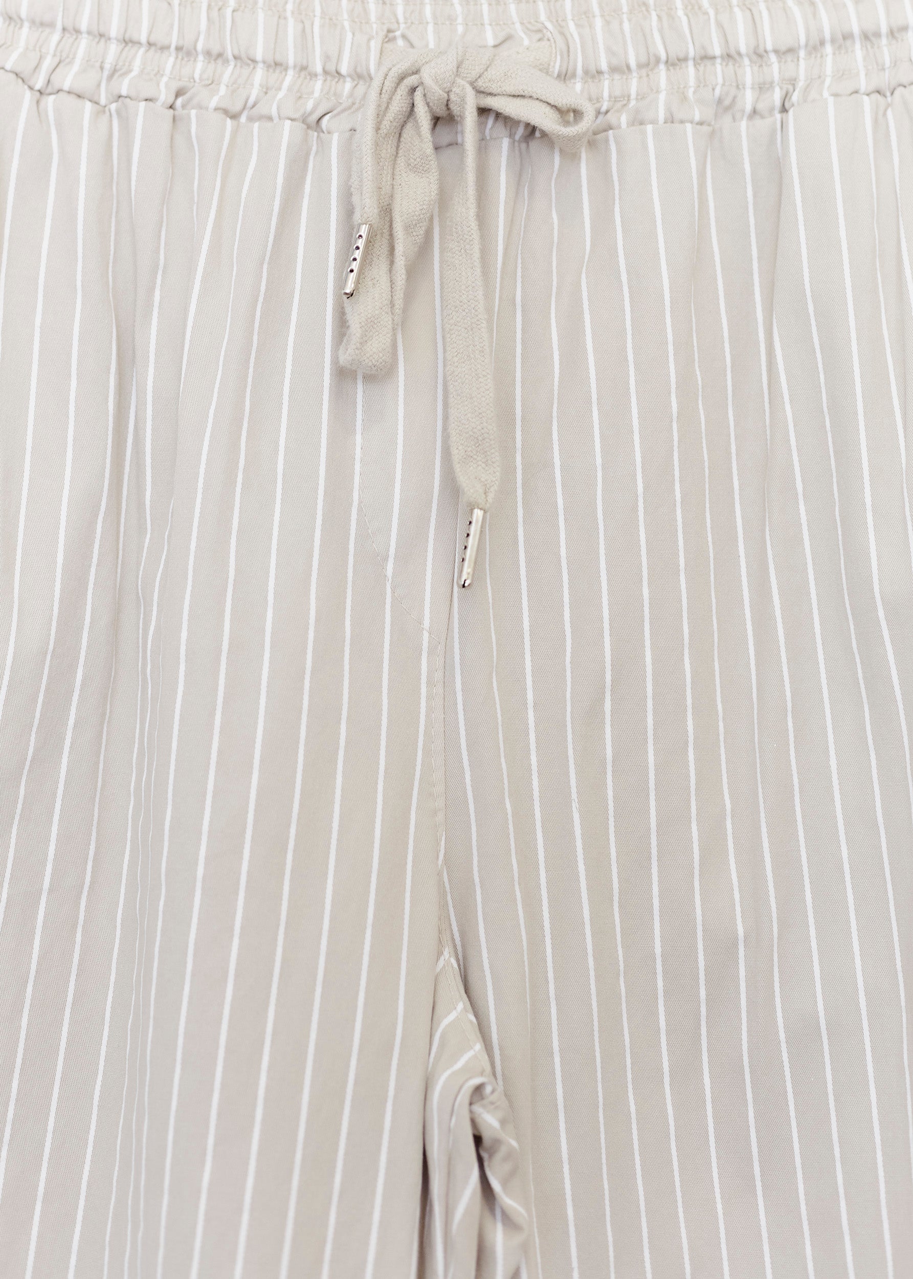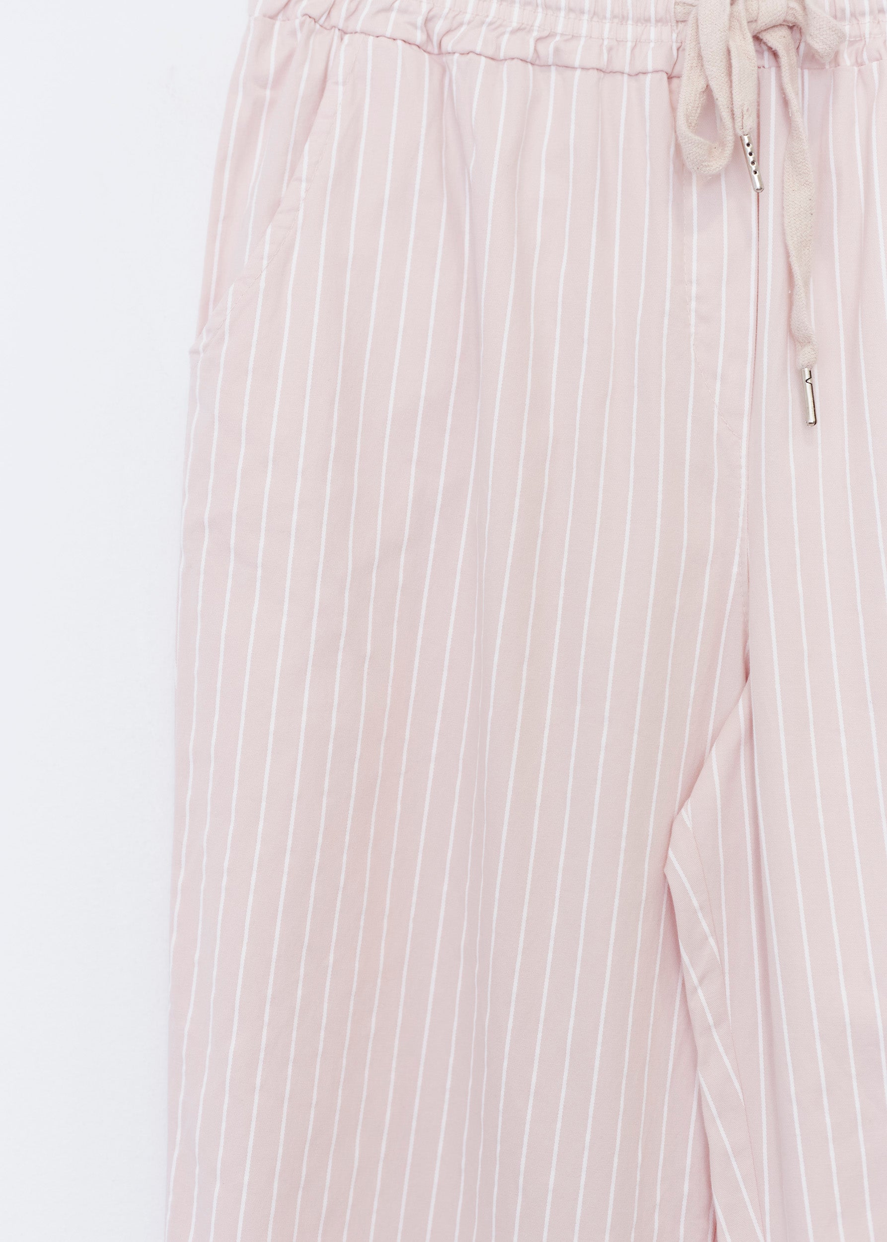 High-waisted pants with elastic waist with adjustable drawstring. Front and back pockets. Striped detail.