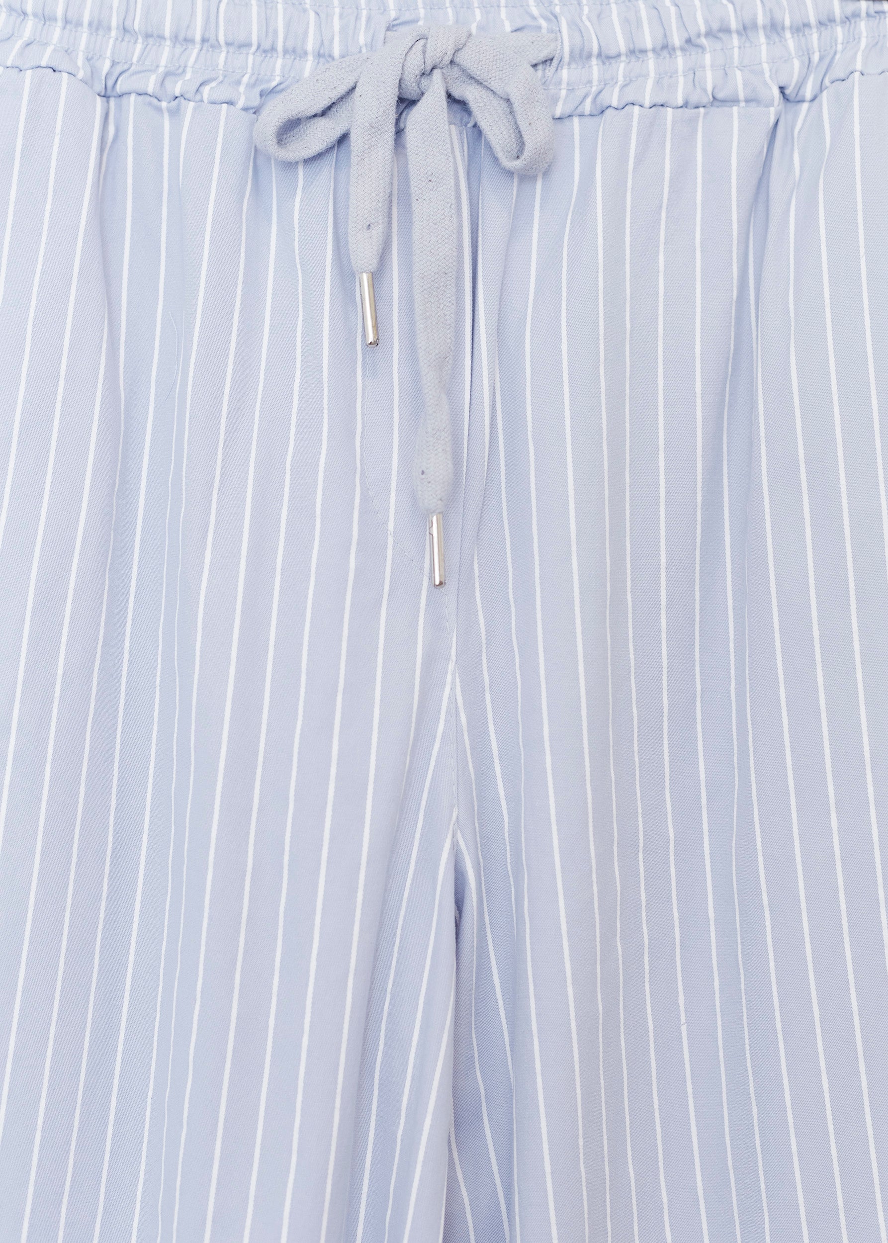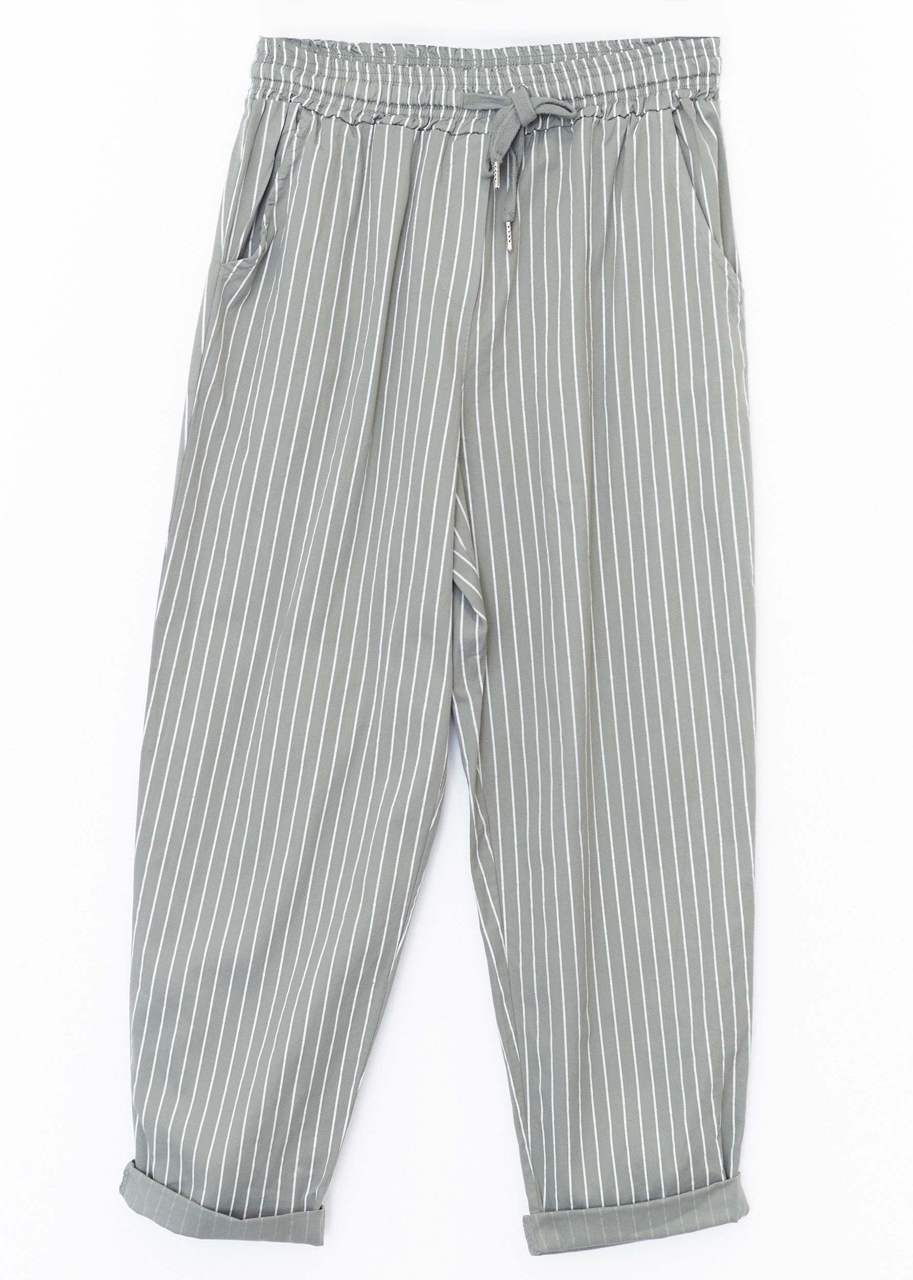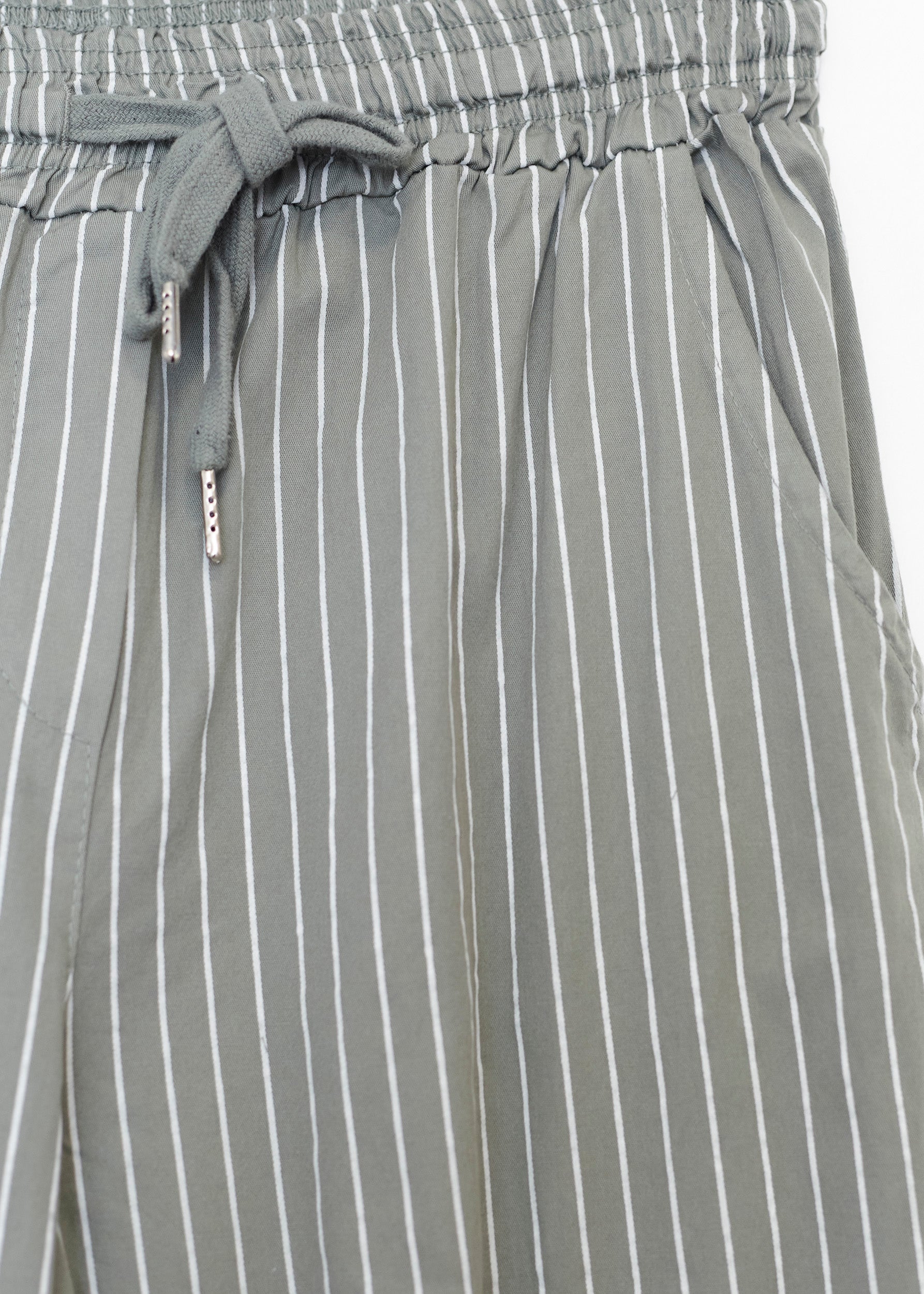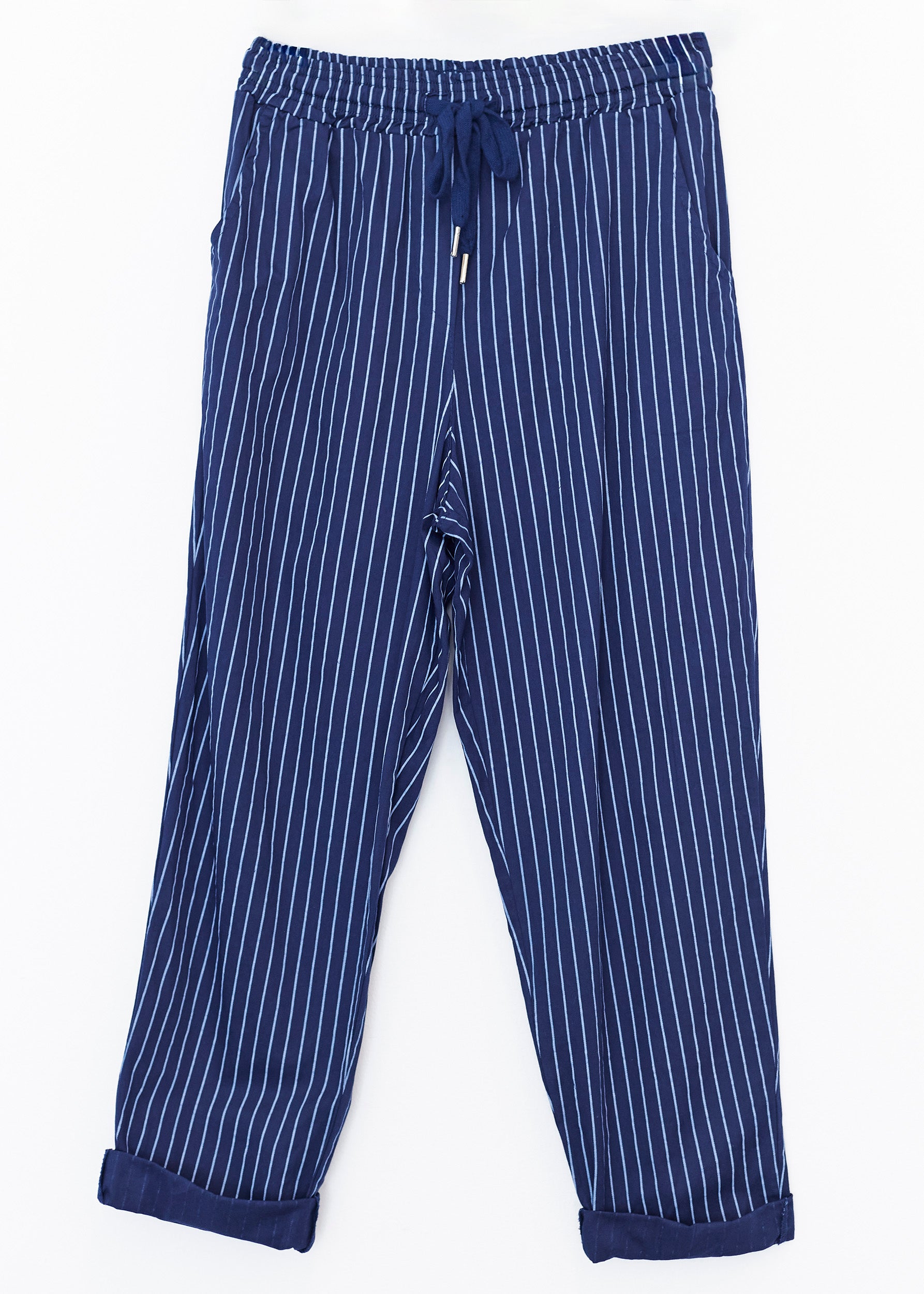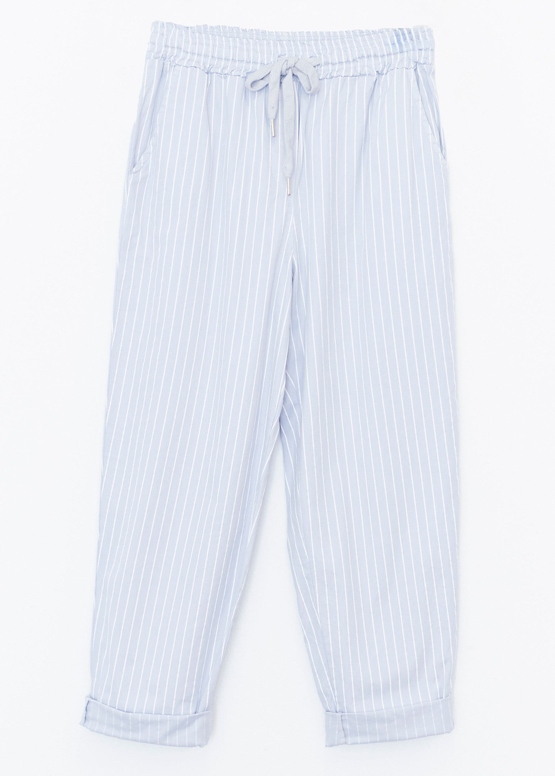 High-waisted pants with elastic waist with adjustable drawstring. Front and back pockets. Striped detail.