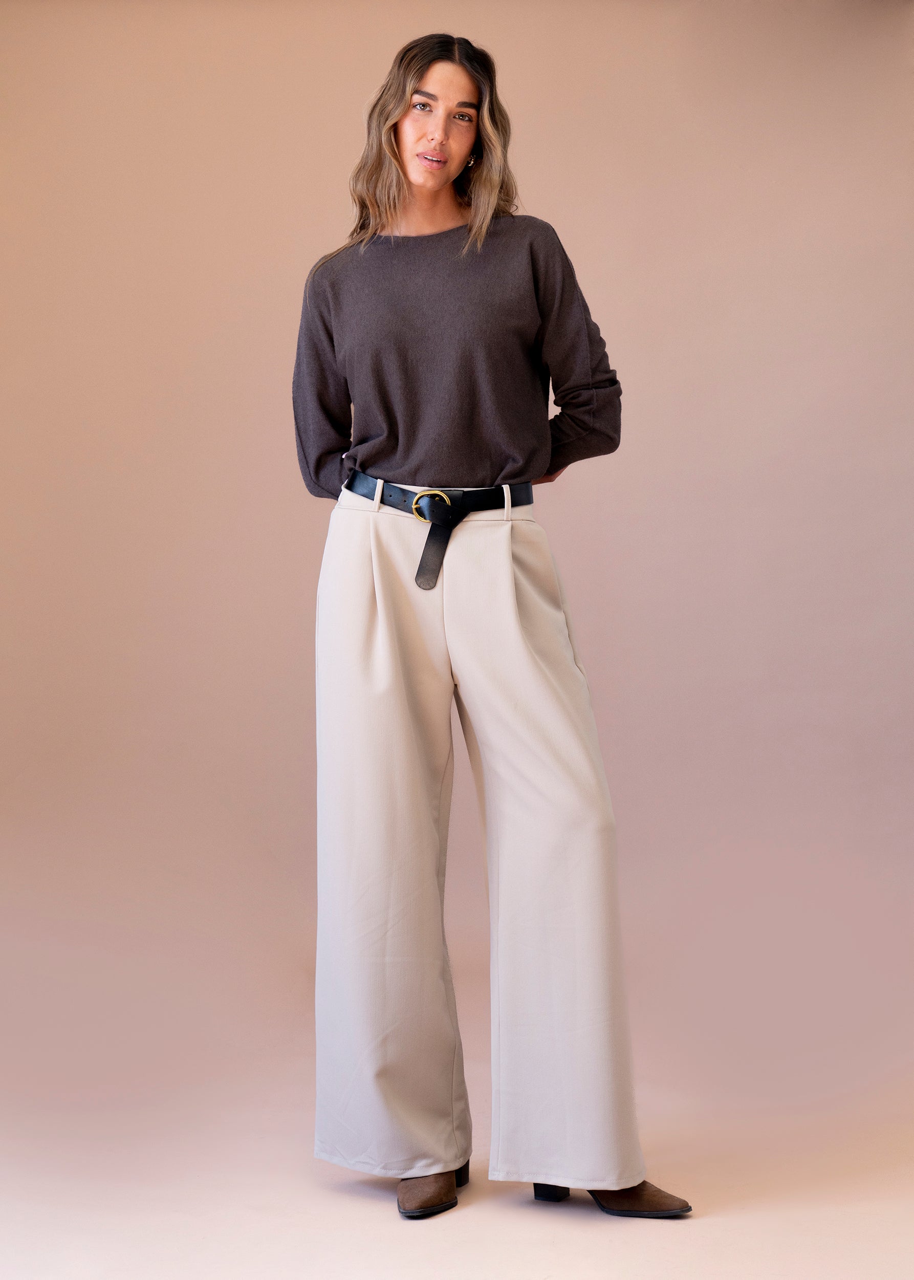 Pantalones de tiro alto y pierna ancha tipo sastre. Trabillas y cinturón con hebilla dorada. Cintura con elástico en parte trasera.