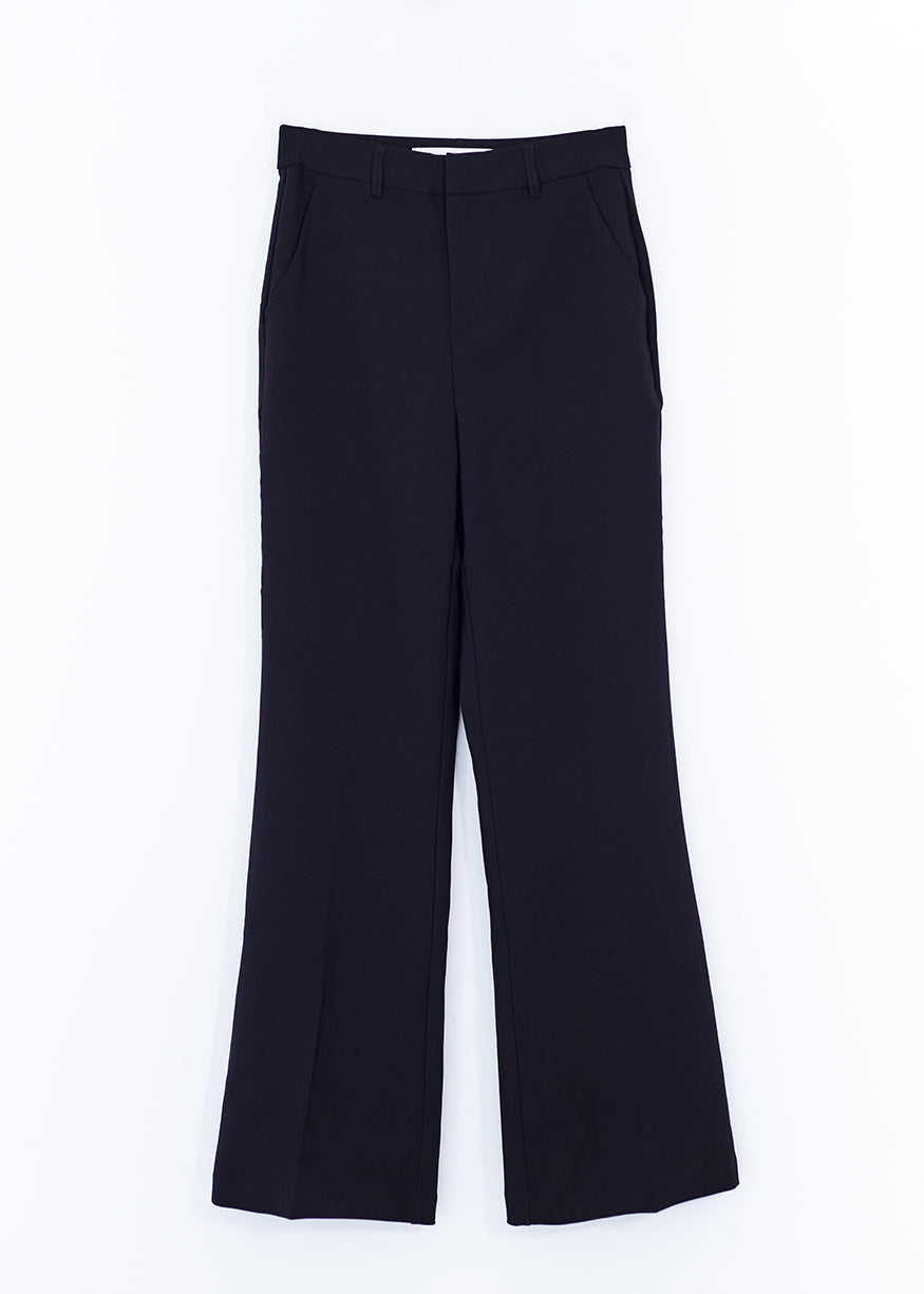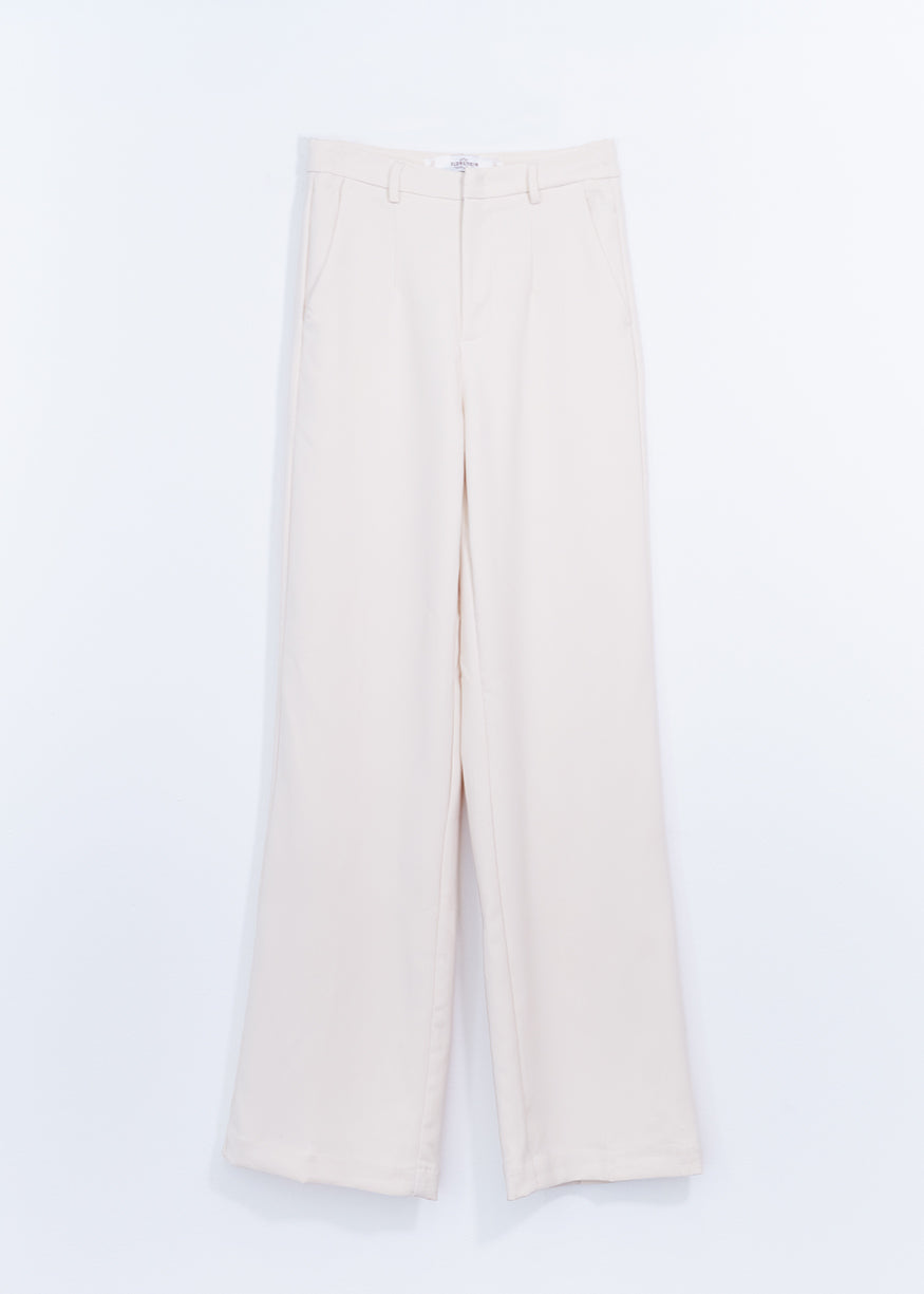 High-waisted tailored pants with slightly flared wide legs. Front closure with hidden belt loop and zipper. Front pockets and false back pockets.