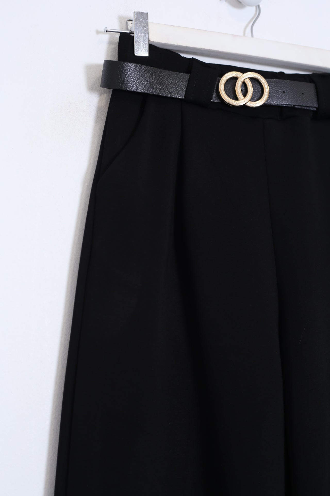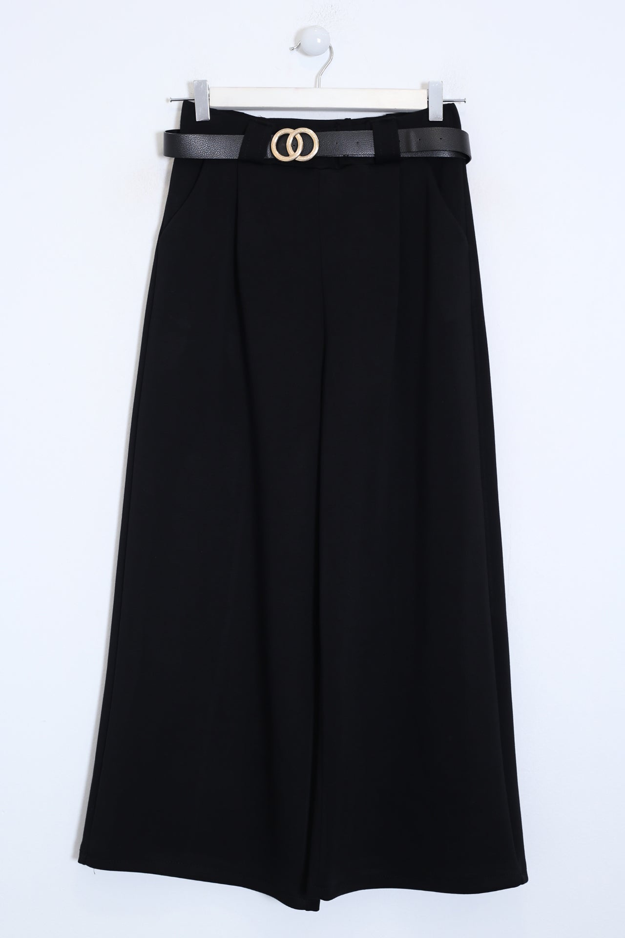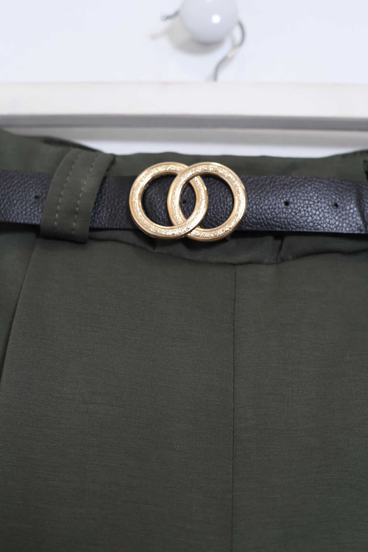 Pantalones de tiro alto y pierna ancha. Detalle de cinturón a contraste con hebilla metálica. Bolsillos laterales. Cintura elástica.