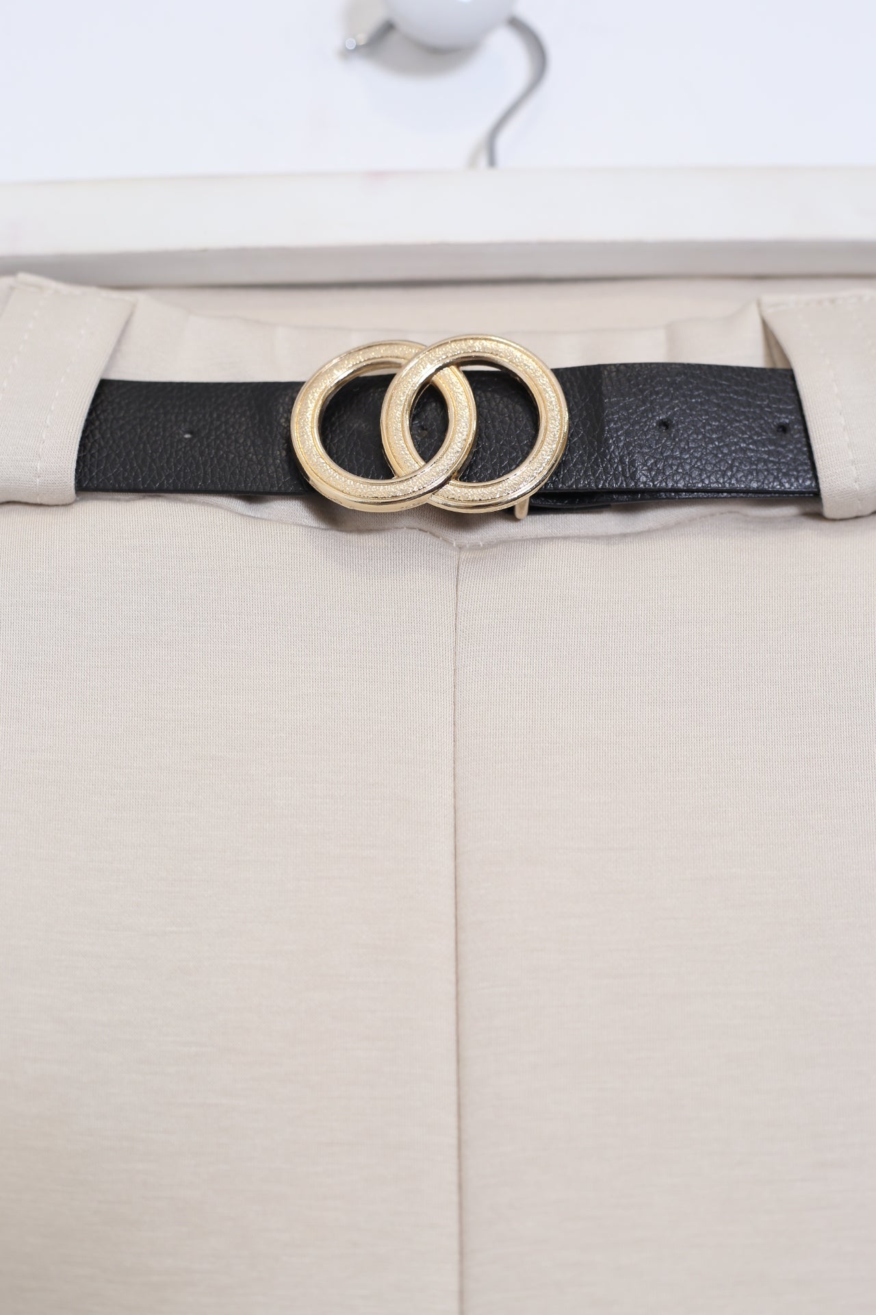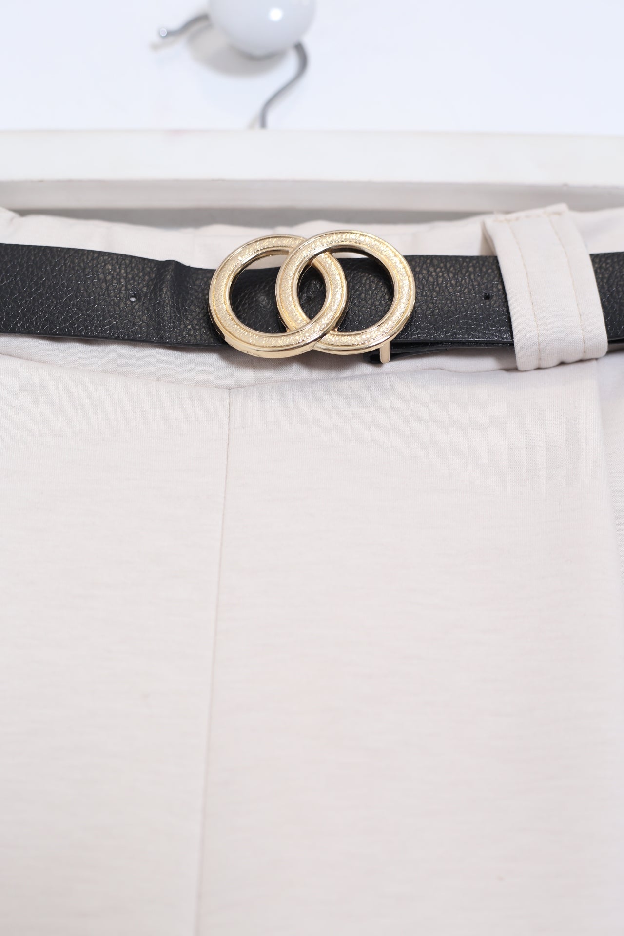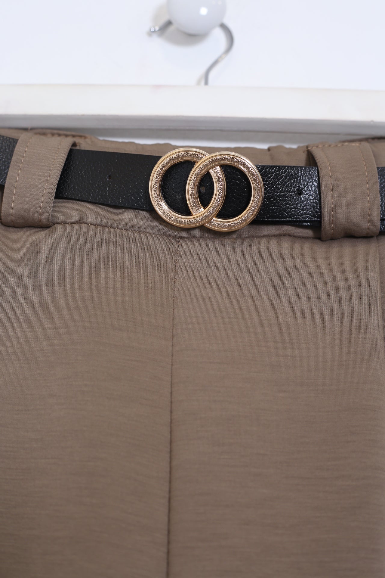 Pantalones de tiro alto y pierna ancha. Detalle de cinturón a contraste con hebilla metálica. Bolsillos laterales. Cintura elástica.