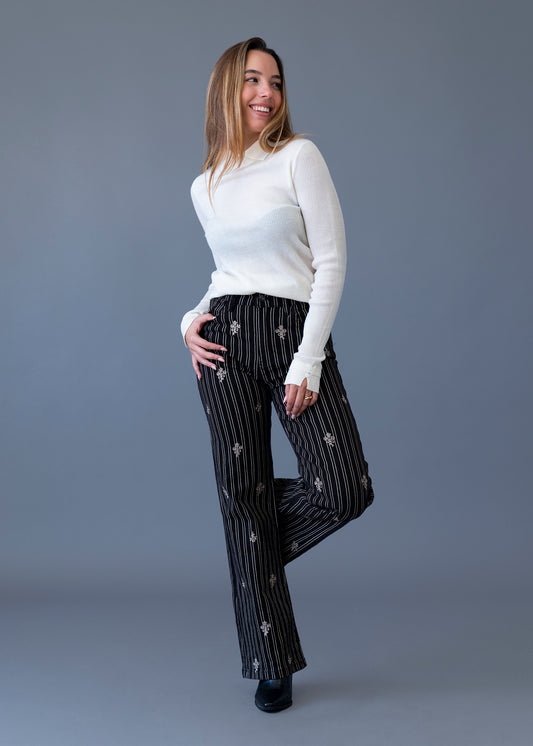 Pantalones de talle alto y cintura con detalle elástico en trasero, trabillas y cinturón con hebilla metálica. Bolsillos frontales. Detalle de tablas en cintura. Pierna extra ancha y corte fluido.