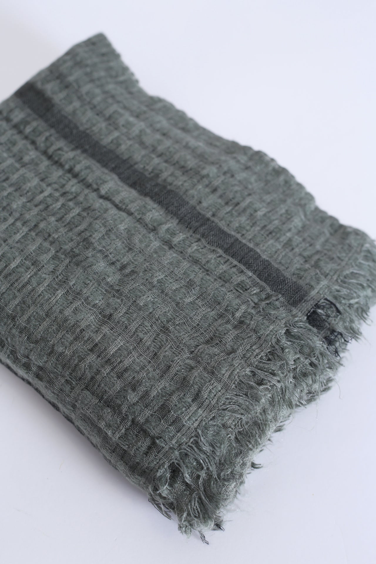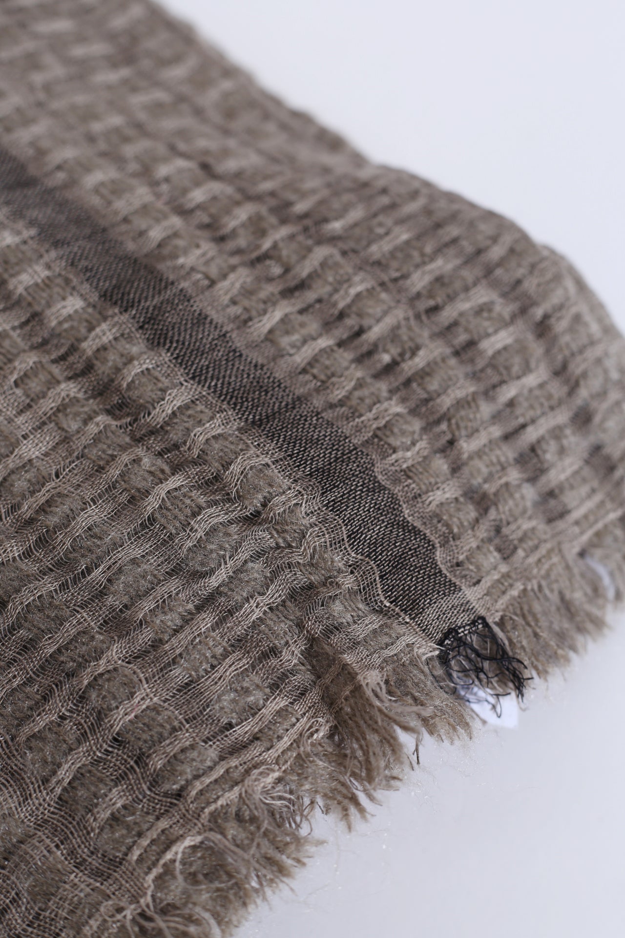 Pañuelo texturado con detalle de rayas a contraste. Acabados desflecados.