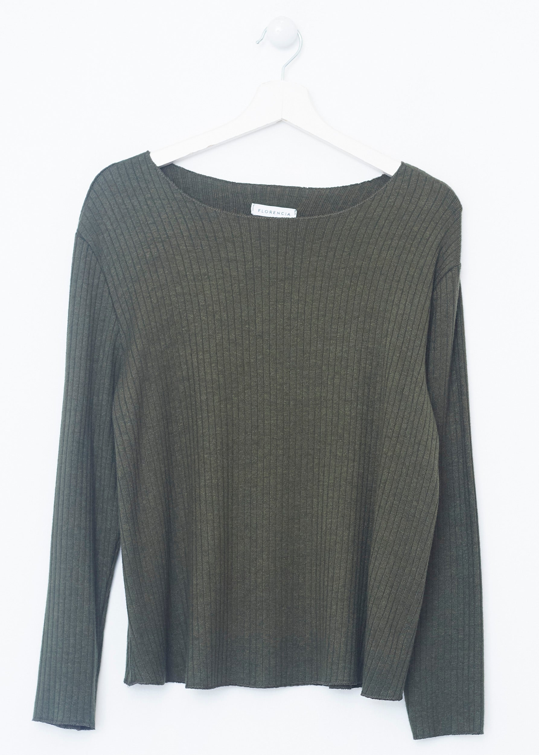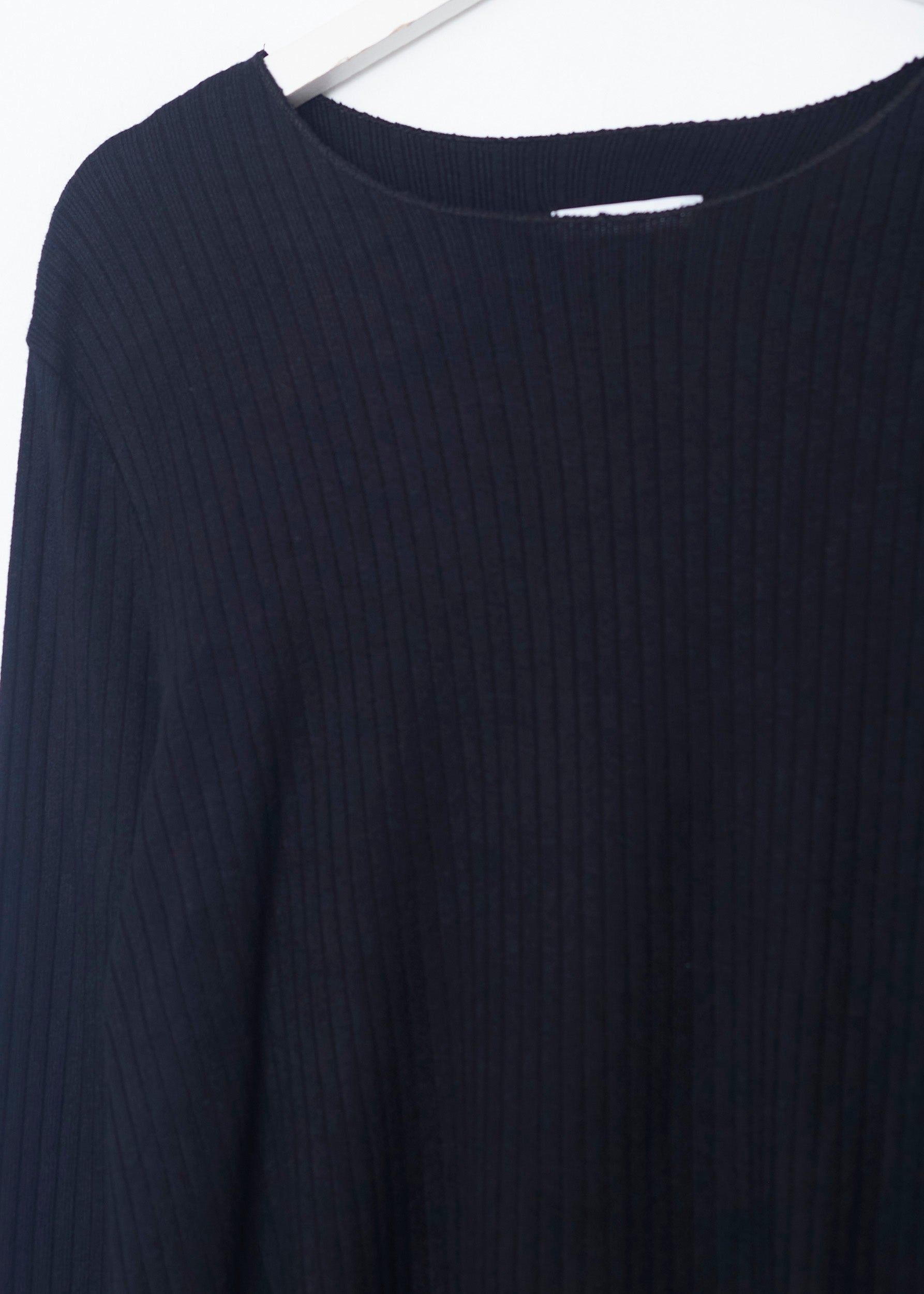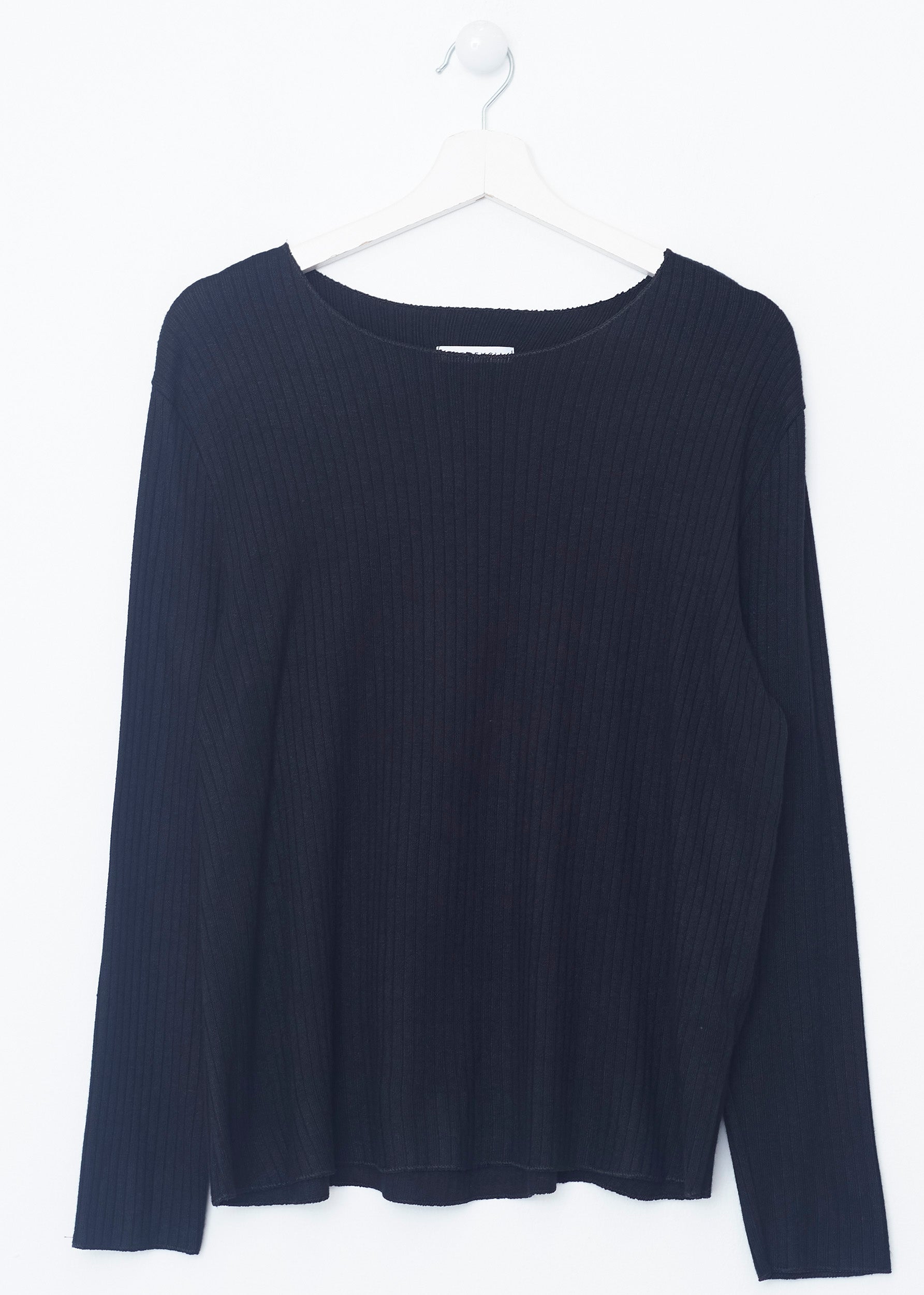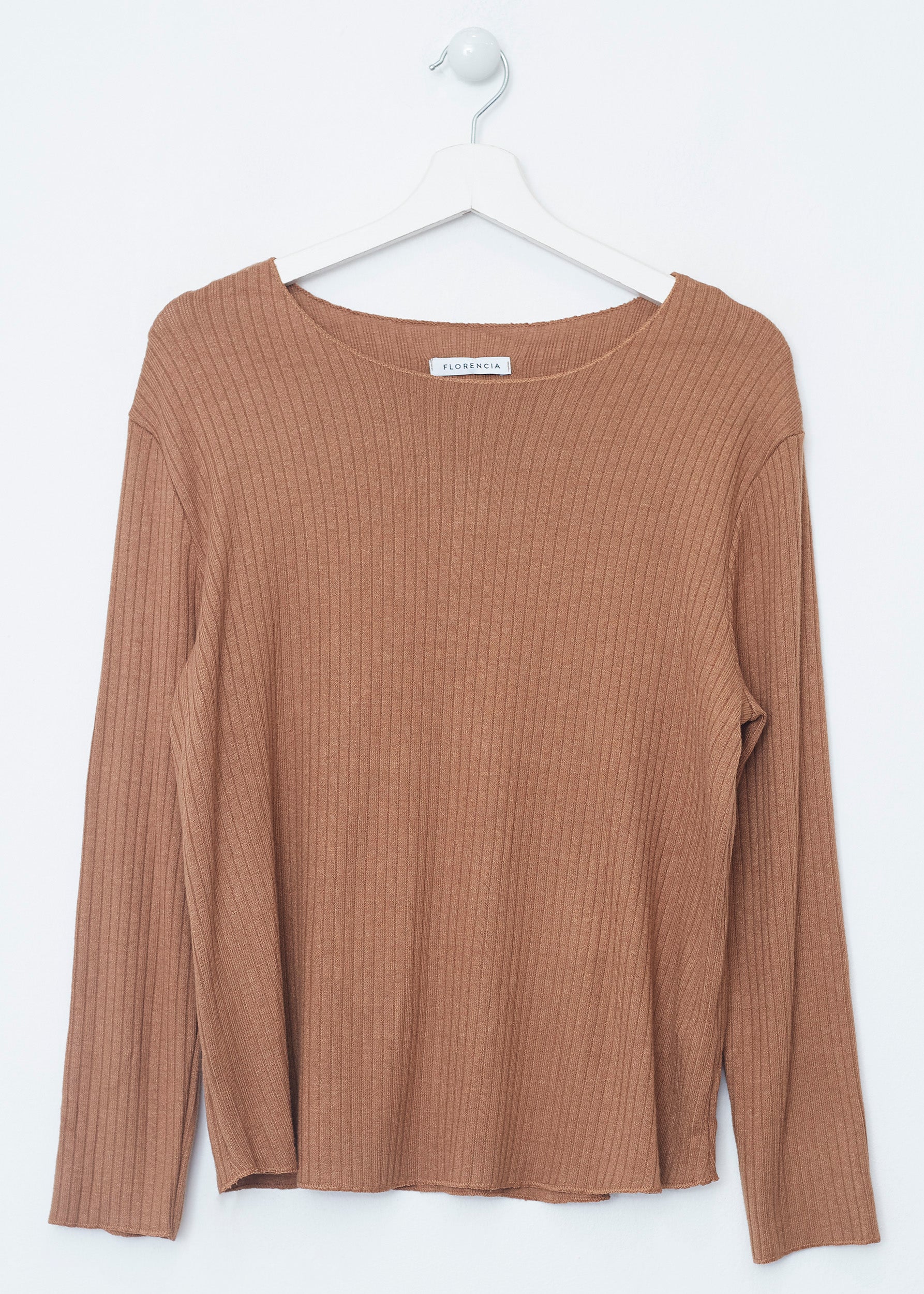 Ribbed round neck T-shirt with long sleeves. Loose fit.