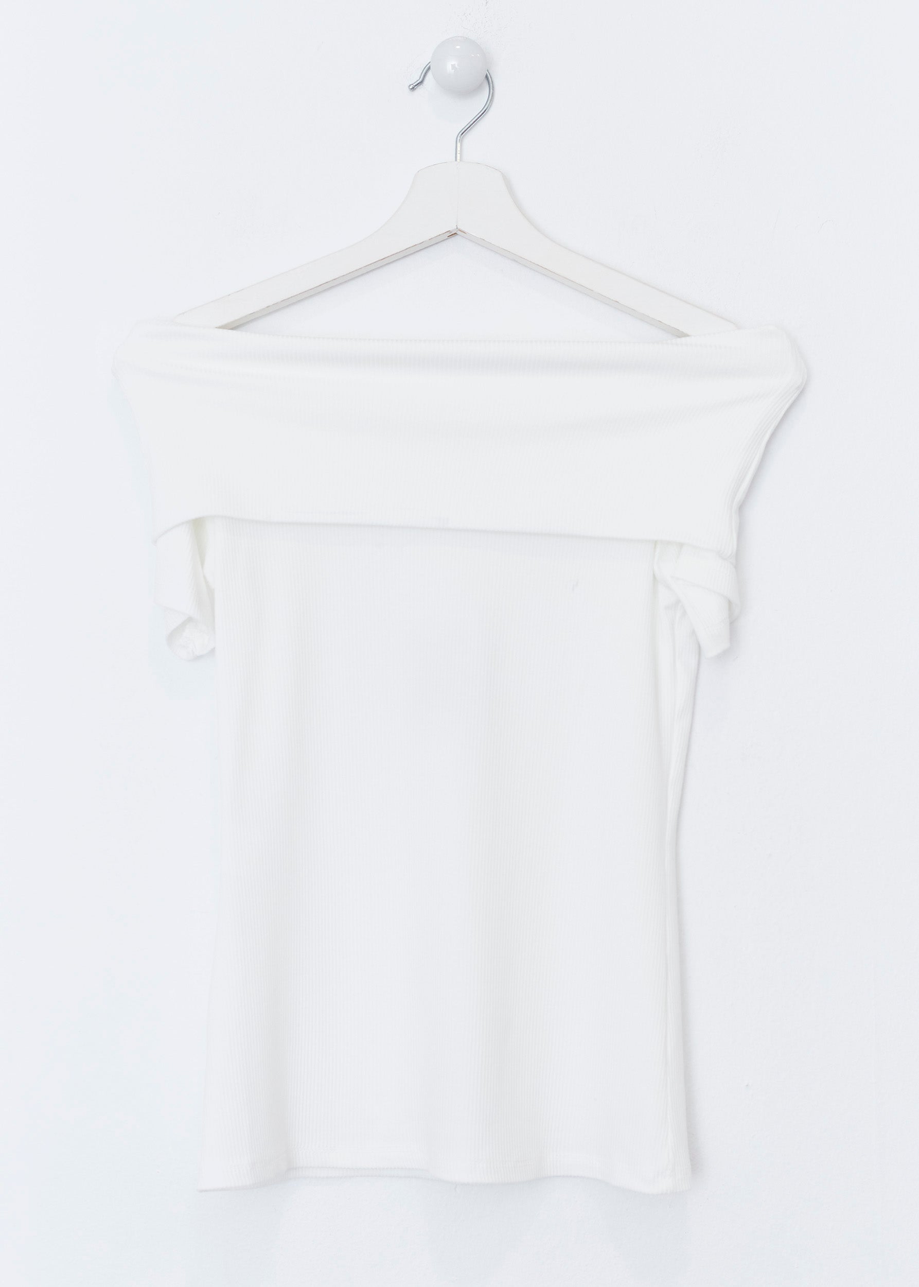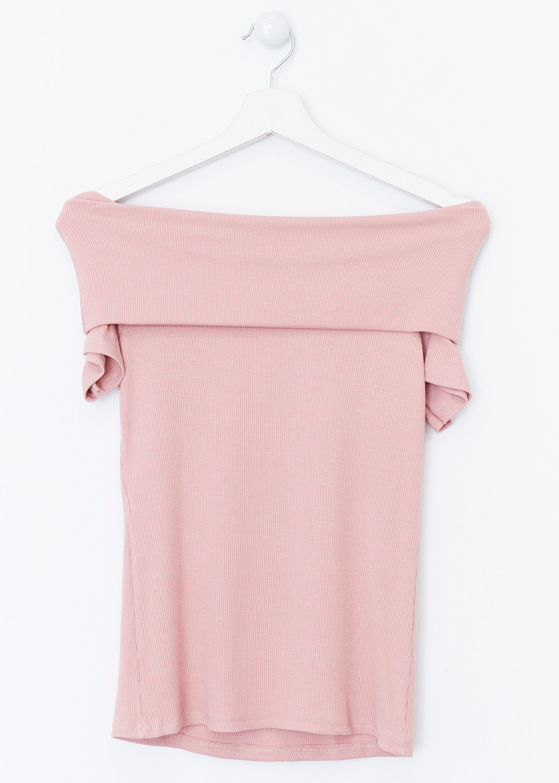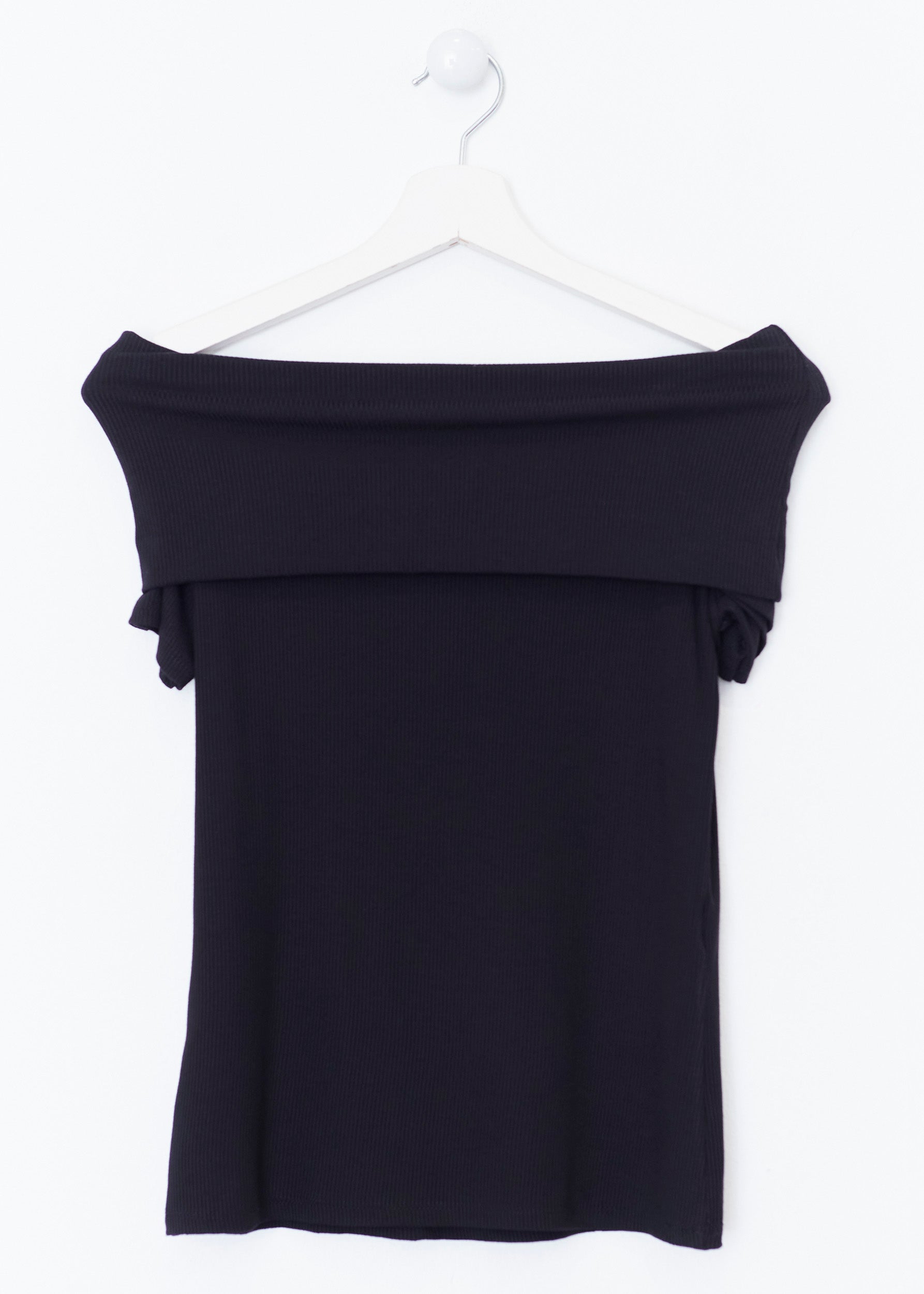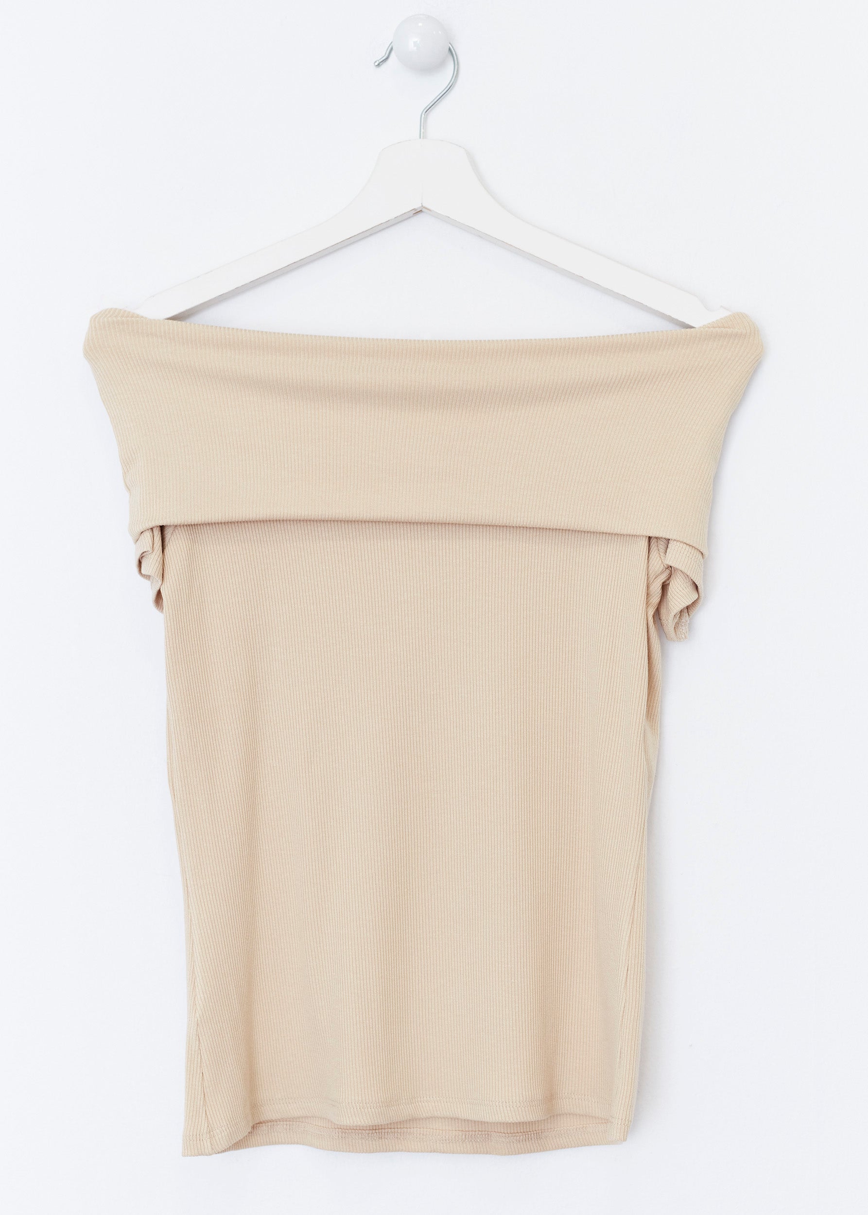 T-shirt with a straight neckline finished in a turn-up and bare shoulders. Ribbed fabric.