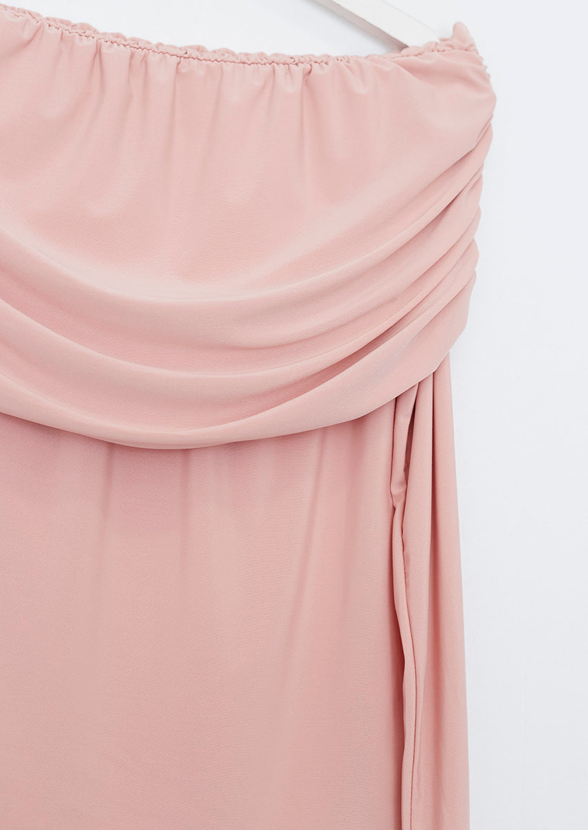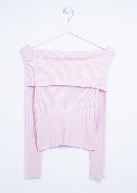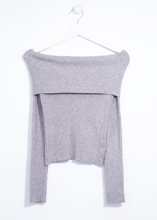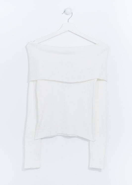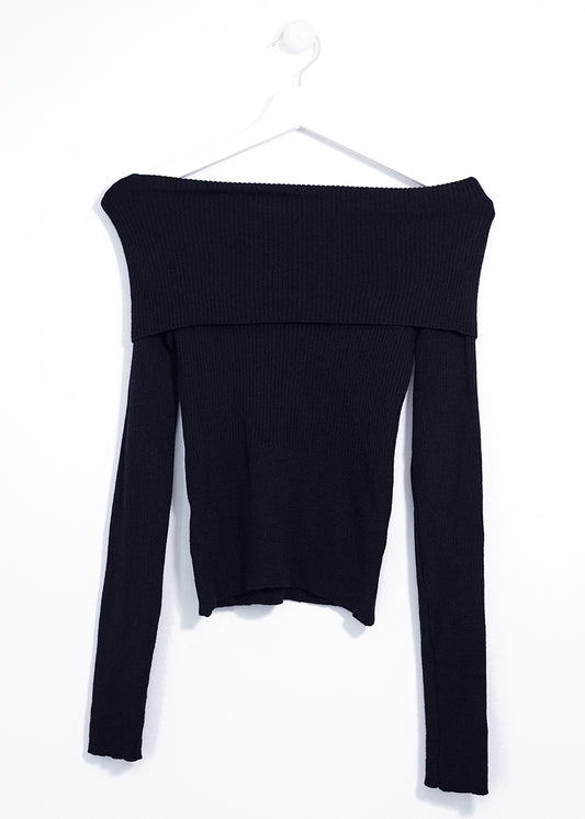 T-shirt with a straight neckline with a turn-up finish, bare shoulders and long sleeves. Draped detail on shoulders.