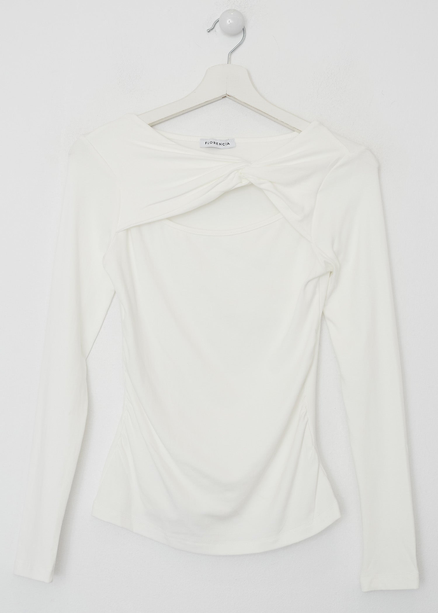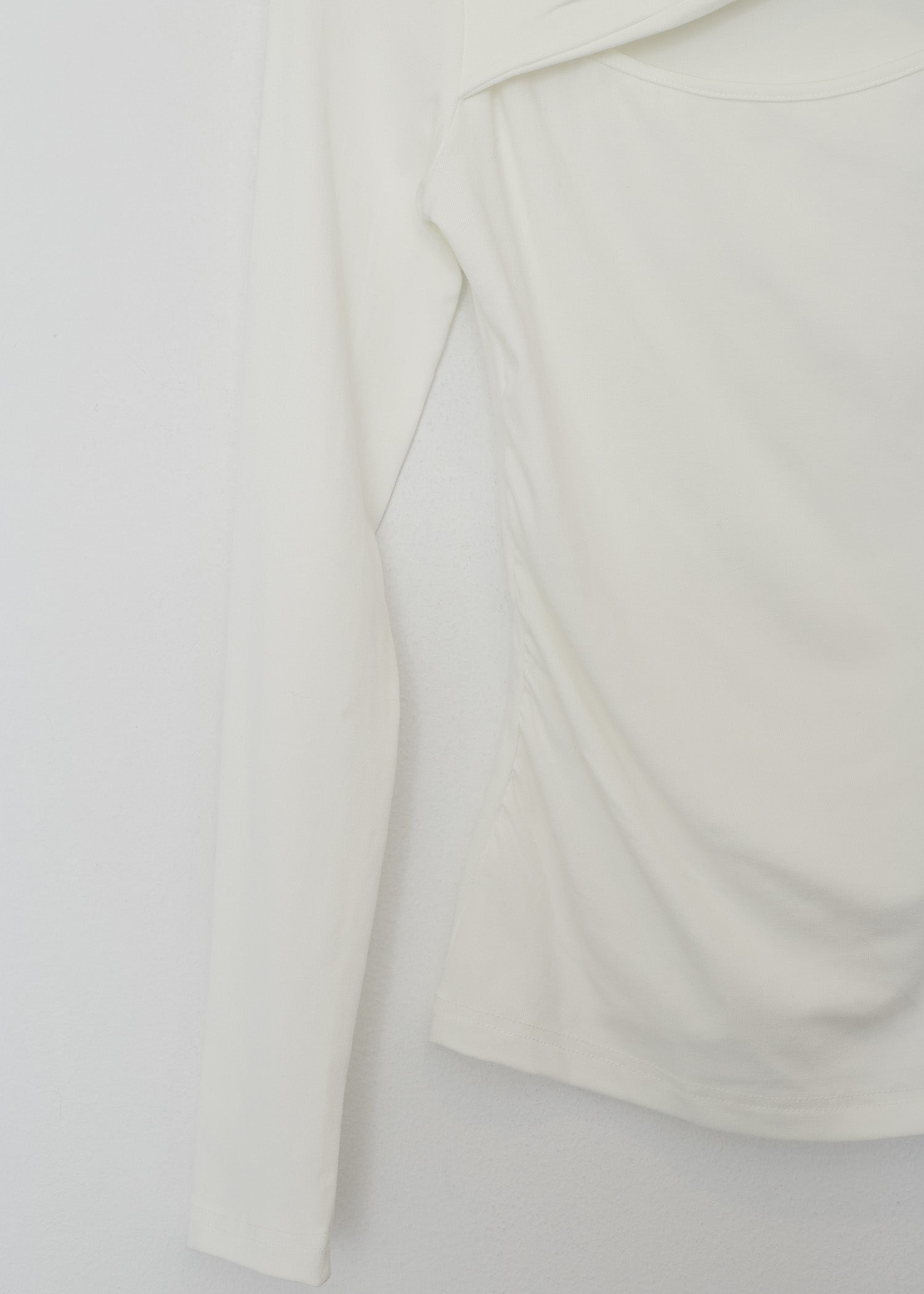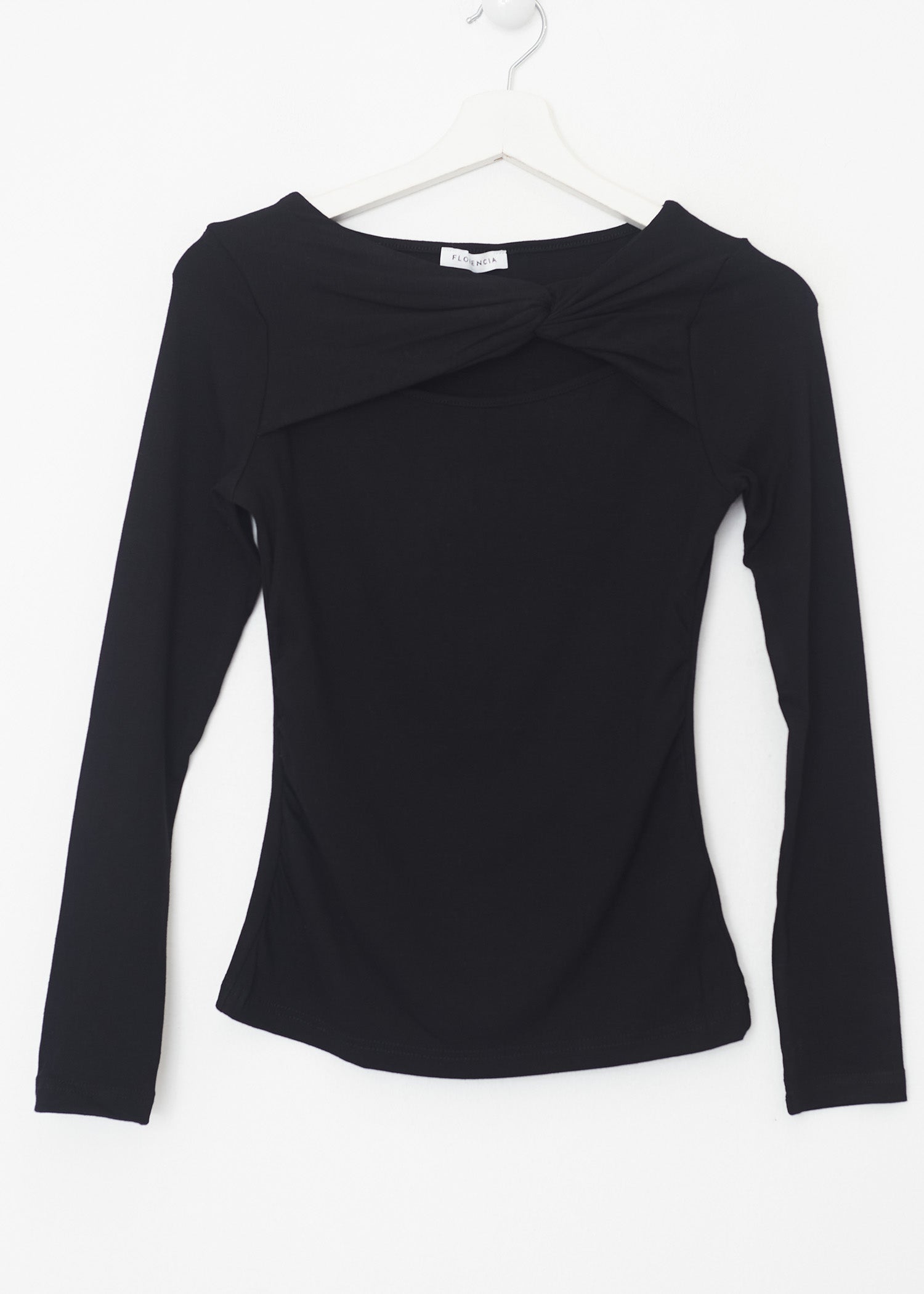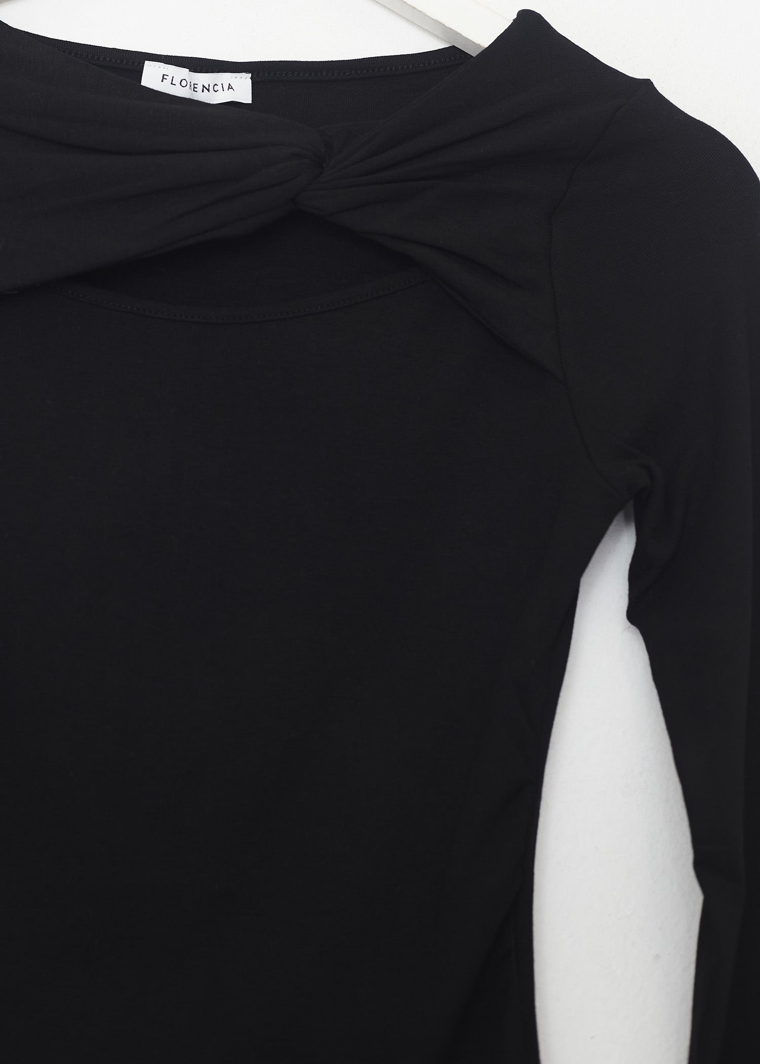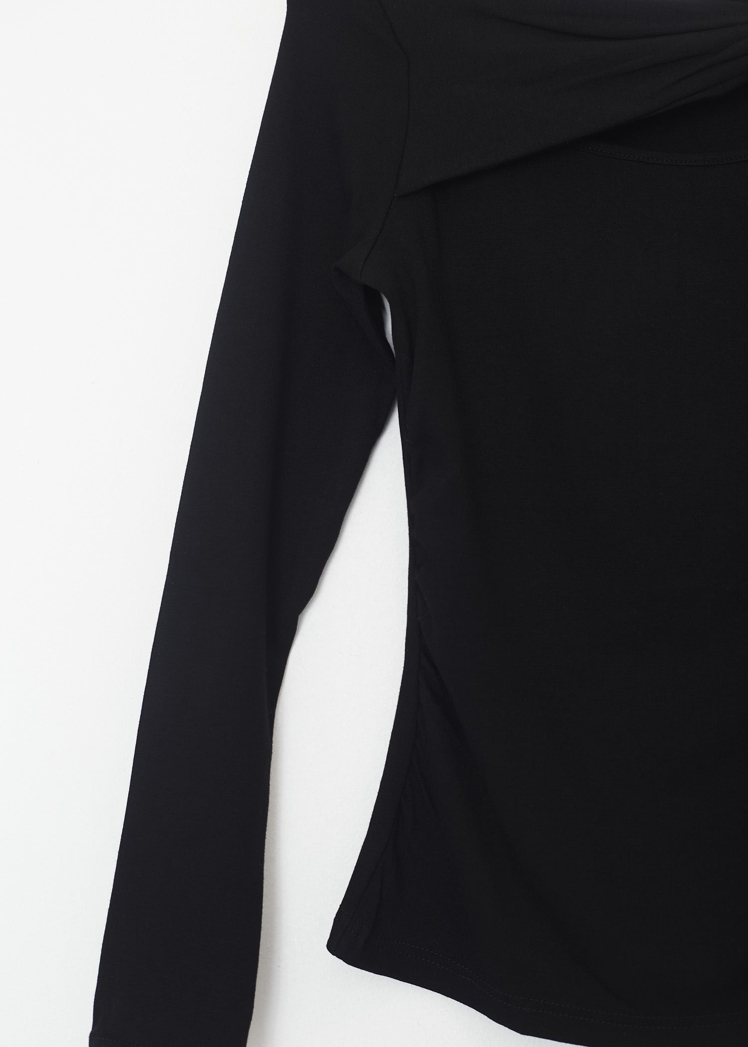 Camiseta de cuello redondo y manga larga. Detalle de abertura y nudo en el pecho. Detalle de fruncidos en laterales. Bajo asimétrico. Corte ajustado.