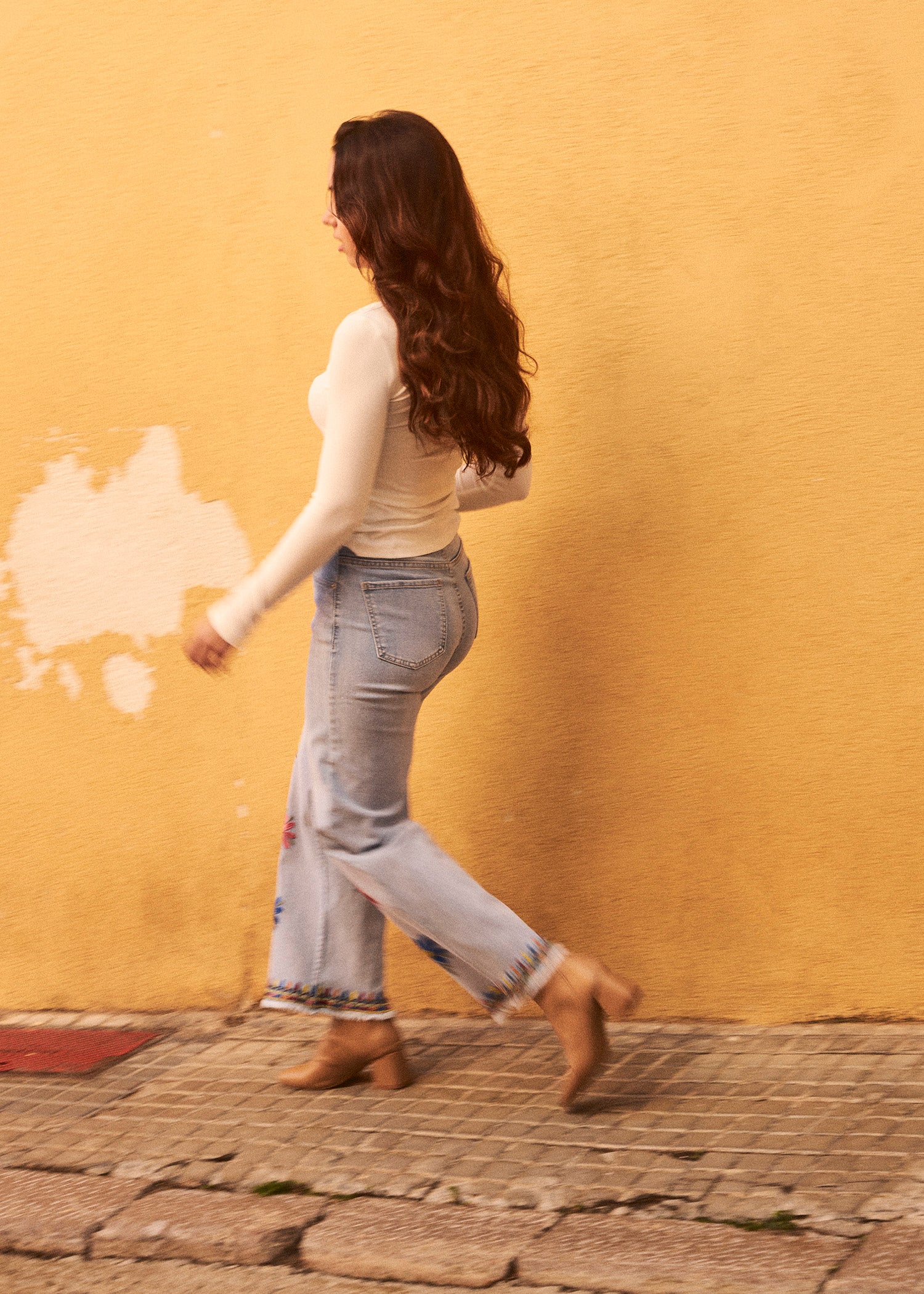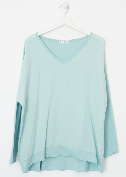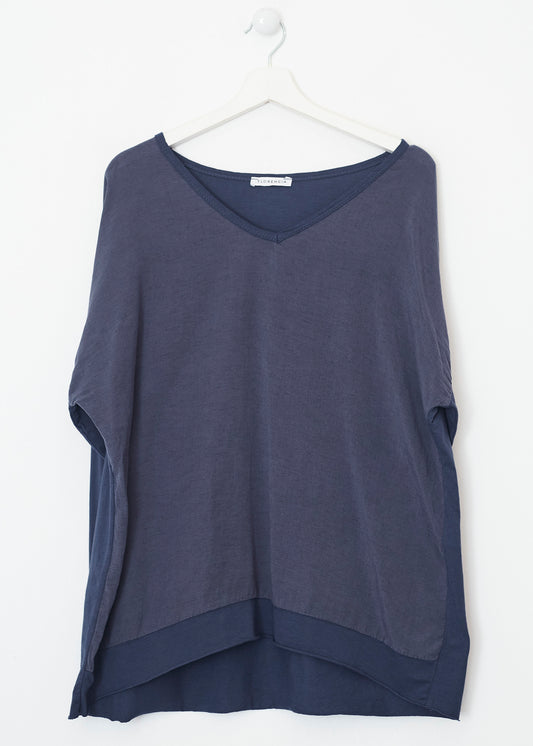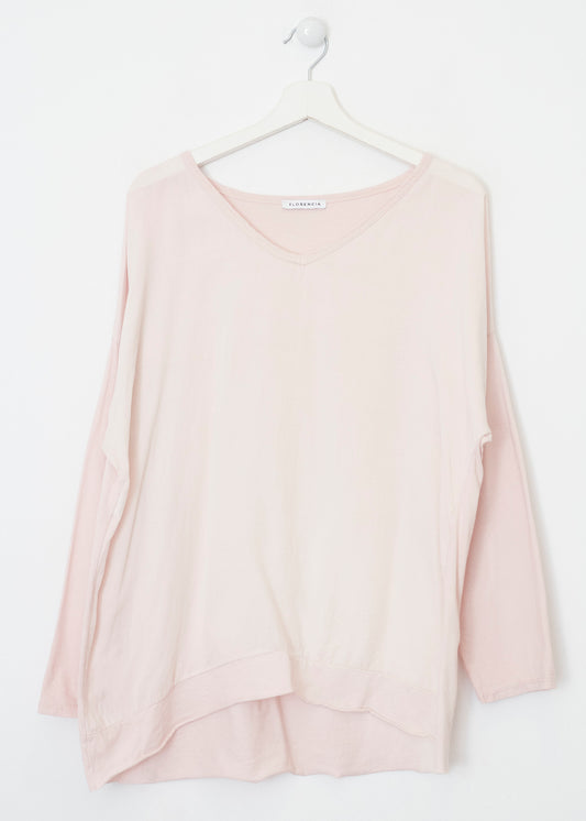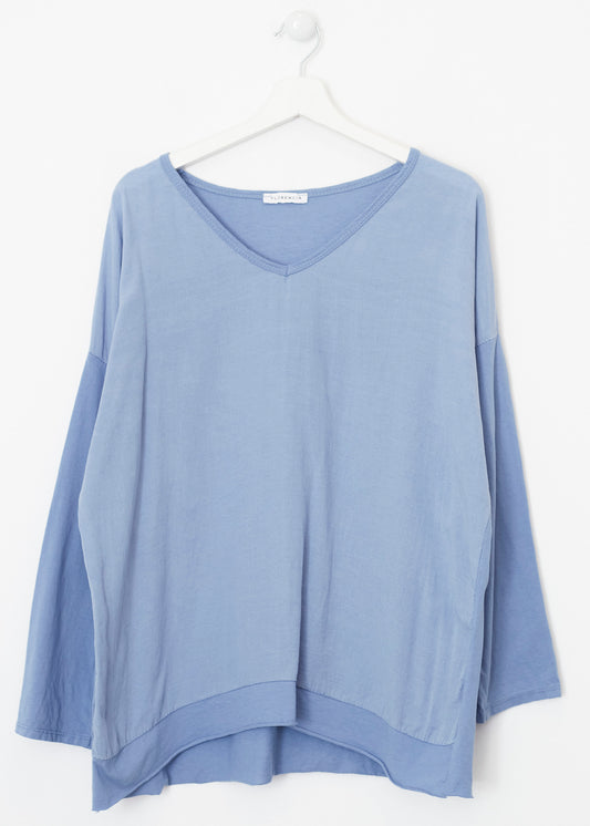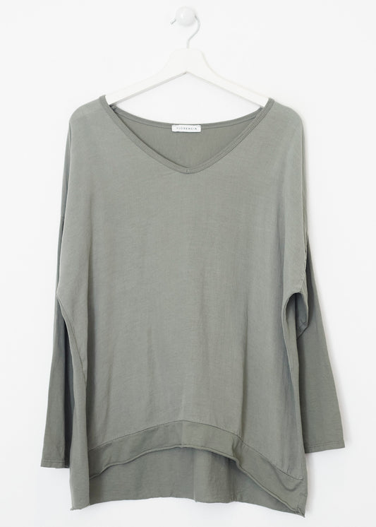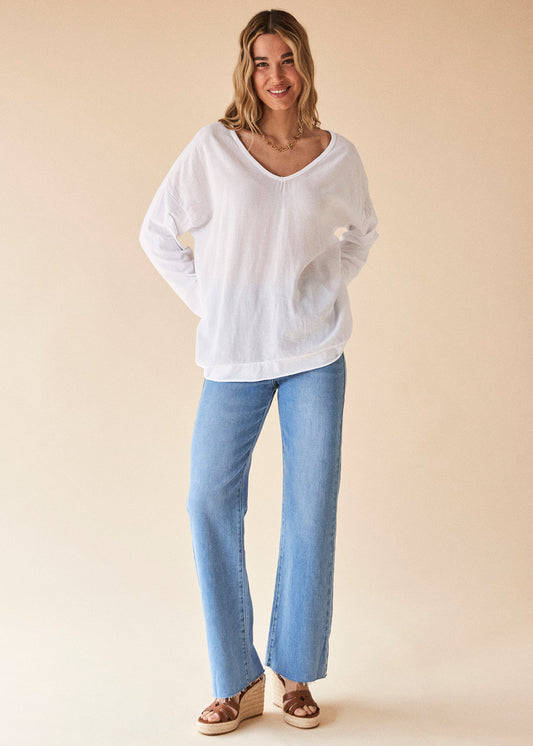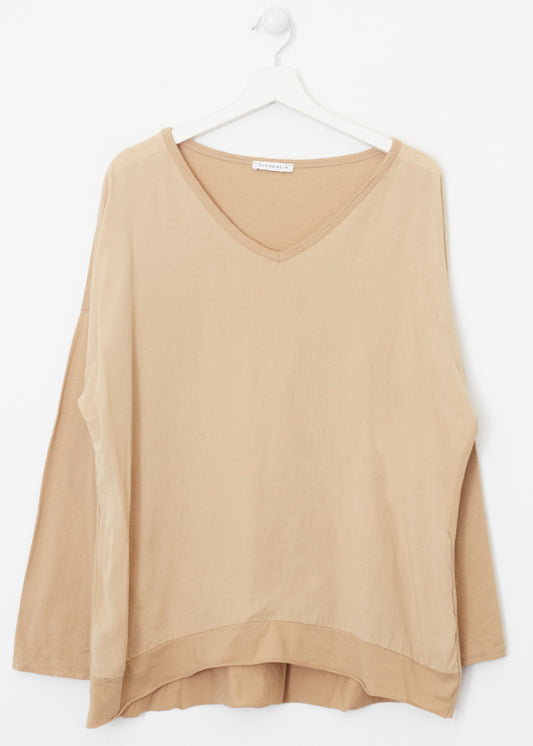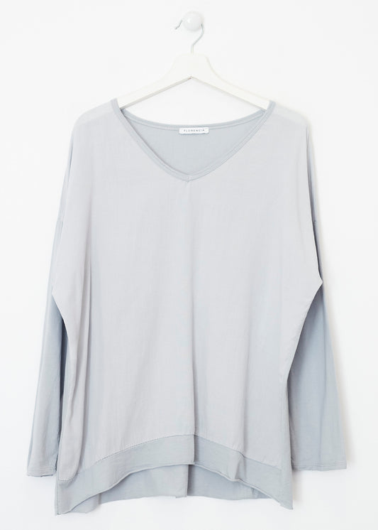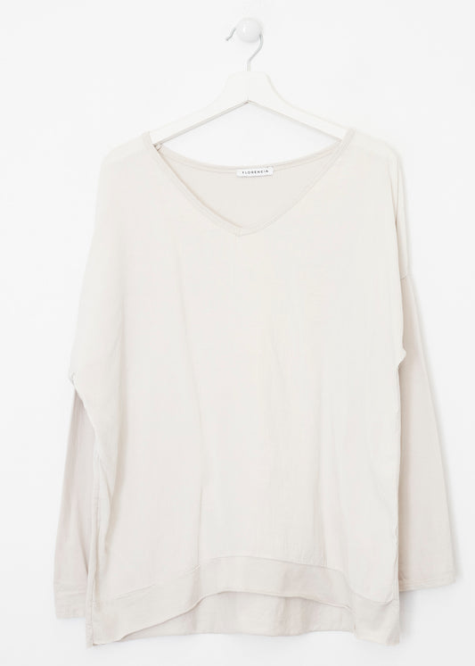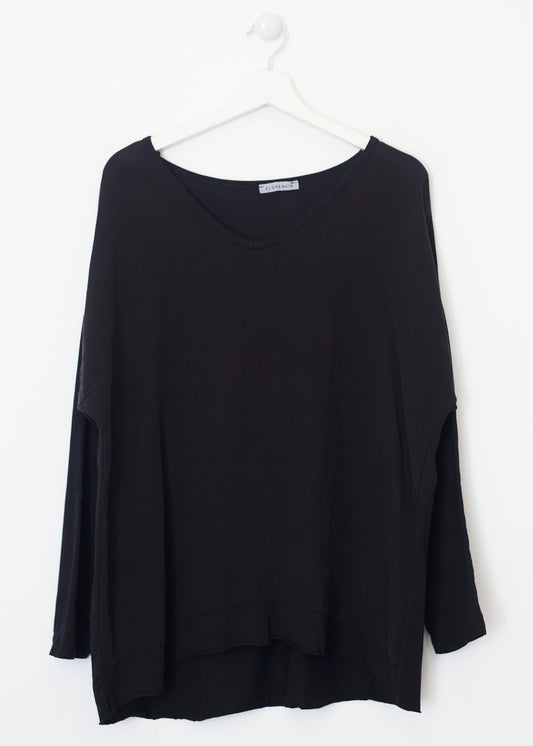 Camiseta de cuello redondo y manga larga. Detalle de abertura y nudo en el pecho. Detalle de fruncidos en laterales. Bajo asimétrico. Corte ajustado.