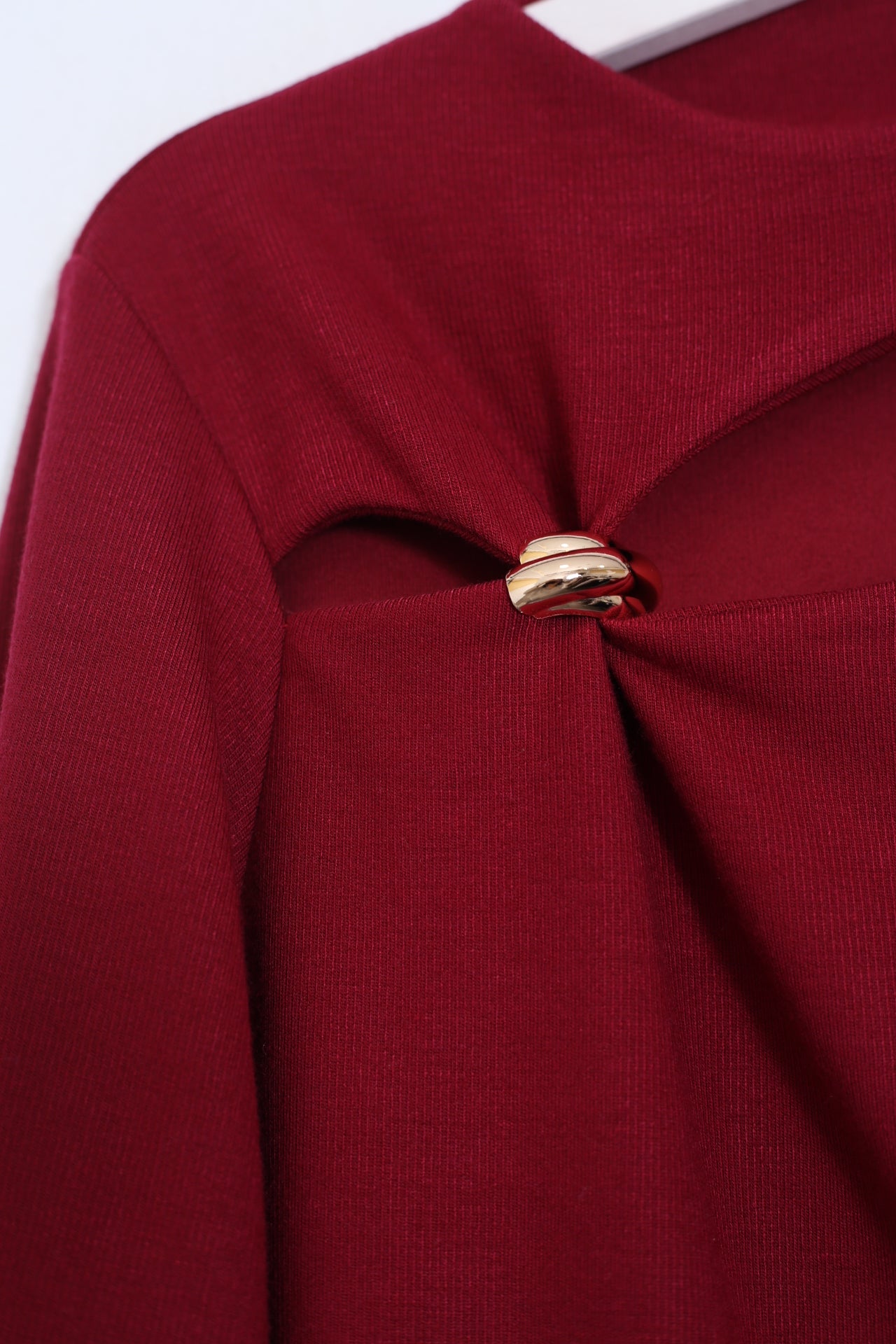 Camiseta de punto con cuello redondo y manga larga. Detalle de abertura en el escote con joya dorada. Tejido elástico. Corte recto.