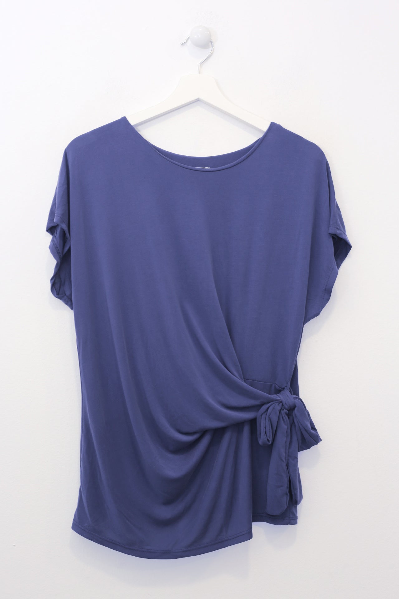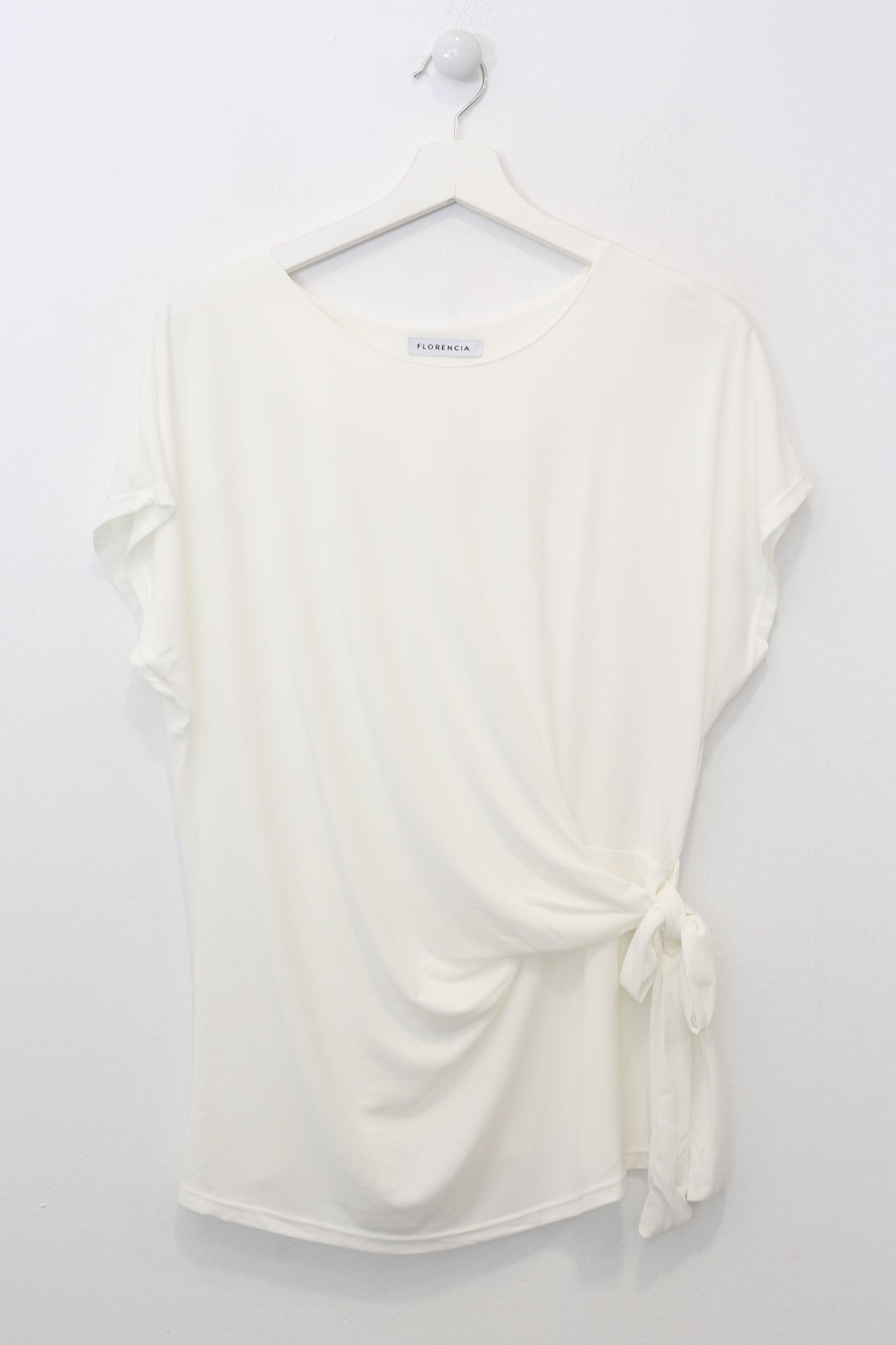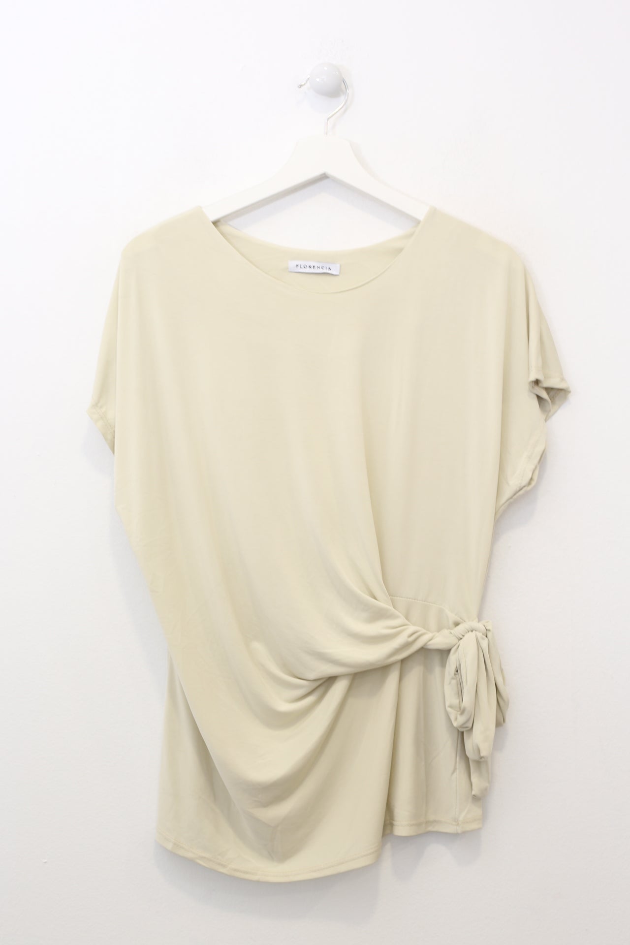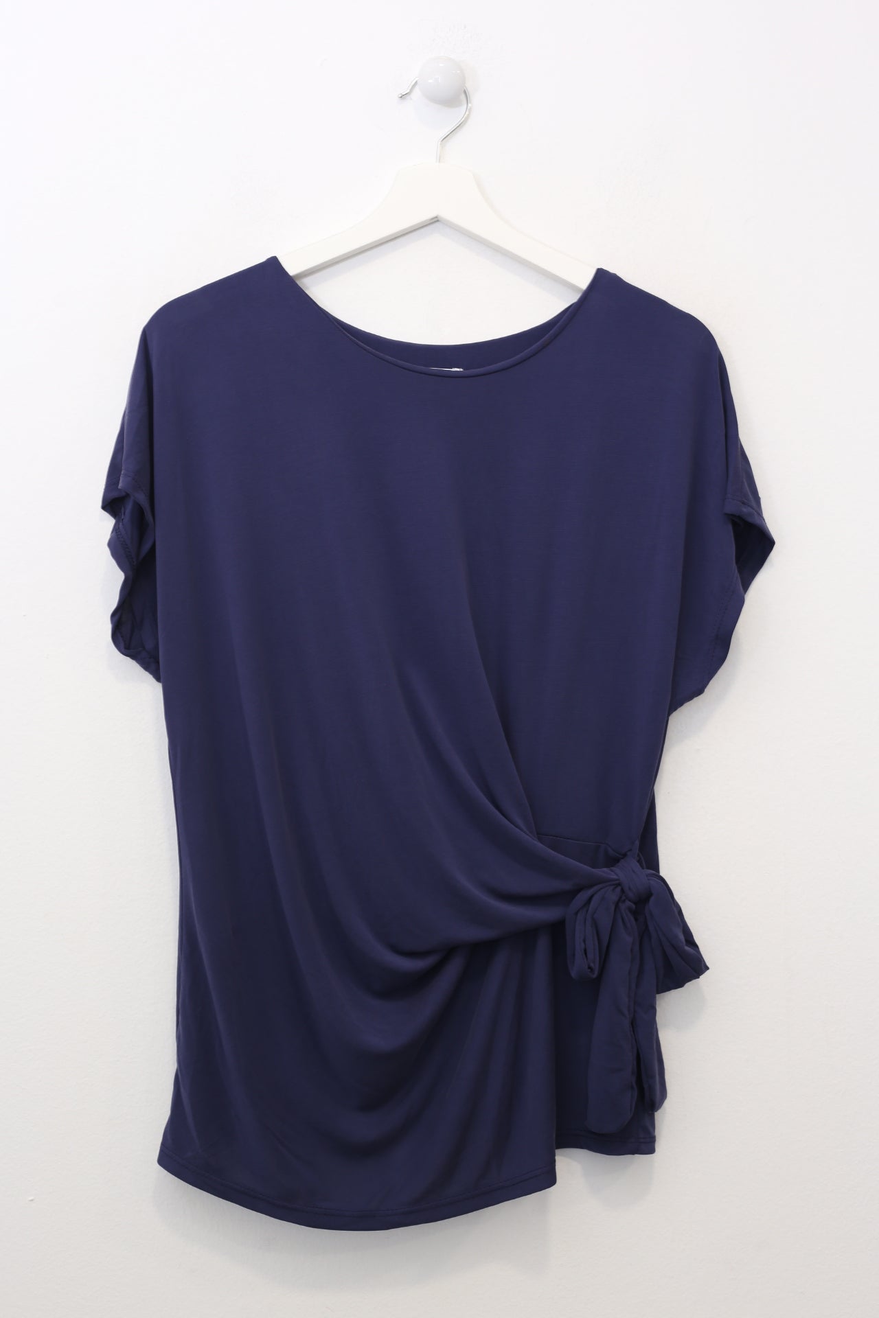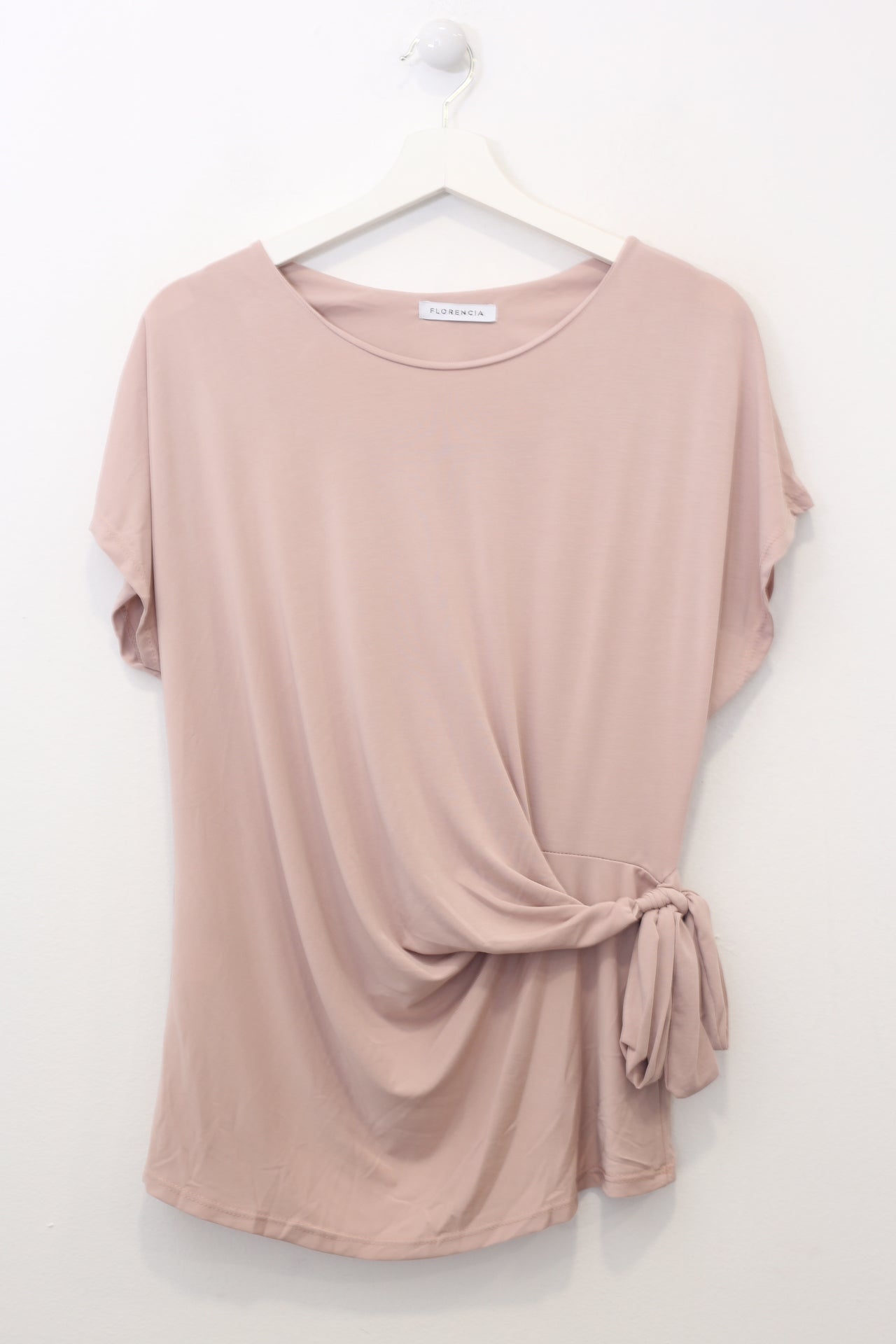 Camiseta con cuello redondo y manga corta. Detalle de nudo en el lateral. Corte amplio y tejido elástico.