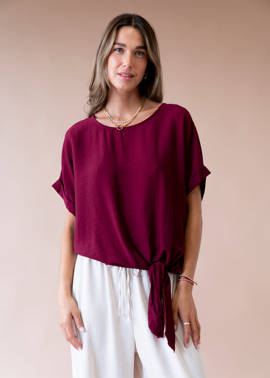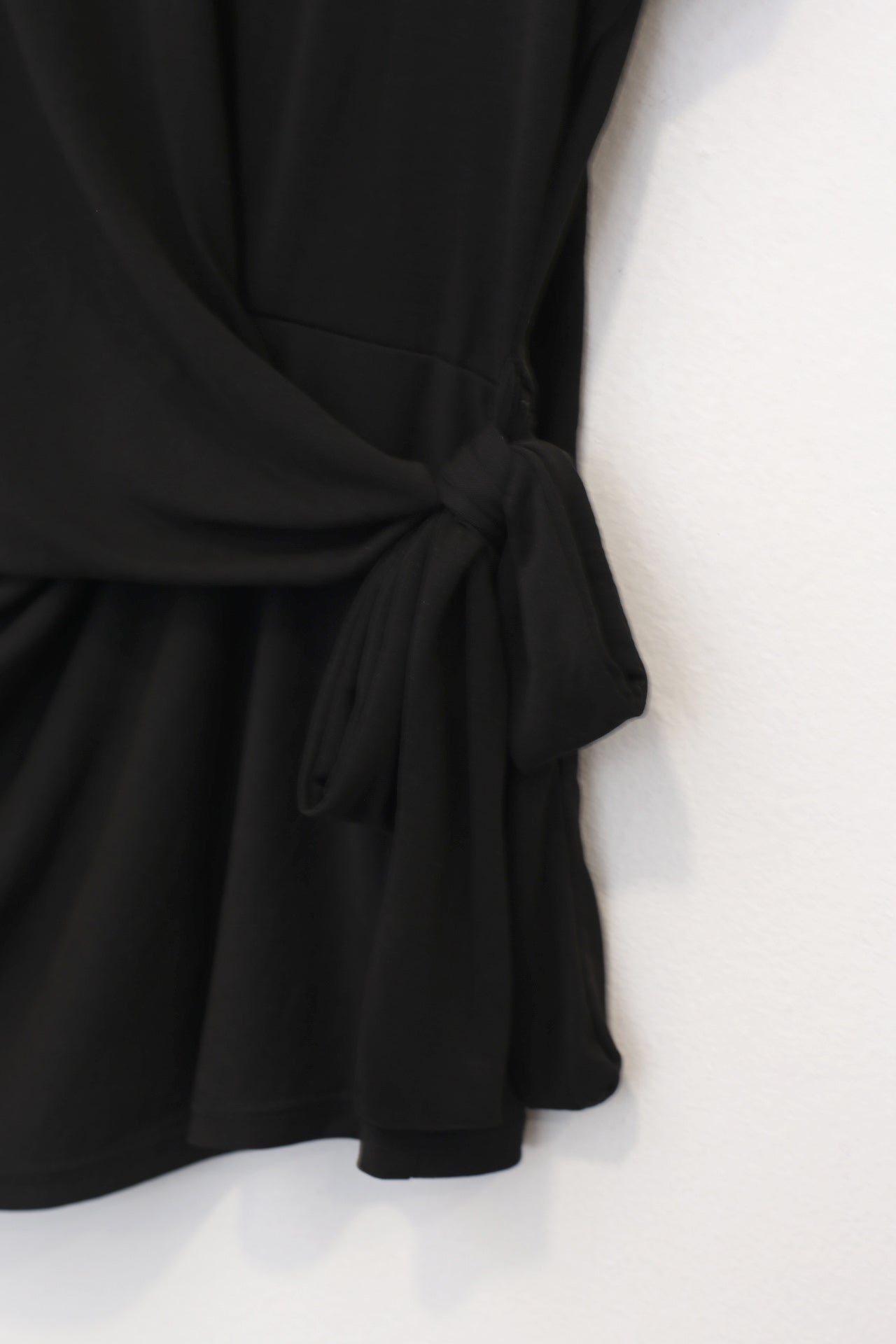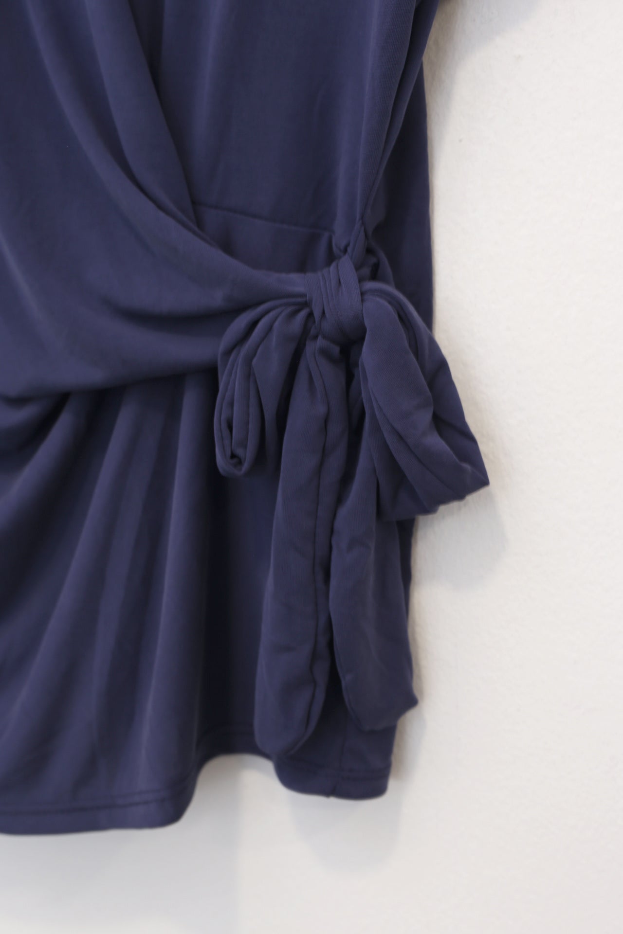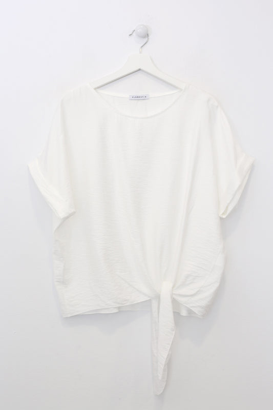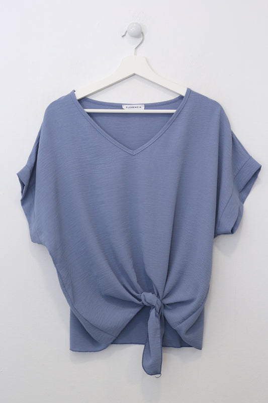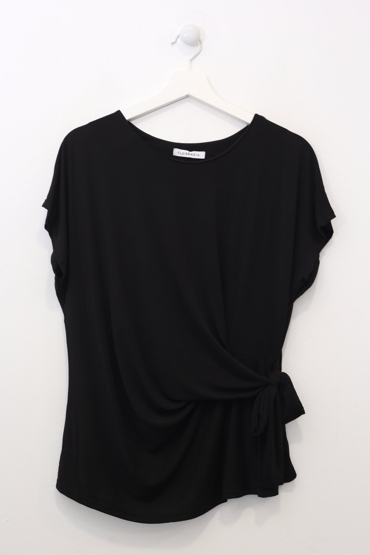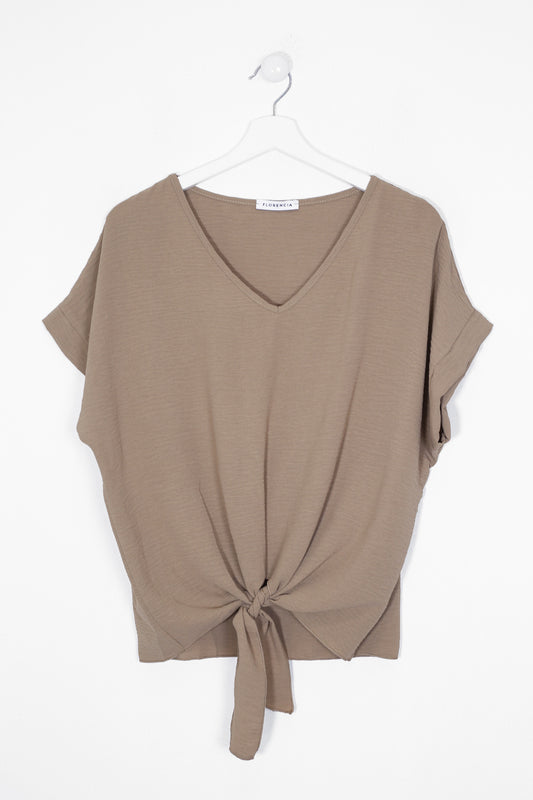 Camiseta con cuello redondo y manga corta. Detalle de nudo en el lateral. Corte amplio y tejido elástico.