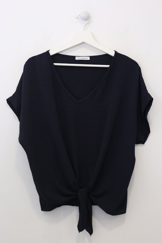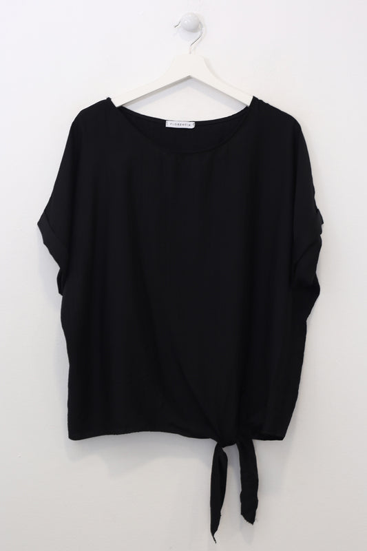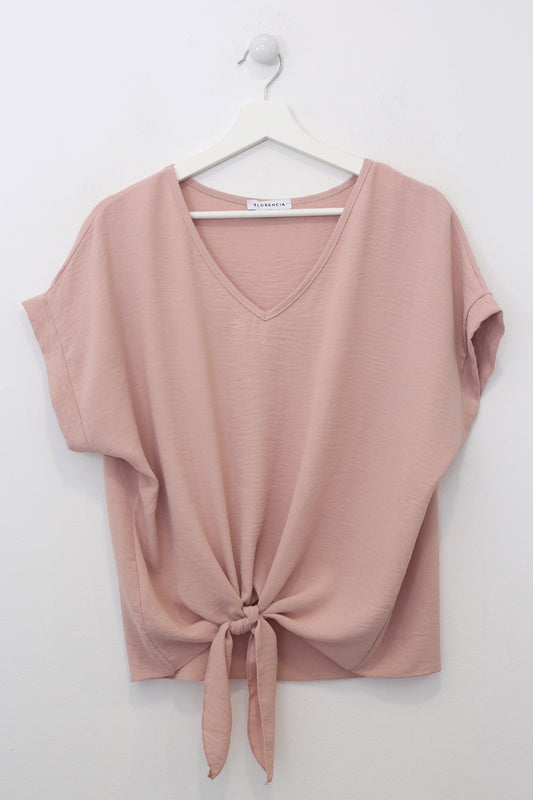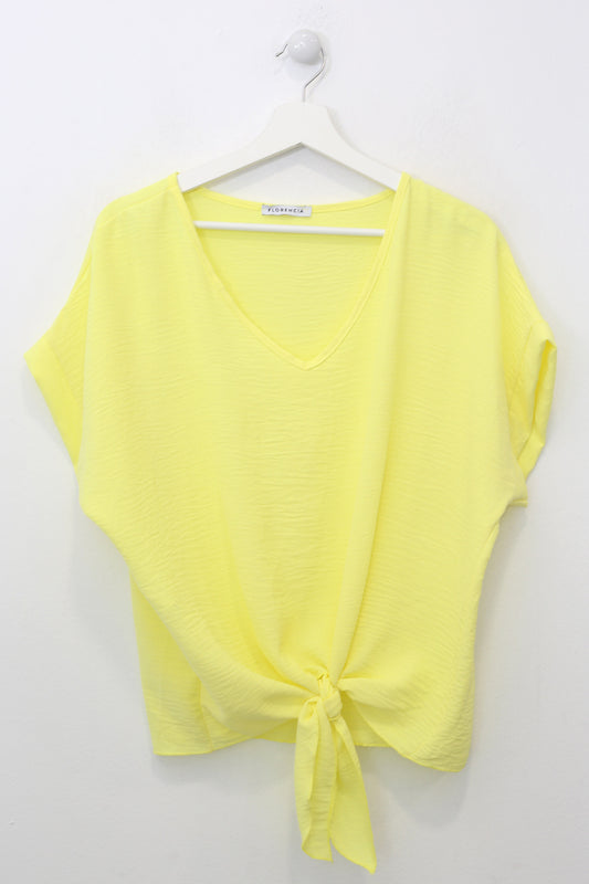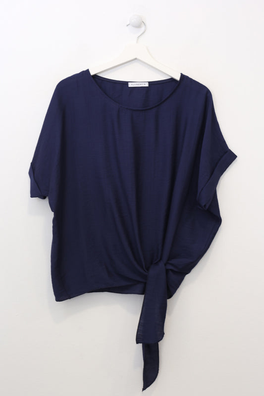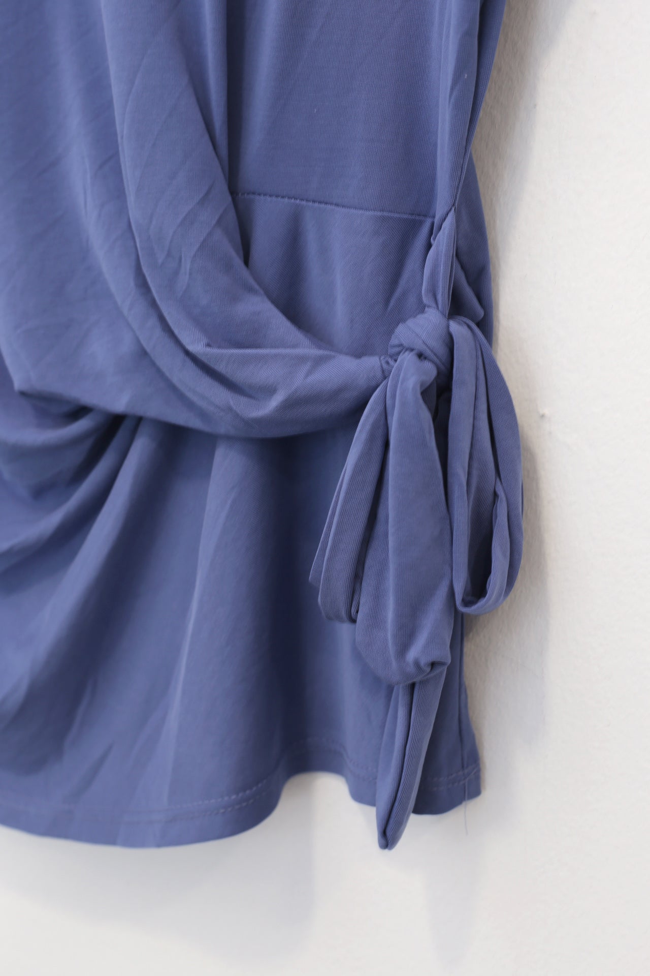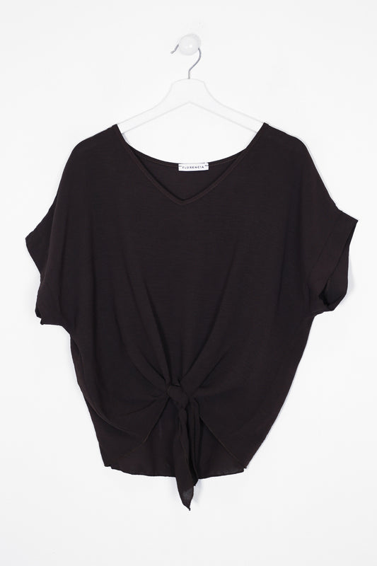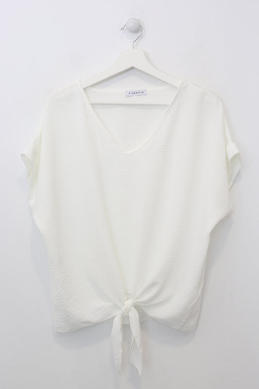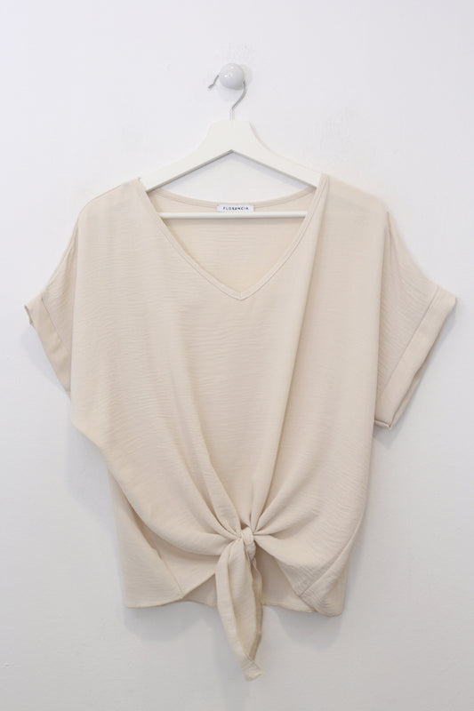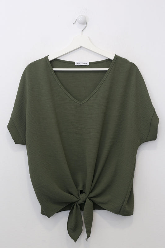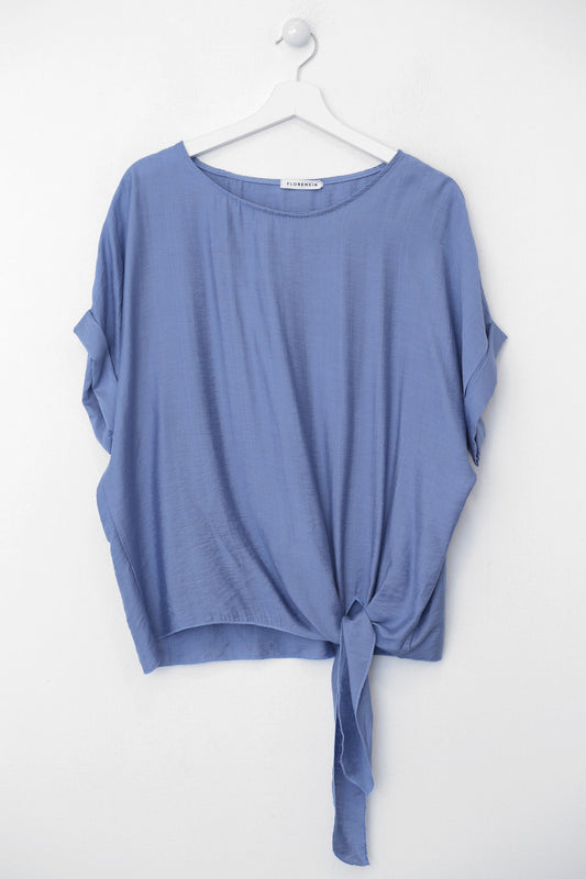 Camiseta con cuello redondo y manga corta. Detalle de nudo en el lateral. Corte amplio y tejido elástico.