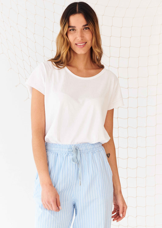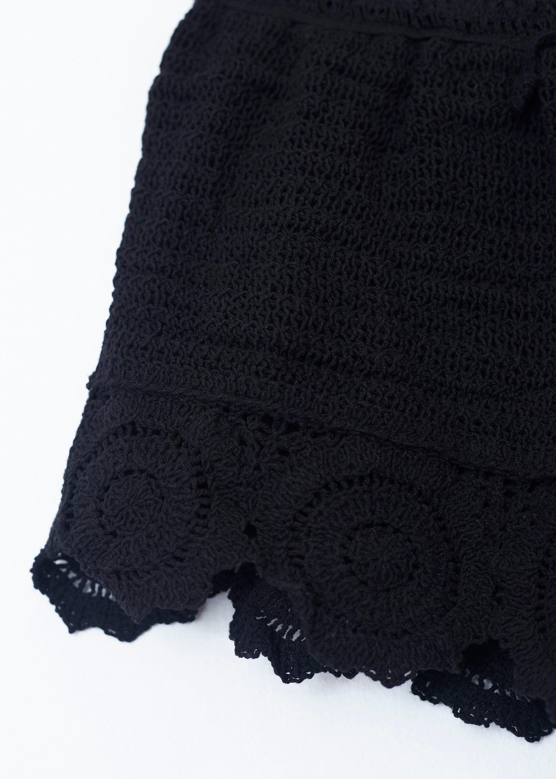 High-waisted shorts. Elastic waist with adjustable drawstring detail. Inner lining. Made in crochet stitch.