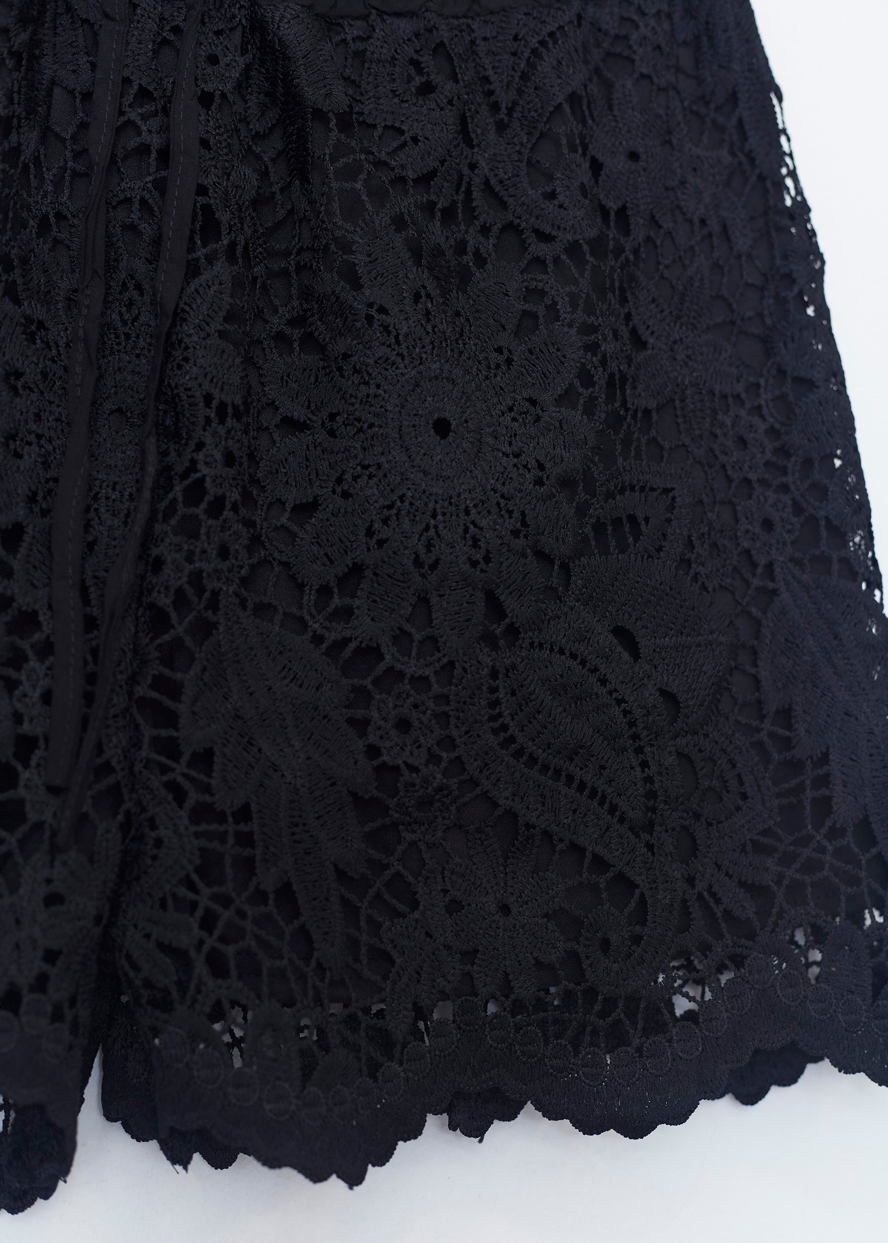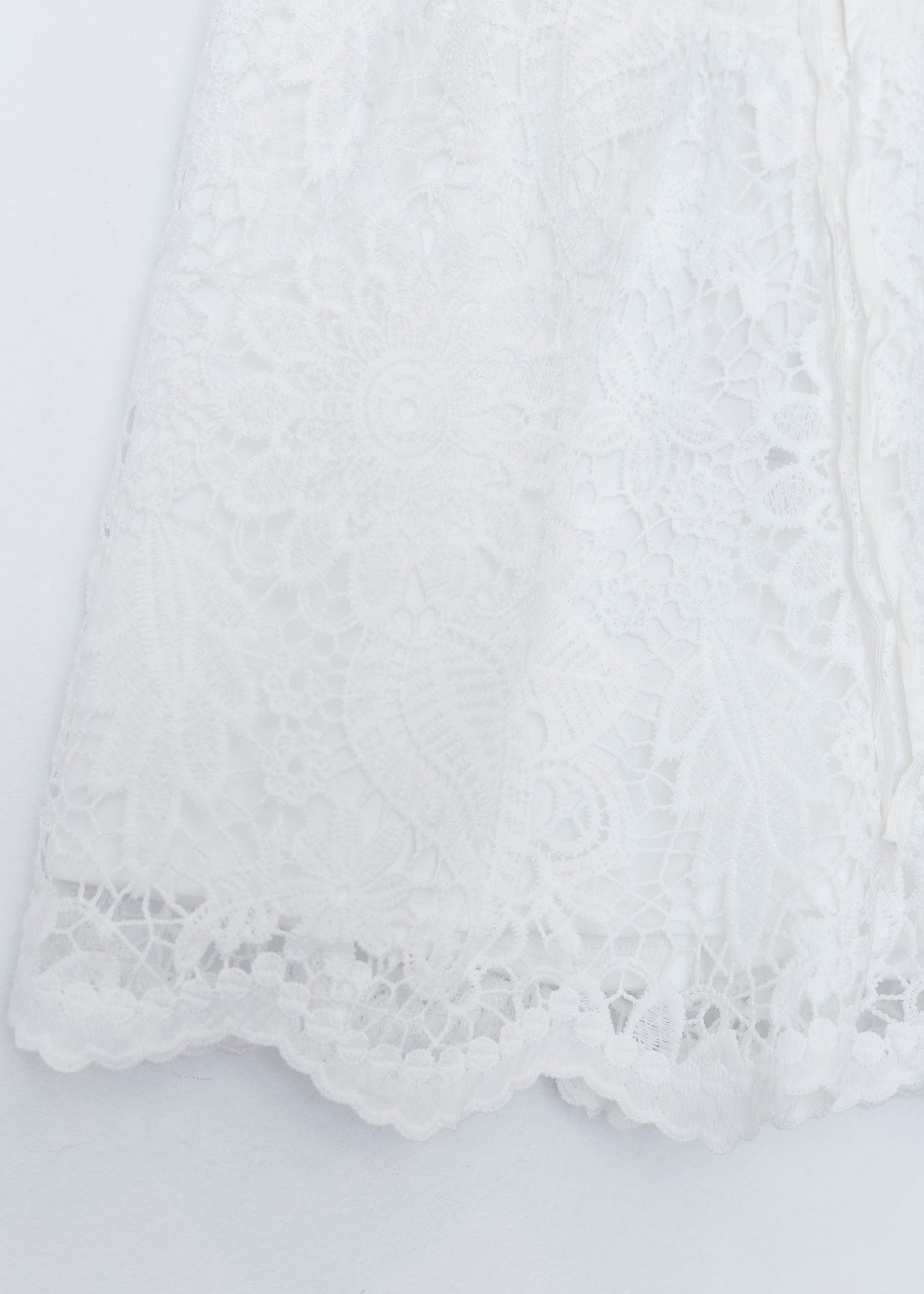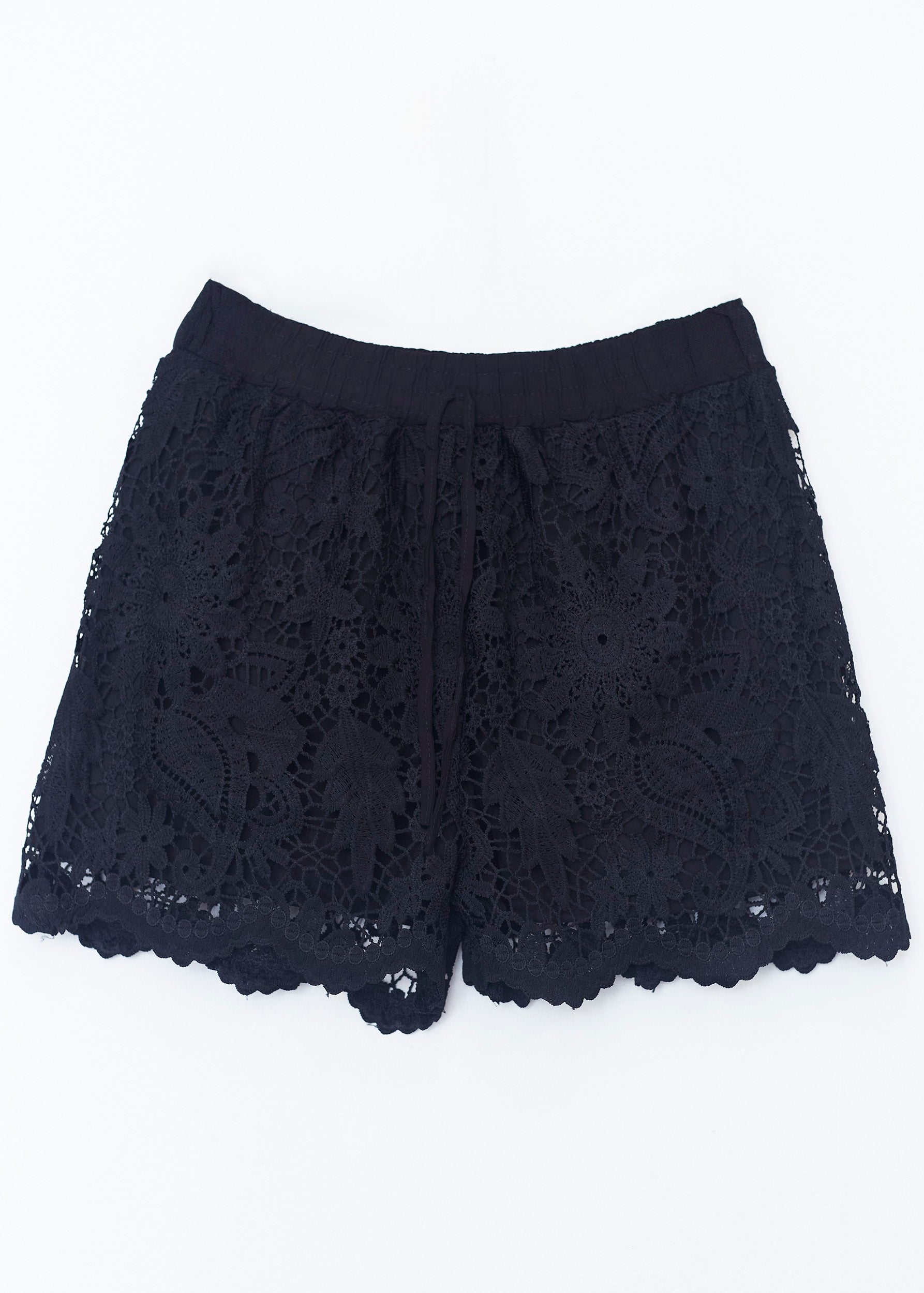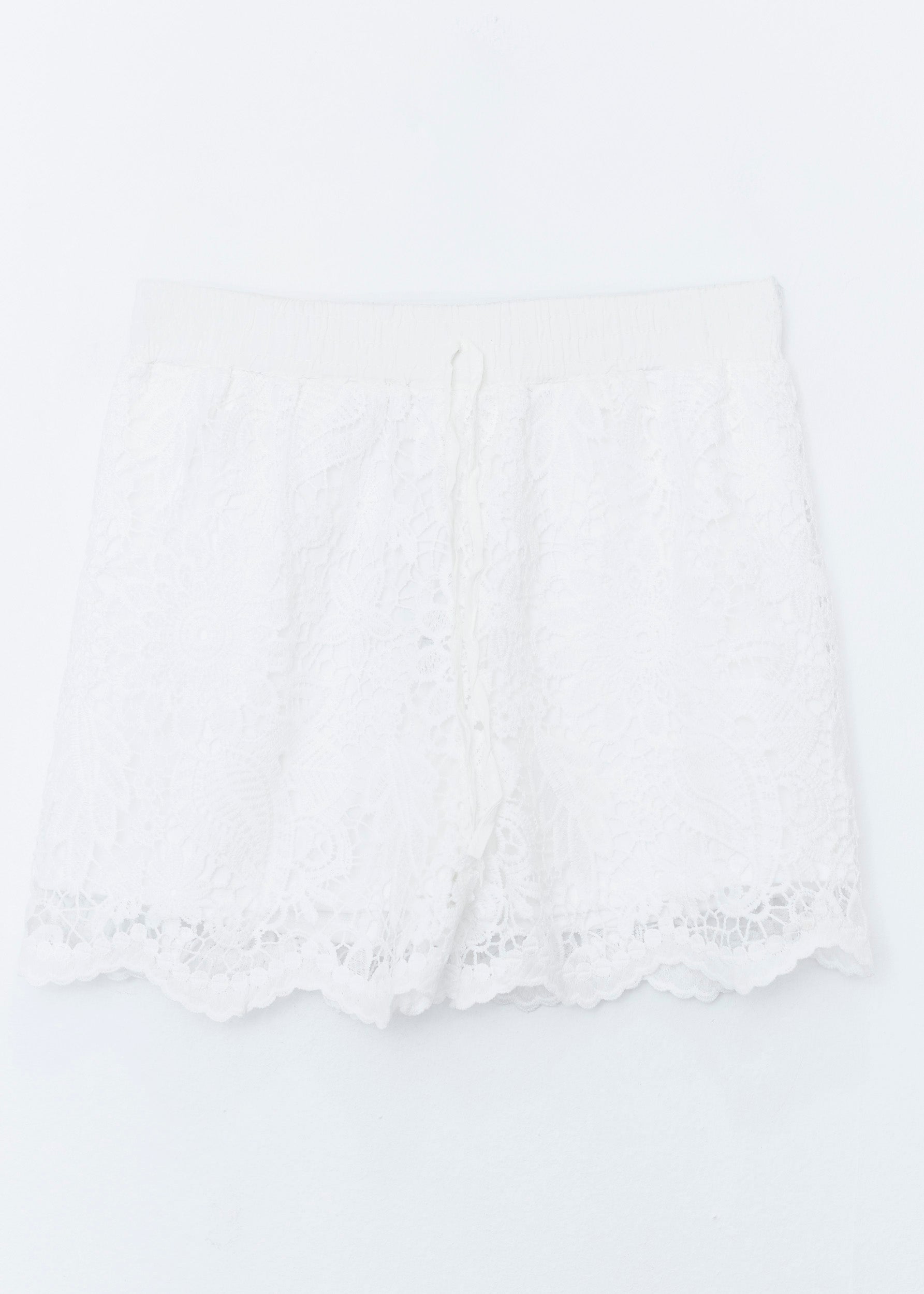 High-waisted shorts. Elastic waist with decorative drawstring detail. Inner lining. Made of guipure with floral motifs.