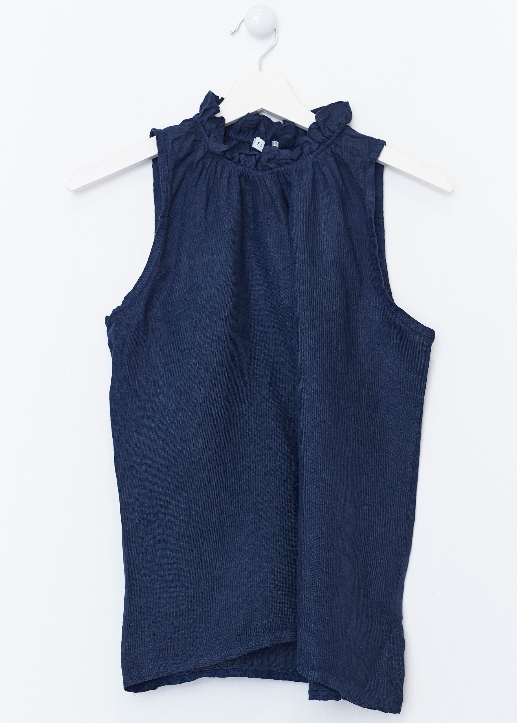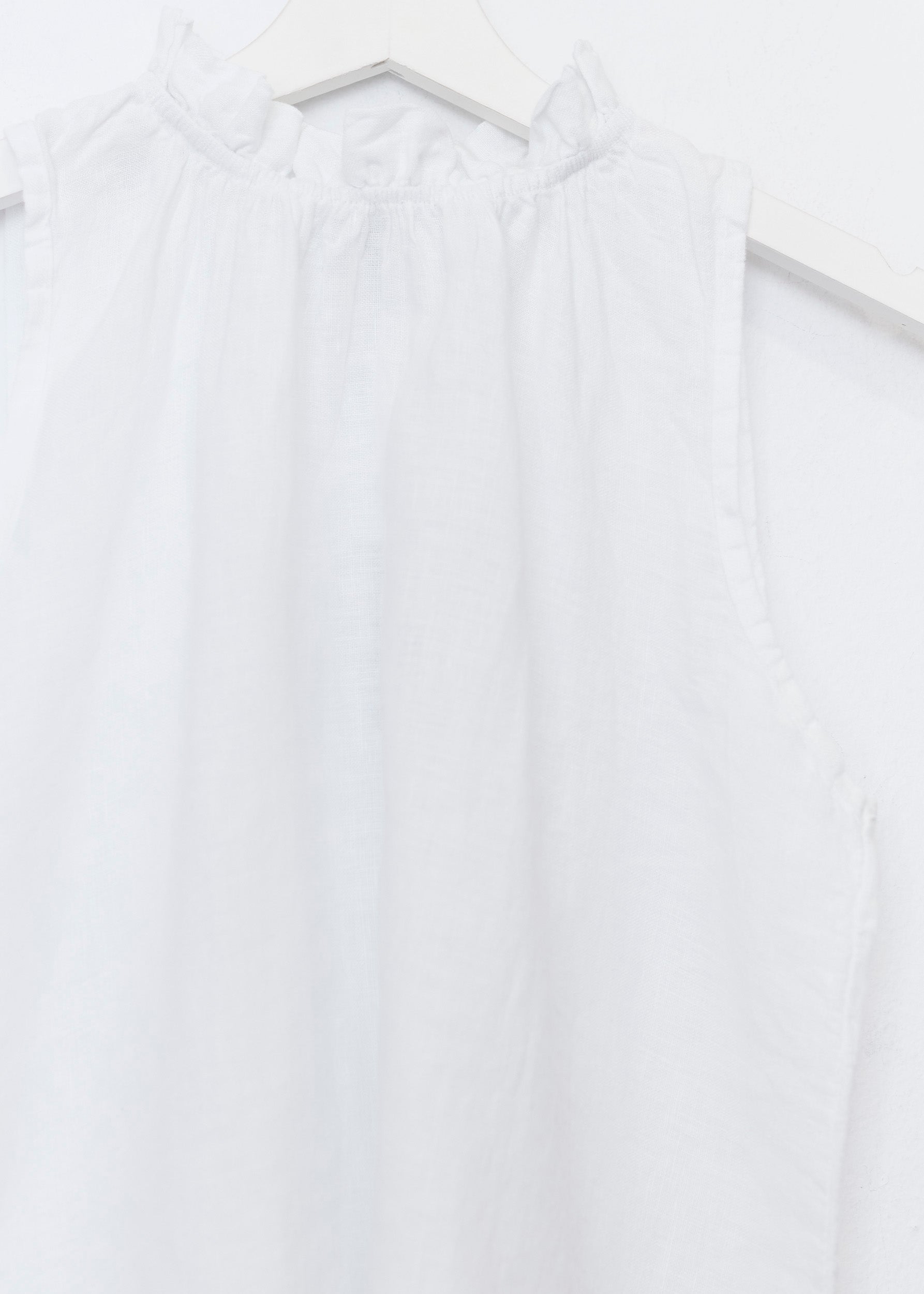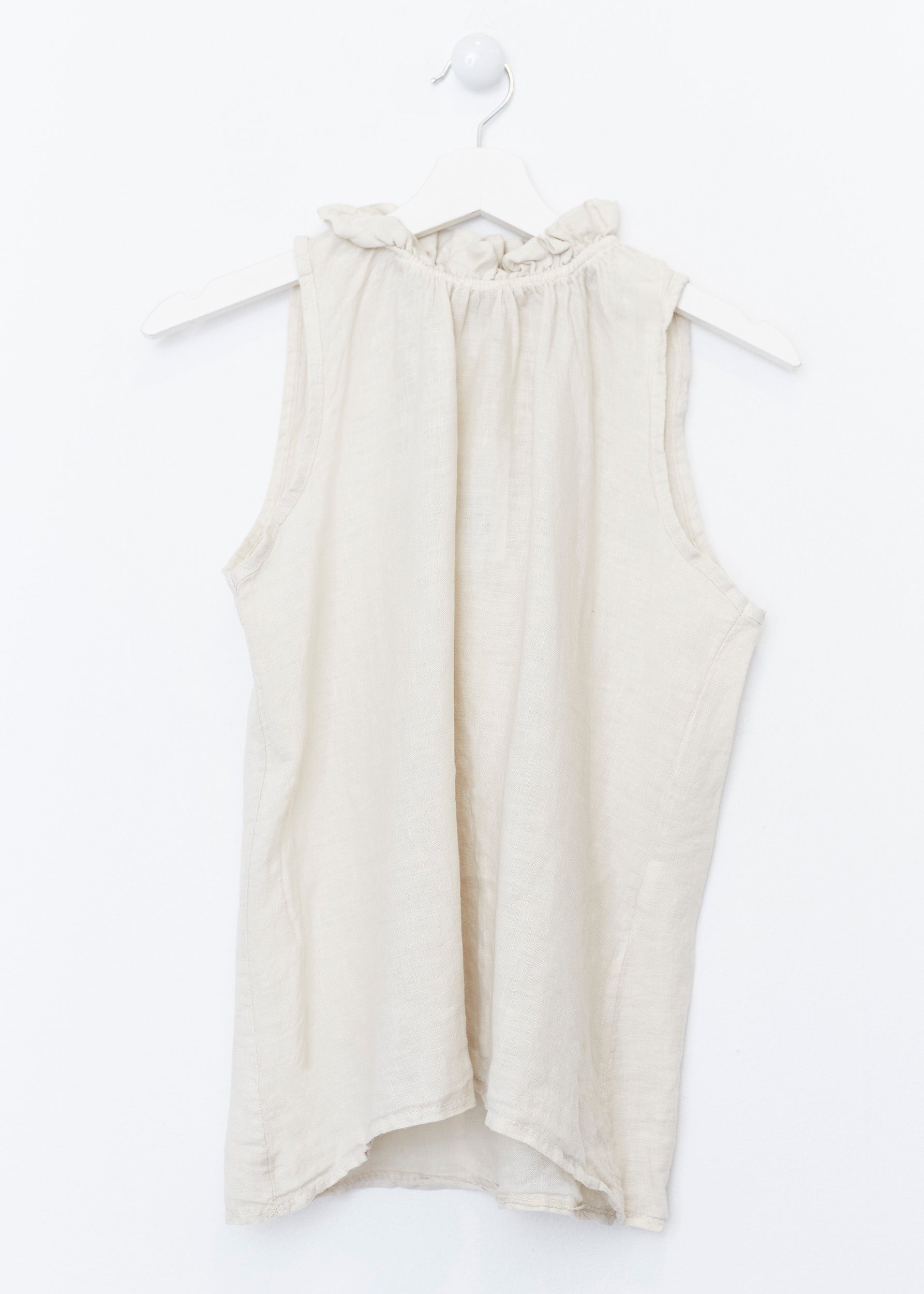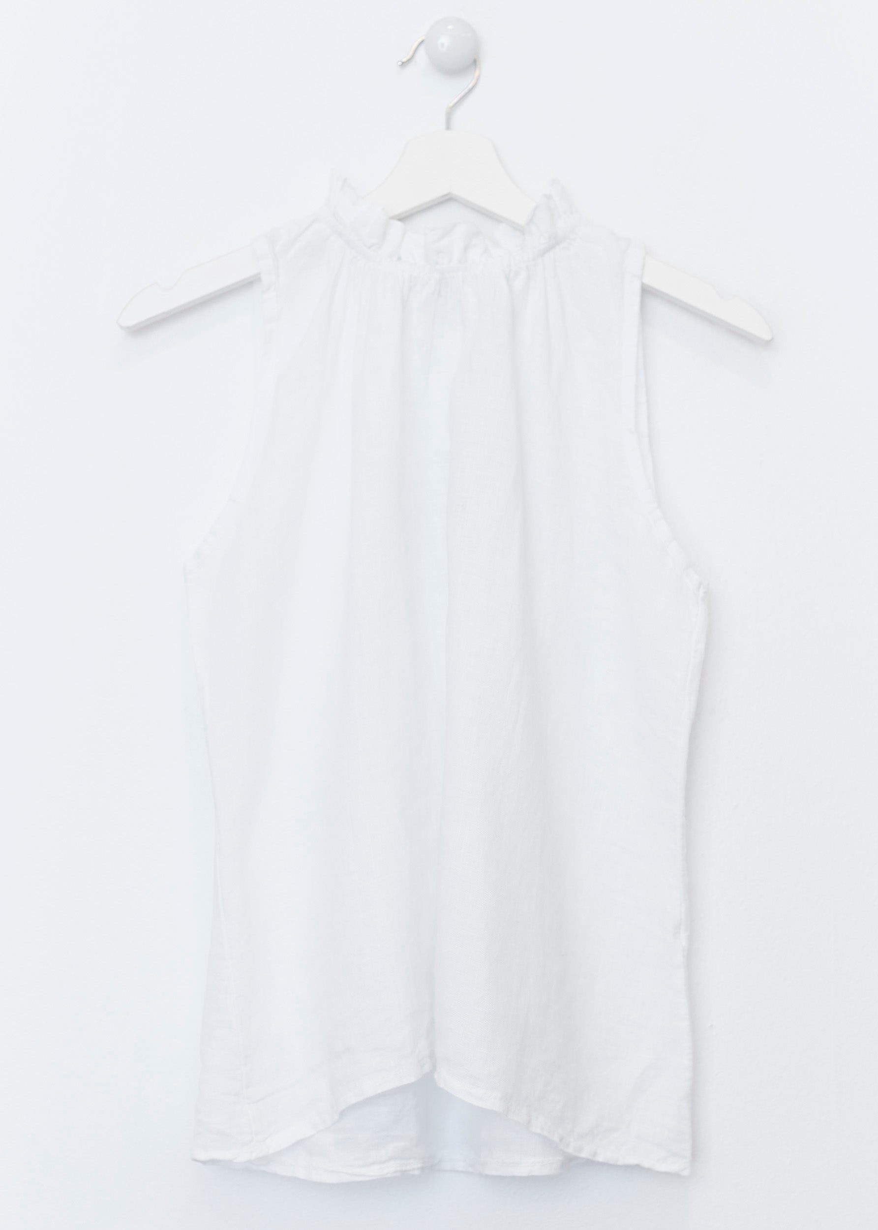 Sleeveless top with an elastic halter neckline with ruffle detail. Wide cut.