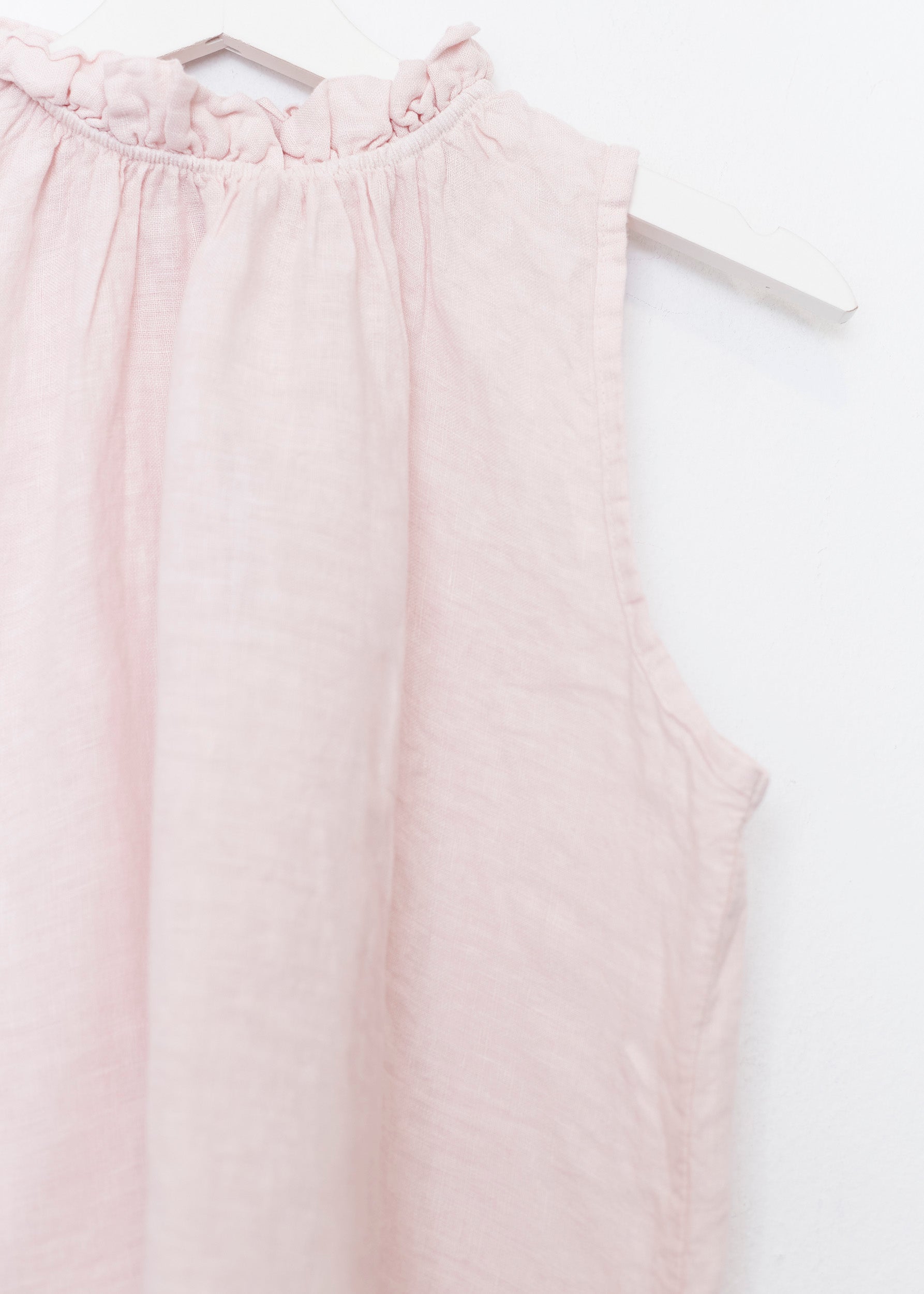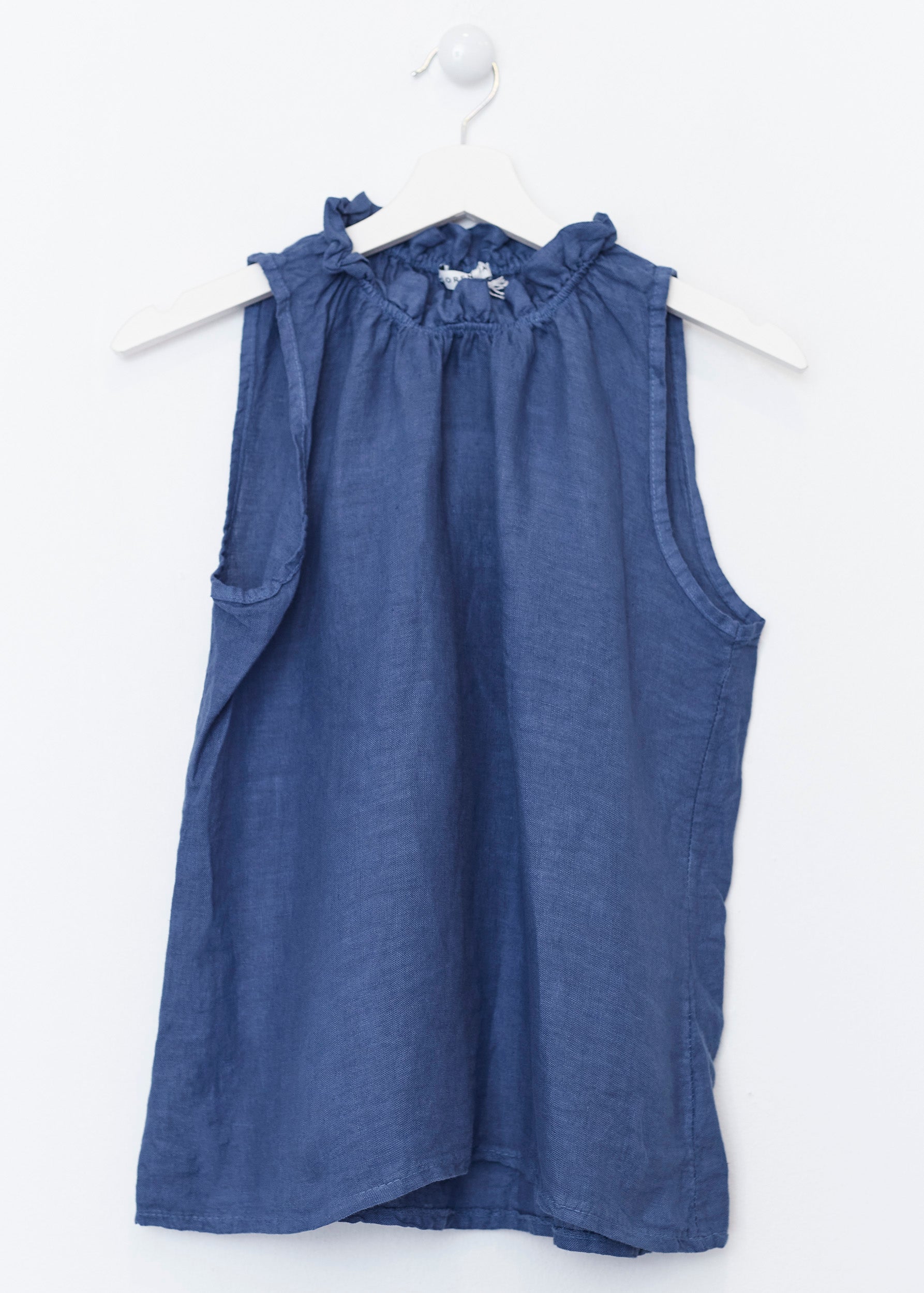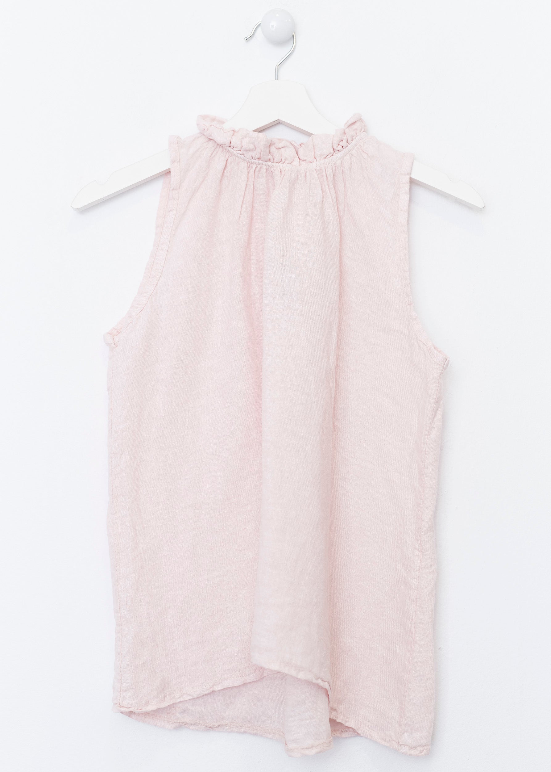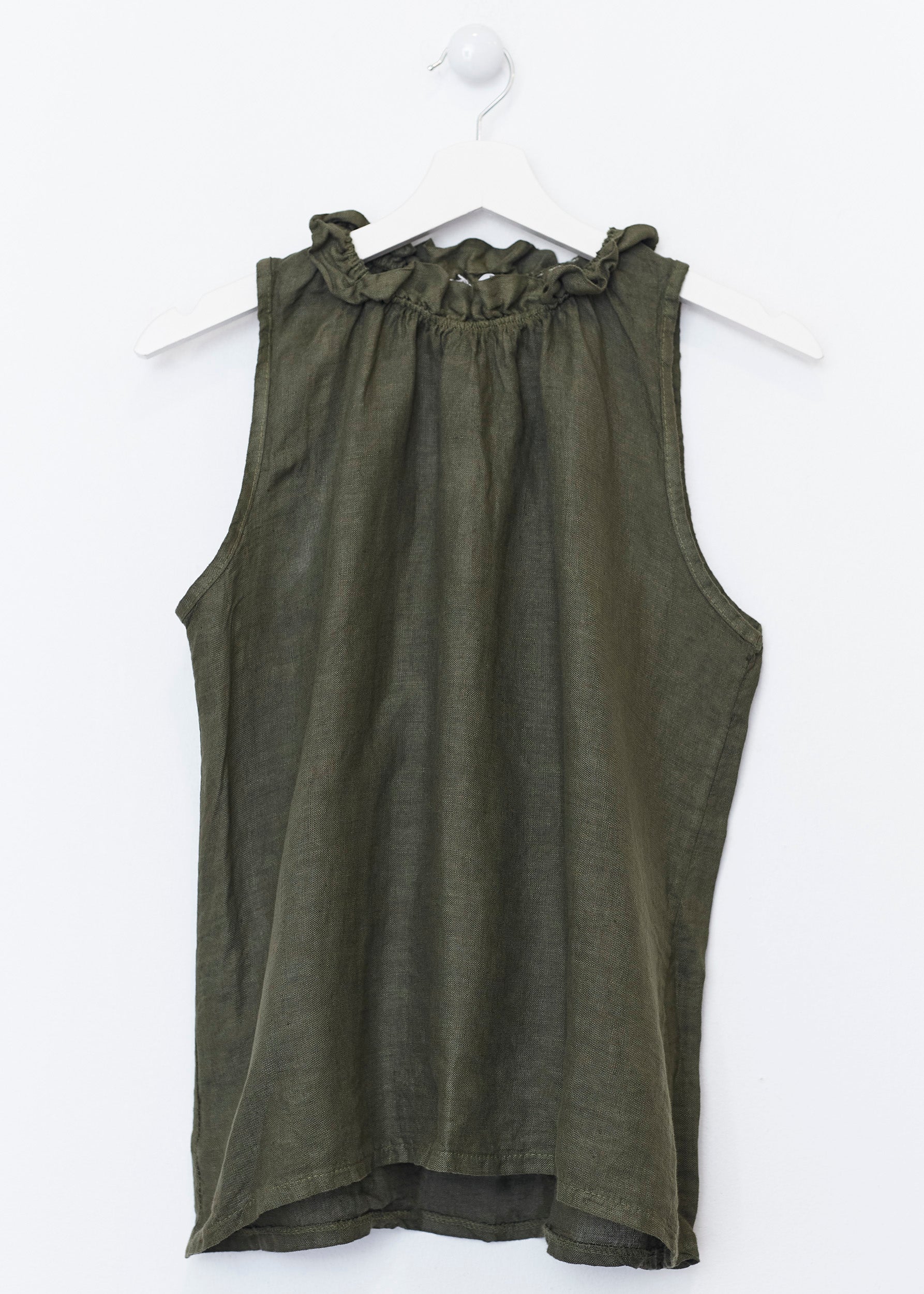 Sleeveless top with an elastic halter neckline with ruffle detail. Wide cut.