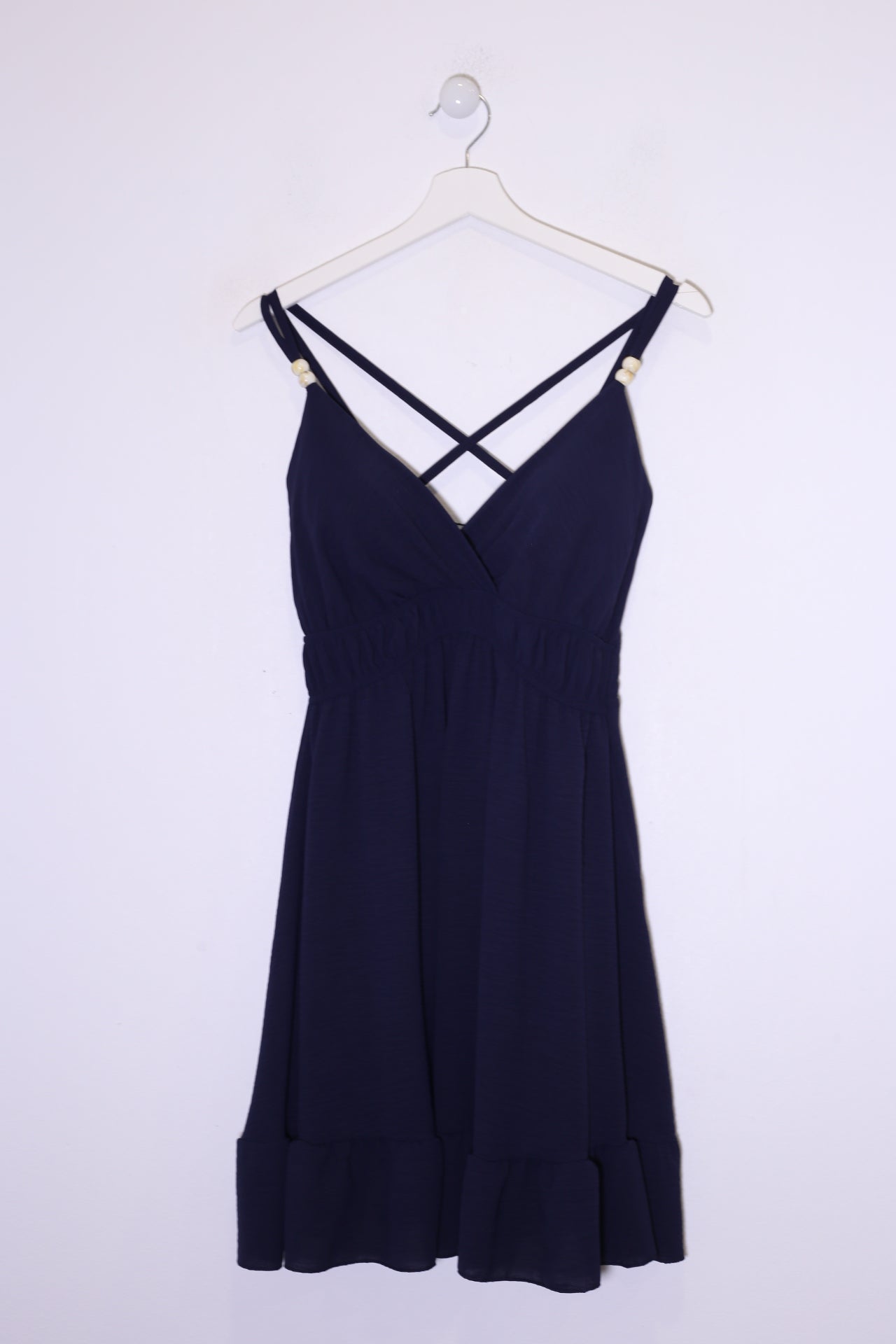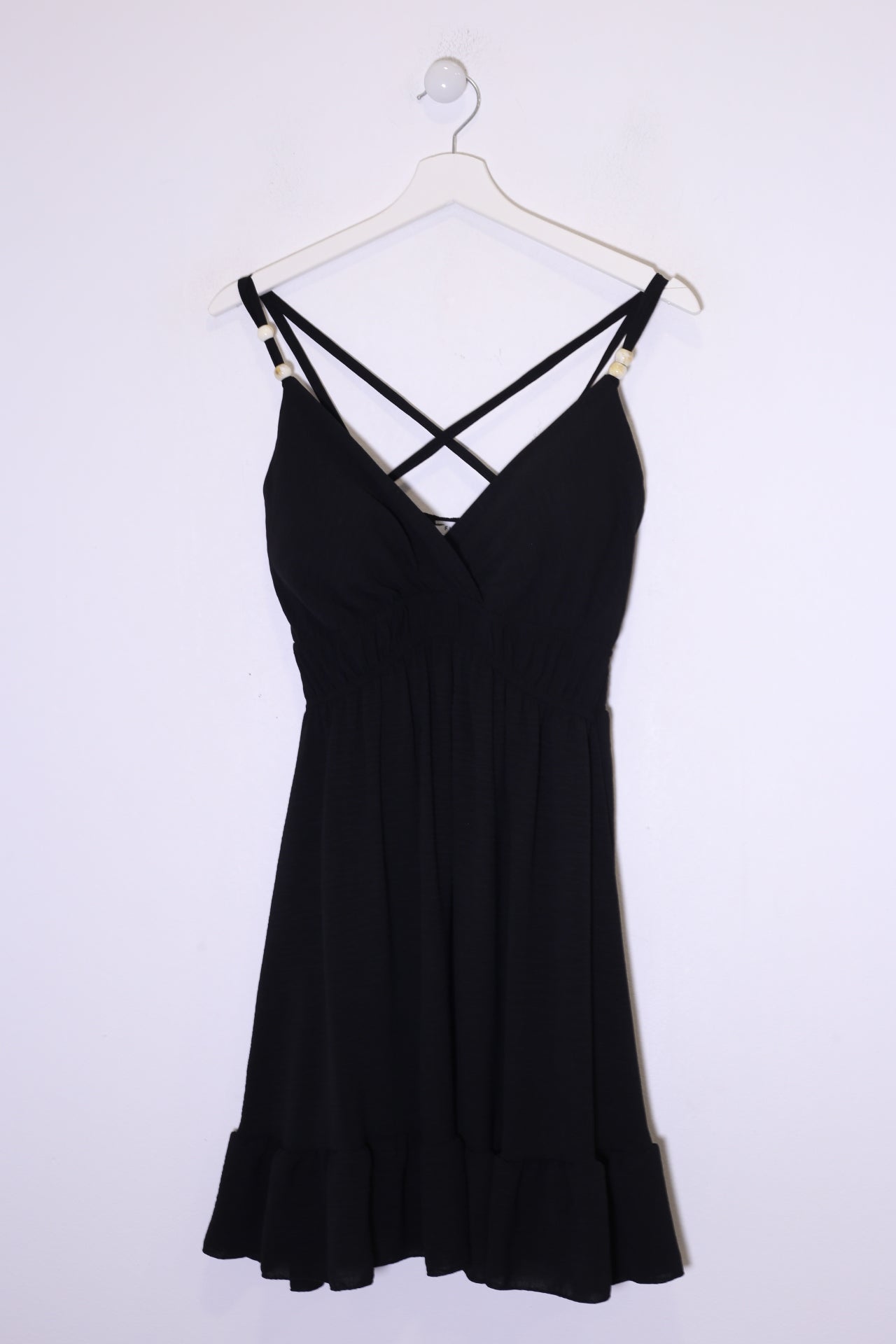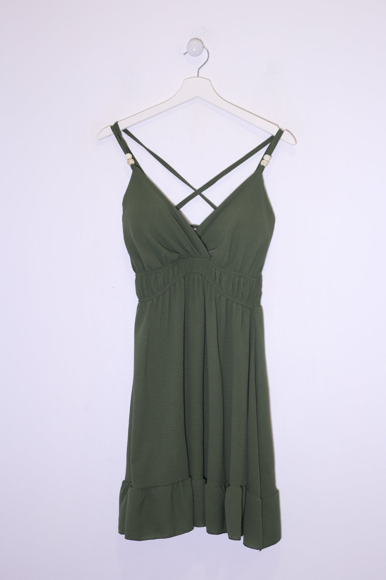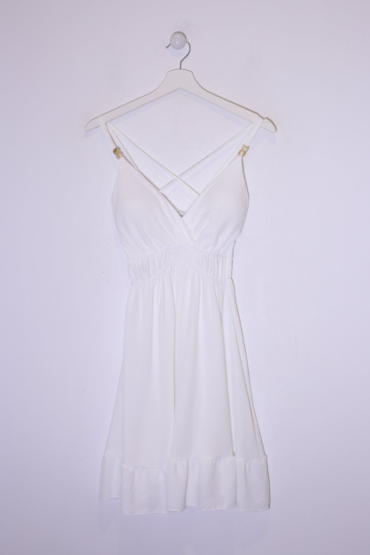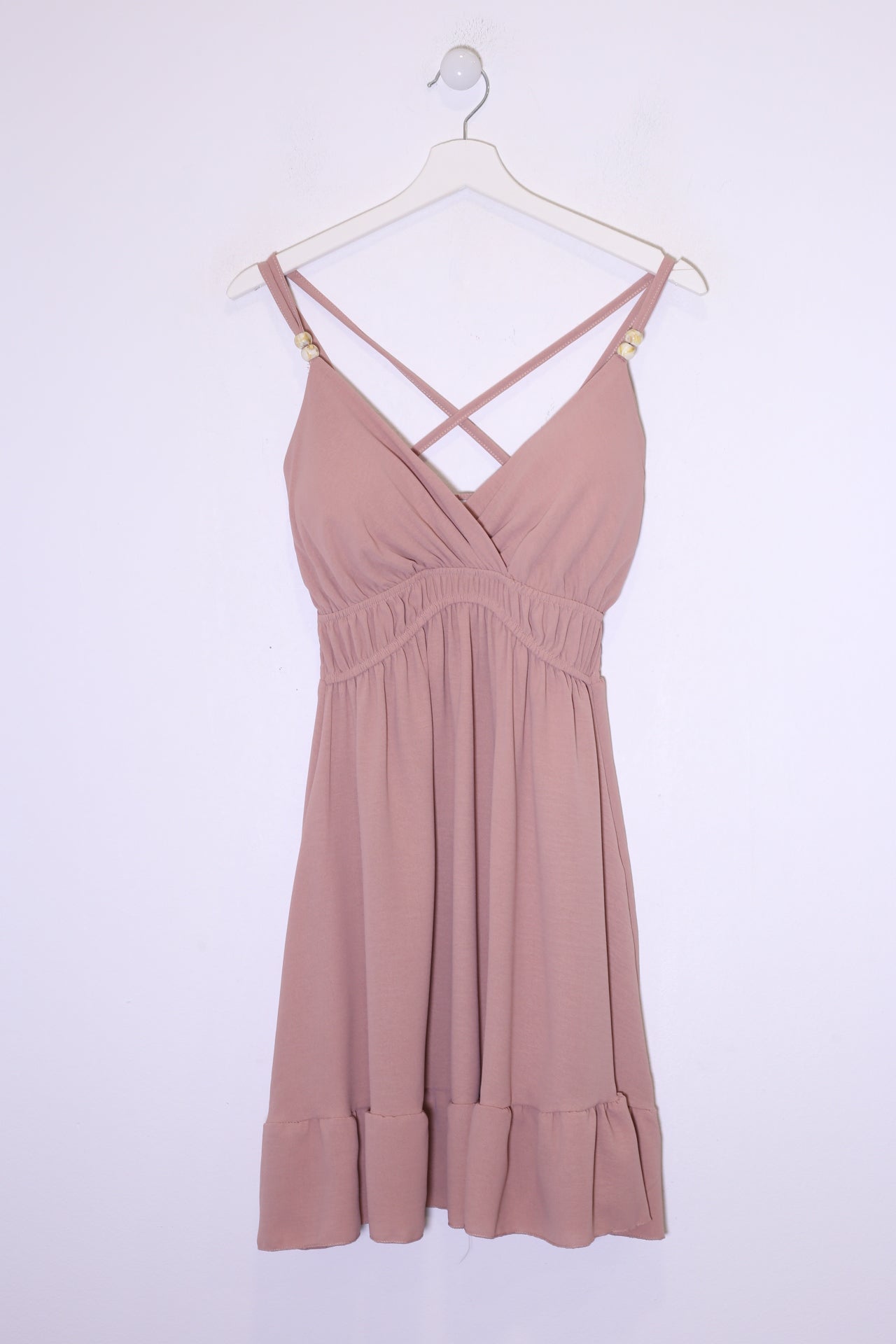 Vestido corto de escote cruzado con tirantes dobles decorados con abalorios, cintura elástica fruncida, falda con volante y espalda con tirantes cruzados.