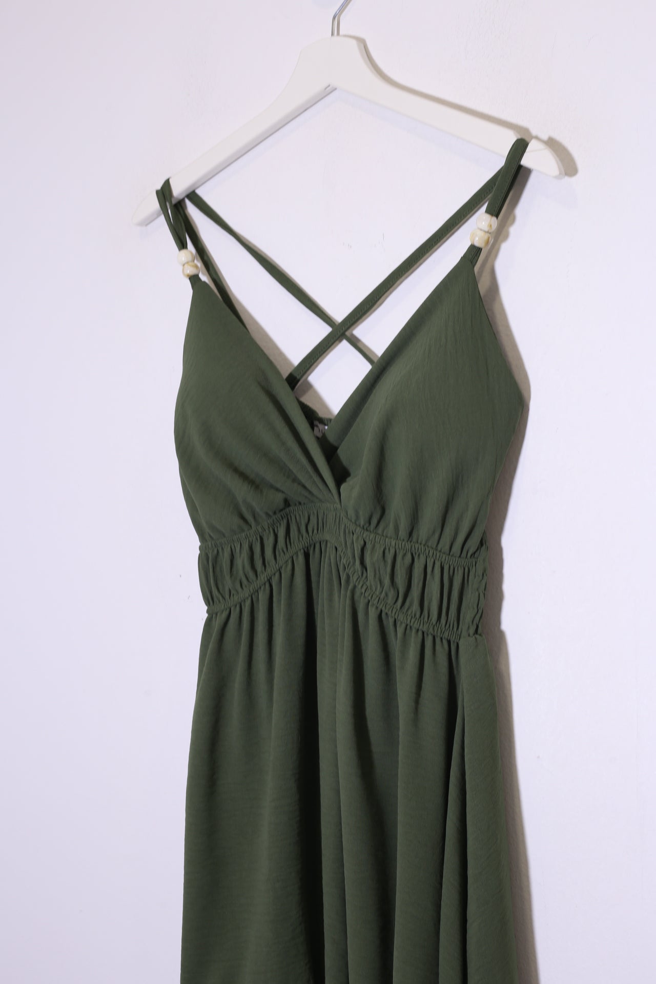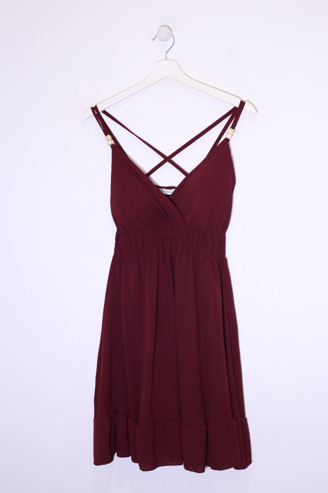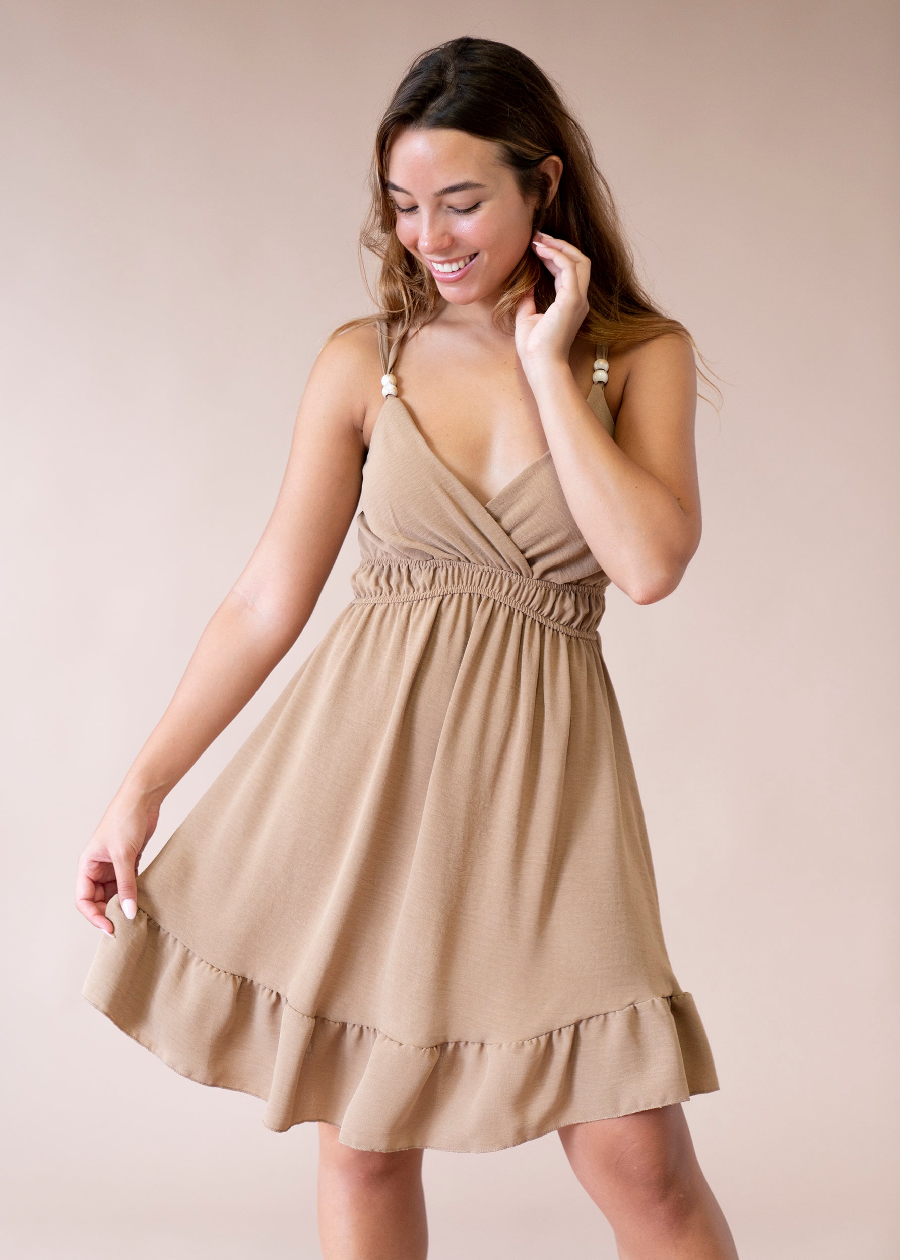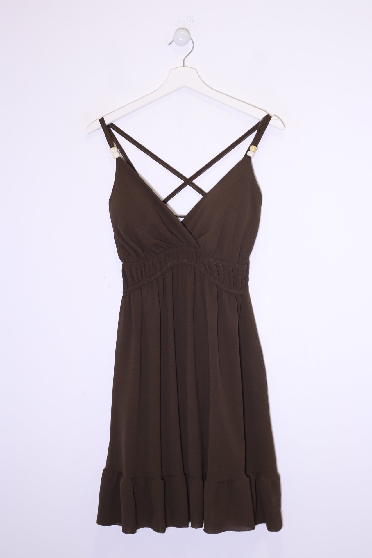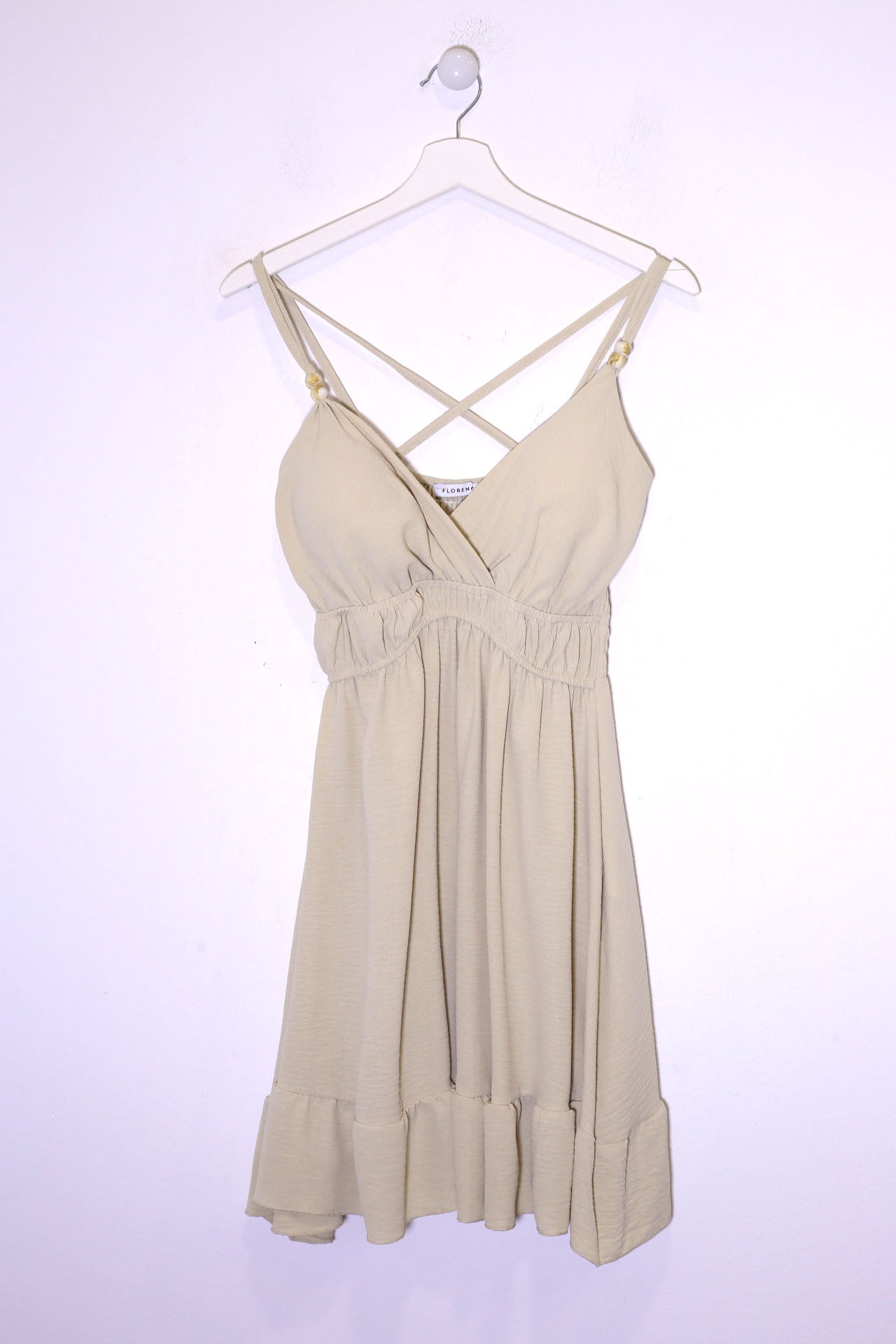 Vestido corto de escote cruzado con tirantes dobles decorados con abalorios, cintura elástica fruncida, falda con volante y espalda con tirantes cruzados.