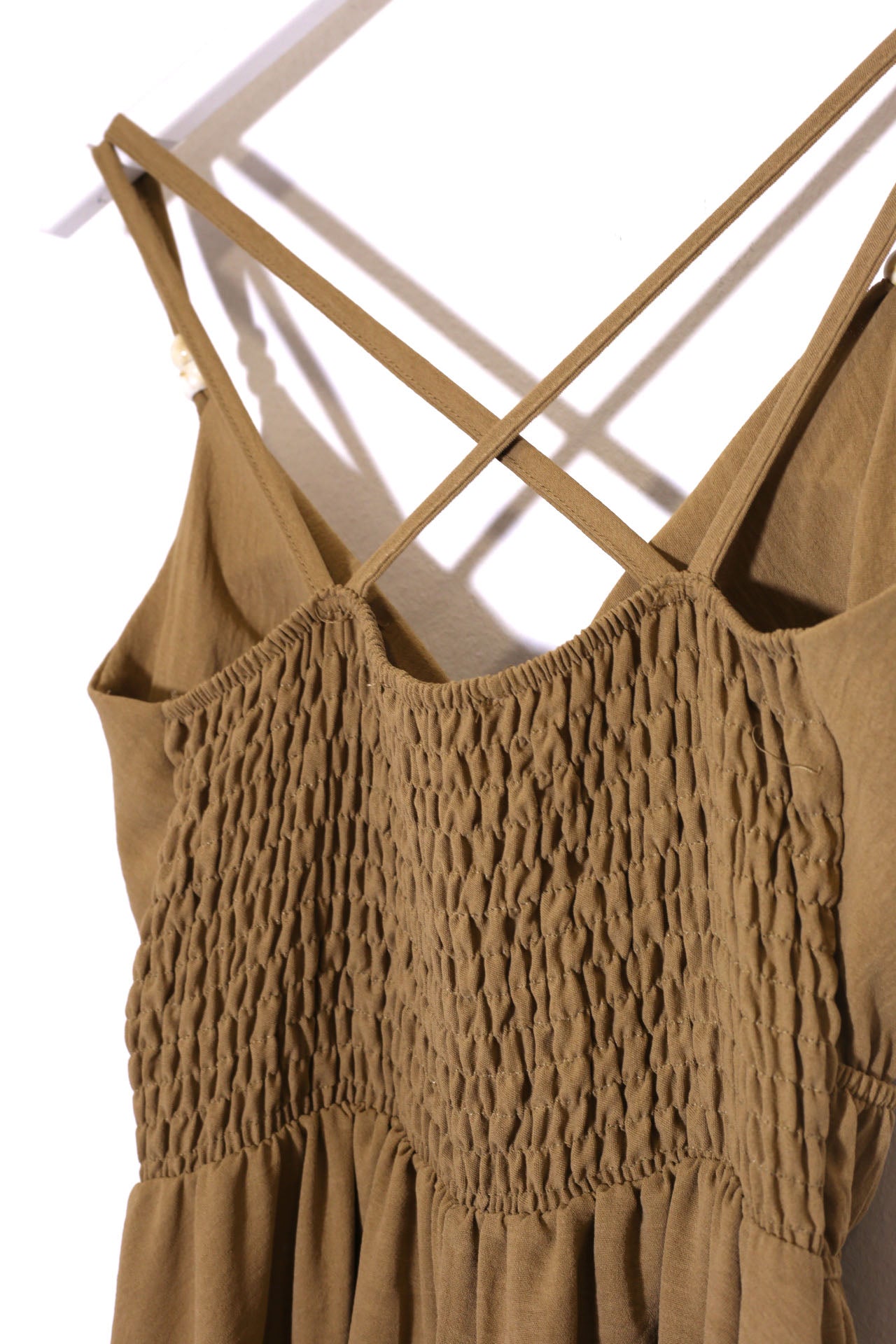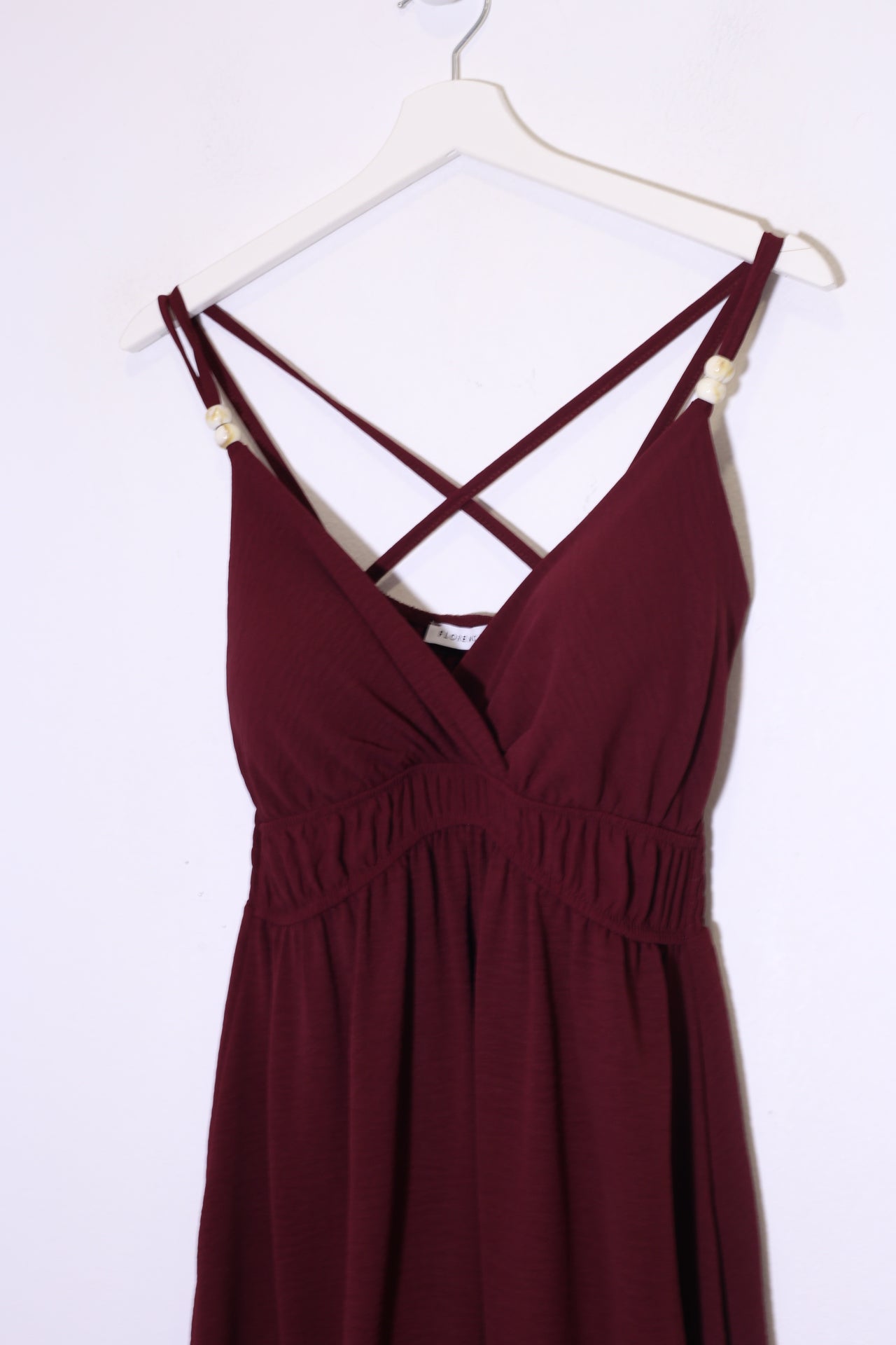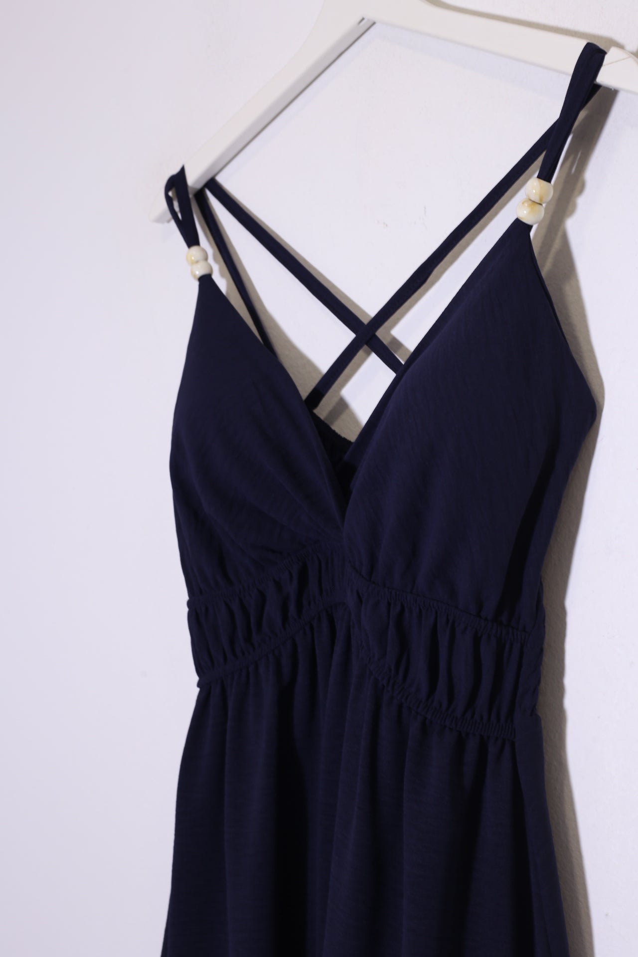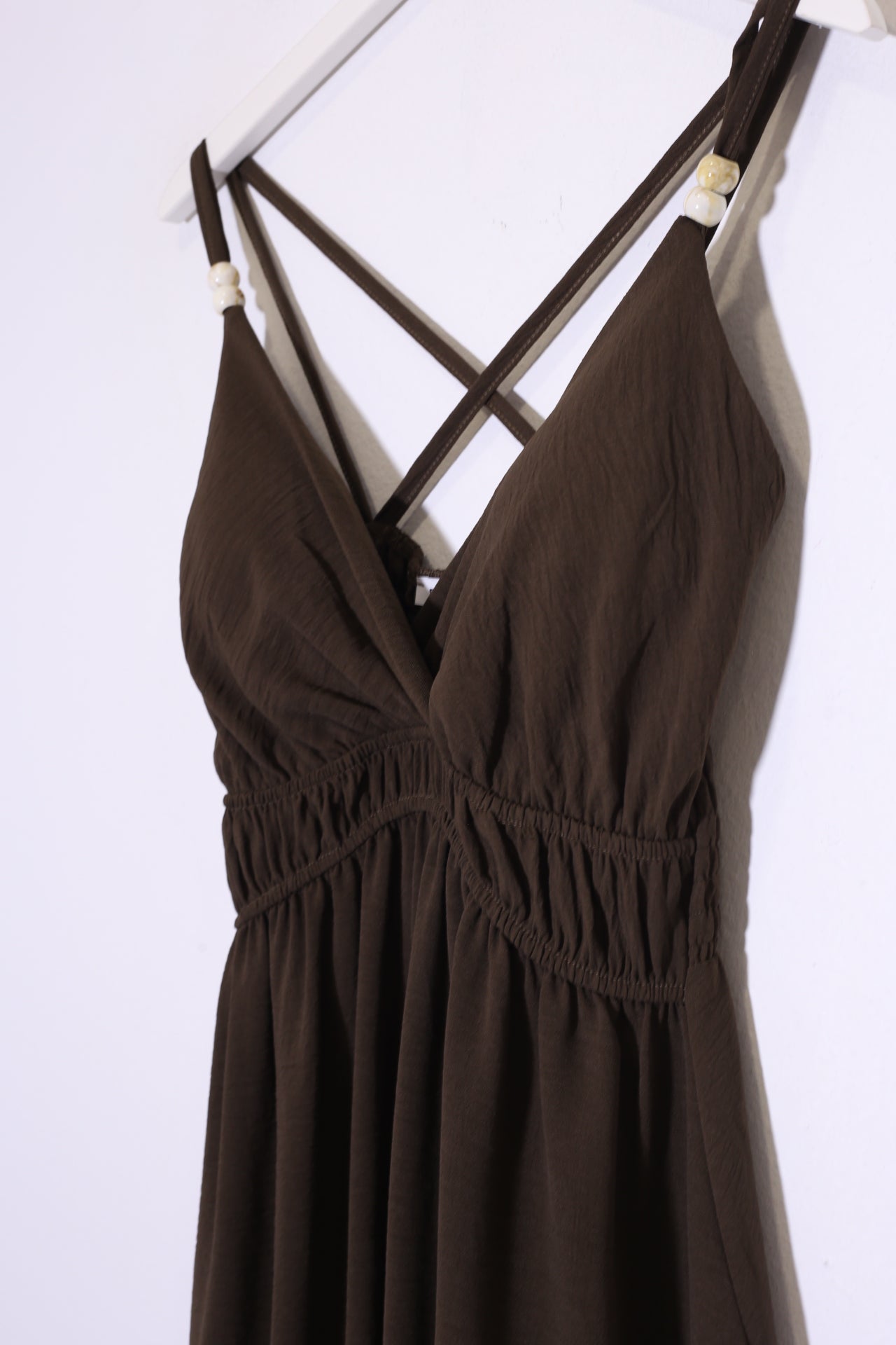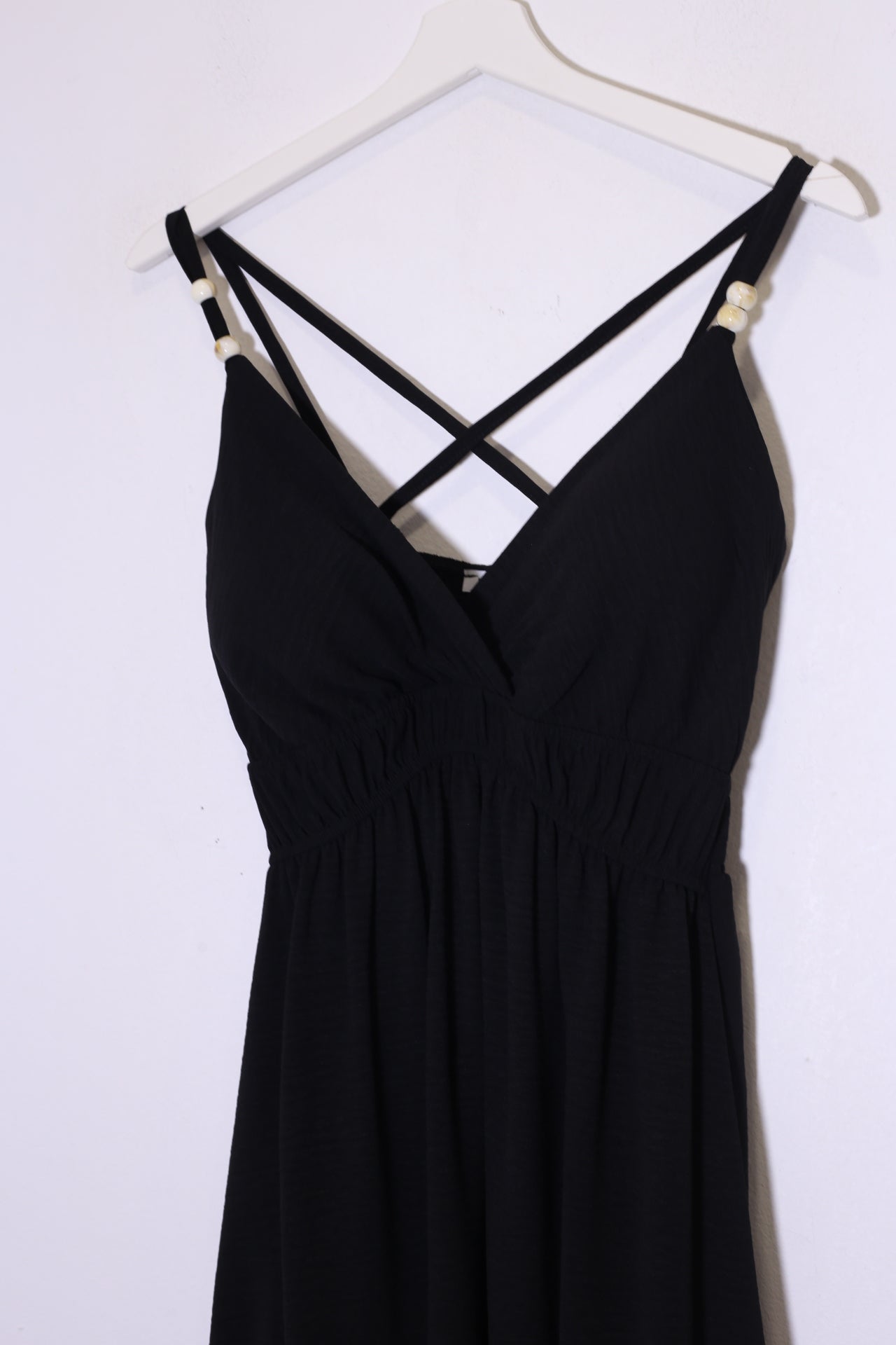 Vestido corto de escote cruzado con tirantes dobles decorados con abalorios, cintura elástica fruncida, falda con volante y espalda con tirantes cruzados.