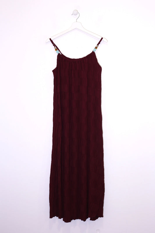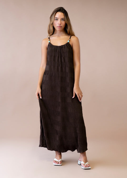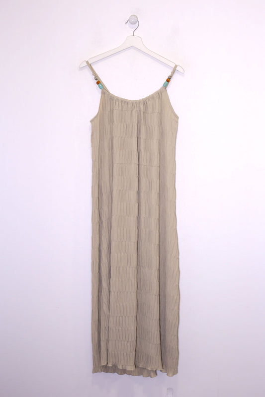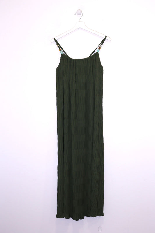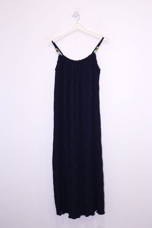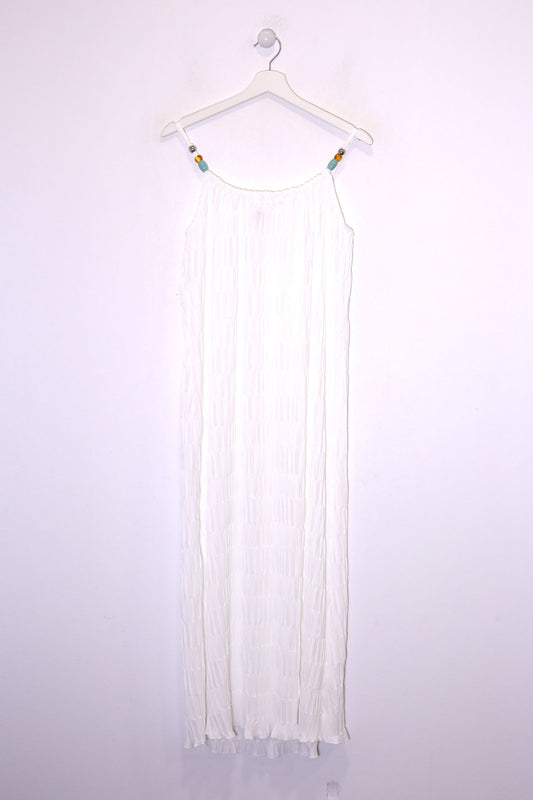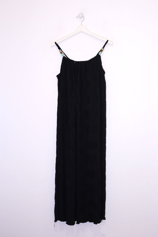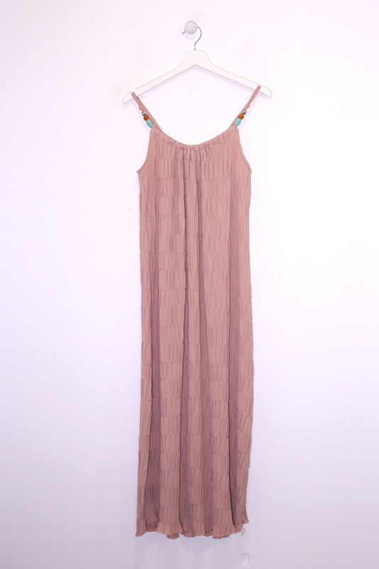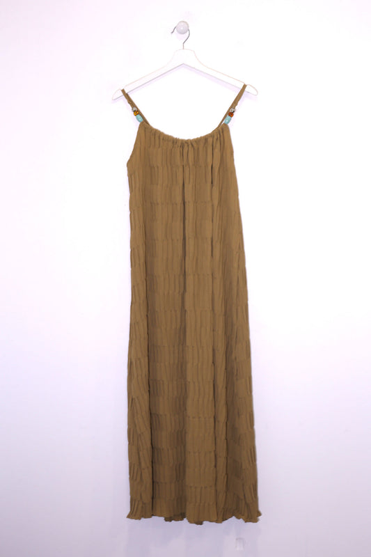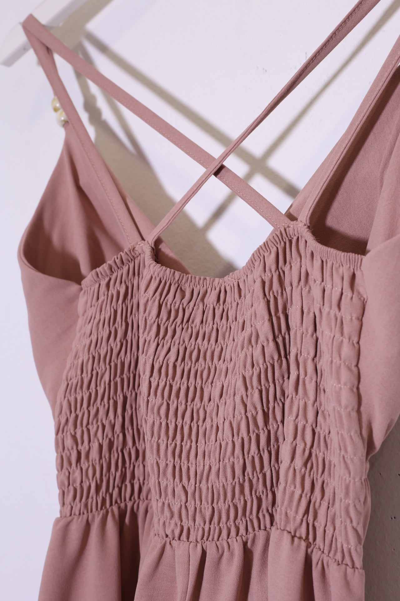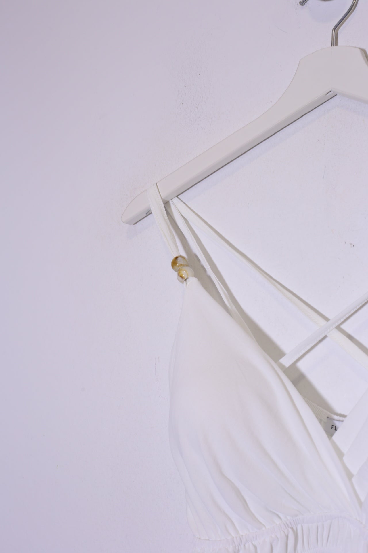 Vestido corto de escote cruzado con tirantes dobles decorados con abalorios, cintura elástica fruncida, falda con volante y espalda con tirantes cruzados.