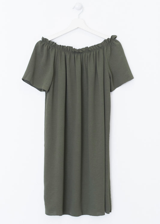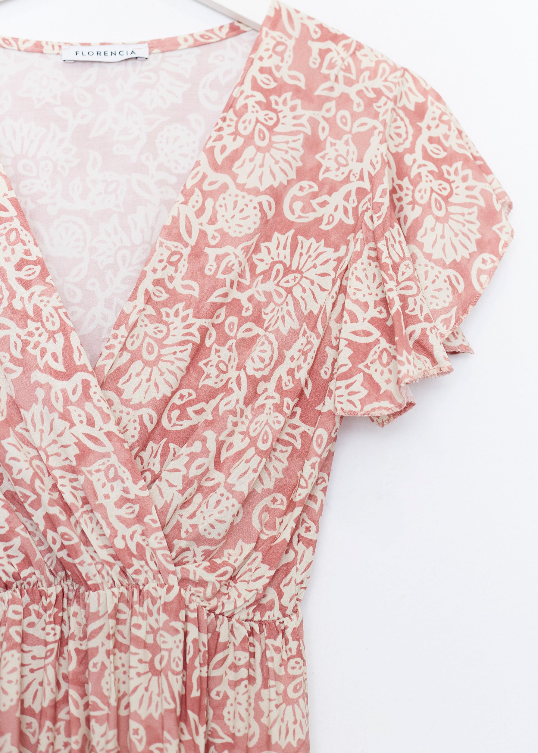 Short sleeve short dress with ruffle detail and pointed crossover neckline. Elastic waist. Ruffle detail at bottom. Floral print.
