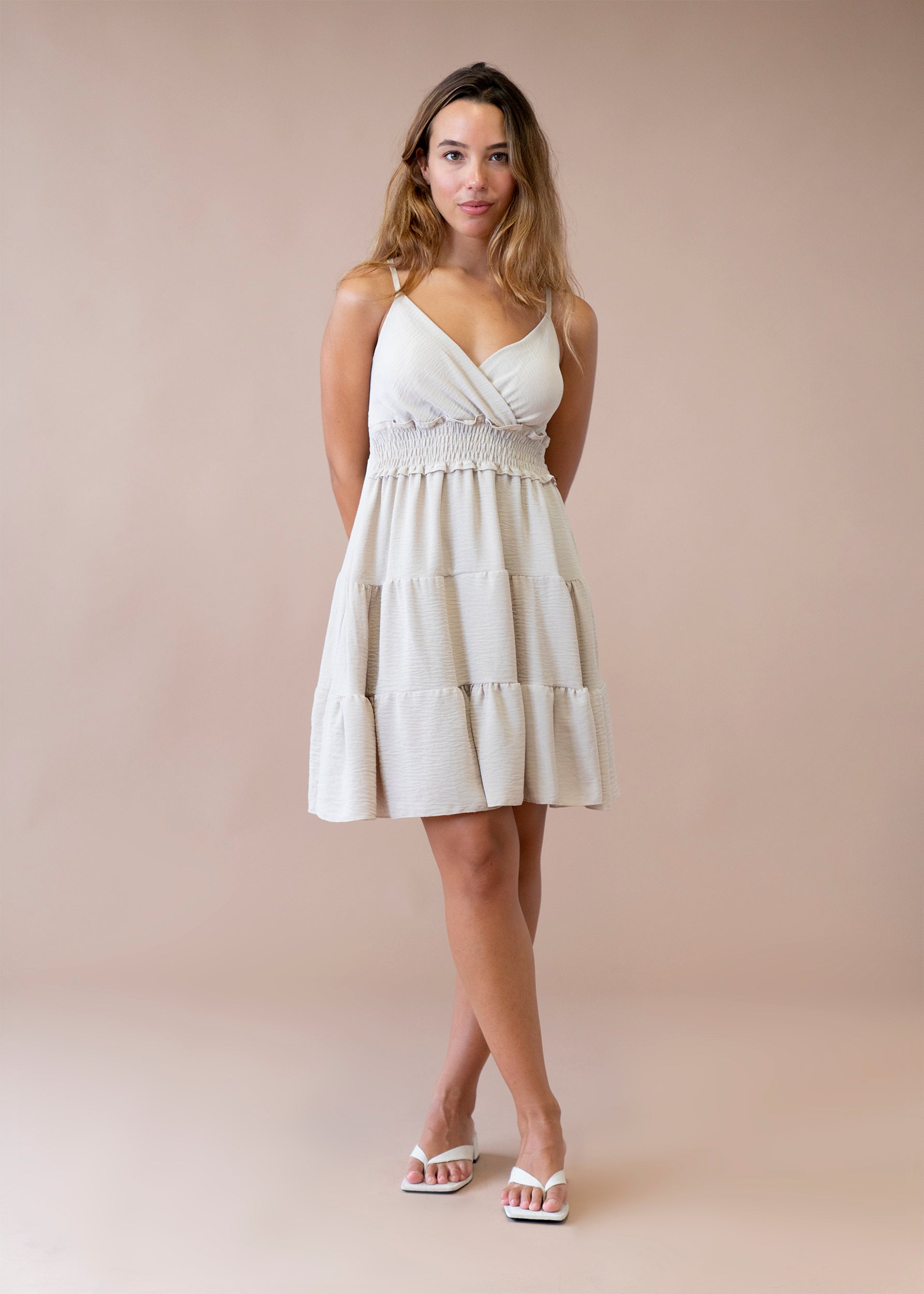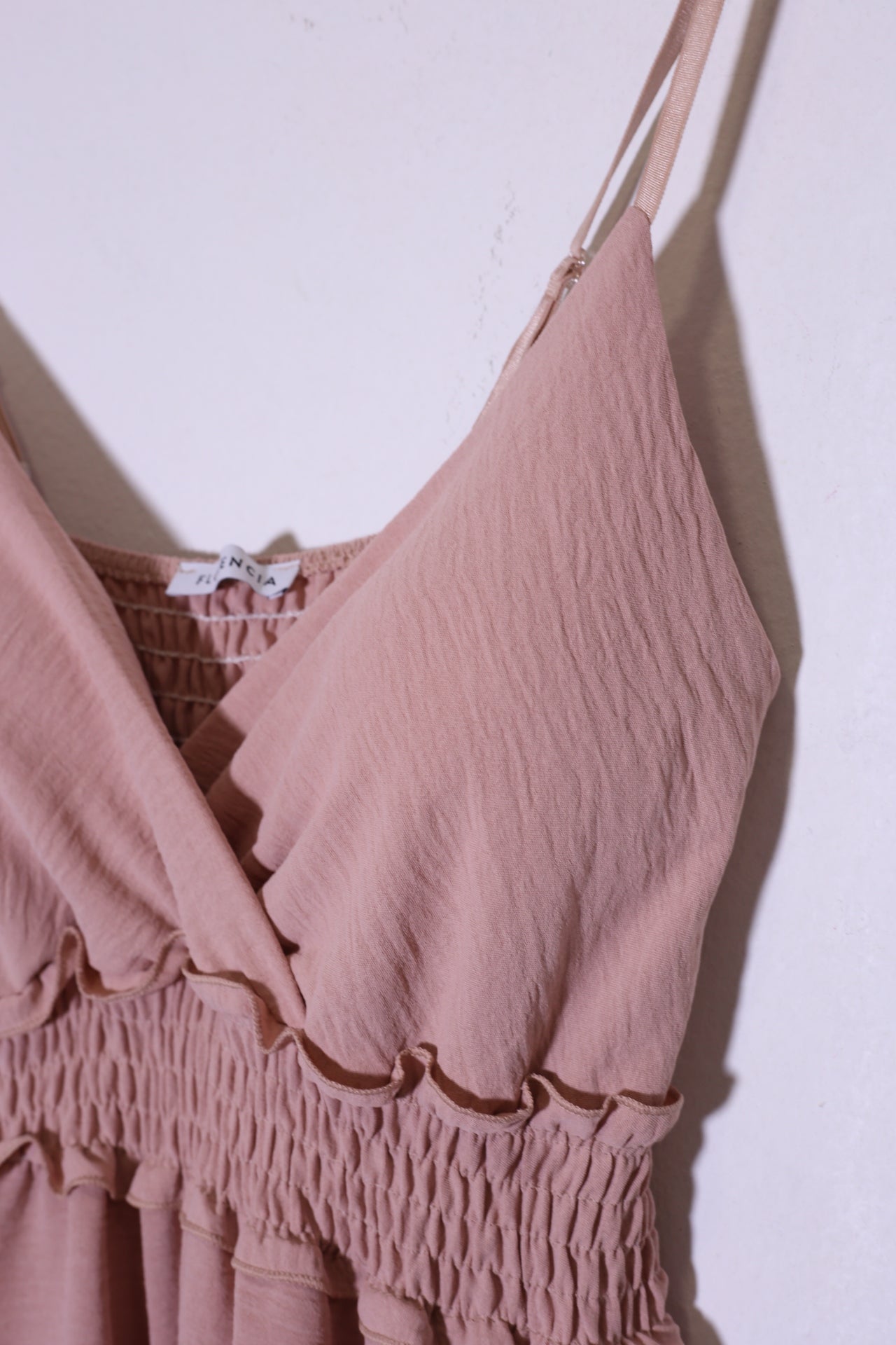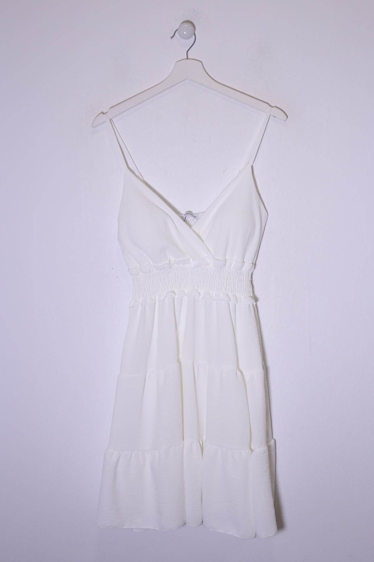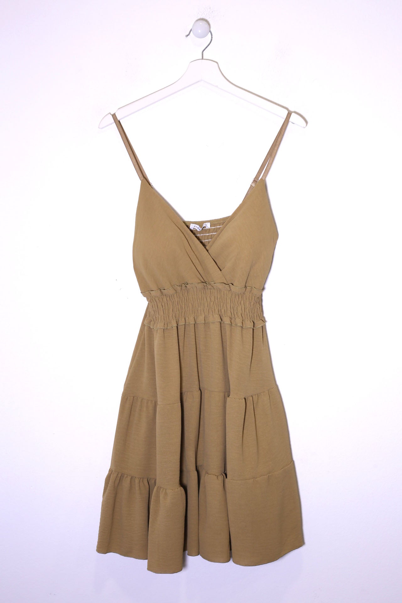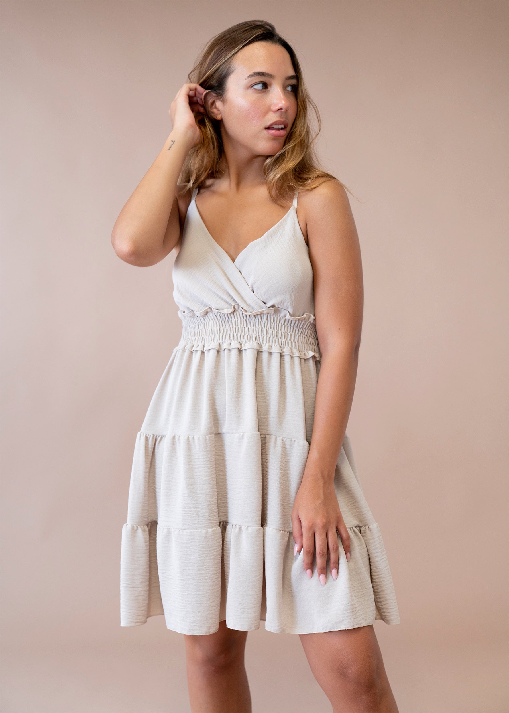 Vestido corto con escote cruzado tipo cache-cœur, tirantes finos ajustables, fruncido tipo nido de abeja bajo el pecho, falda con volantes.