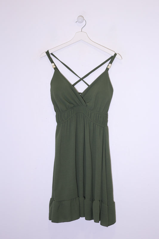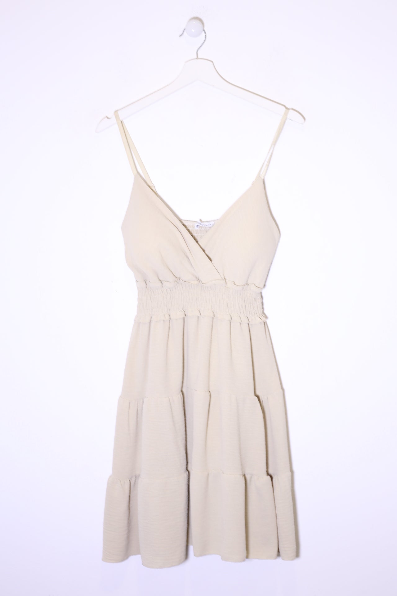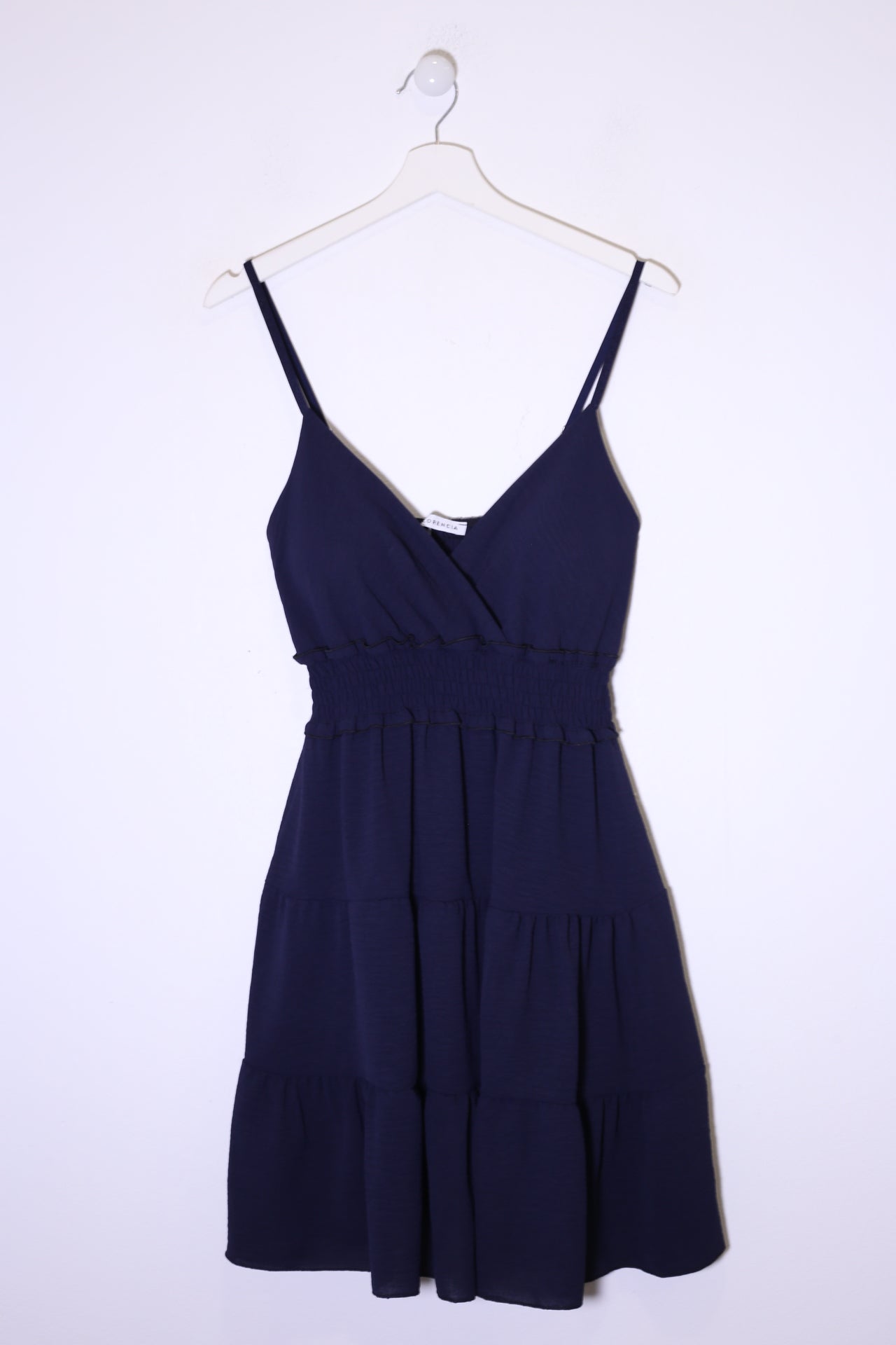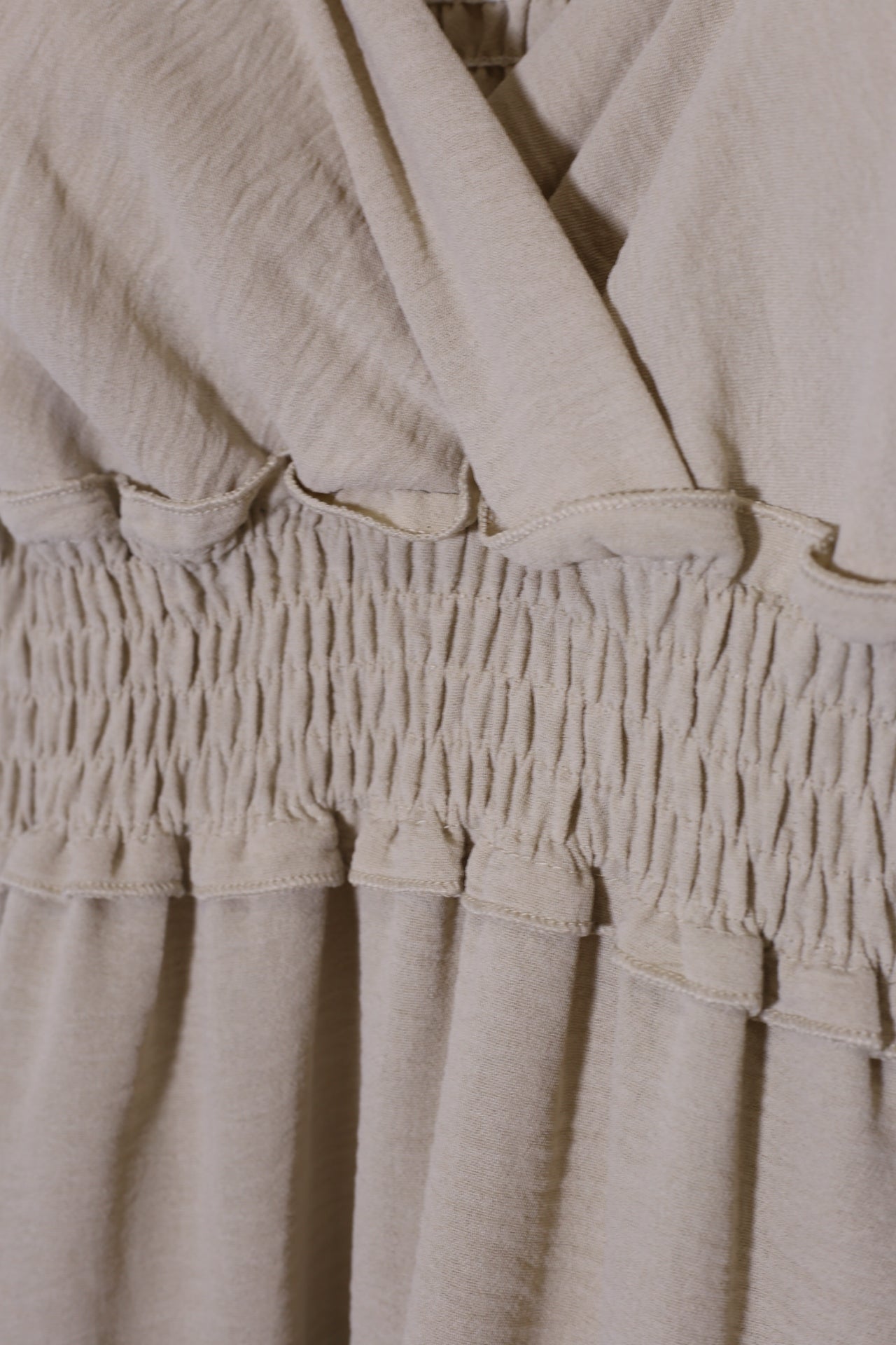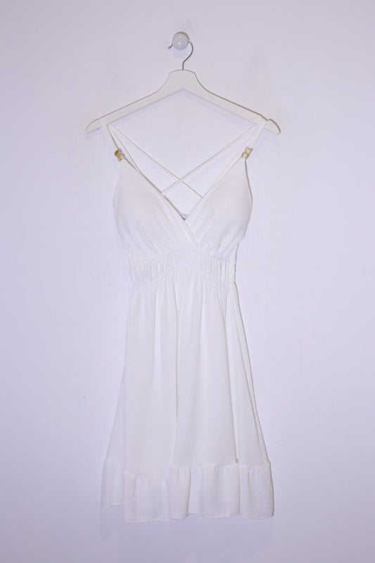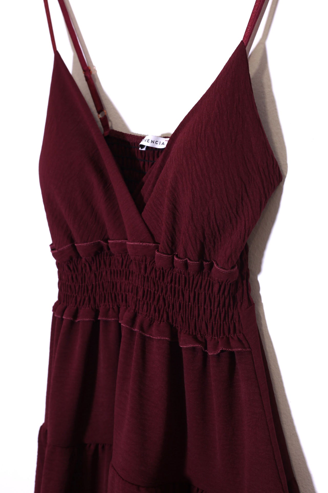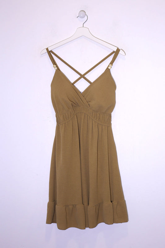 Vestido corto con escote cruzado tipo cache-cœur, tirantes finos ajustables, fruncido tipo nido de abeja bajo el pecho, falda con volantes.