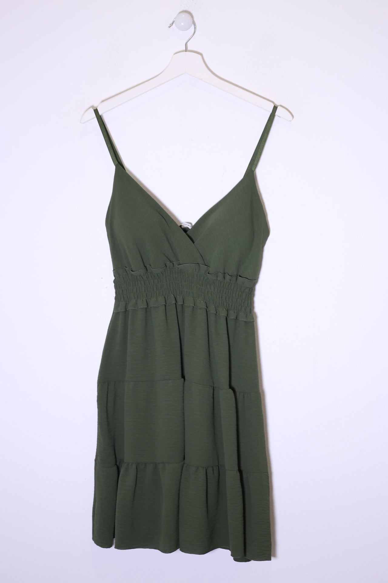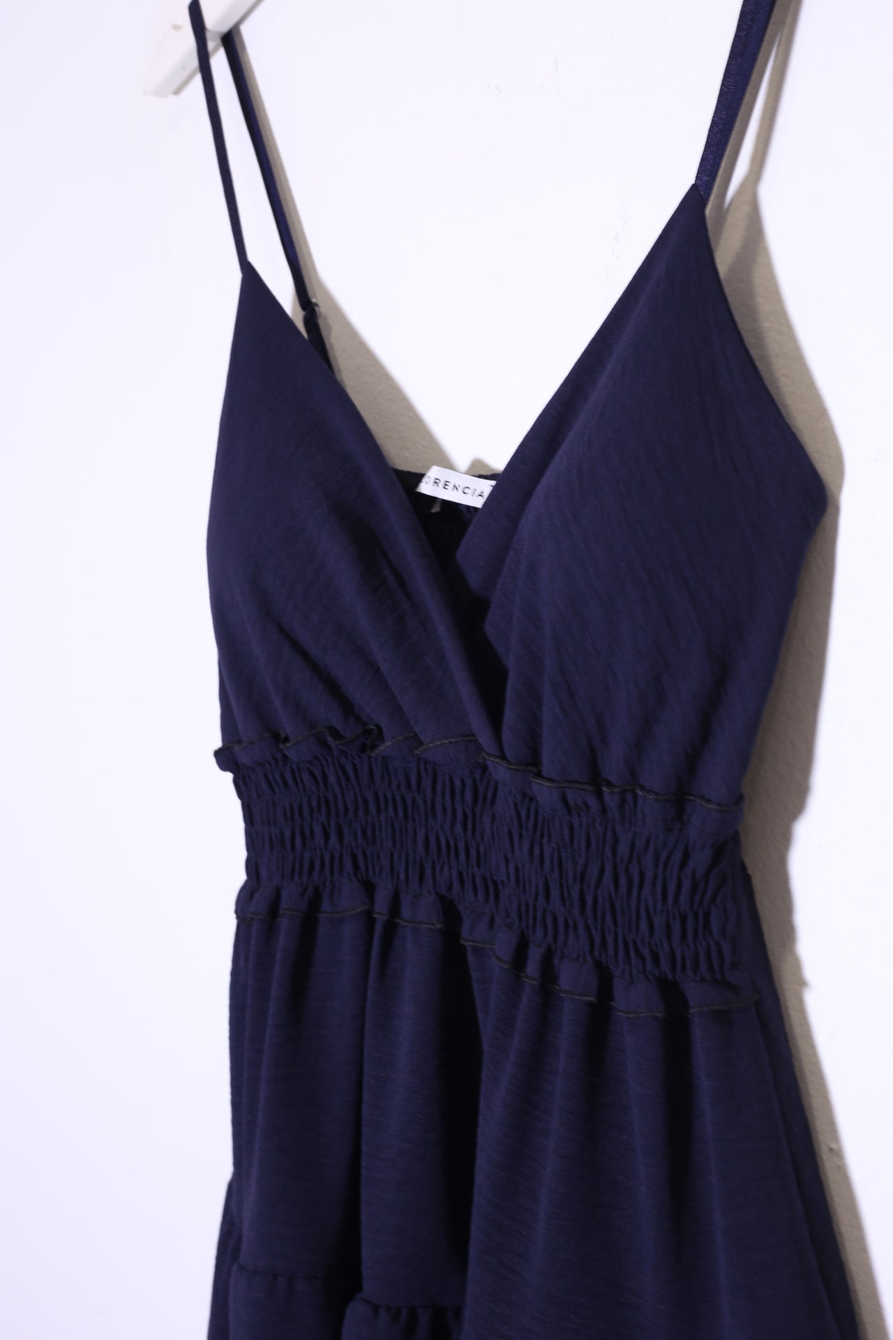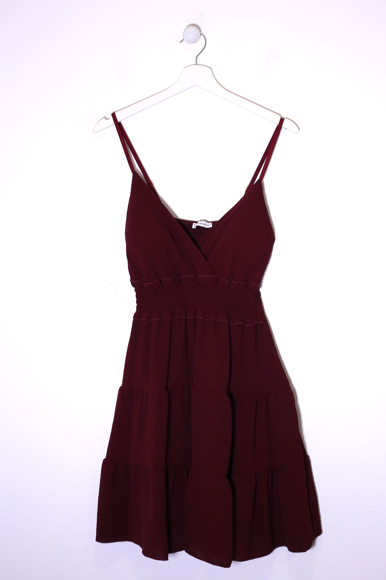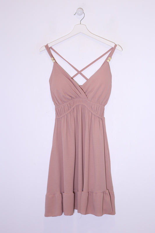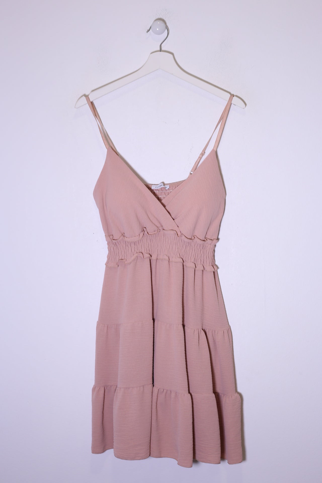 Vestido corto con escote cruzado tipo cache-cœur, tirantes finos ajustables, fruncido tipo nido de abeja bajo el pecho, falda con volantes.