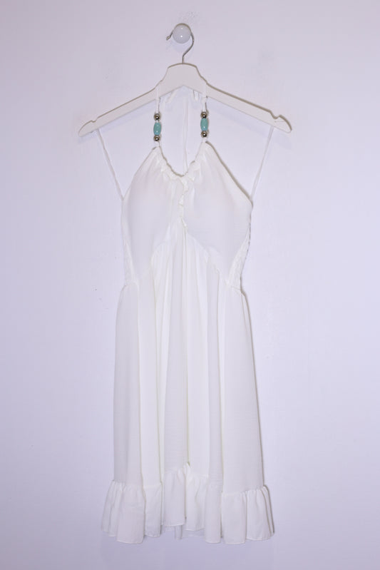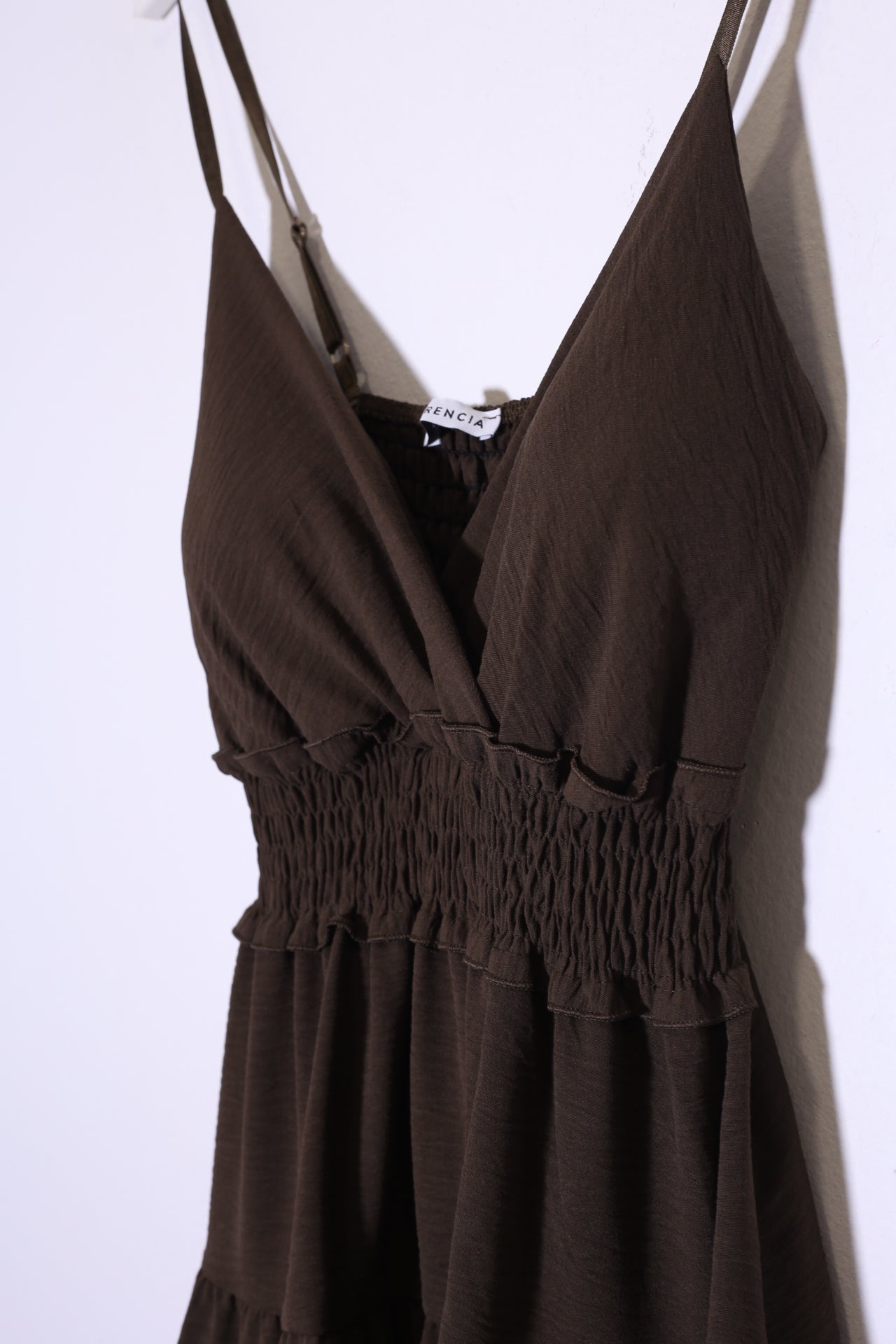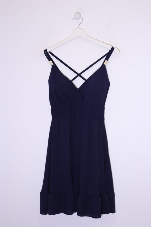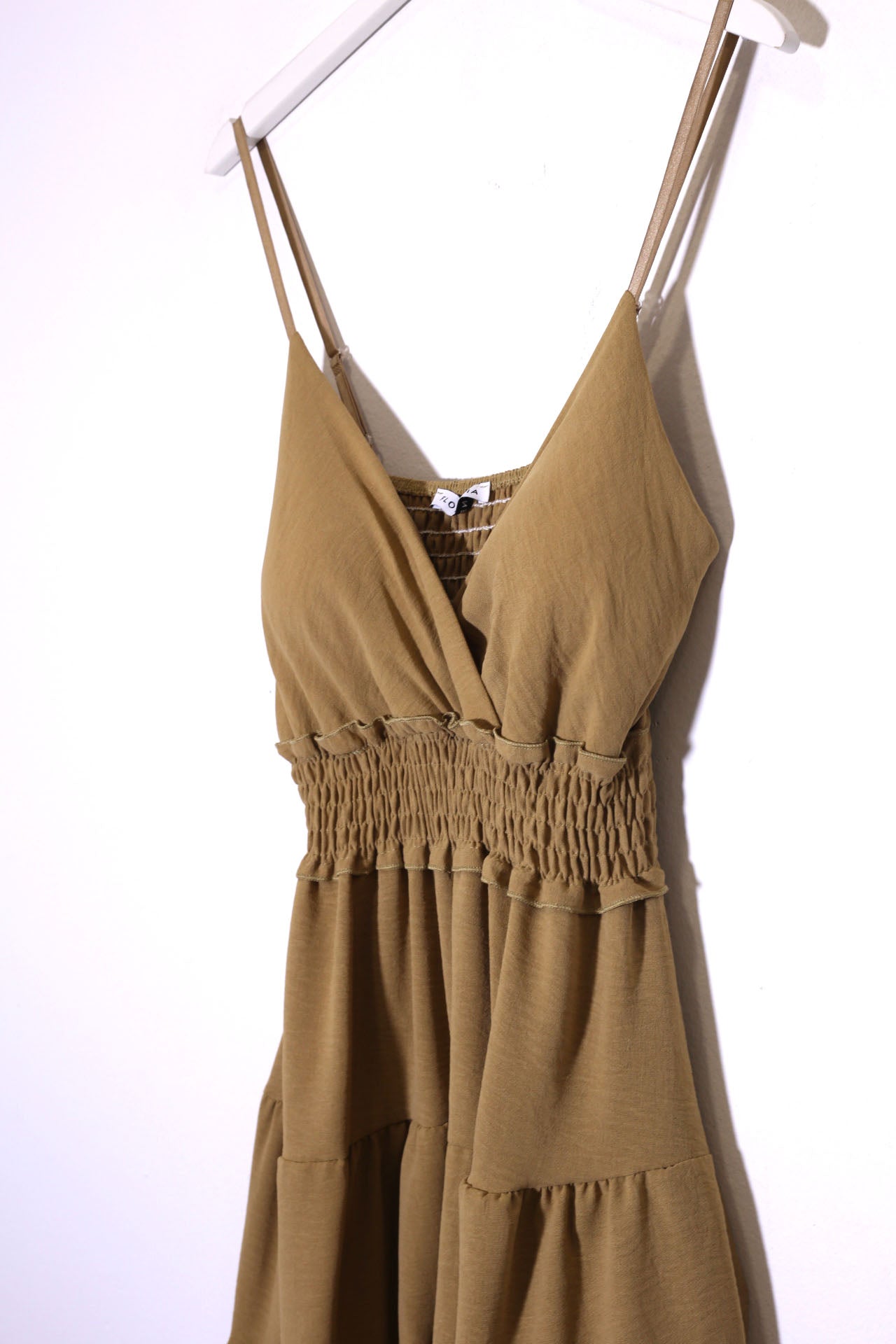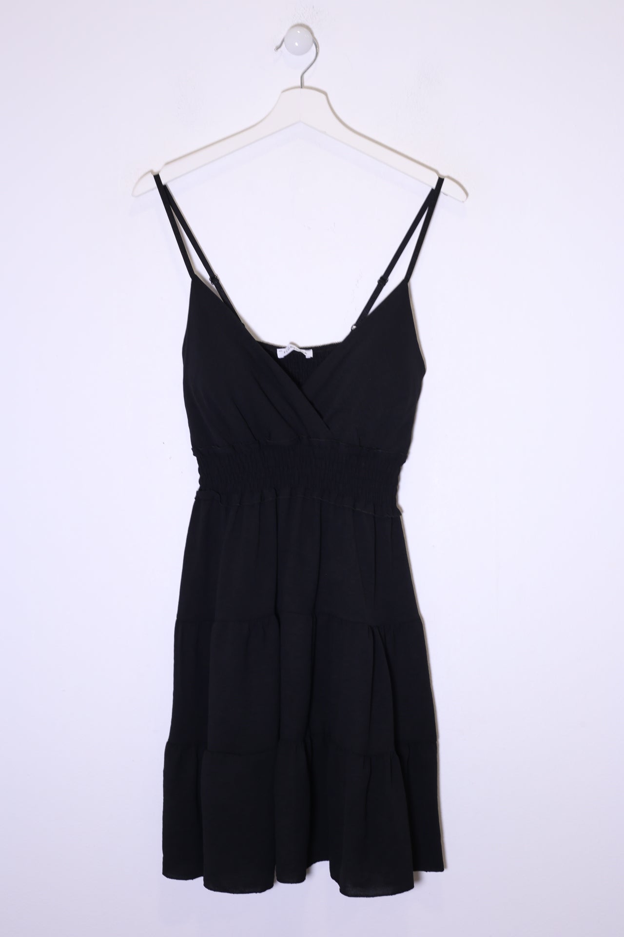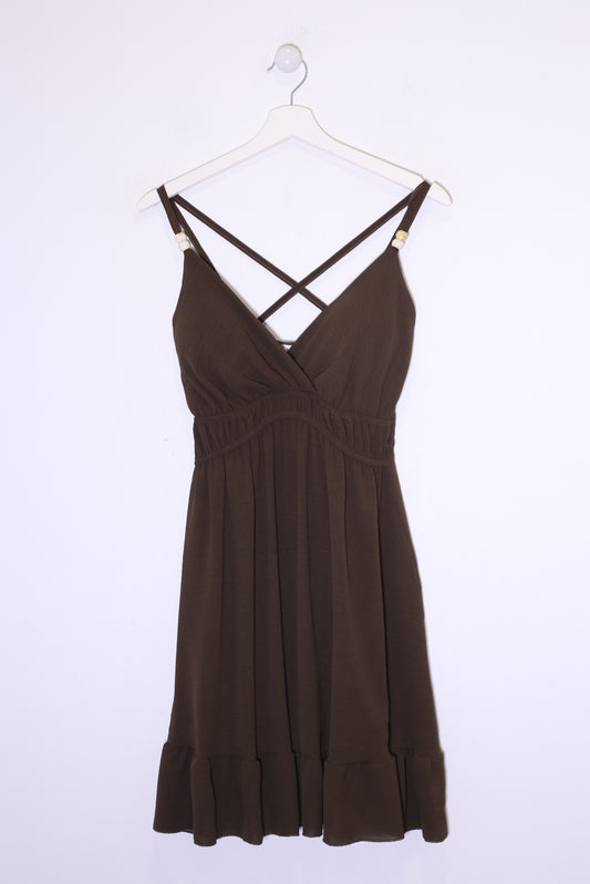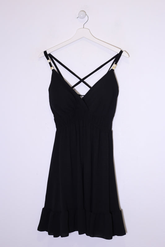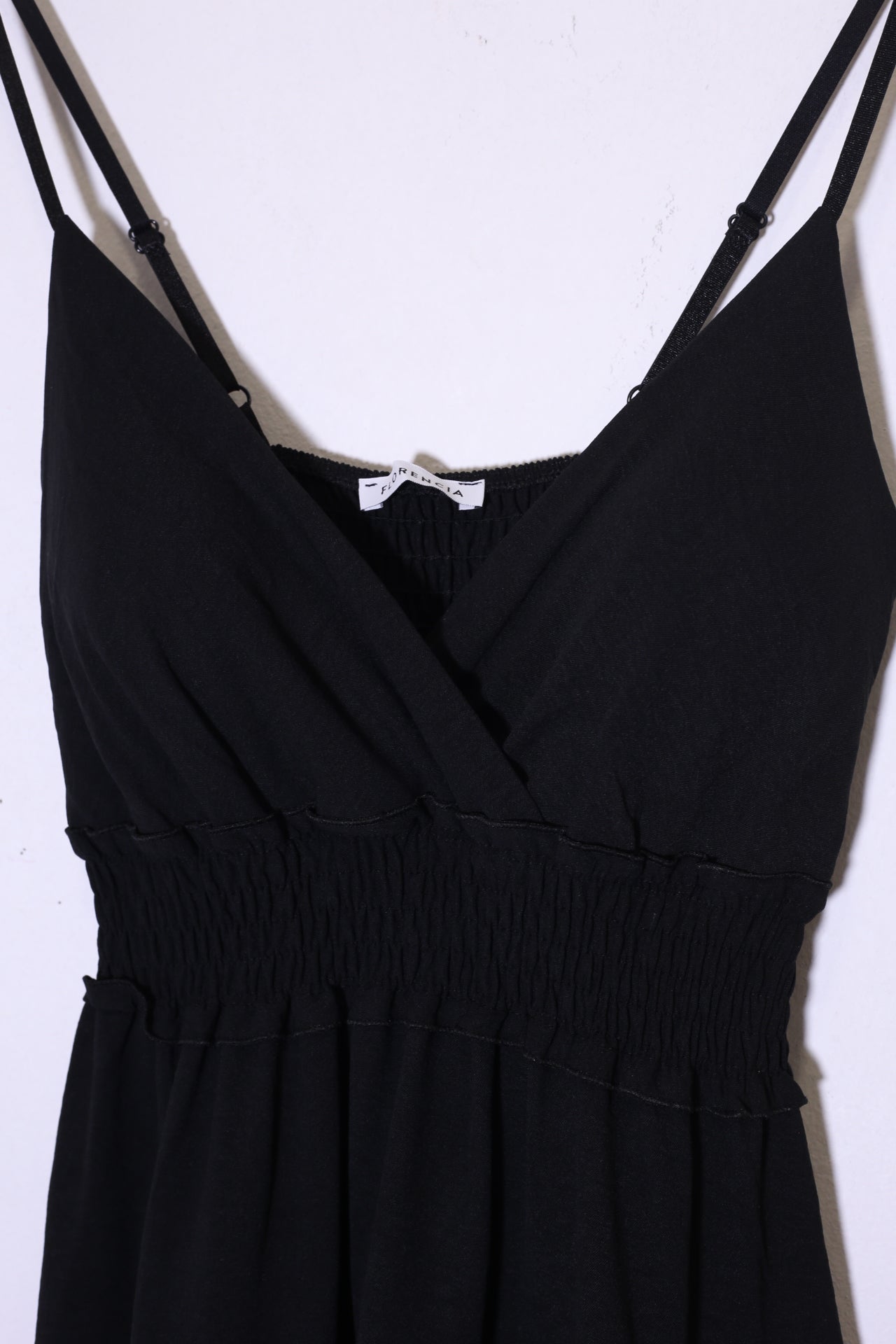 Vestido corto con escote cruzado tipo cache-cœur, tirantes finos ajustables, fruncido tipo nido de abeja bajo el pecho, falda con volantes.