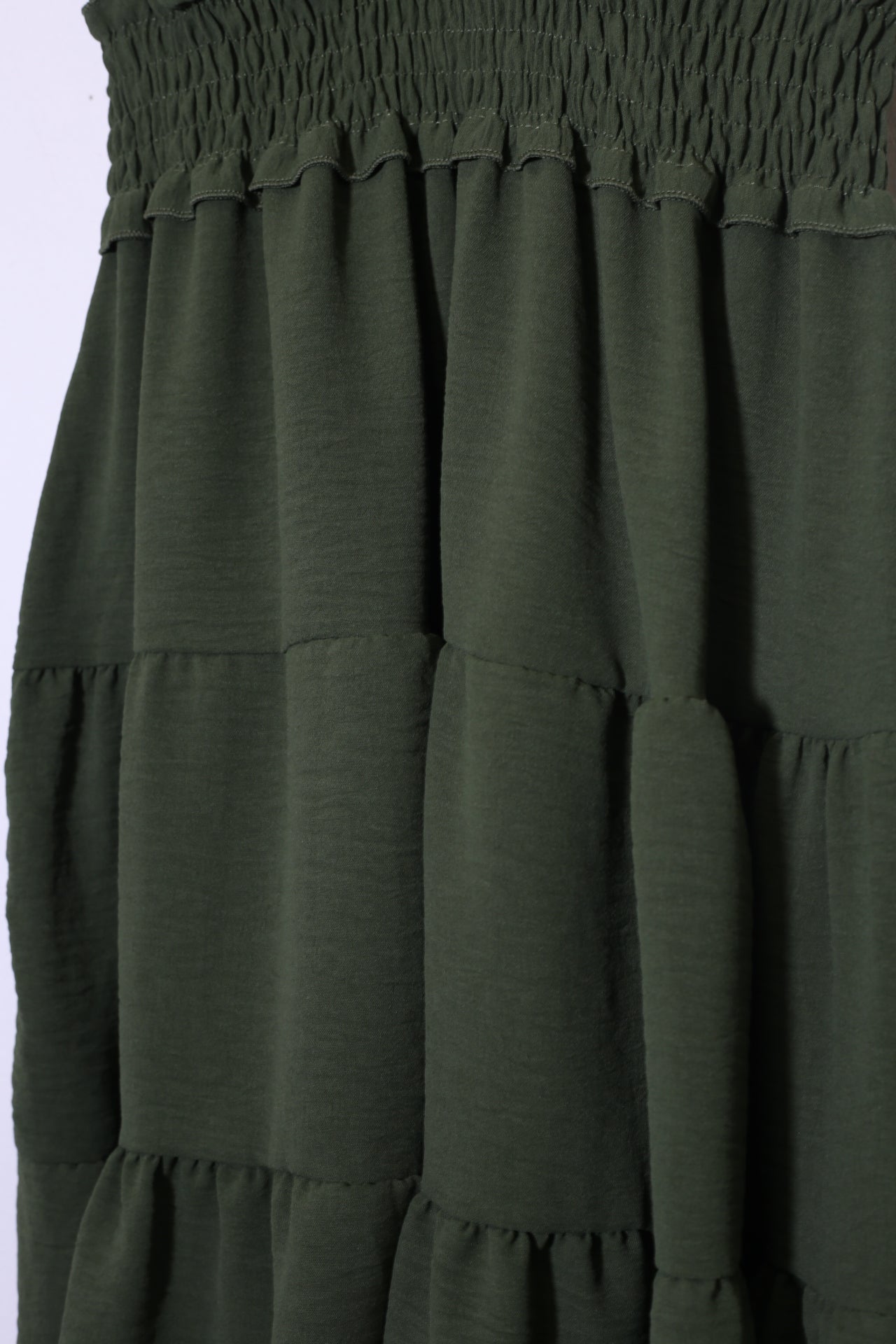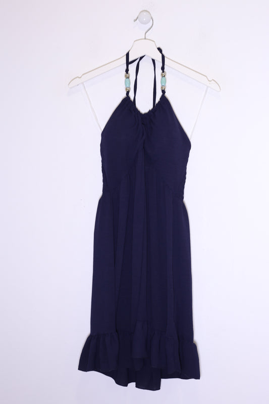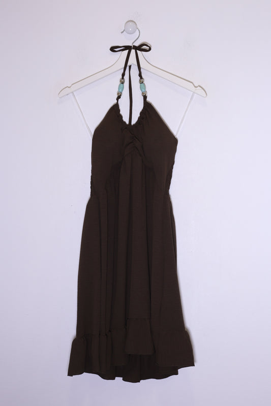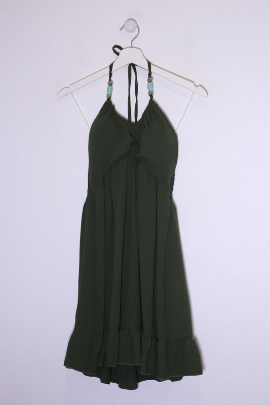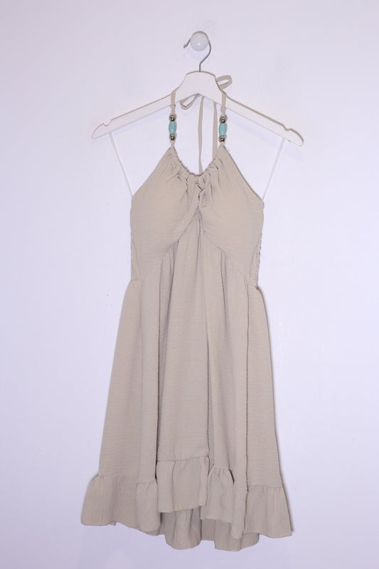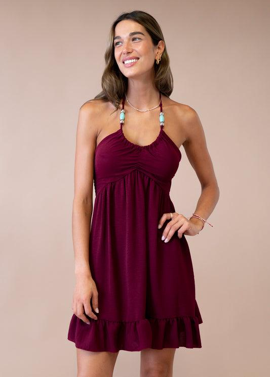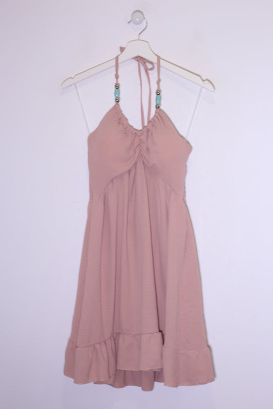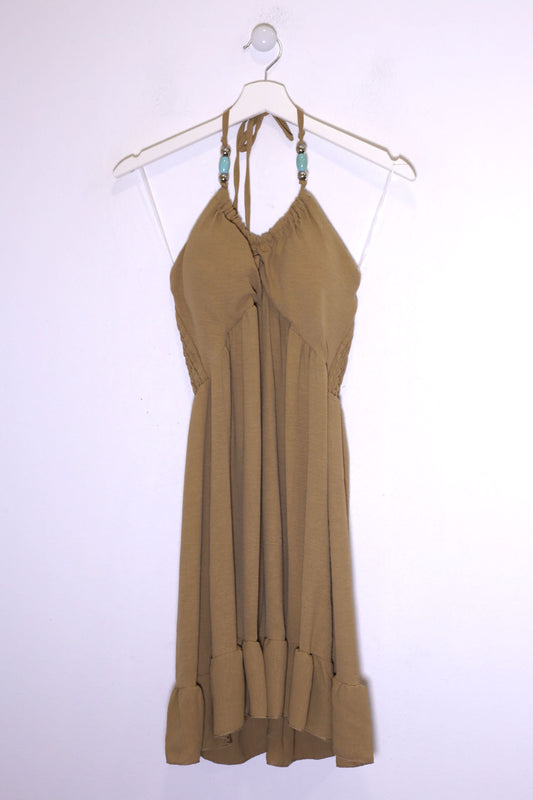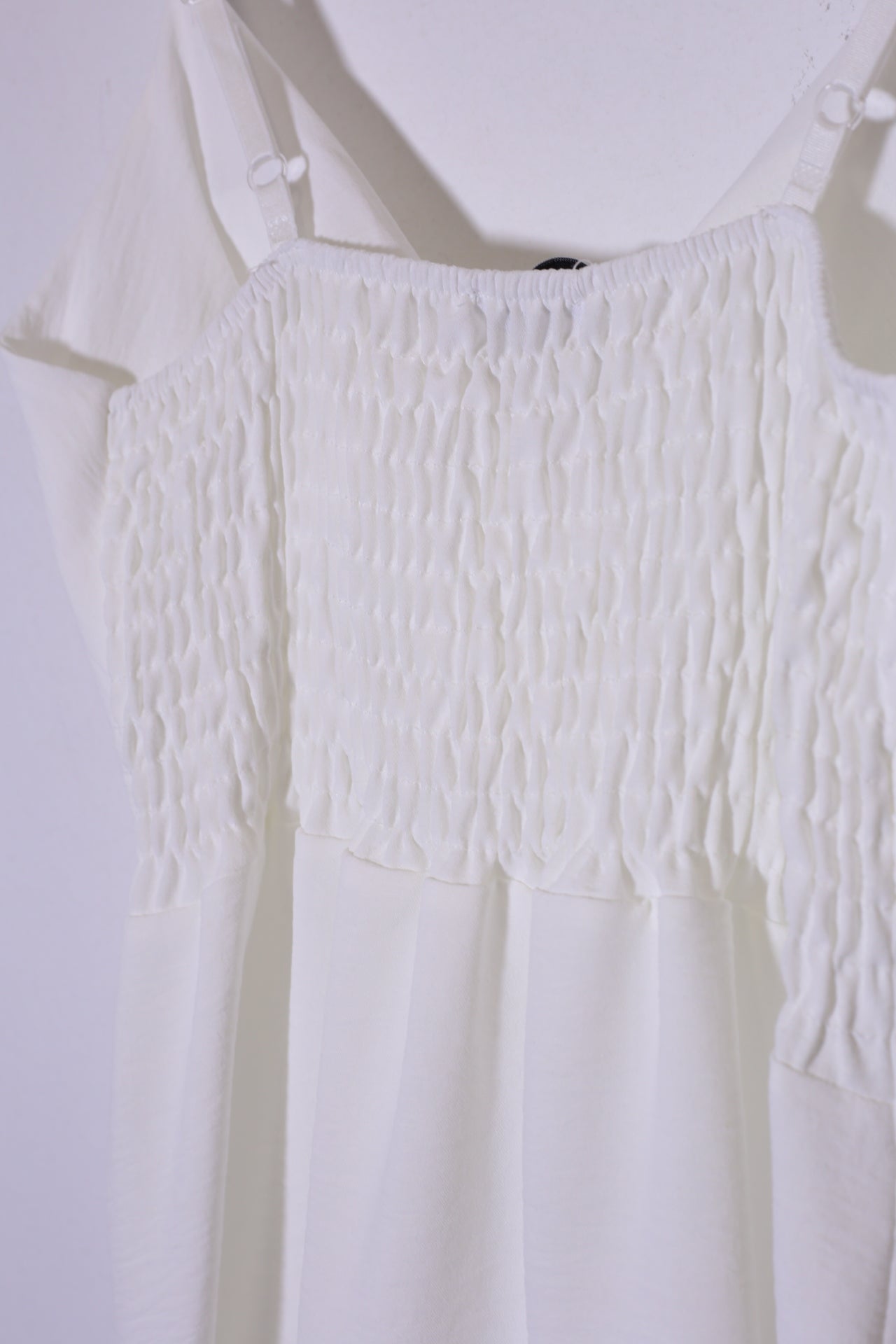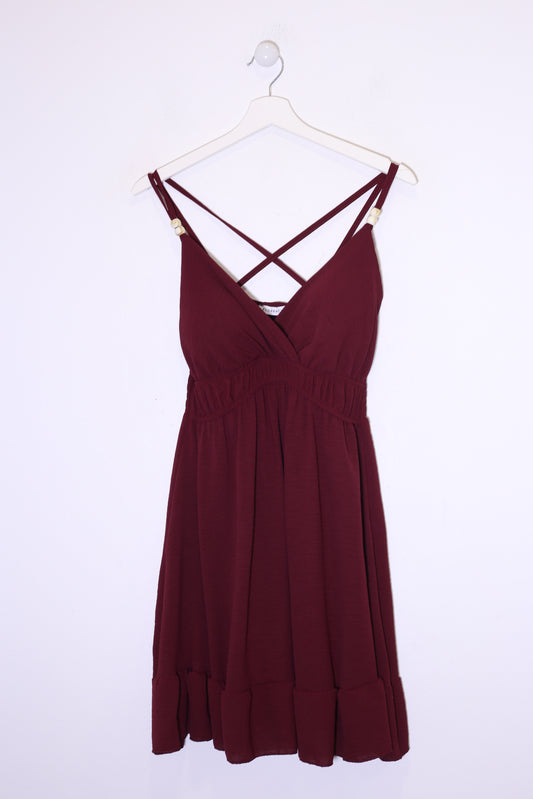 Vestido corto con escote cruzado tipo cache-cœur, tirantes finos ajustables, fruncido tipo nido de abeja bajo el pecho, falda con volantes.