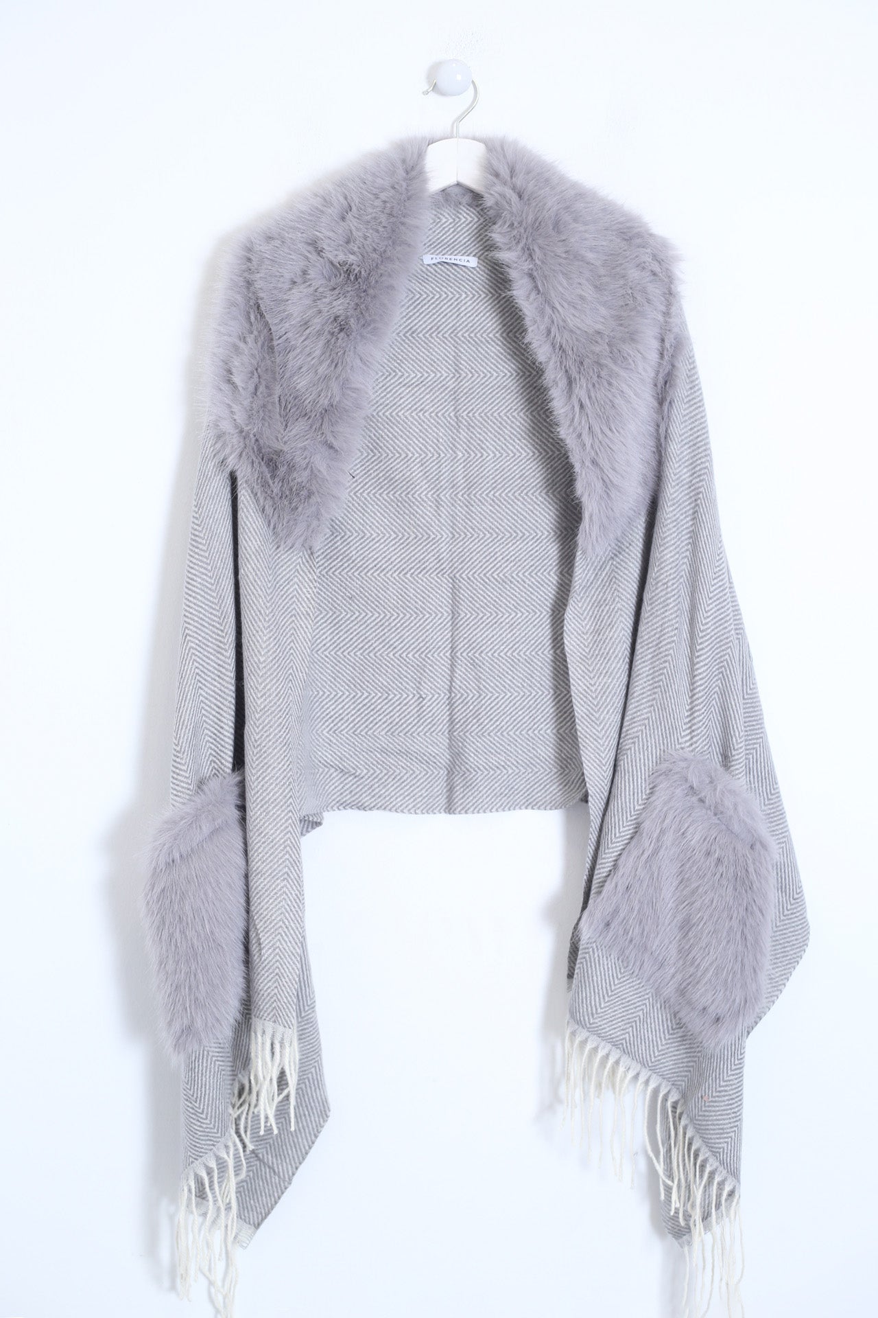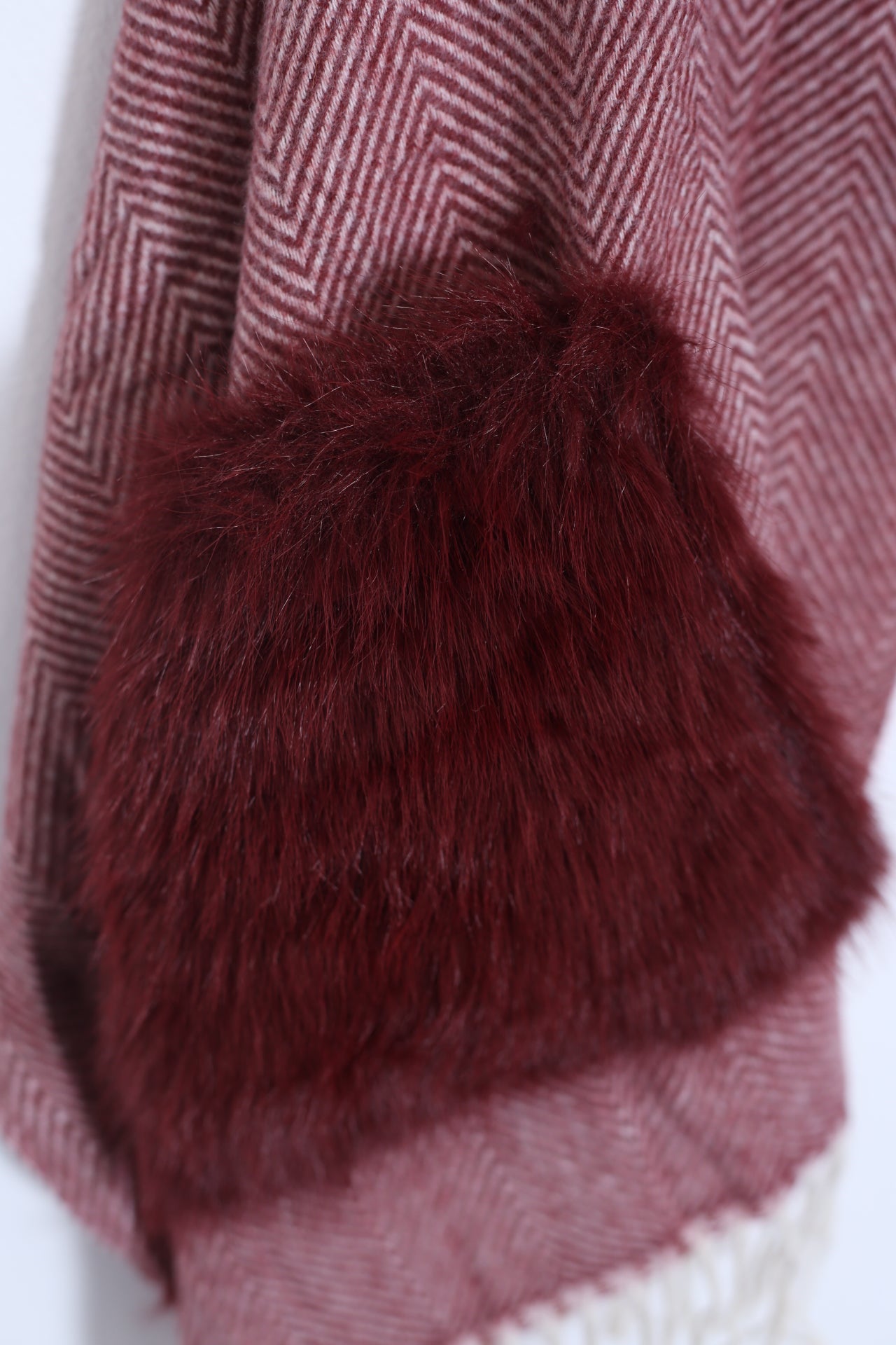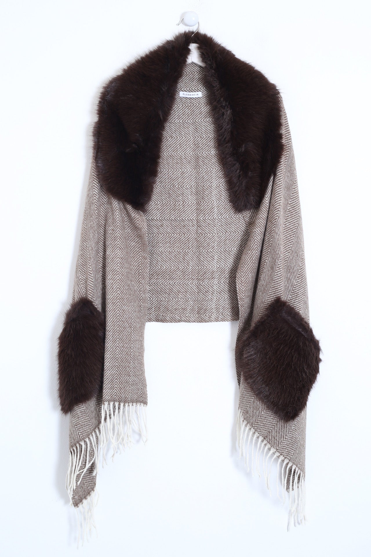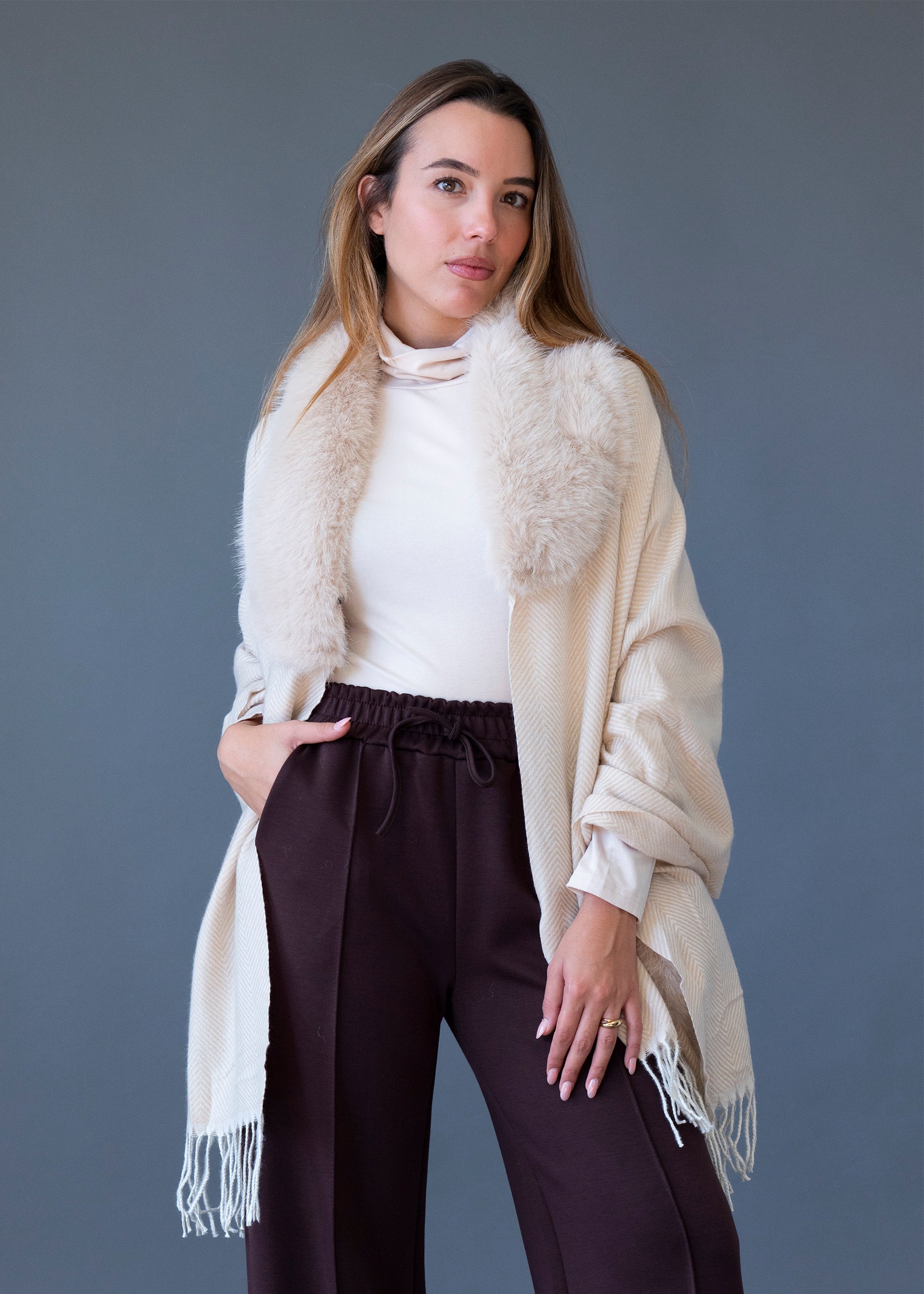 Chal con cuello solapa efecto pelo. Acabados con flecos. Tejido espiga.