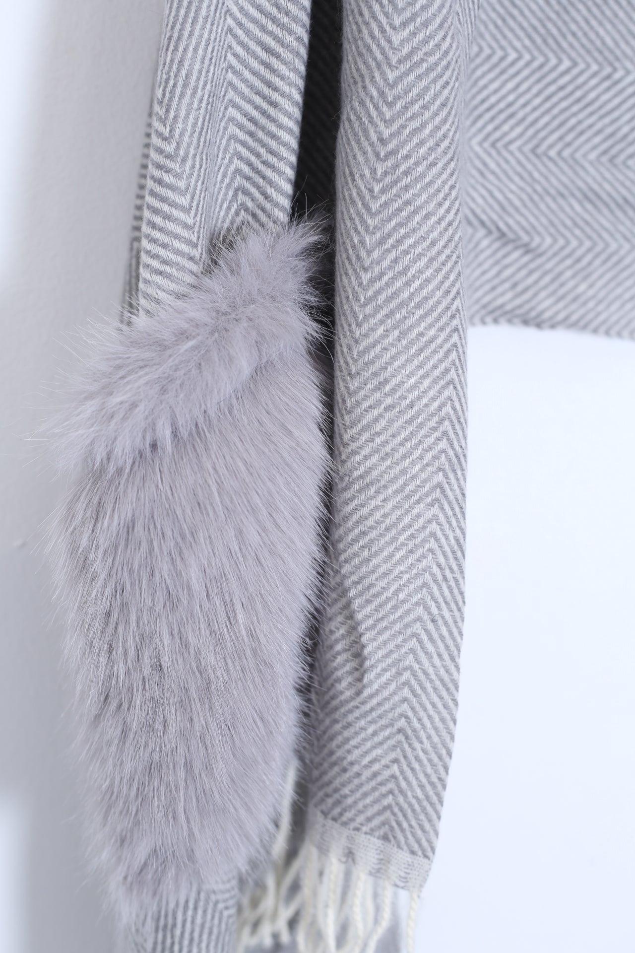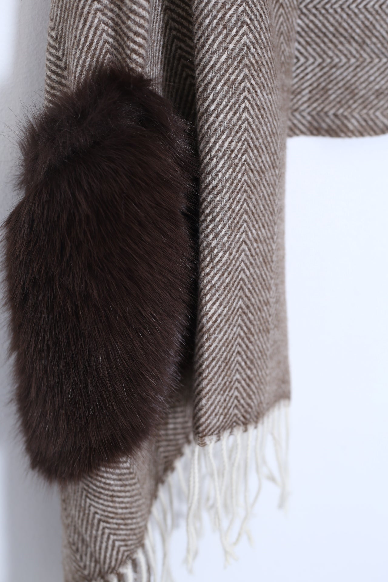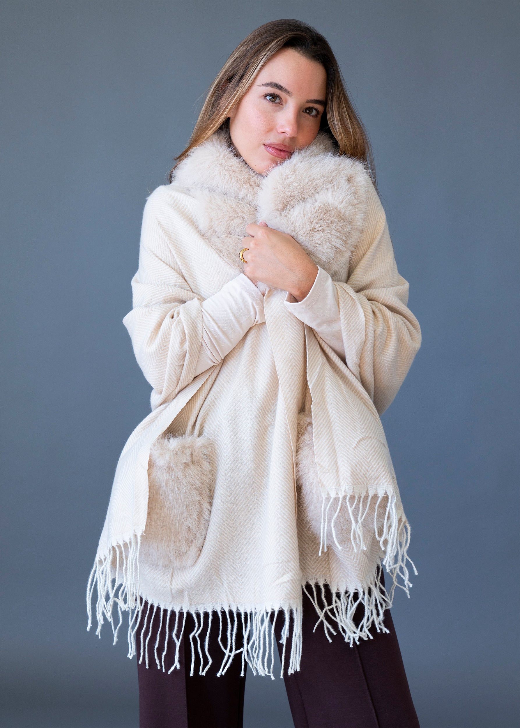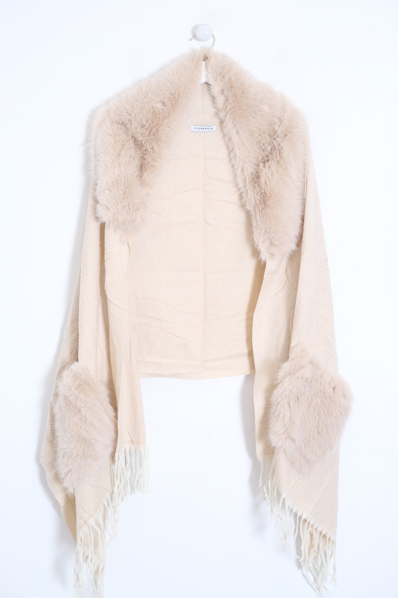 Chal con cuello solapa efecto pelo. Acabados con flecos. Tejido espiga.