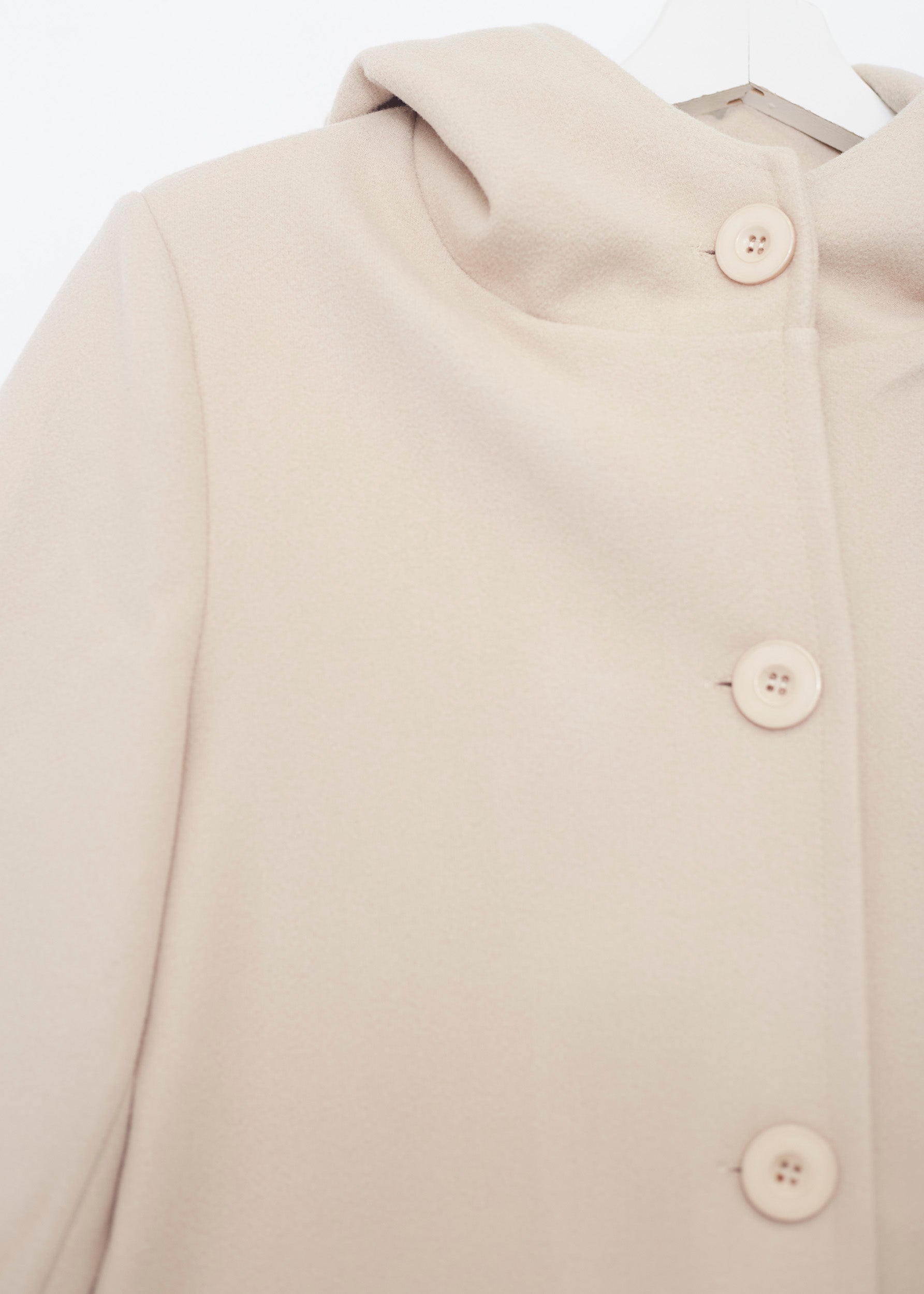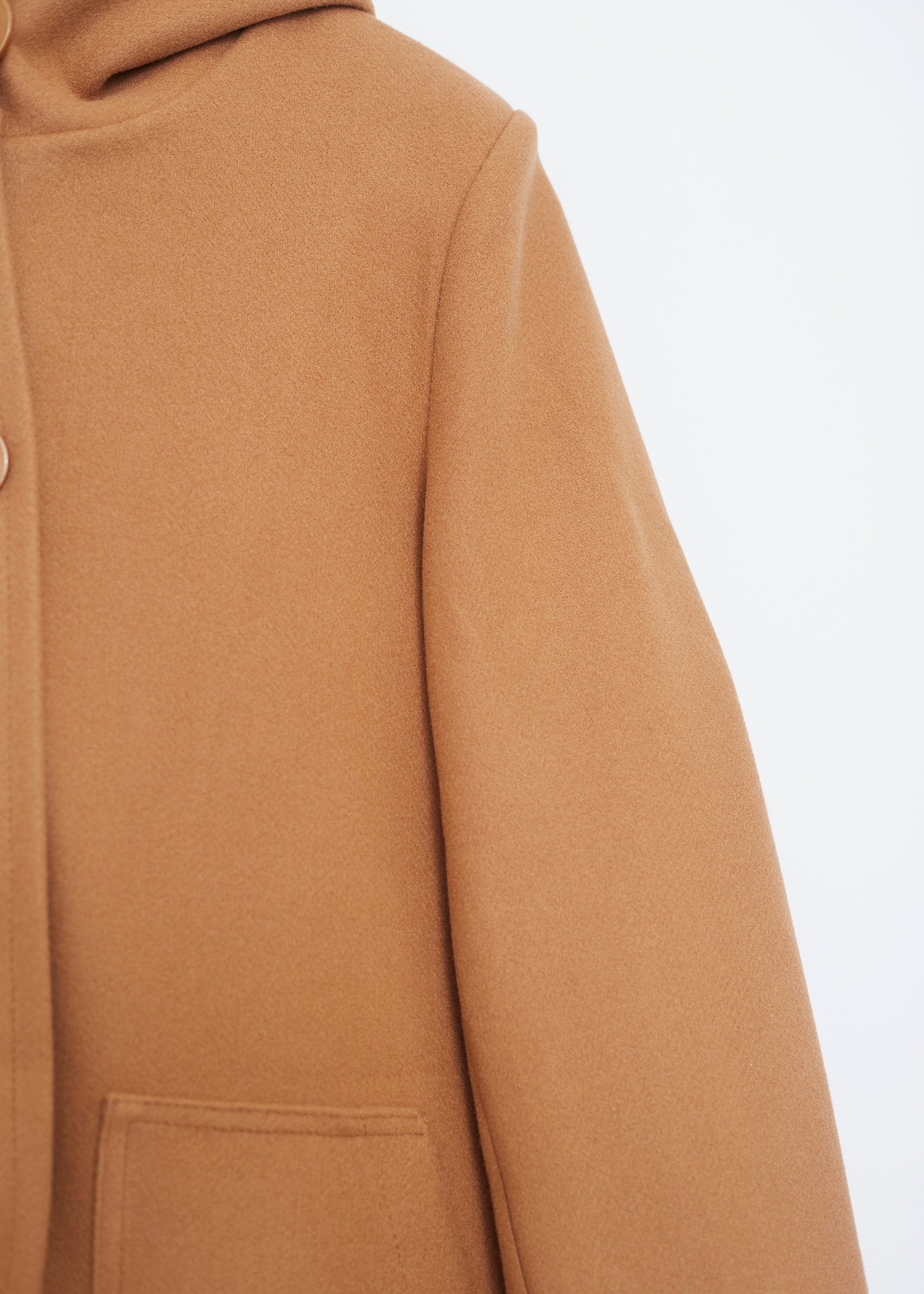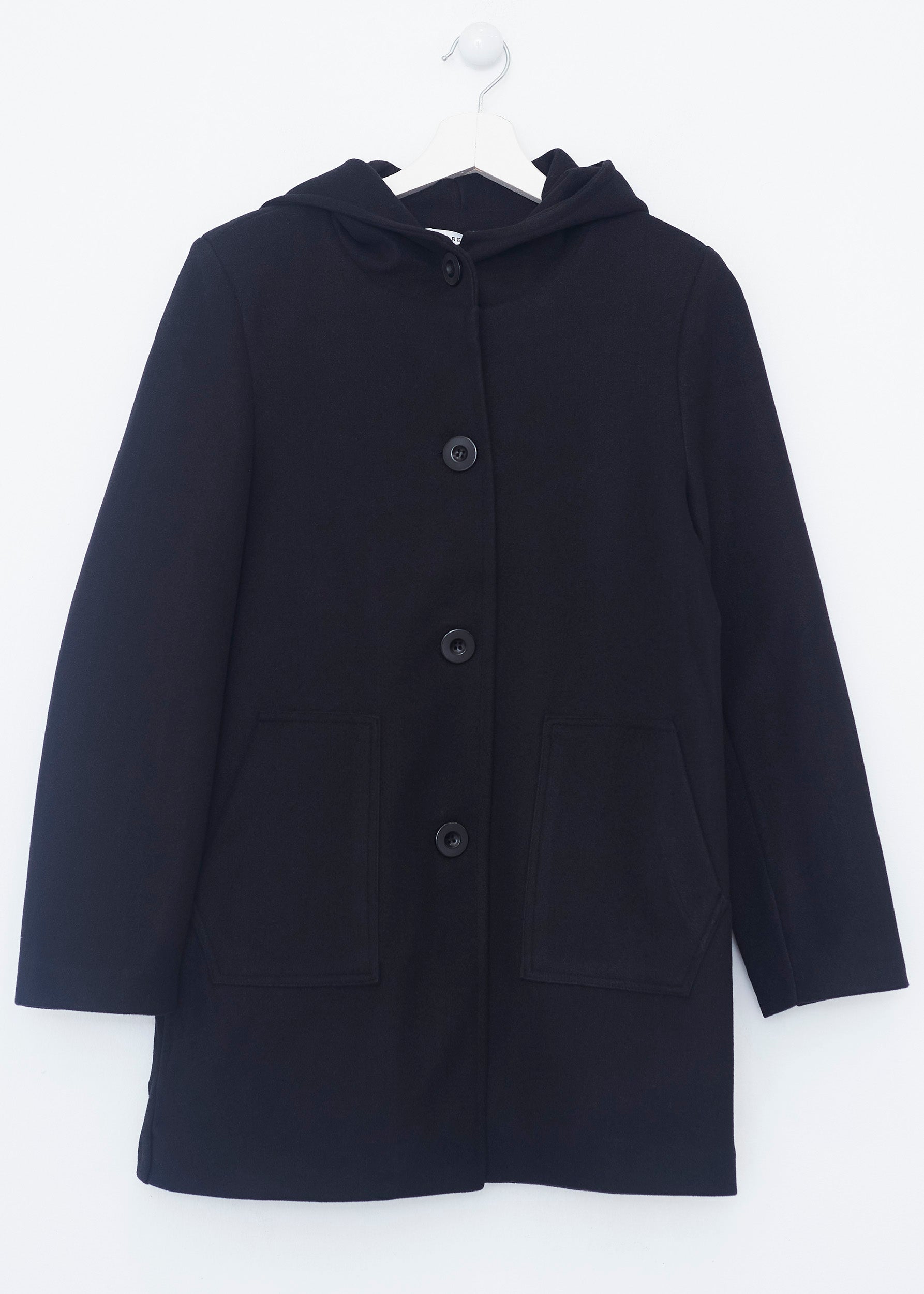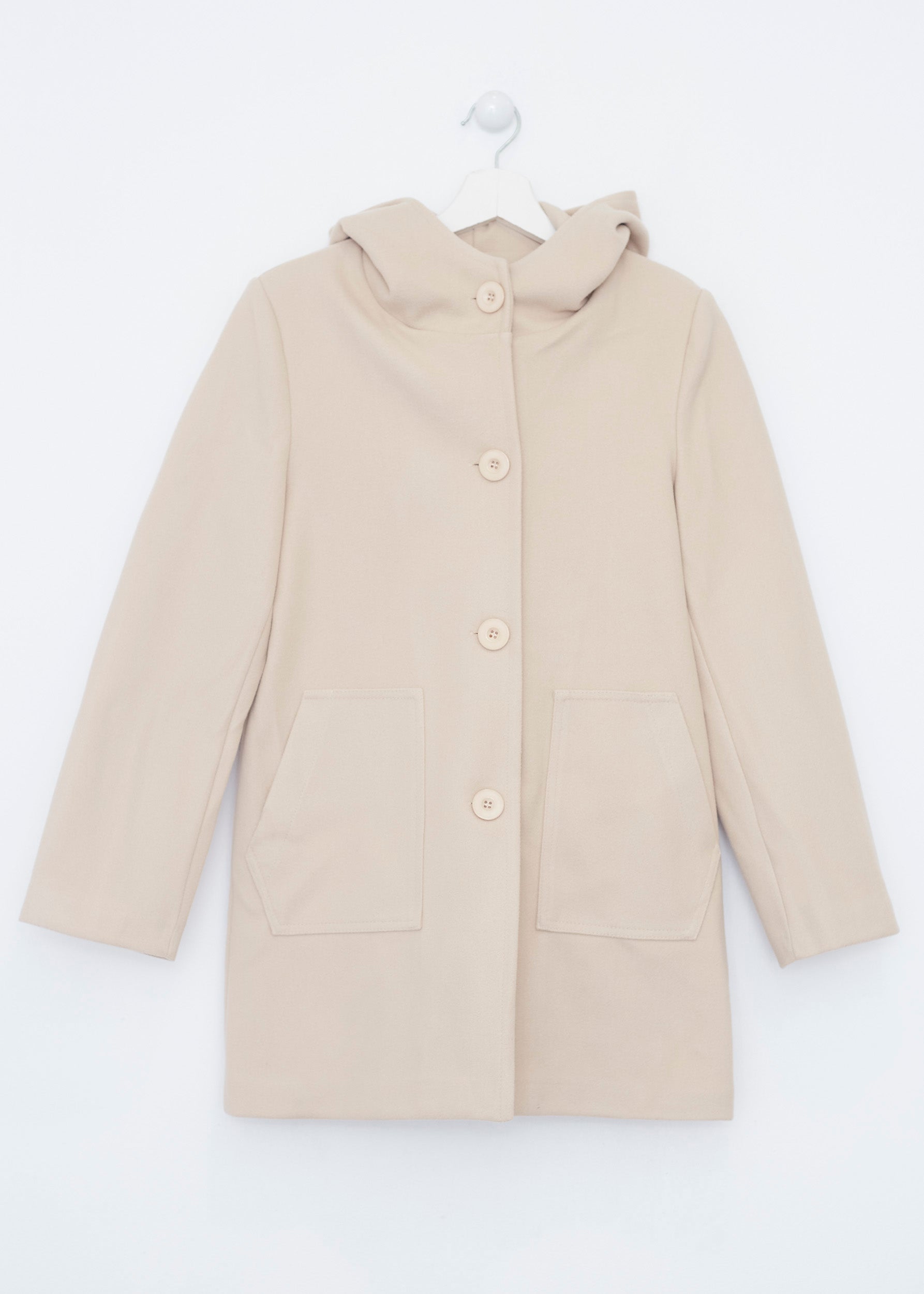 Abrigo de cuello subido con capucha y manga larga. Cierre frontal abotonado. Bolsillos frontales de plastrón. Forro interior. Corte recto.