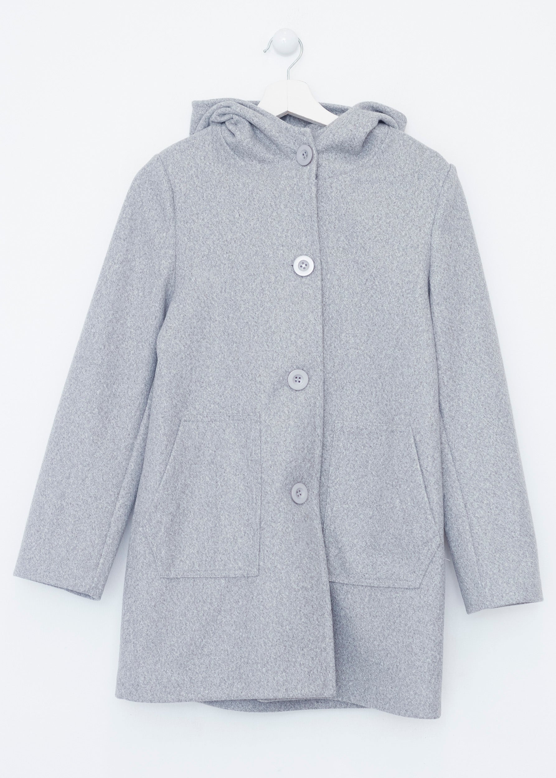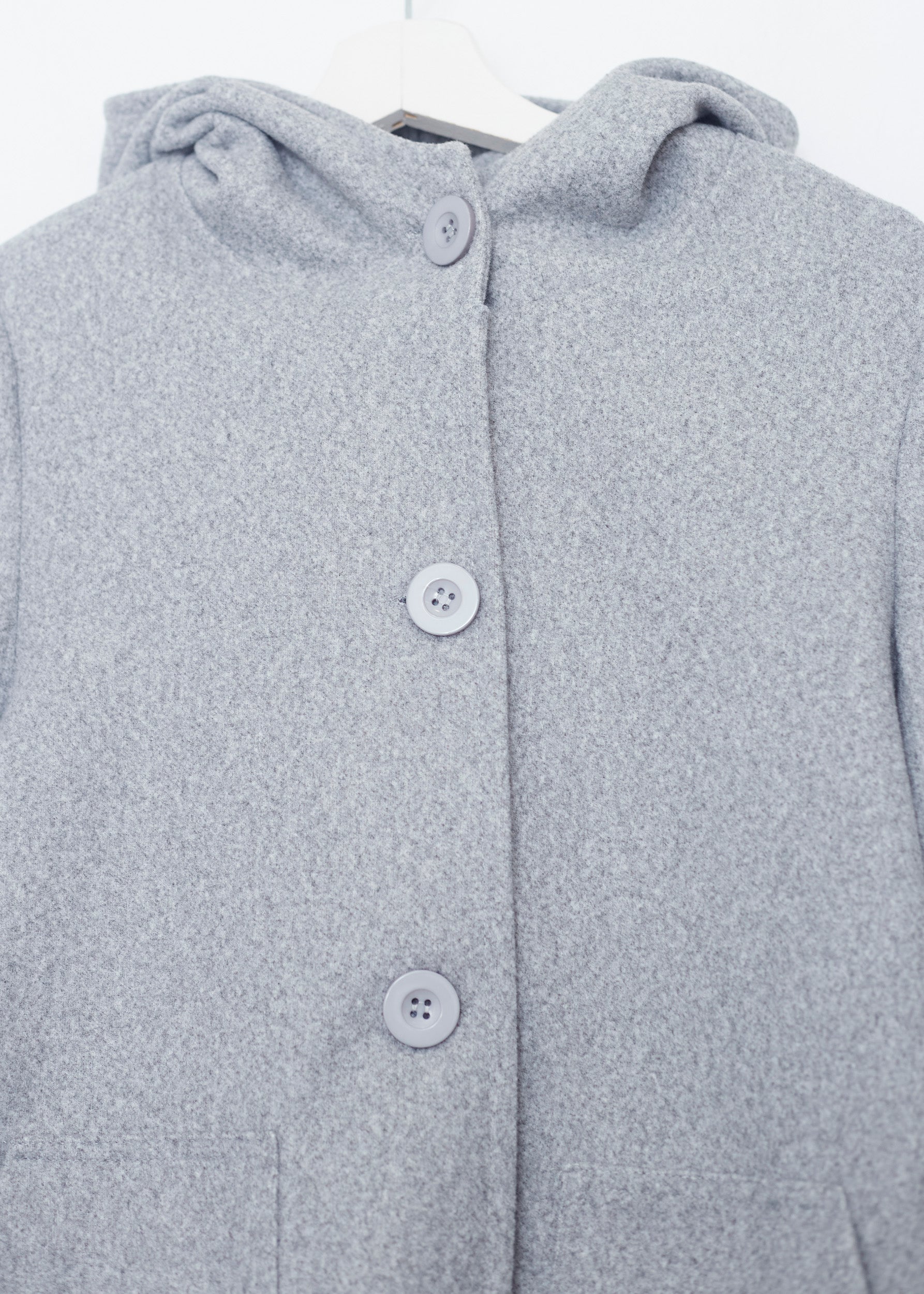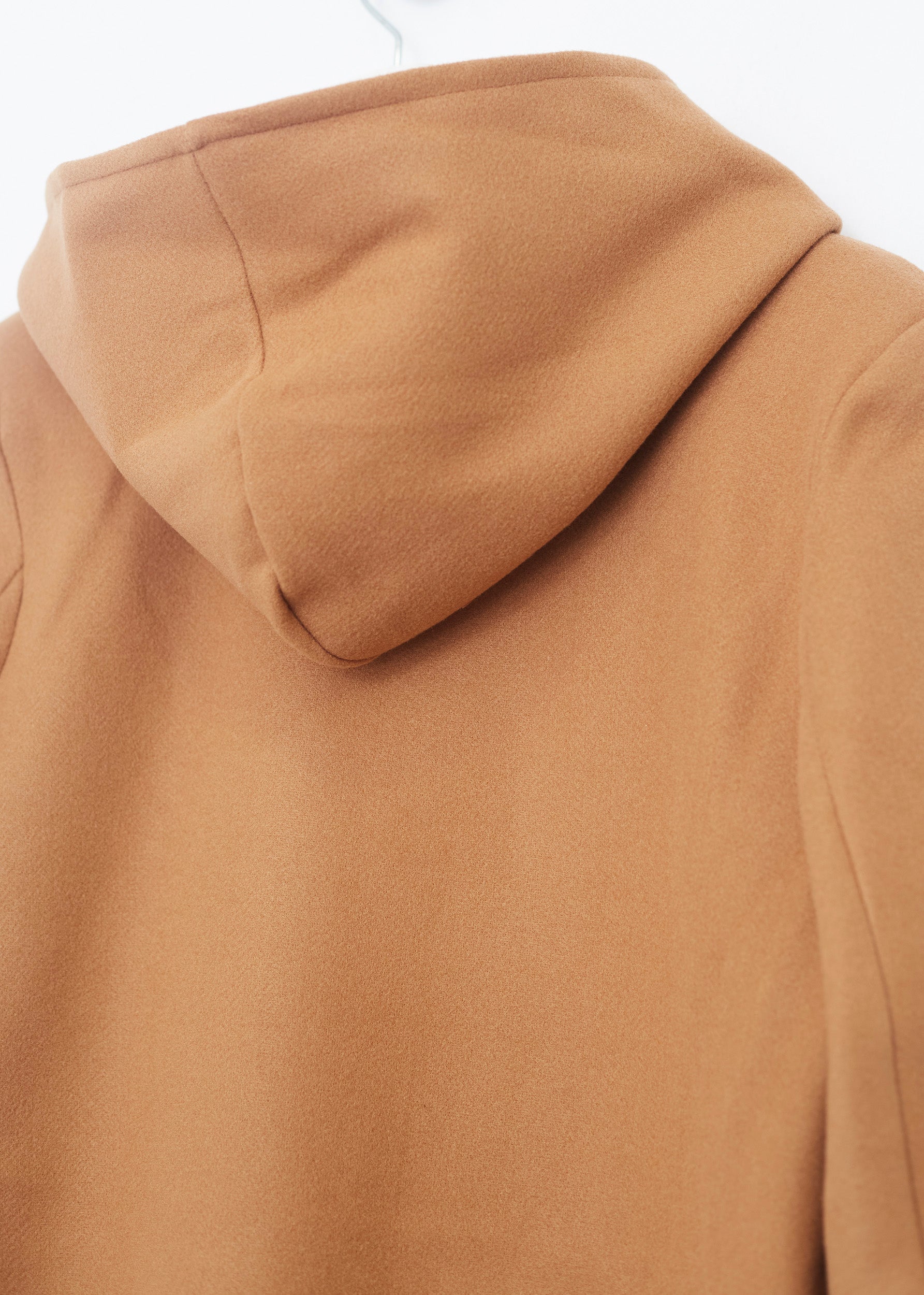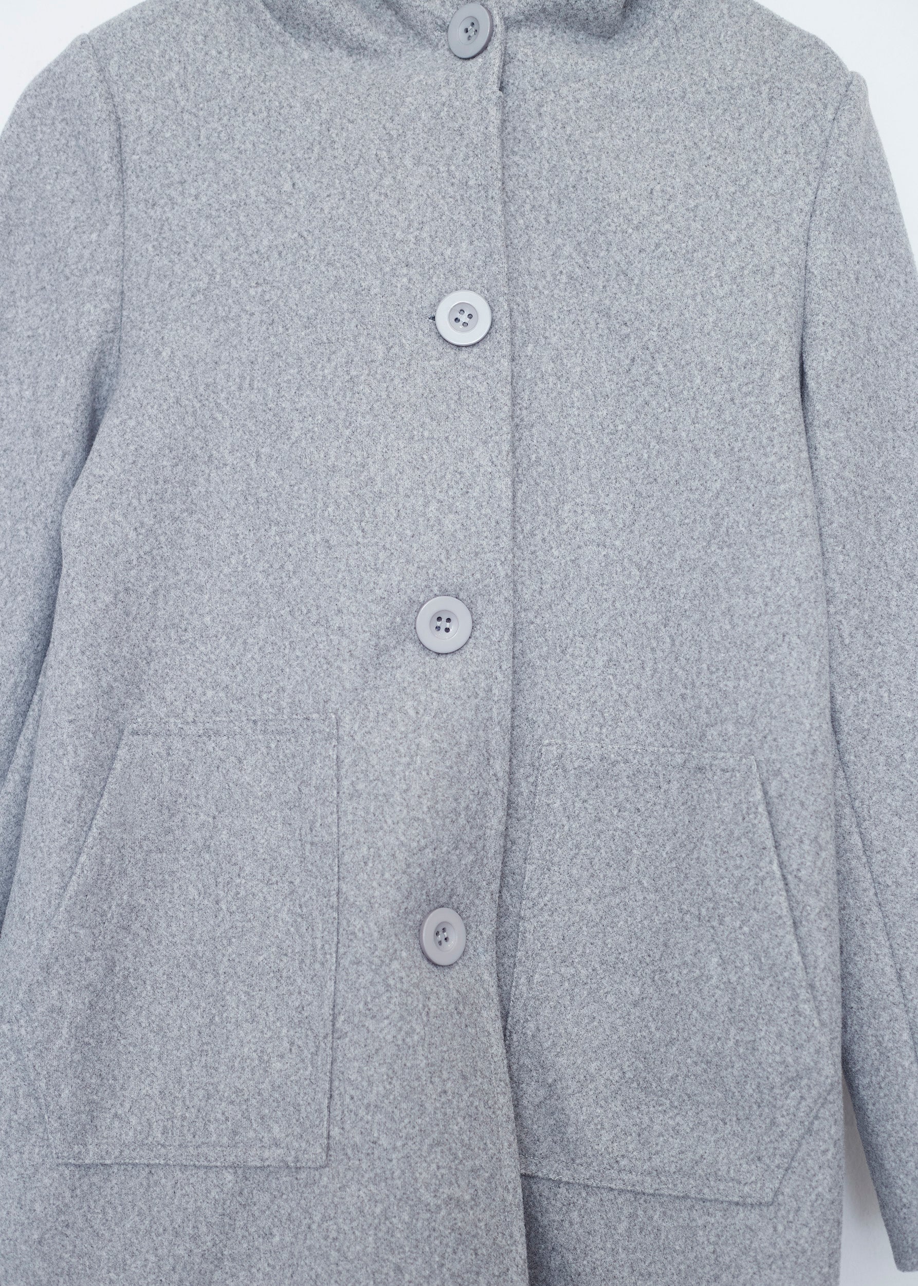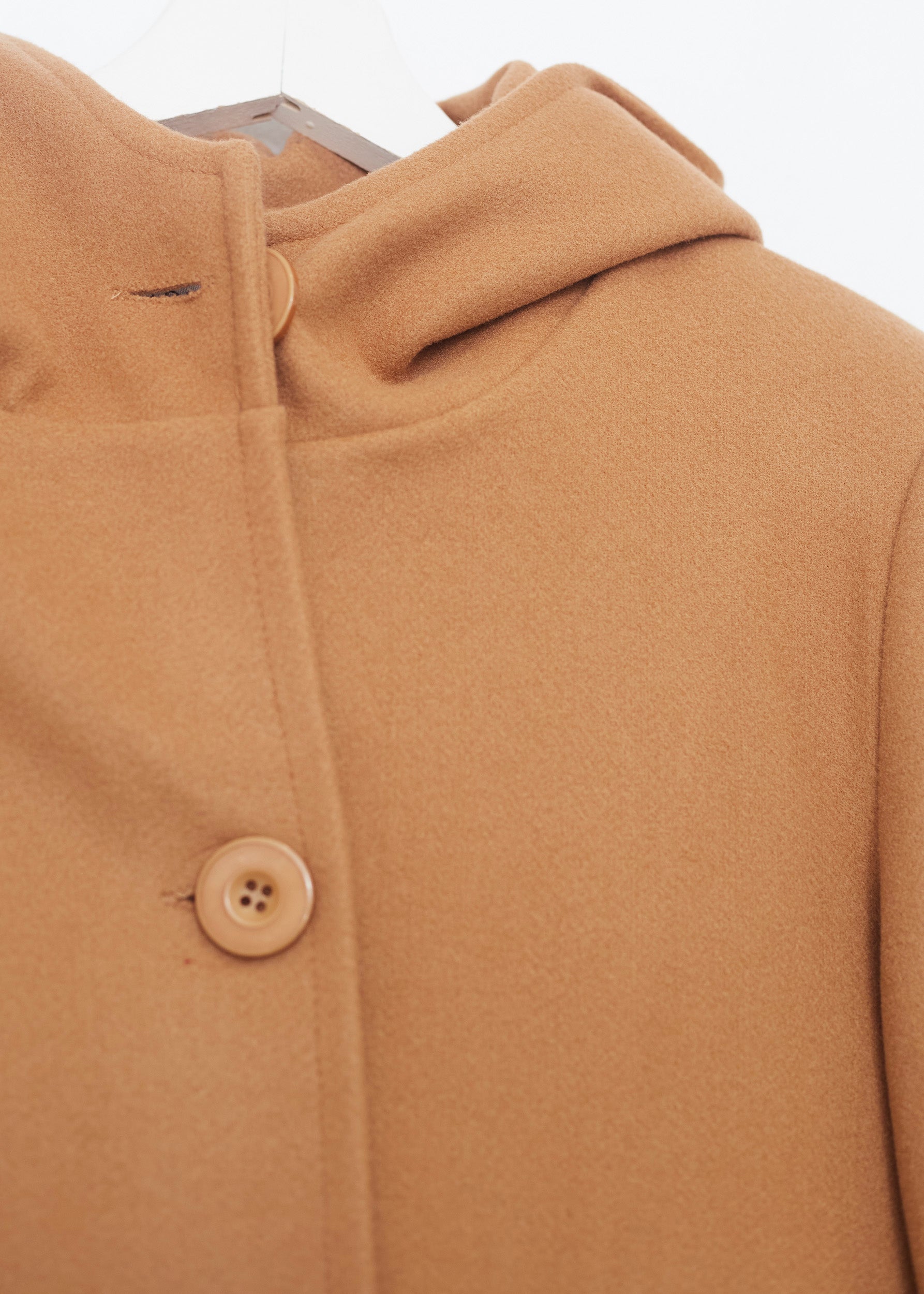 Abrigo de cuello subido con capucha y manga larga. Cierre frontal abotonado. Bolsillos frontales de plastrón. Forro interior. Corte recto.