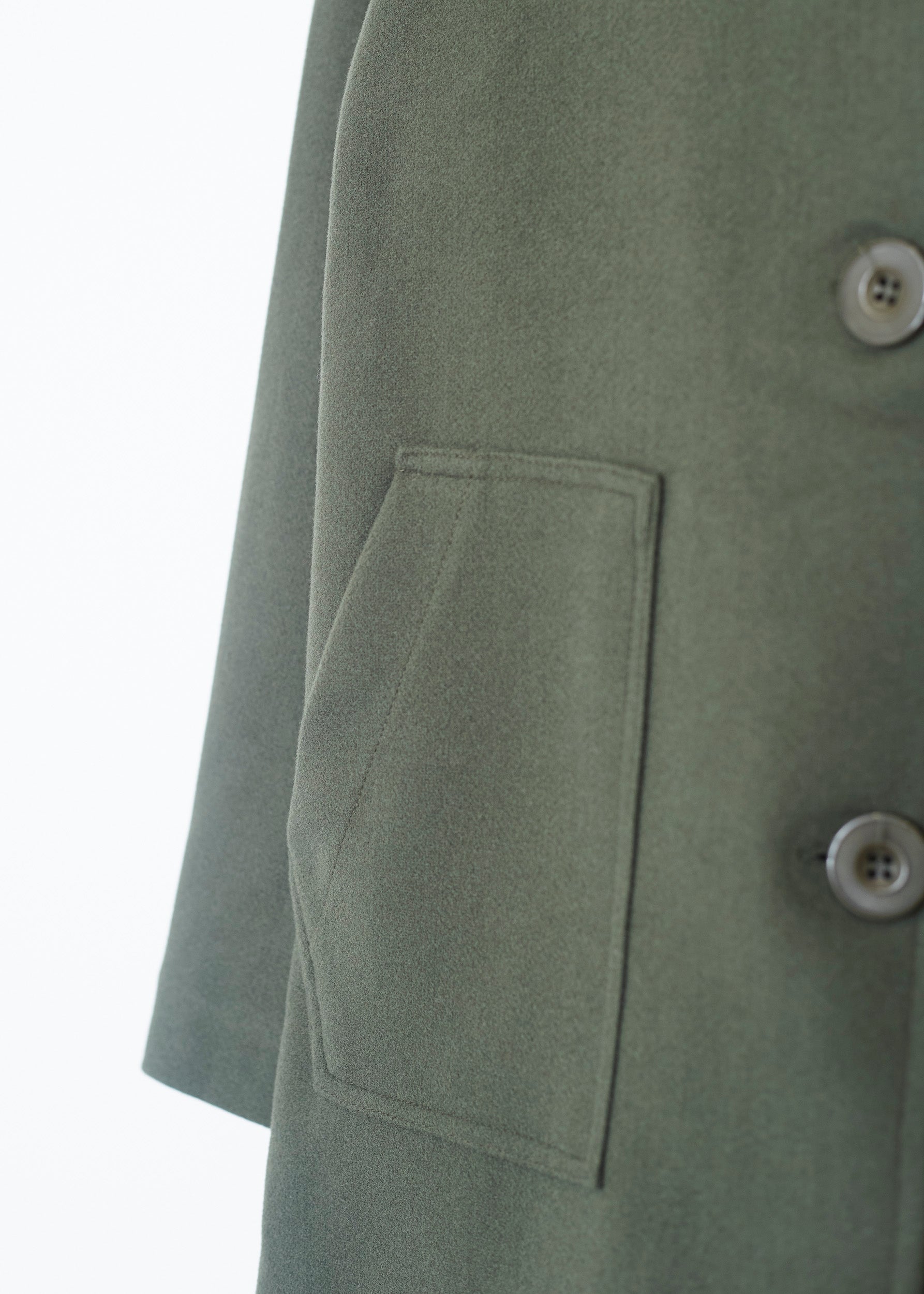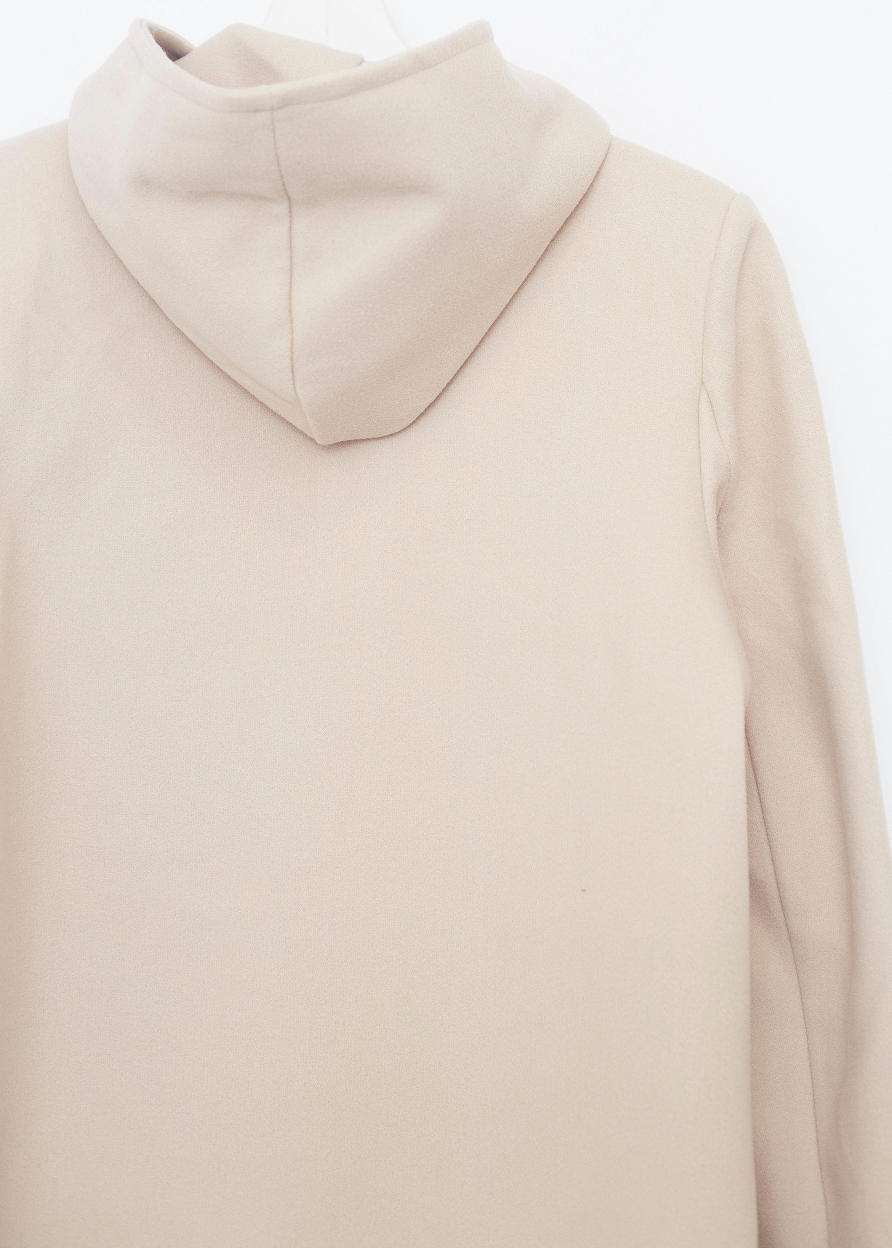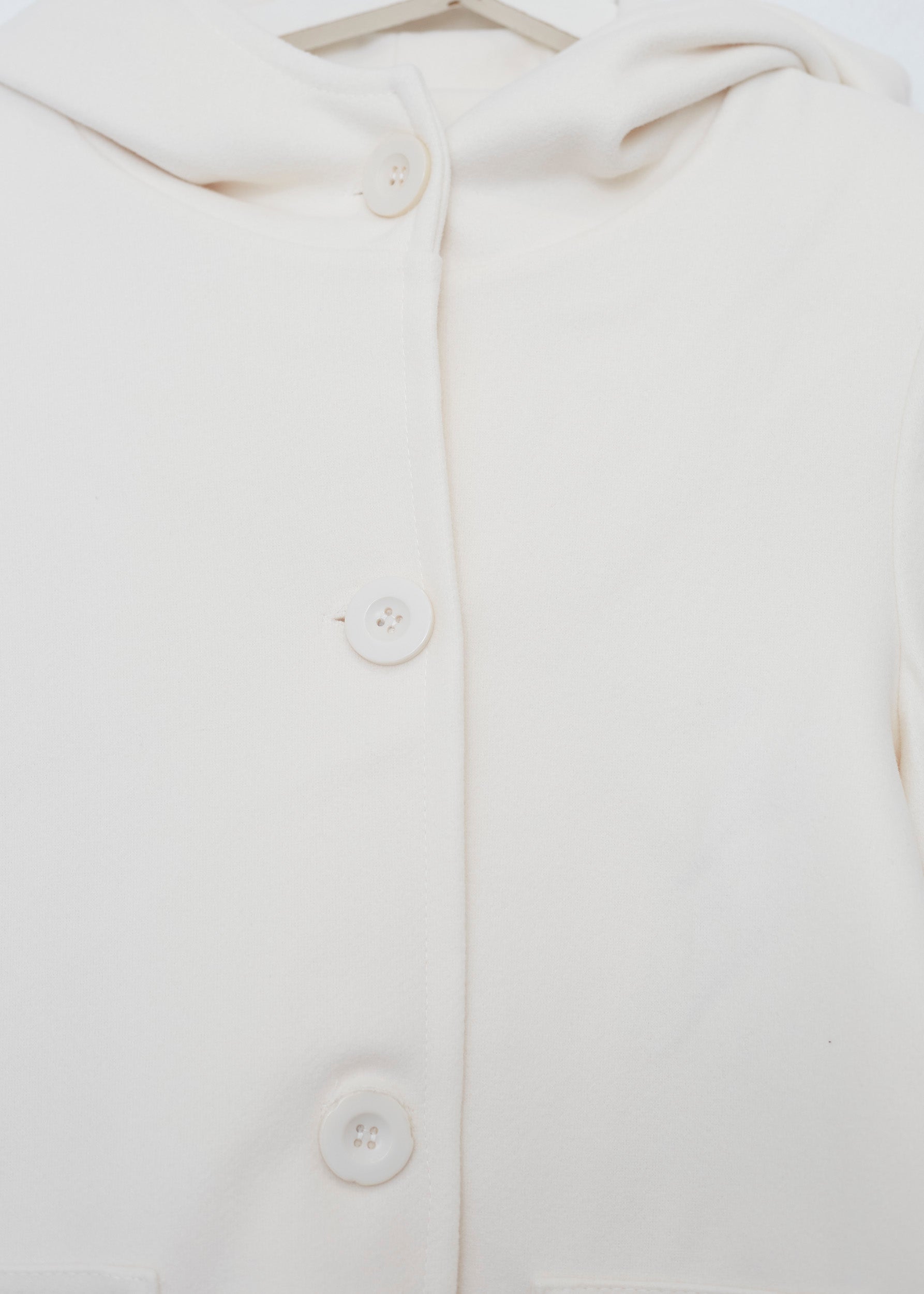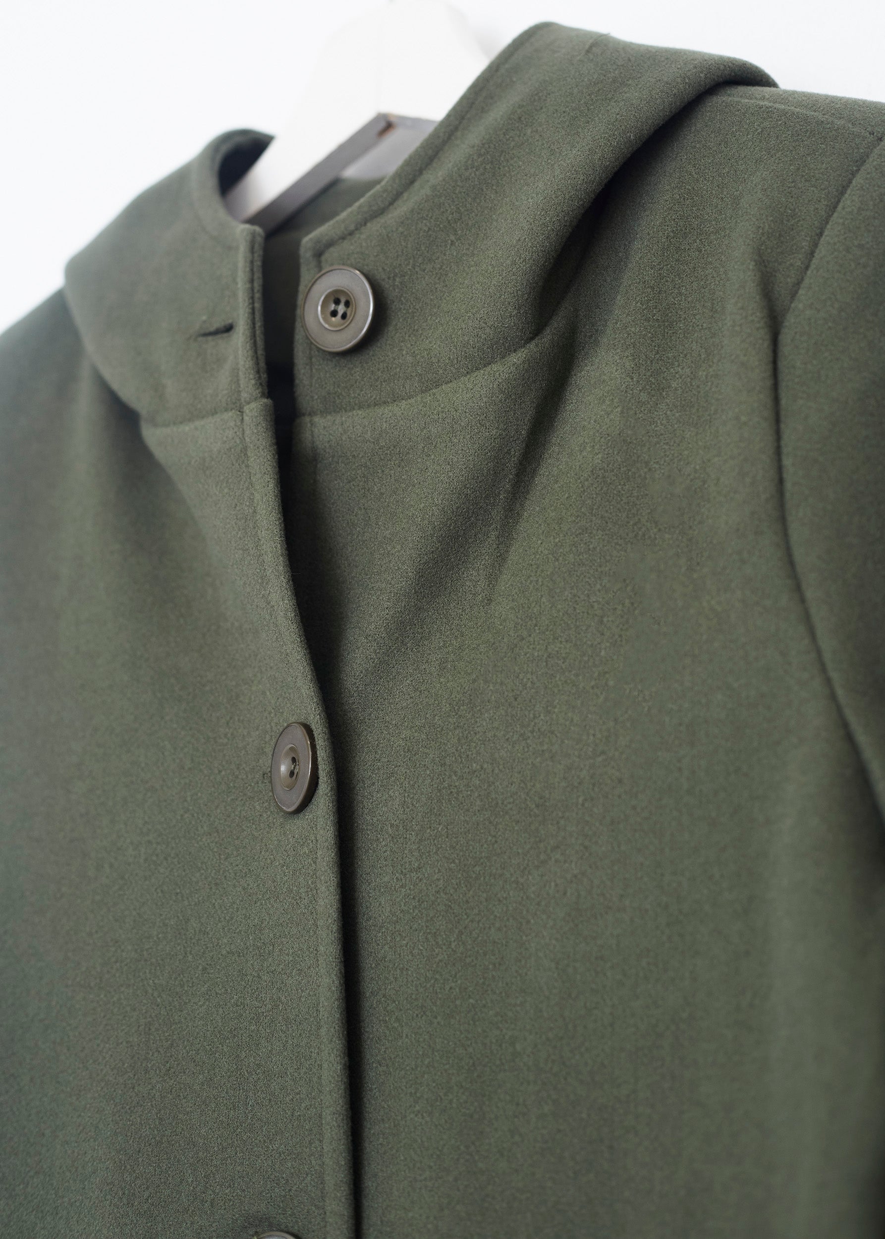 Abrigo de cuello subido con capucha y manga larga. Cierre frontal abotonado. Bolsillos frontales de plastrón. Forro interior. Corte recto.