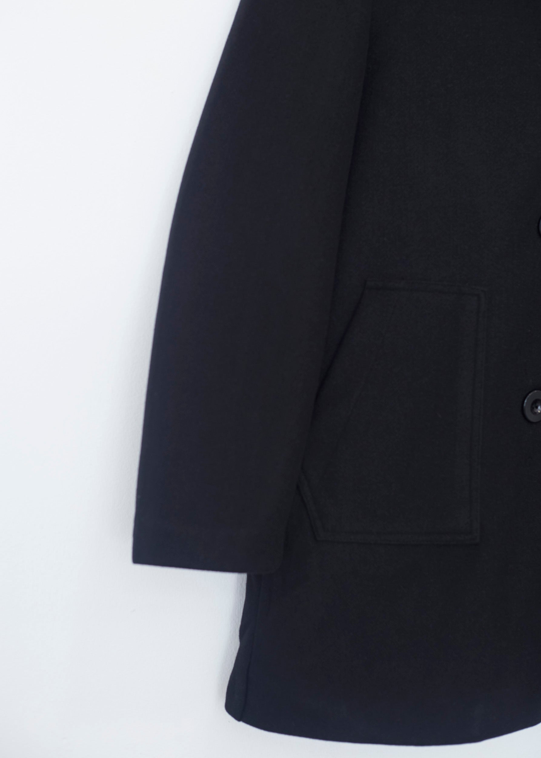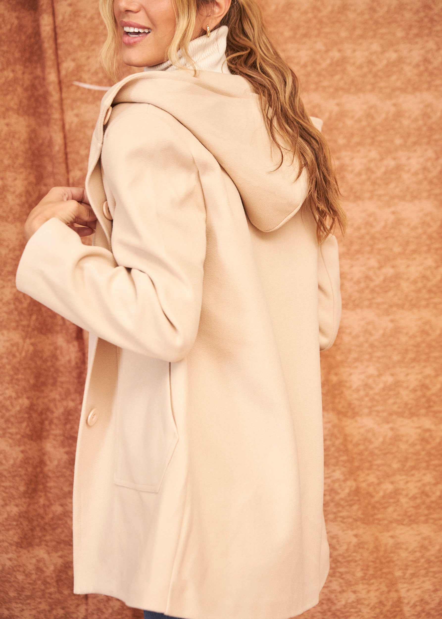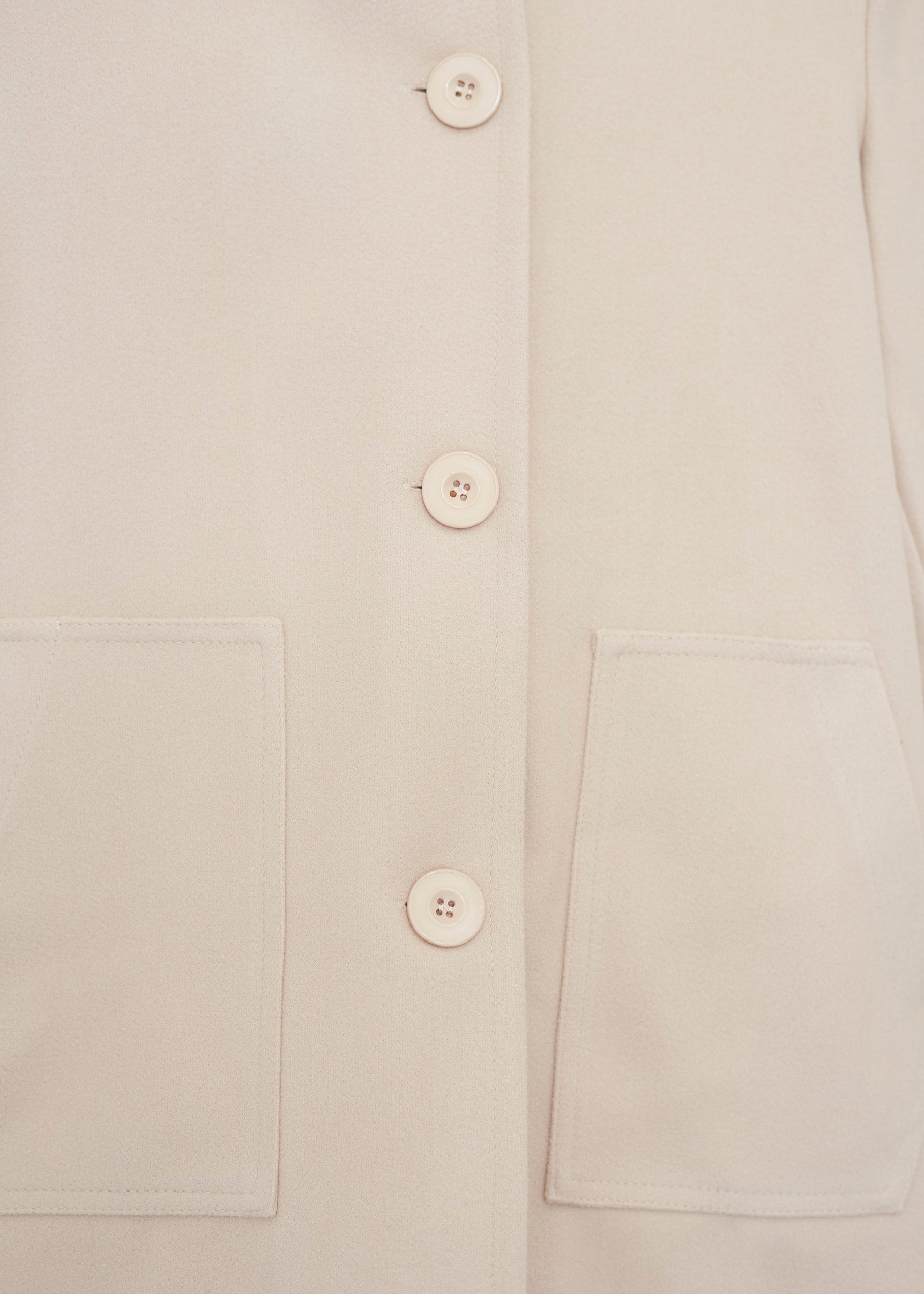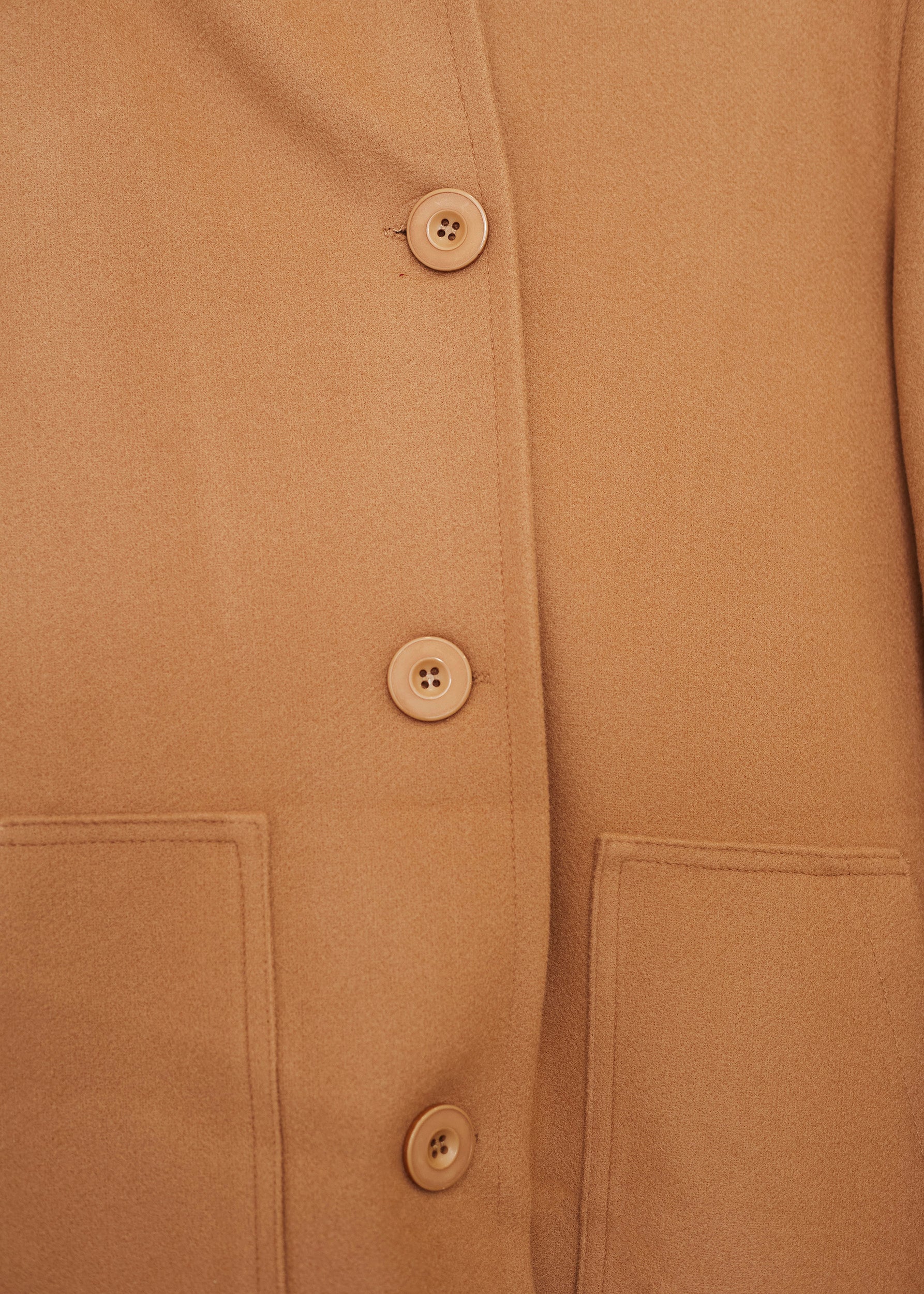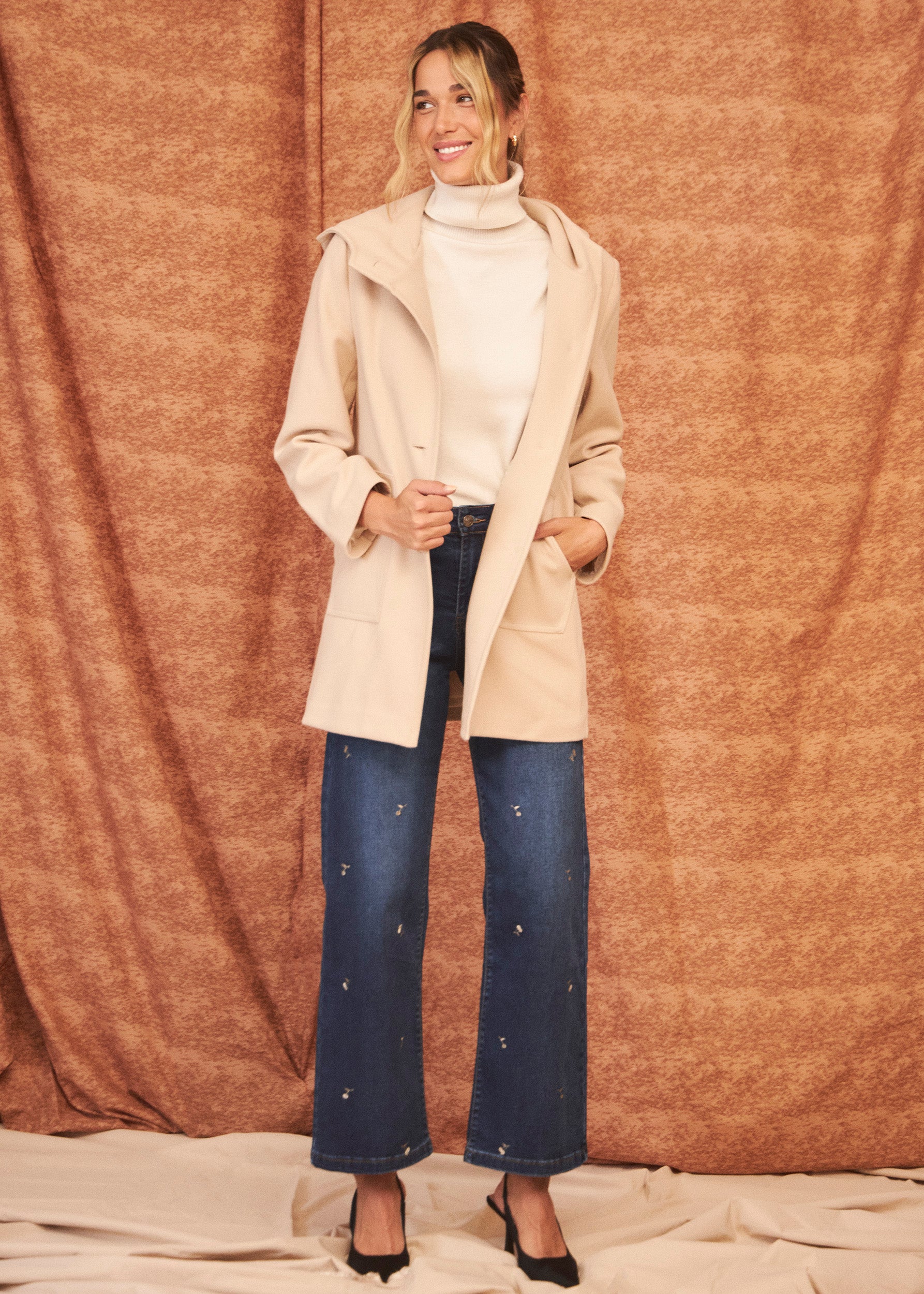 Abrigo de cuello subido con capucha y manga larga. Cierre frontal abotonado. Bolsillos frontales de plastrón. Forro interior. Corte recto.