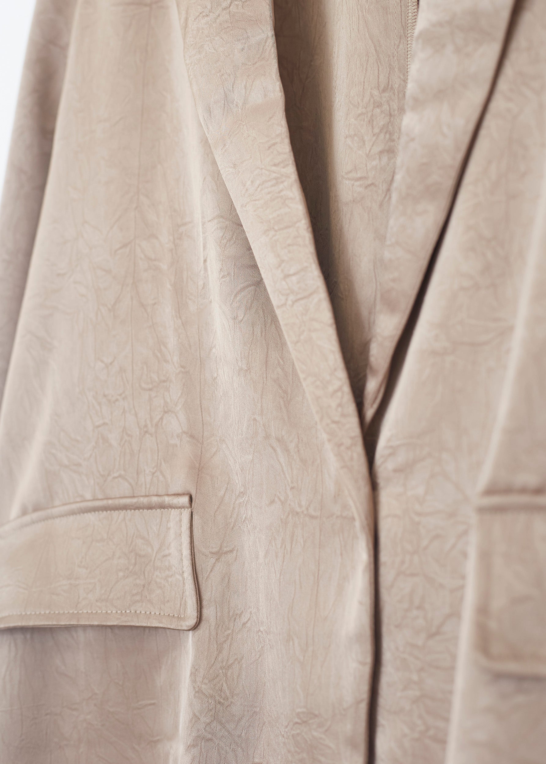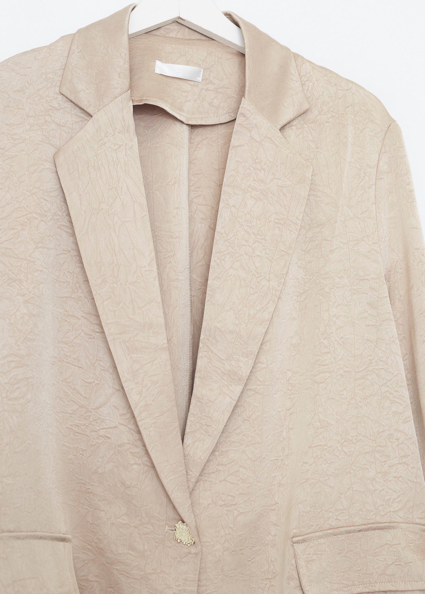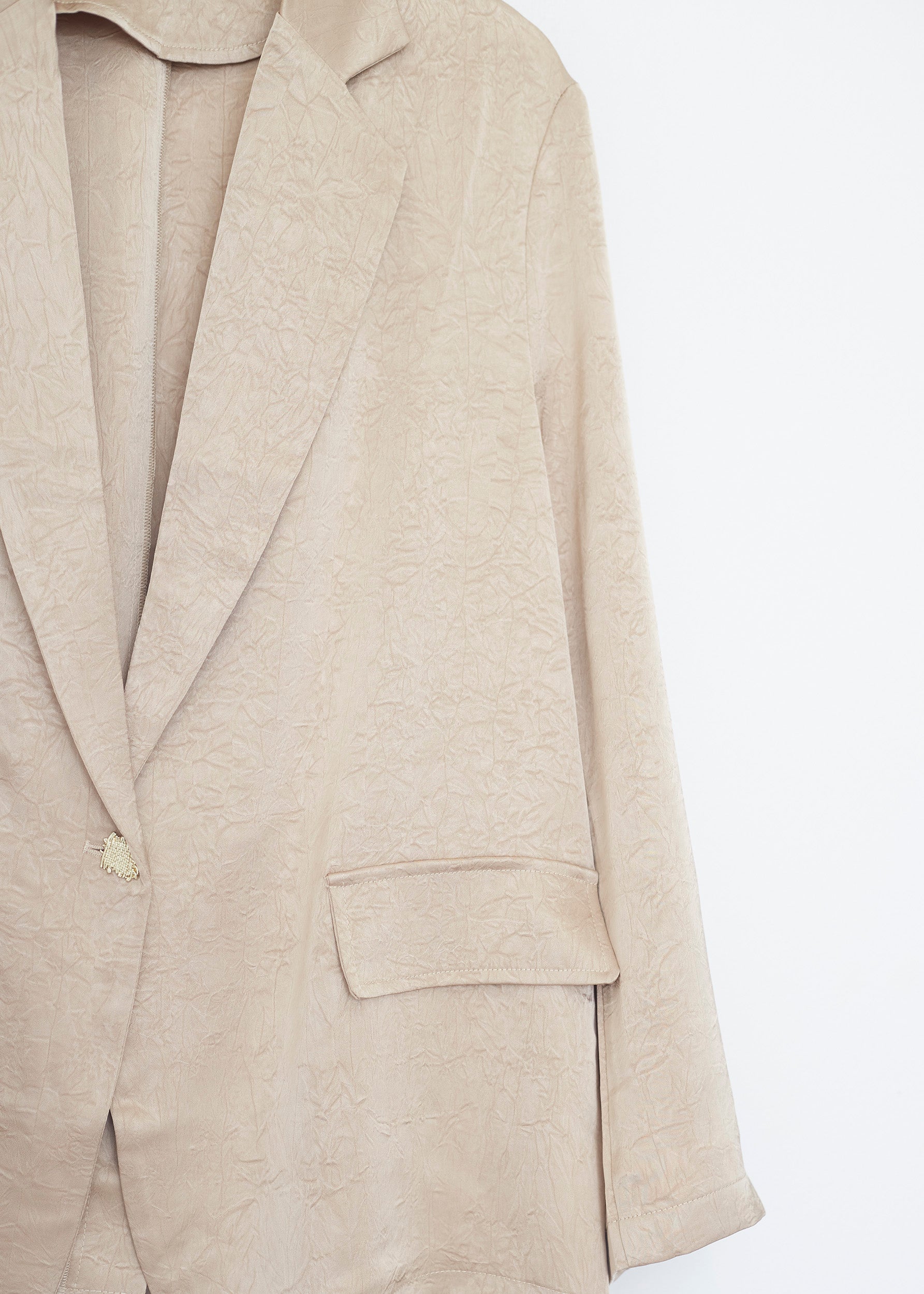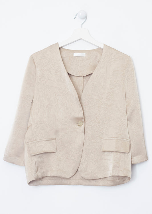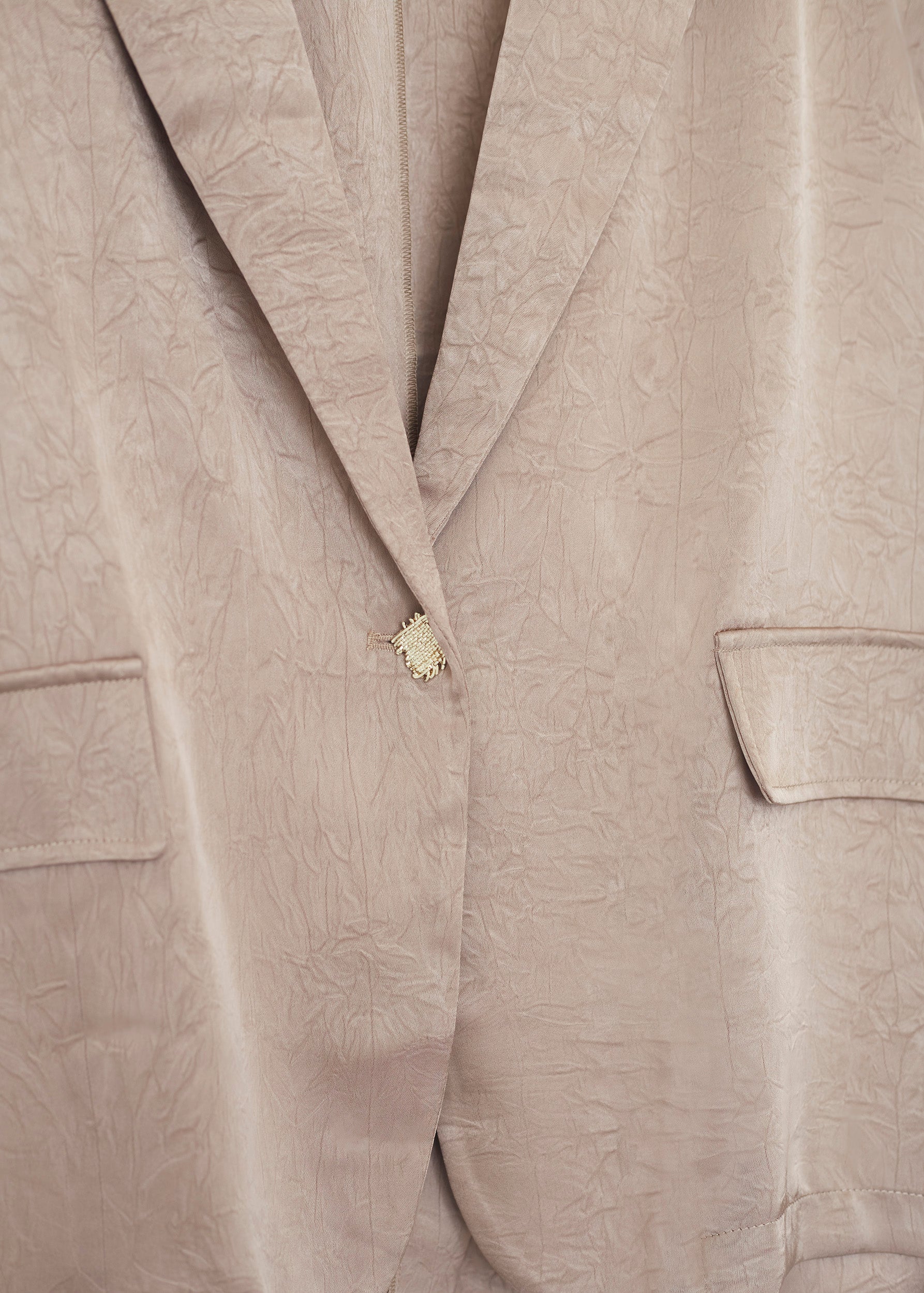 Blazer de raso de cuello solapa y manga larga. Falsos bolsillos delanteros con solapa. Cierre frontal con botón dorado. Corte recto.