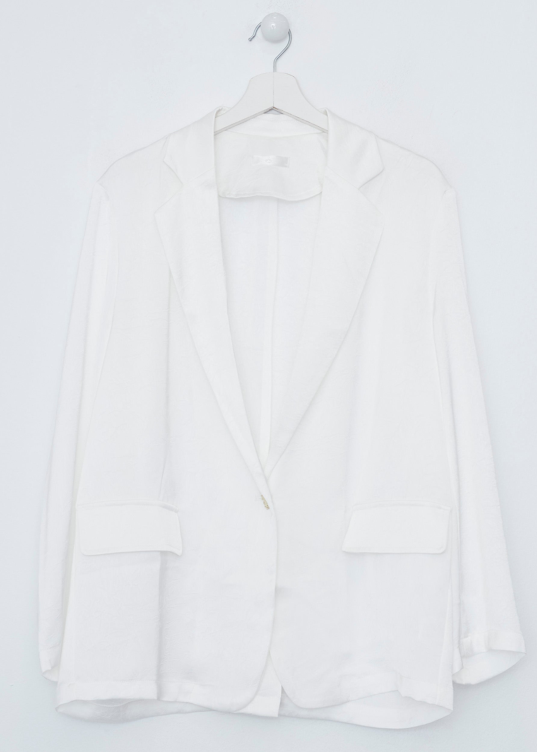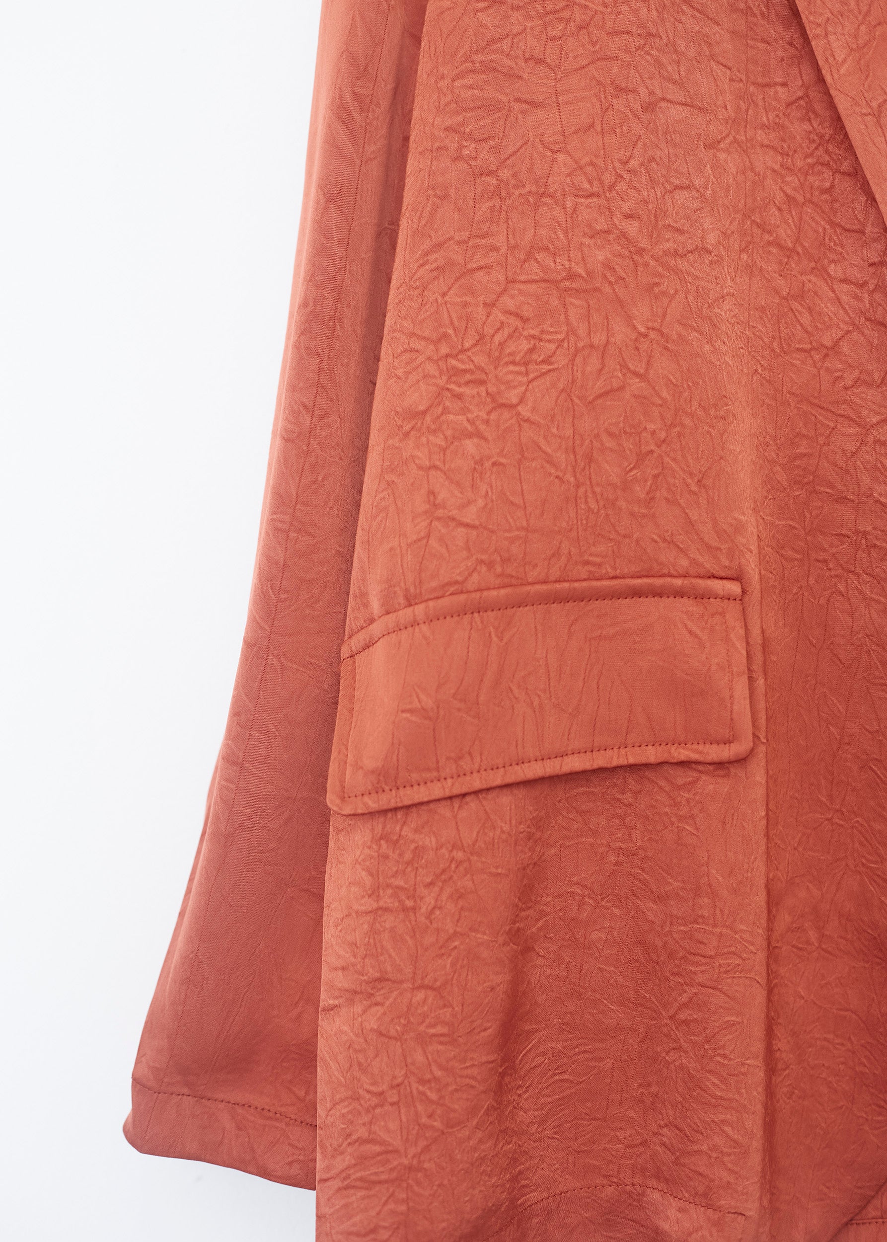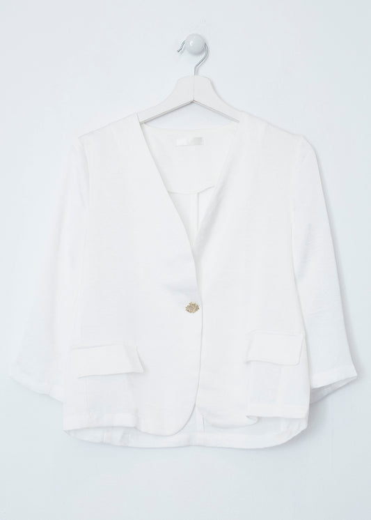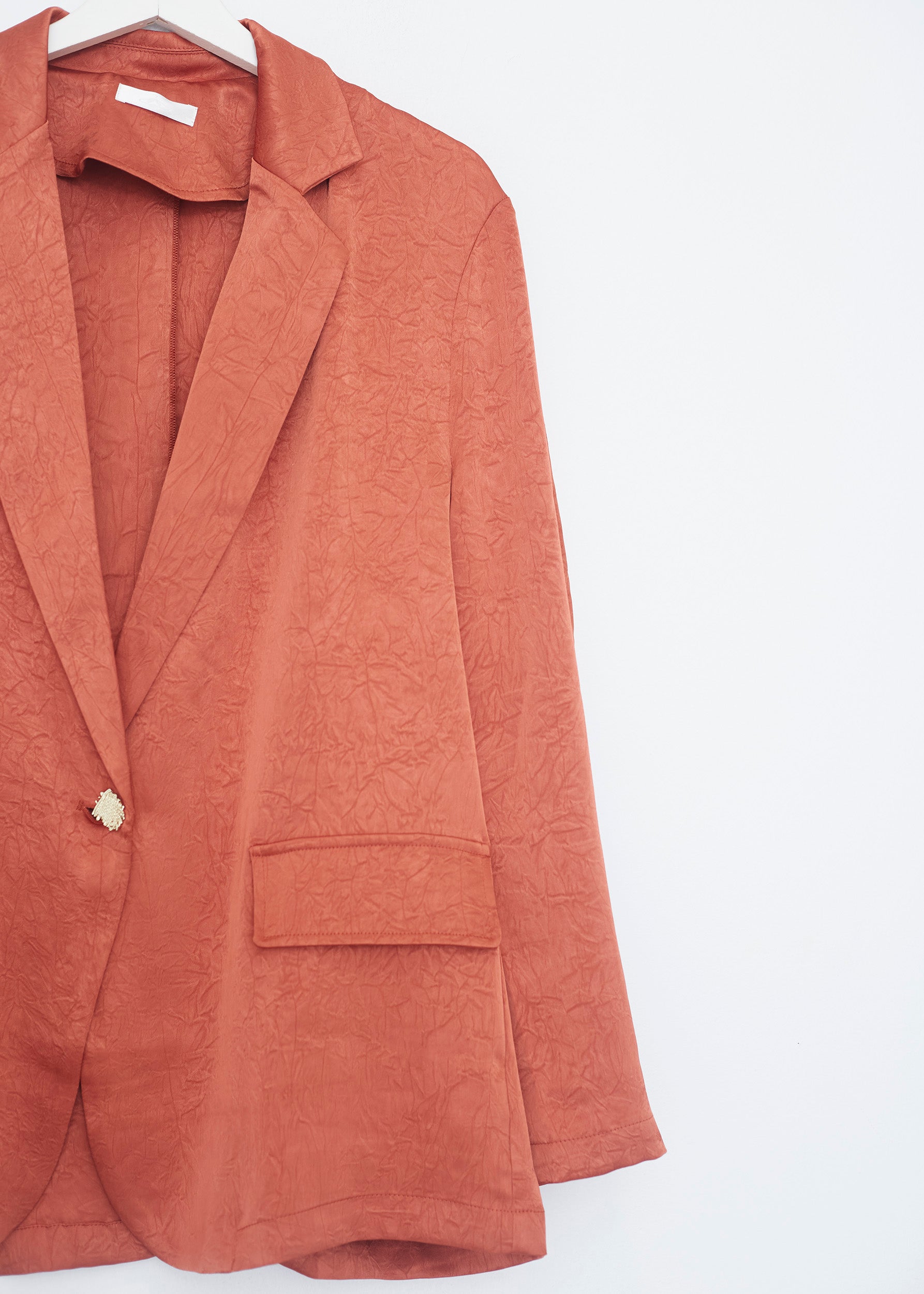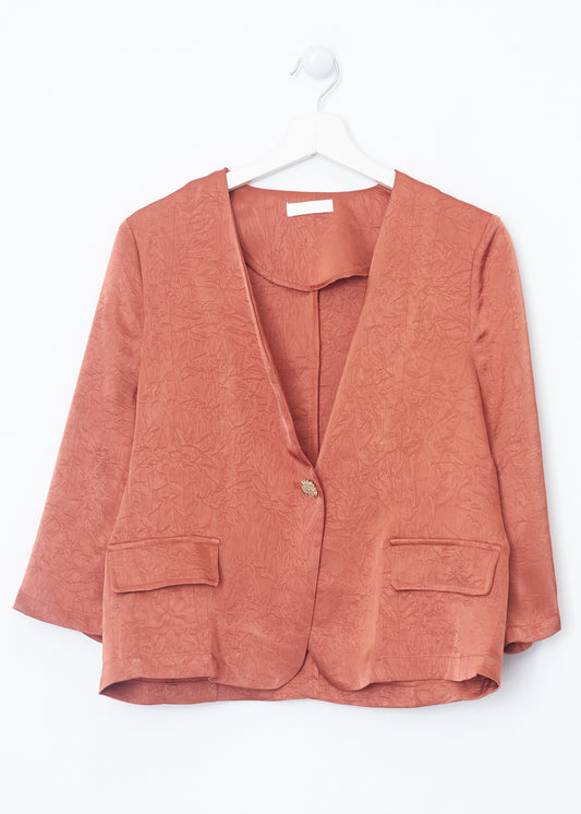 Blazer de raso de cuello solapa y manga larga. Falsos bolsillos delanteros con solapa. Cierre frontal con botón dorado. Corte recto.