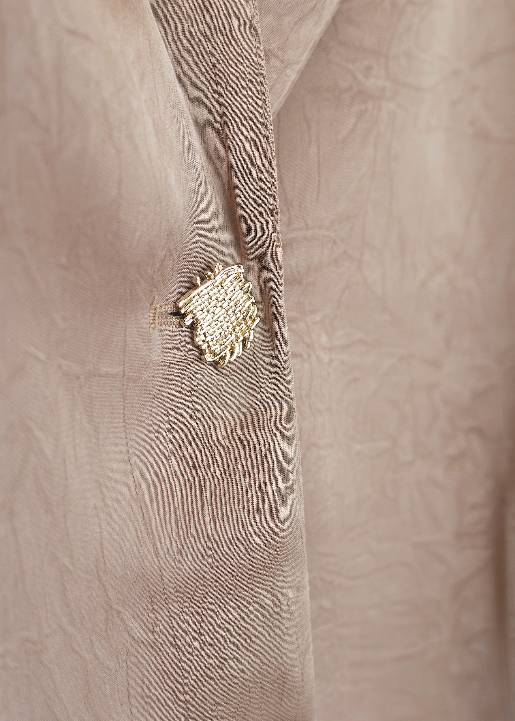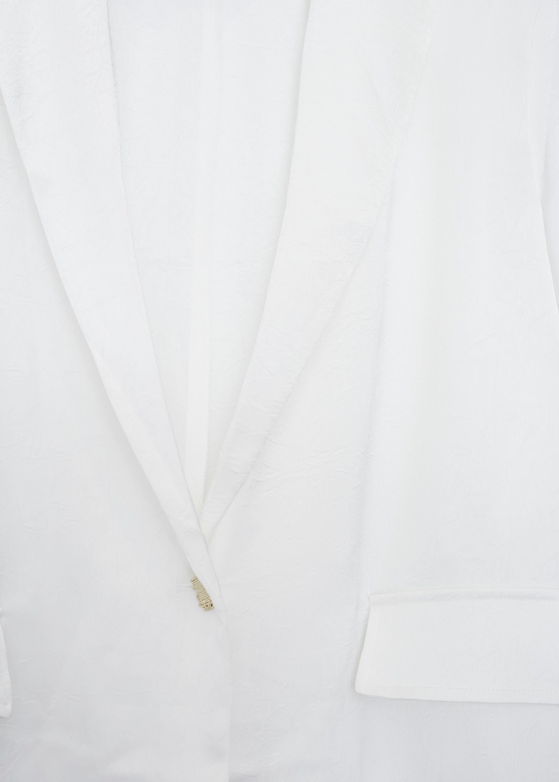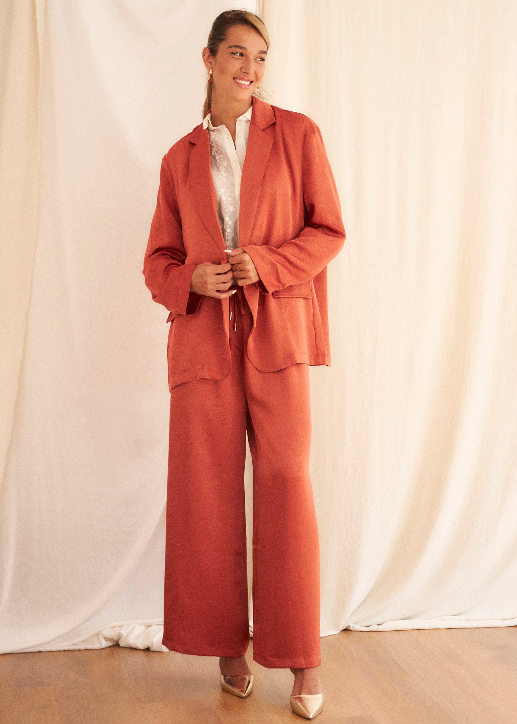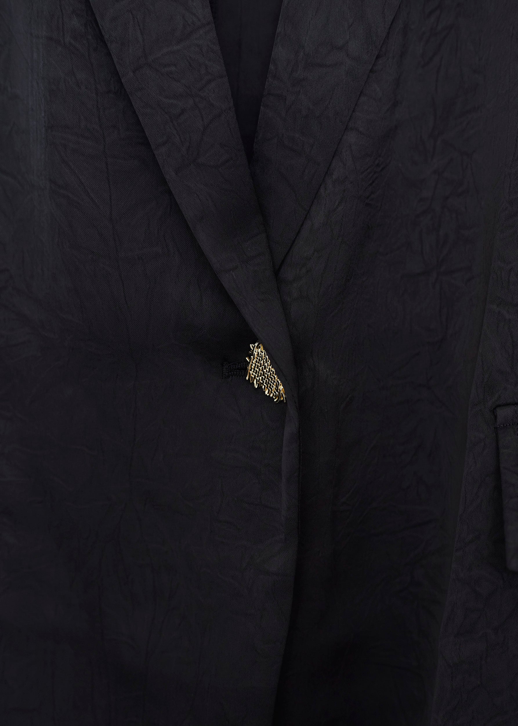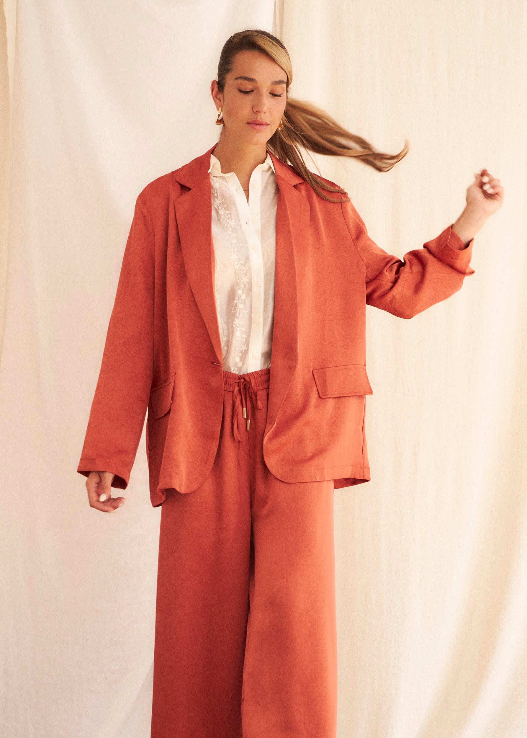 Blazer de raso de cuello solapa y manga larga. Falsos bolsillos delanteros con solapa. Cierre frontal con botón dorado. Corte recto.