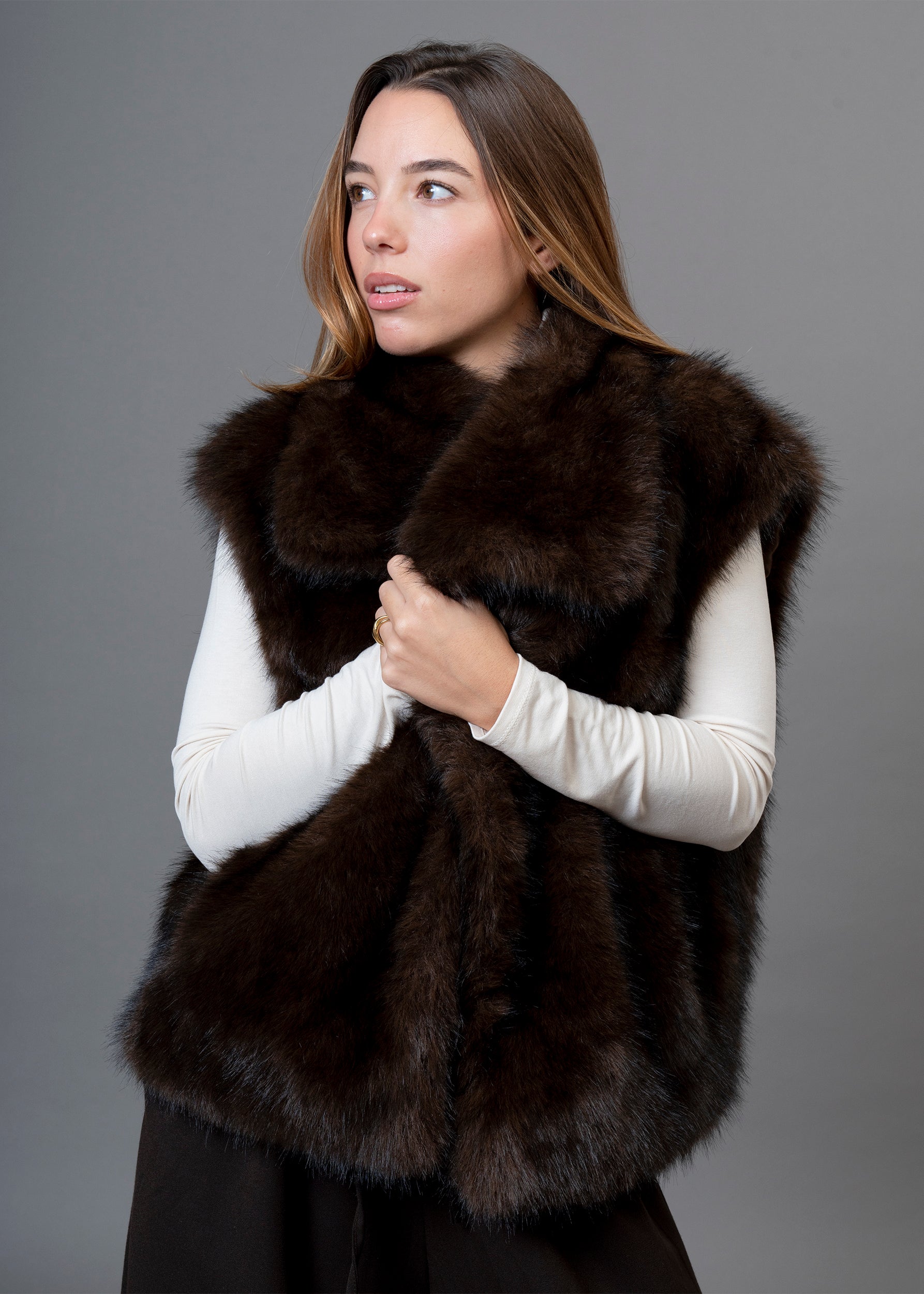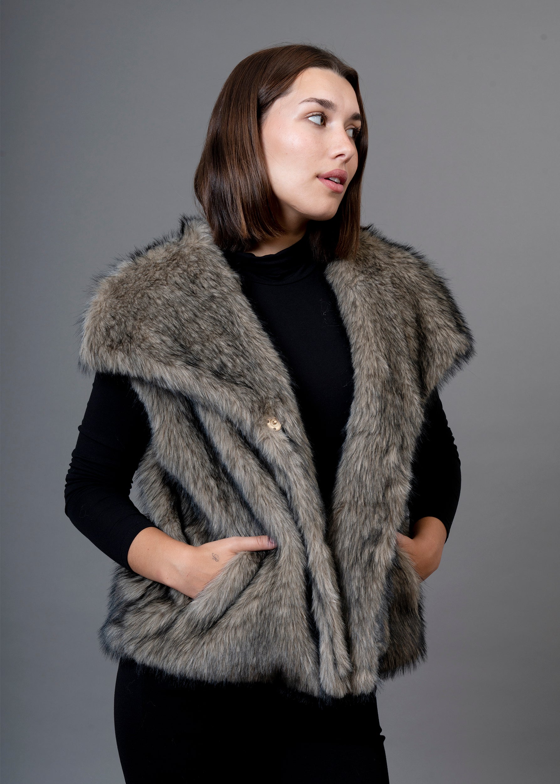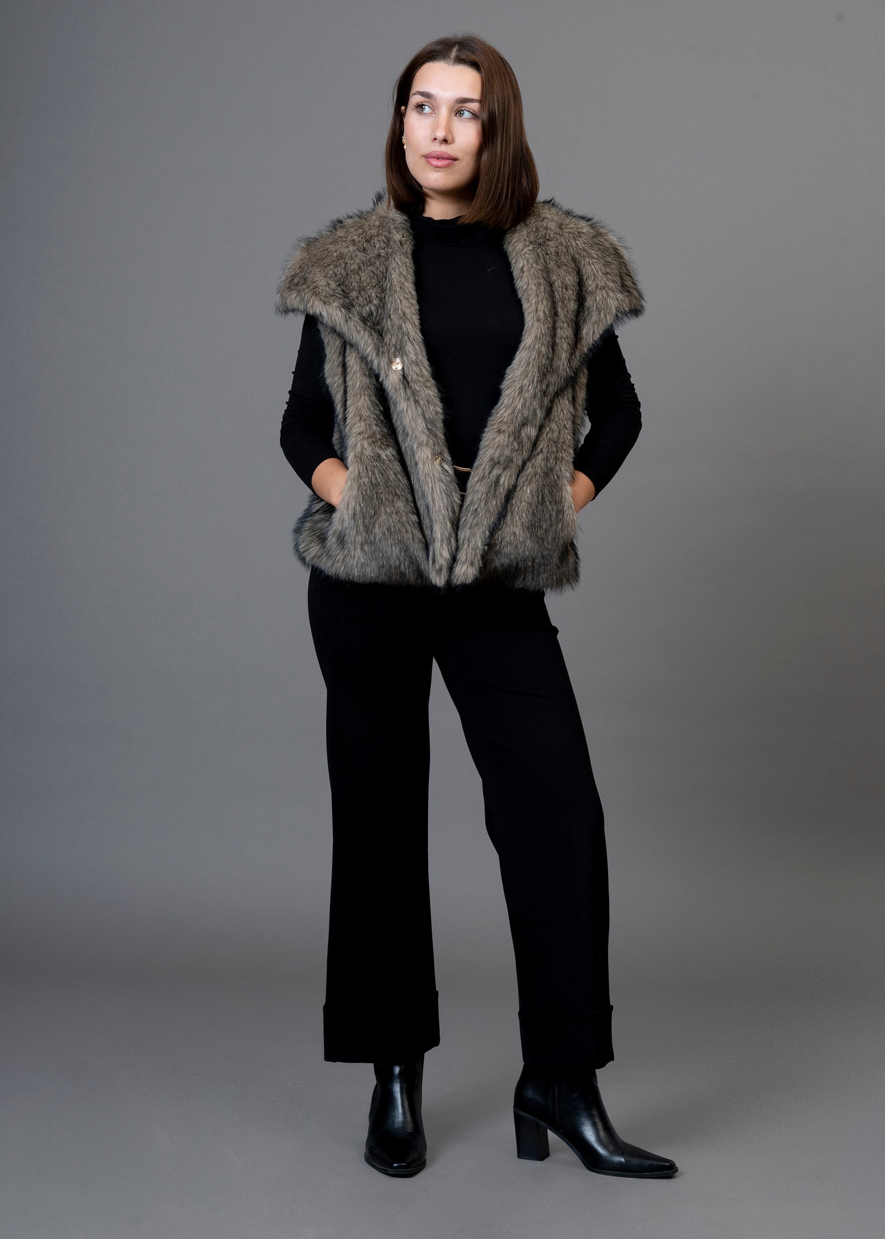 Chaleco efecto pelo con cuello solapa. Cierre frontal con botones metálicos. Bolsillos laterales. Forro interior acolchado.